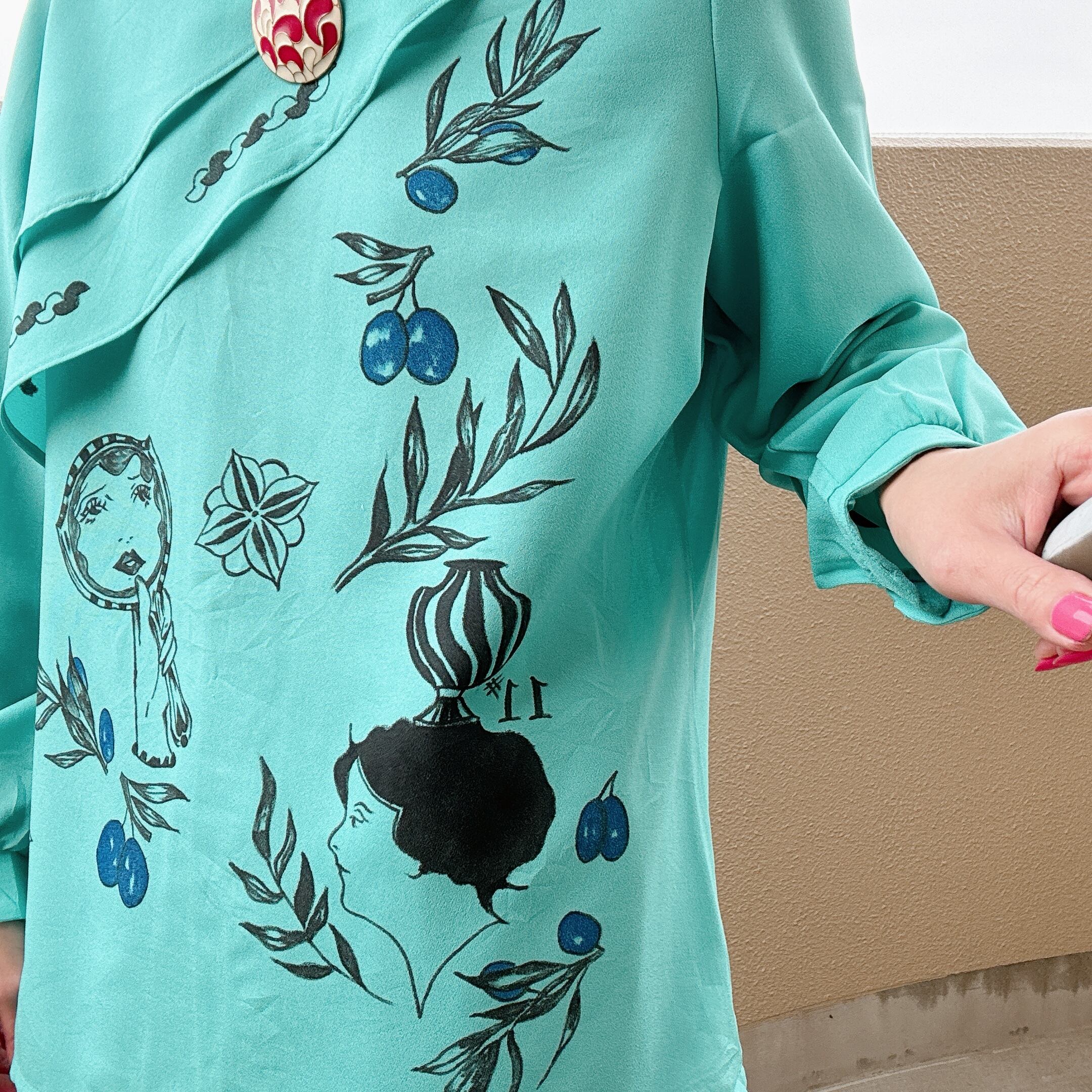 ▪️美しいデザイン、お色味のブラウスです。全体にウッスラとシミムラがありましたのでペイントでカバーしました。よくよく見るとペイントの下にムラが見える場合もございます。気にならない程度かと思いますが神経質な方のご購入はお控えください。