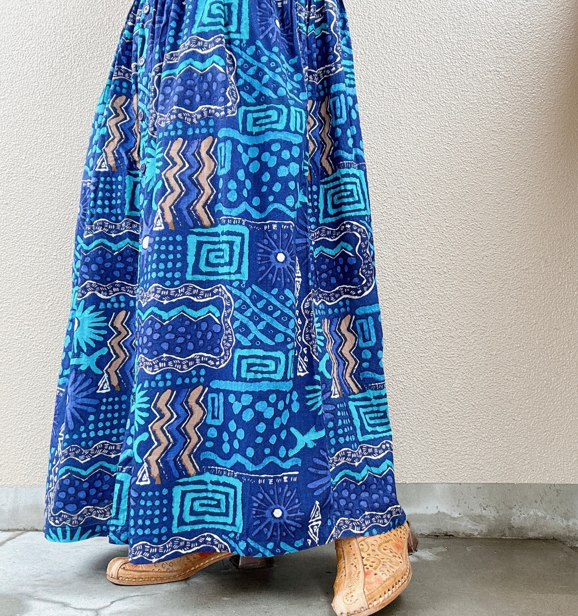 ◾️鮮やかなブルーと落ちついたブルーのカラーリングの減り張りが目を惹くドレスです。素材表記が無い為詳細は不明ですがコットンのような肌触りで夏場も快適に着ていただけます。質感、デザインや雰囲気からシーズンレスに着ていただけると思います。