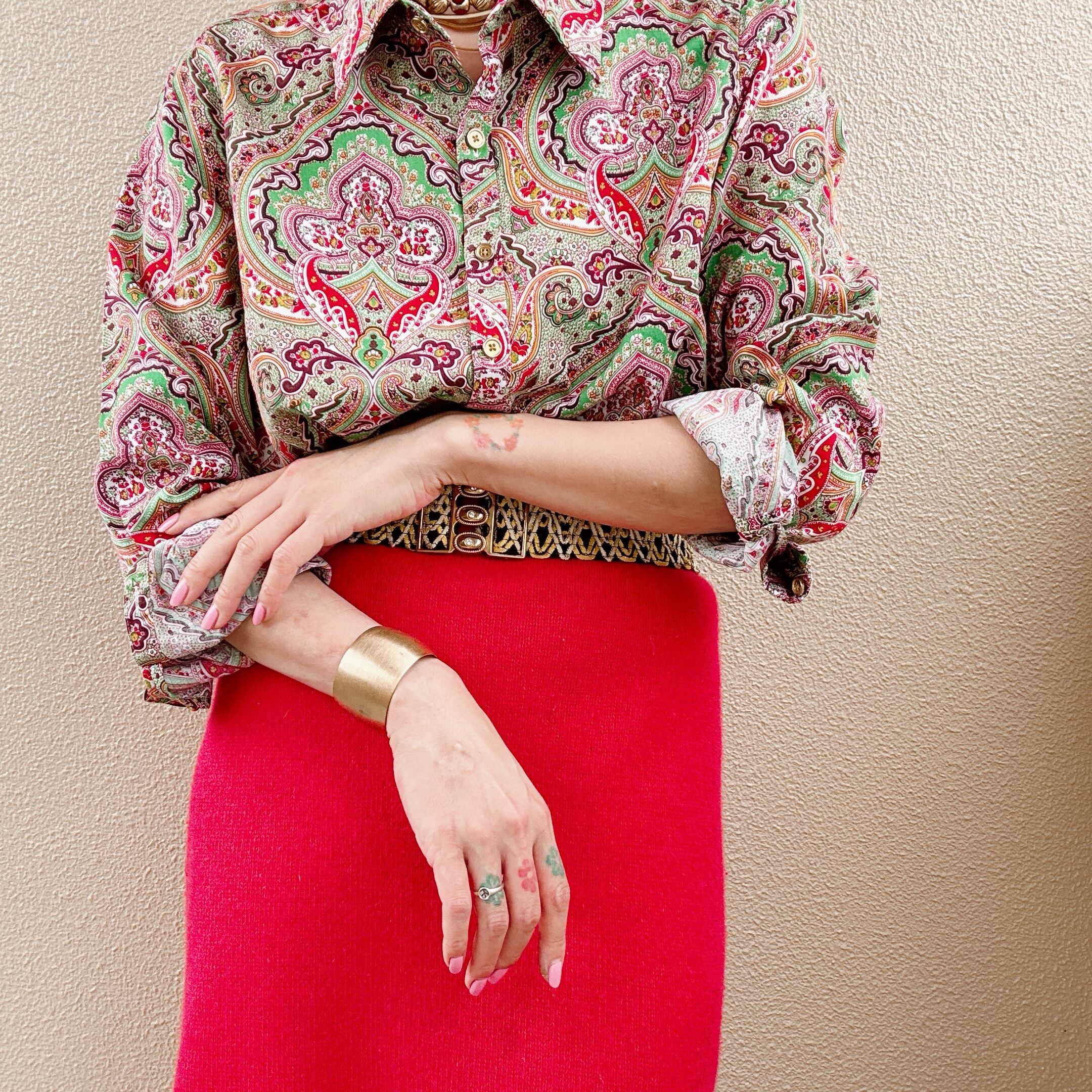 ◾️バキっとしたカラーリングに大胆なパターンが美しく目を惹く肌触りの良いシャツです。1枚でも、インナーにしてもアクセントになる事間違いなしです。