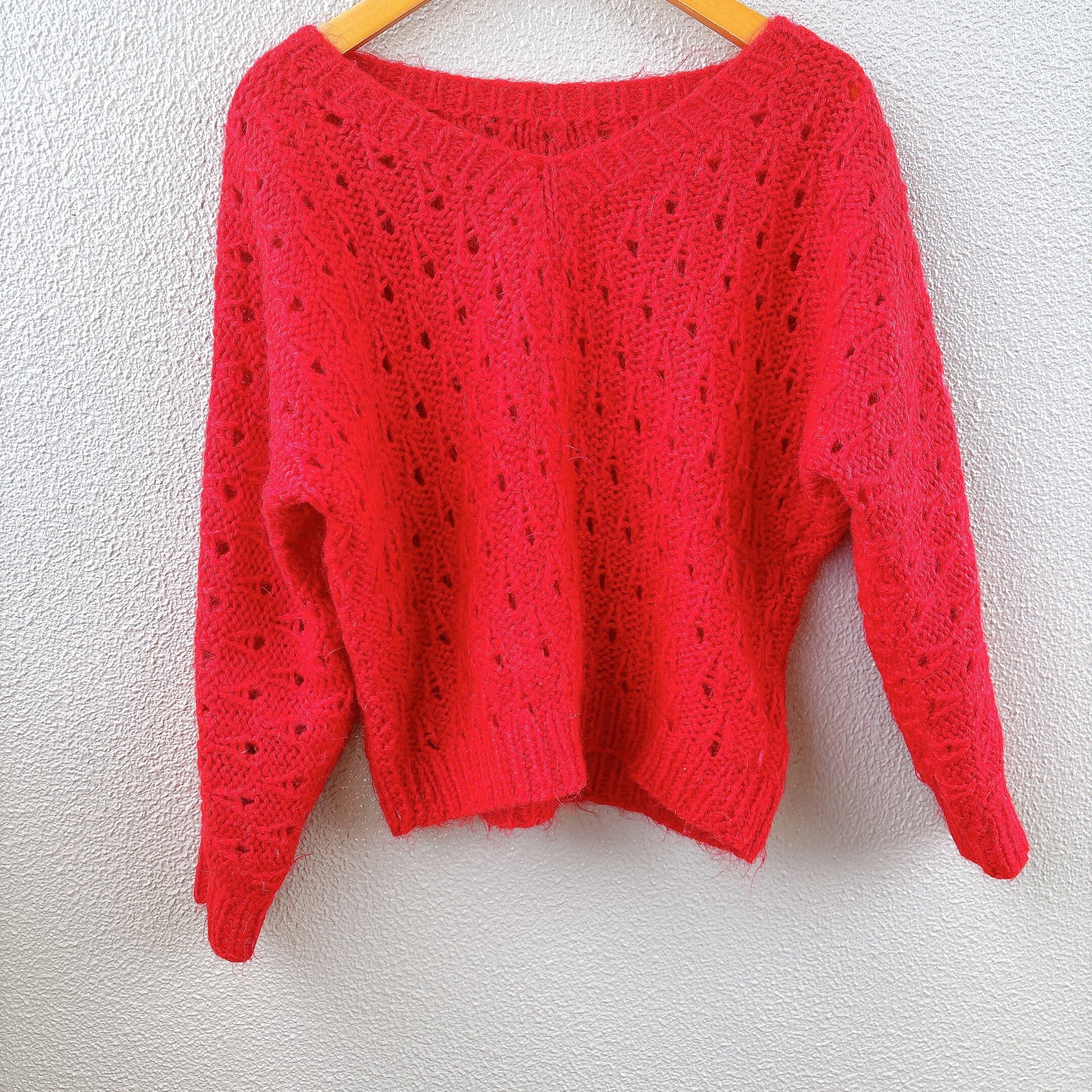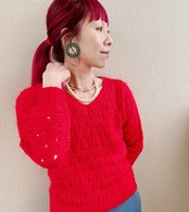 ◾️ビビットな赤とフワフワとした質感がとびきりキュート。編み目も可愛くて、チラッと編み目から見えるインナーの色によっても印象が変わりますね。袖丈短めで野暮ったさのないニットスタイリングの完成です。ロングの柄スカートと合わせるのもとびきり可愛いです。