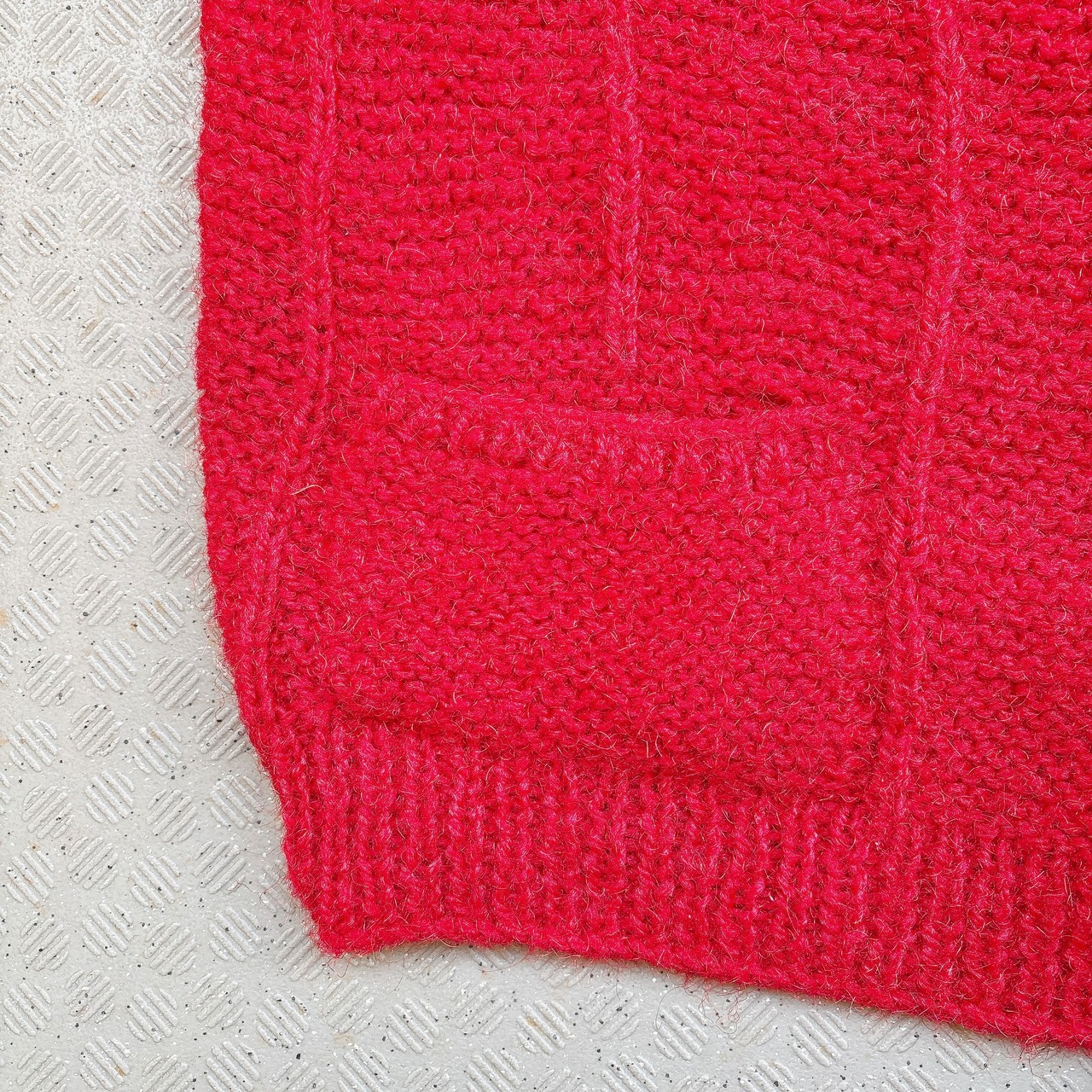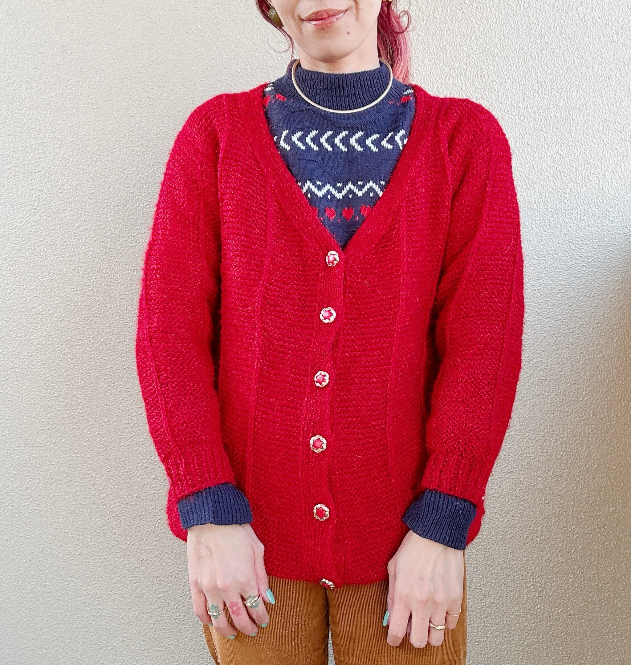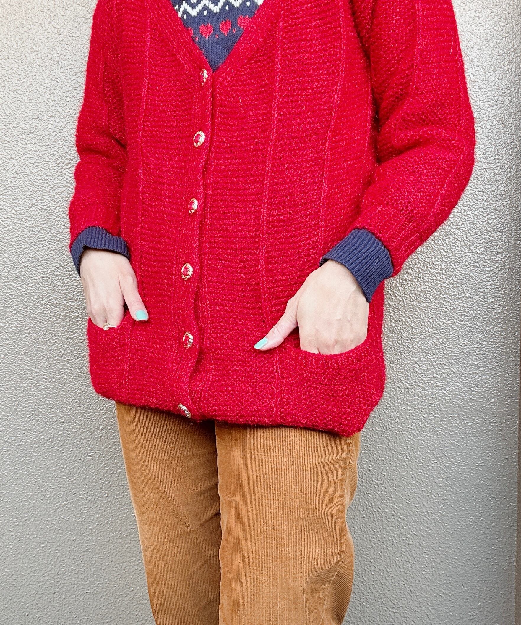 ◾️鮮やかな赤がこれからの季節にピッタリのカーディガンです。個性的な編み目と、袖を通した時のフィット感が風を通さず保温性にも優れています。キラキラのヴィンテージボタンと、