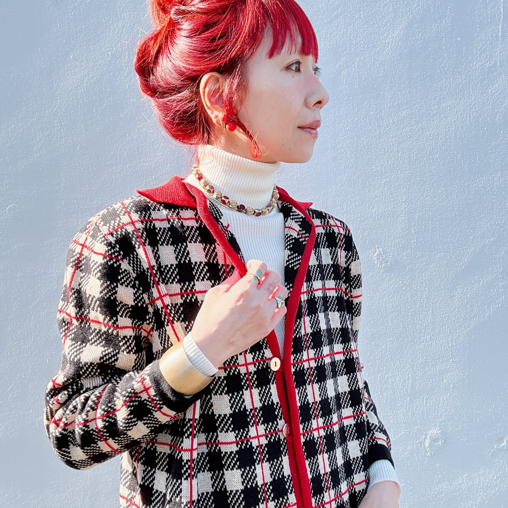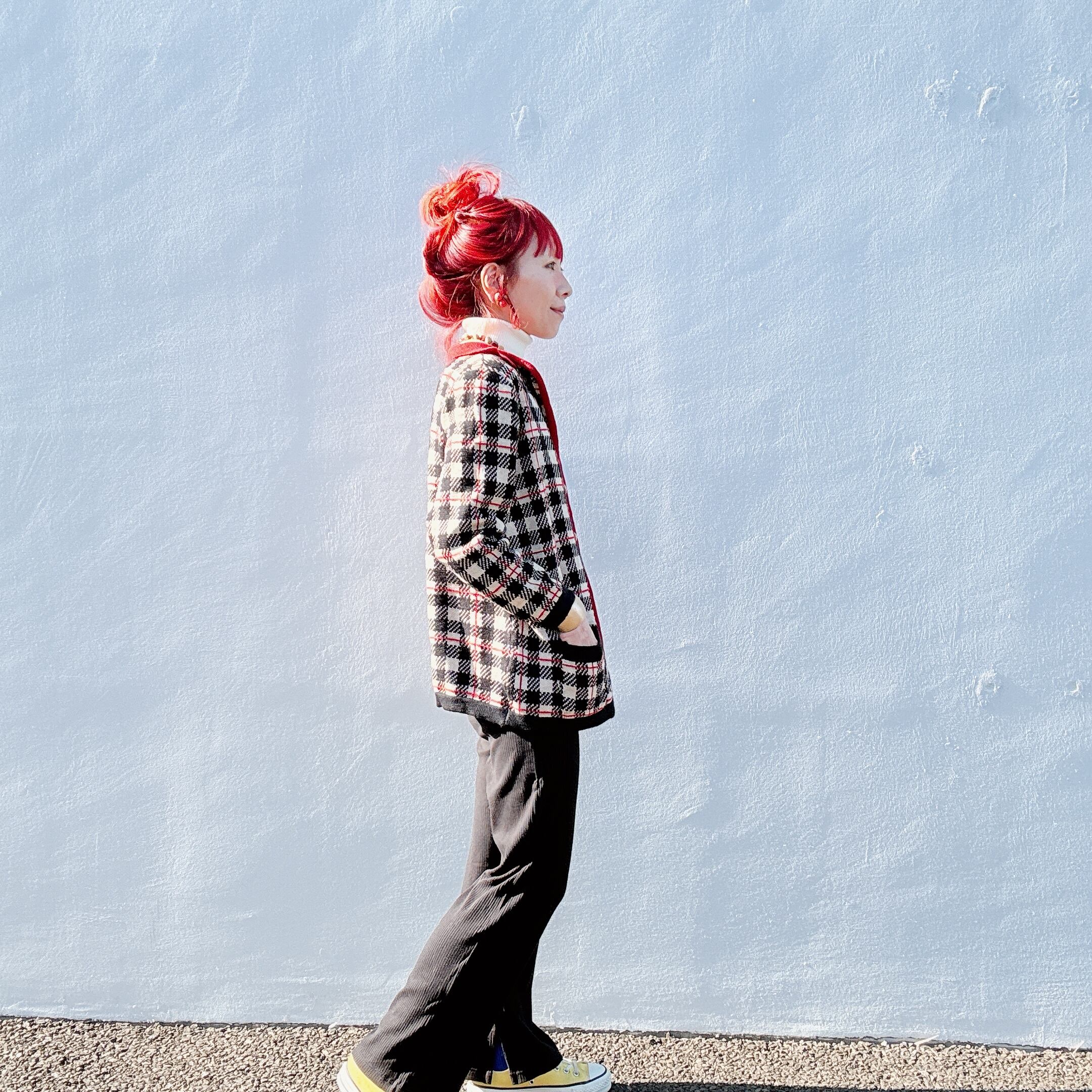 ▪️ポッテリ程よい厚みのあるウールジャケットです。黒とアイボリー寄りの白のカラーリングに襟やパイピングの赤がピリリと効いて雰囲気満点◎。真冬以外でしたらウールやインナーに着込む事でアウターとしても。