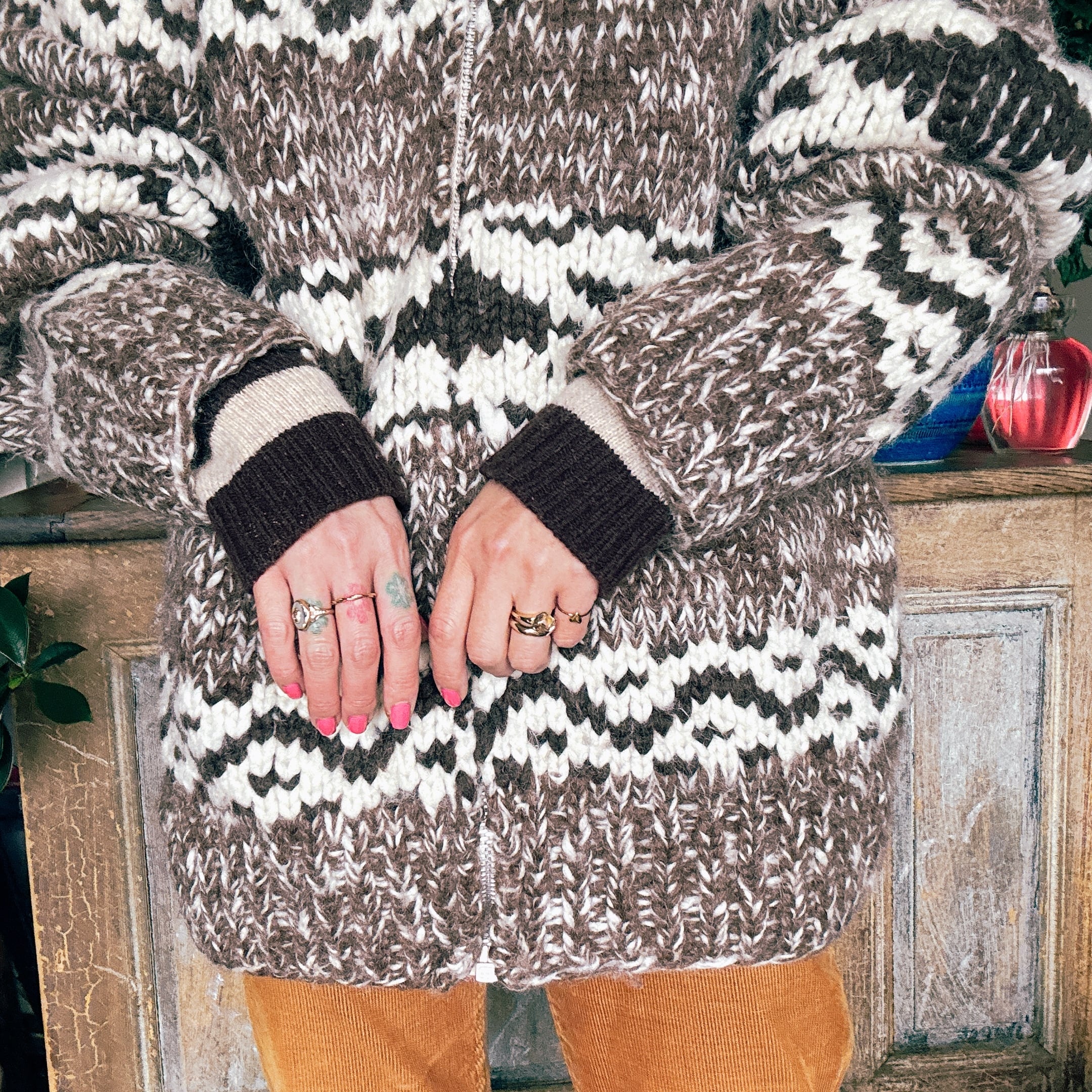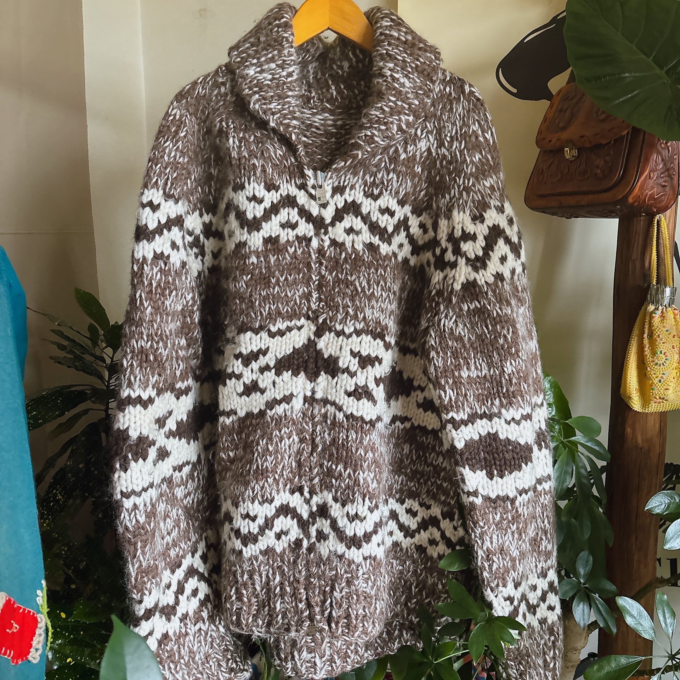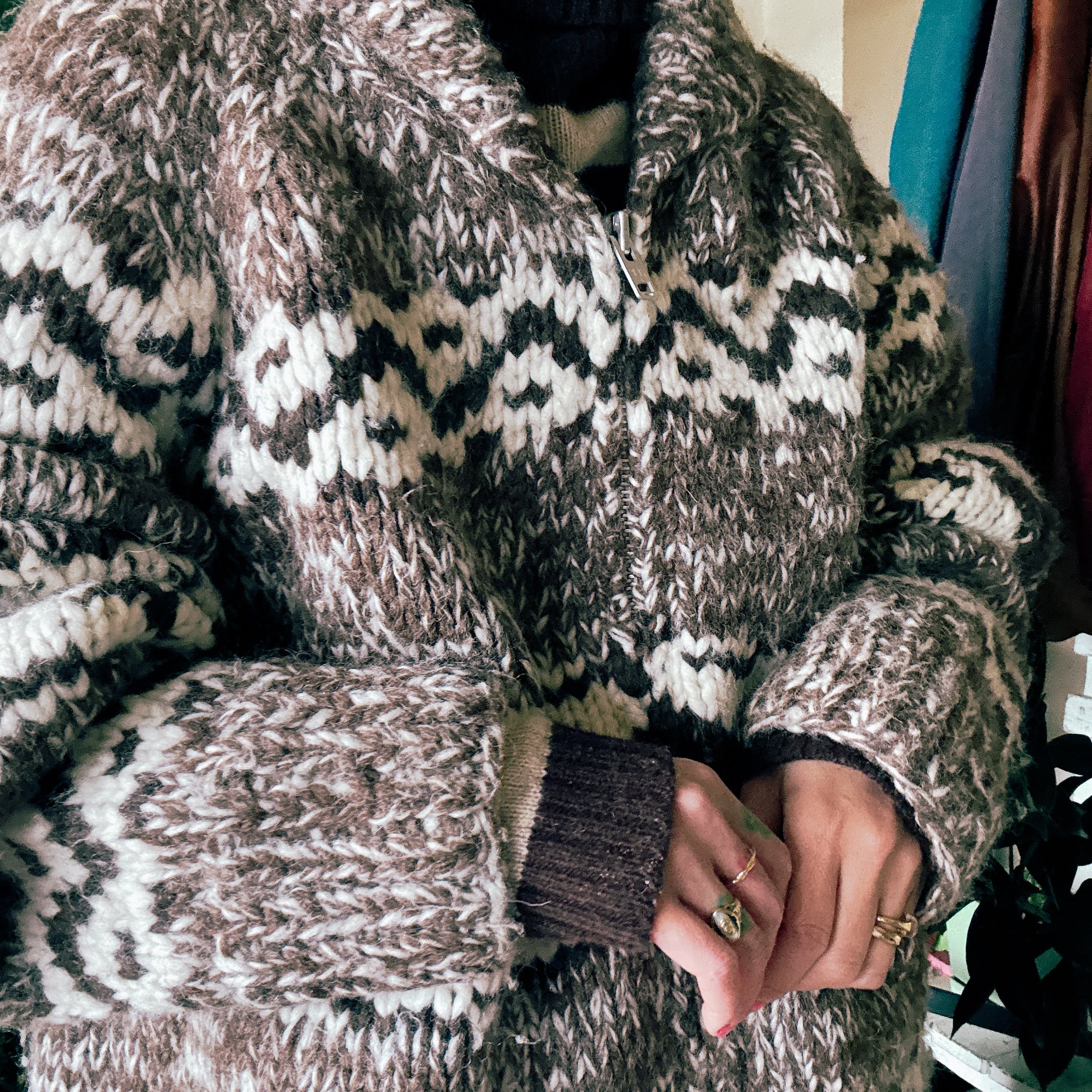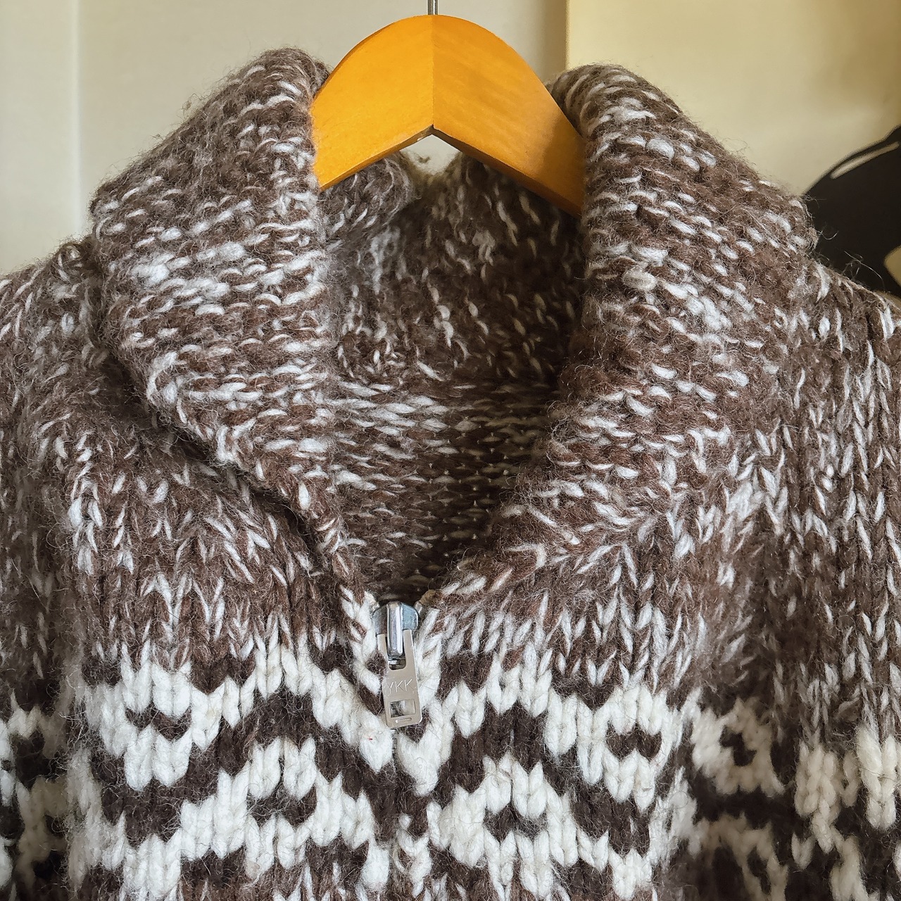 ■ 北欧調の柄が印象的な、ジップ仕様のニットカーディガン。