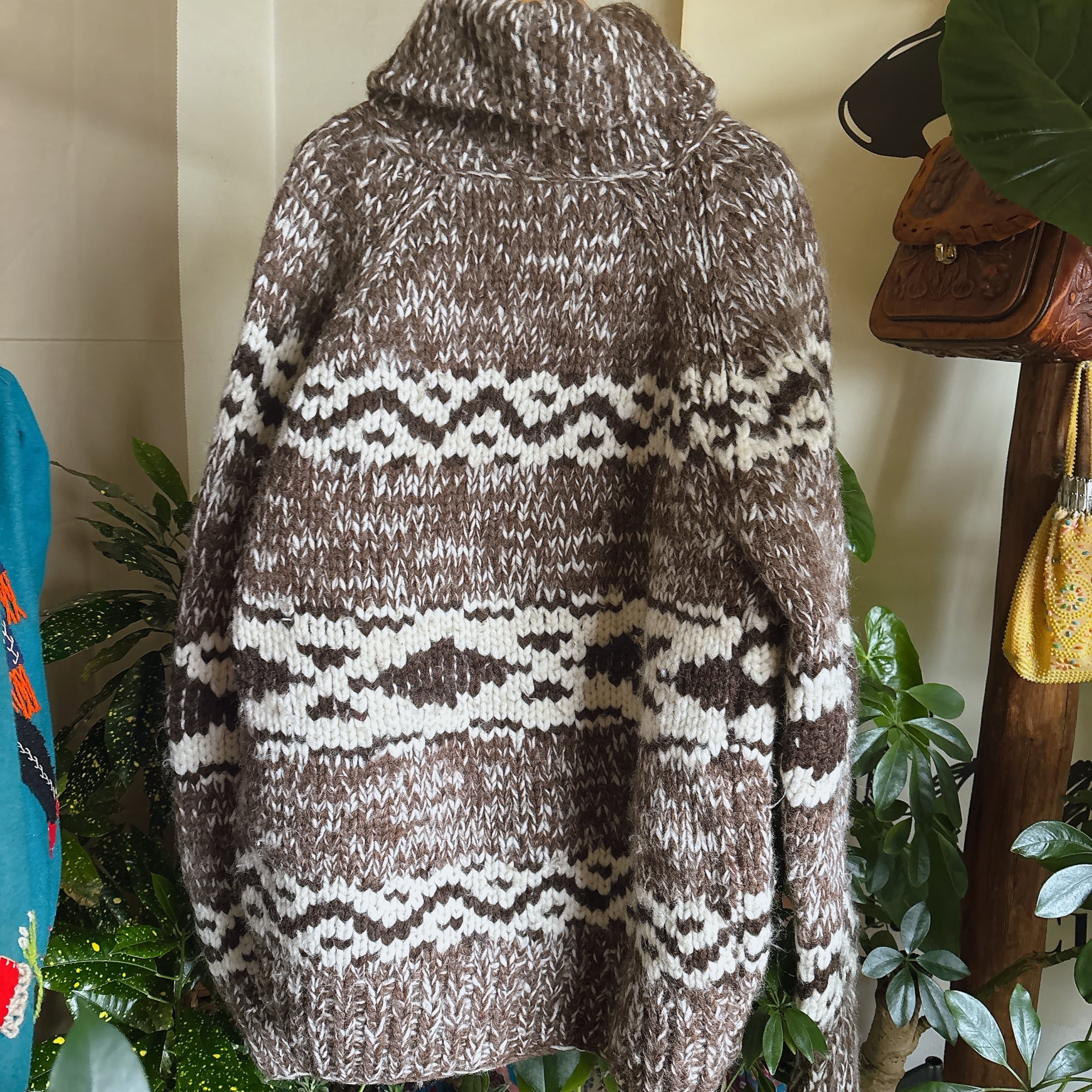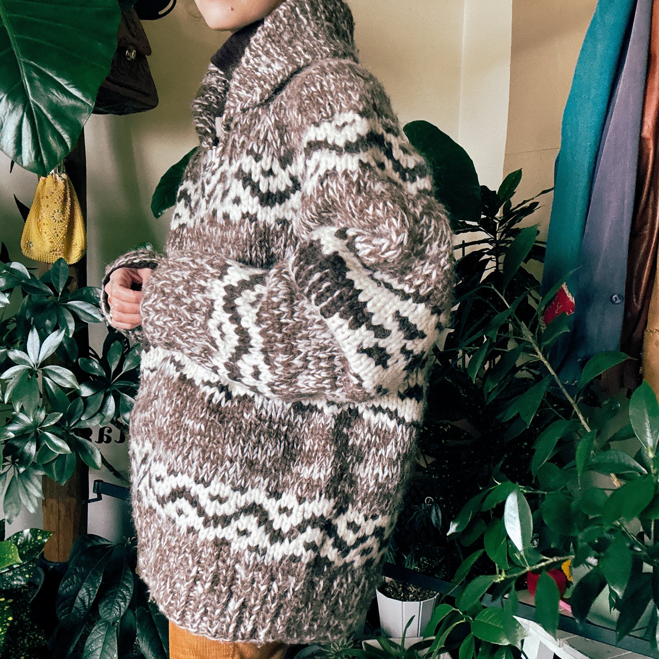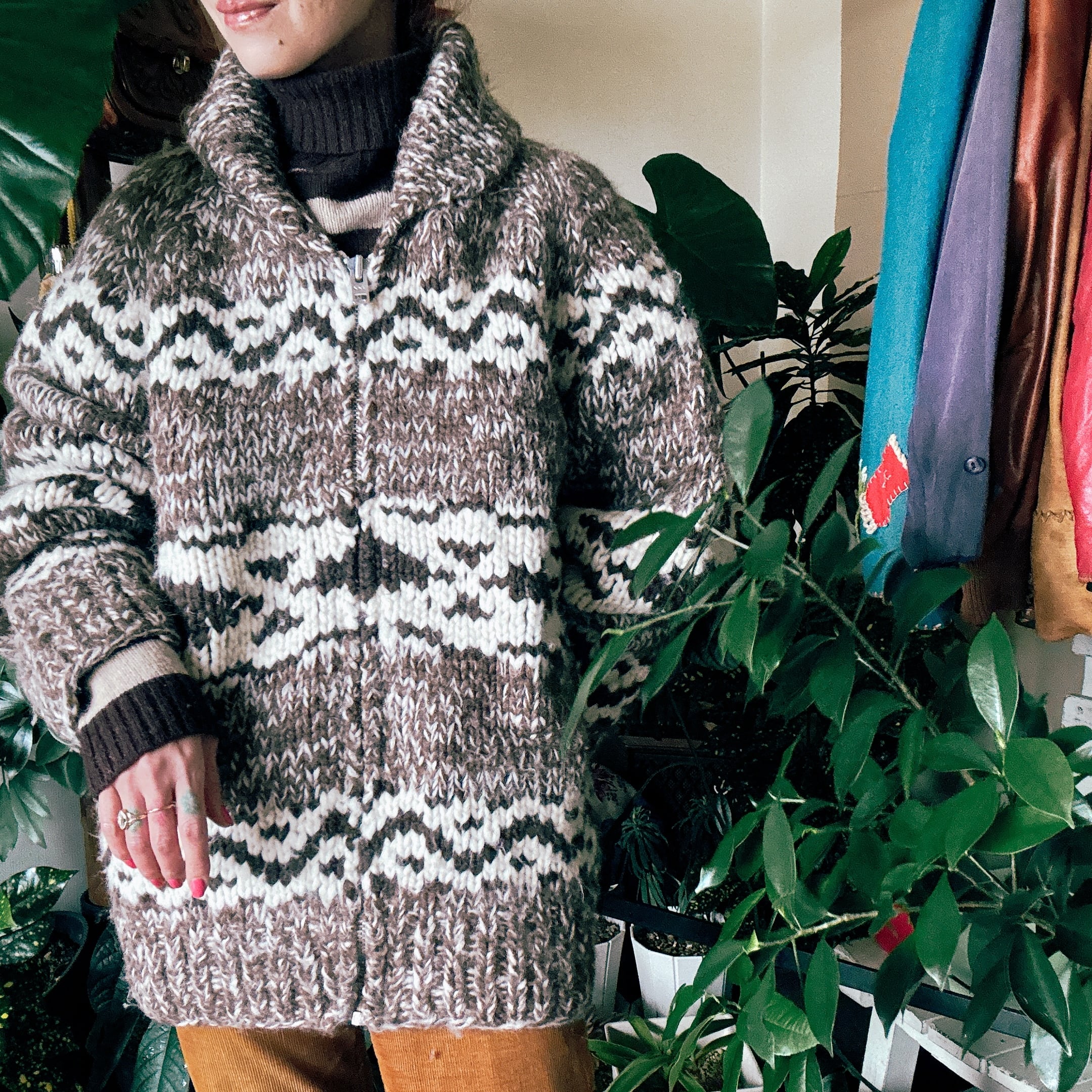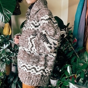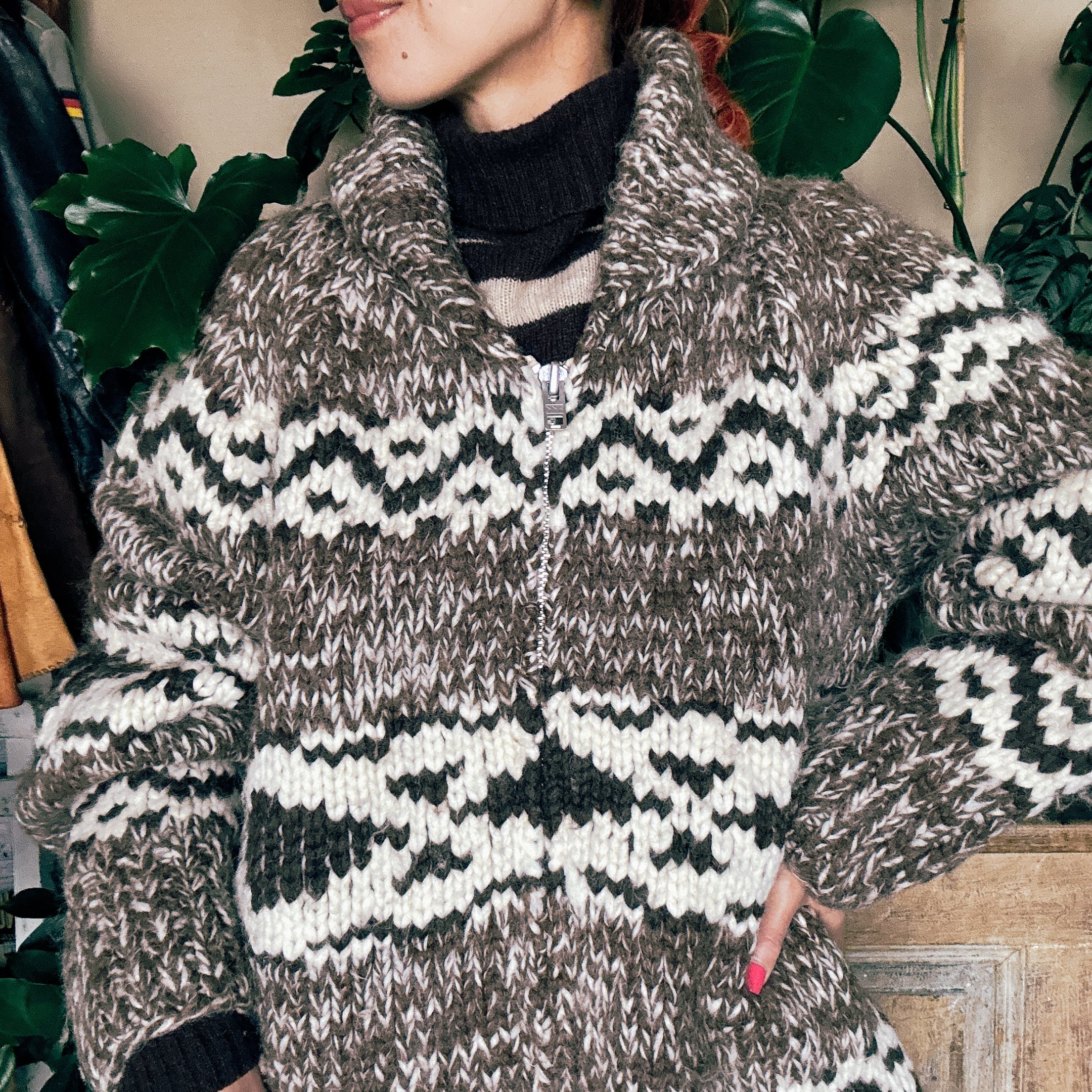 ■ 北欧調の柄が印象的な、ジップ仕様のニットカーディガン。