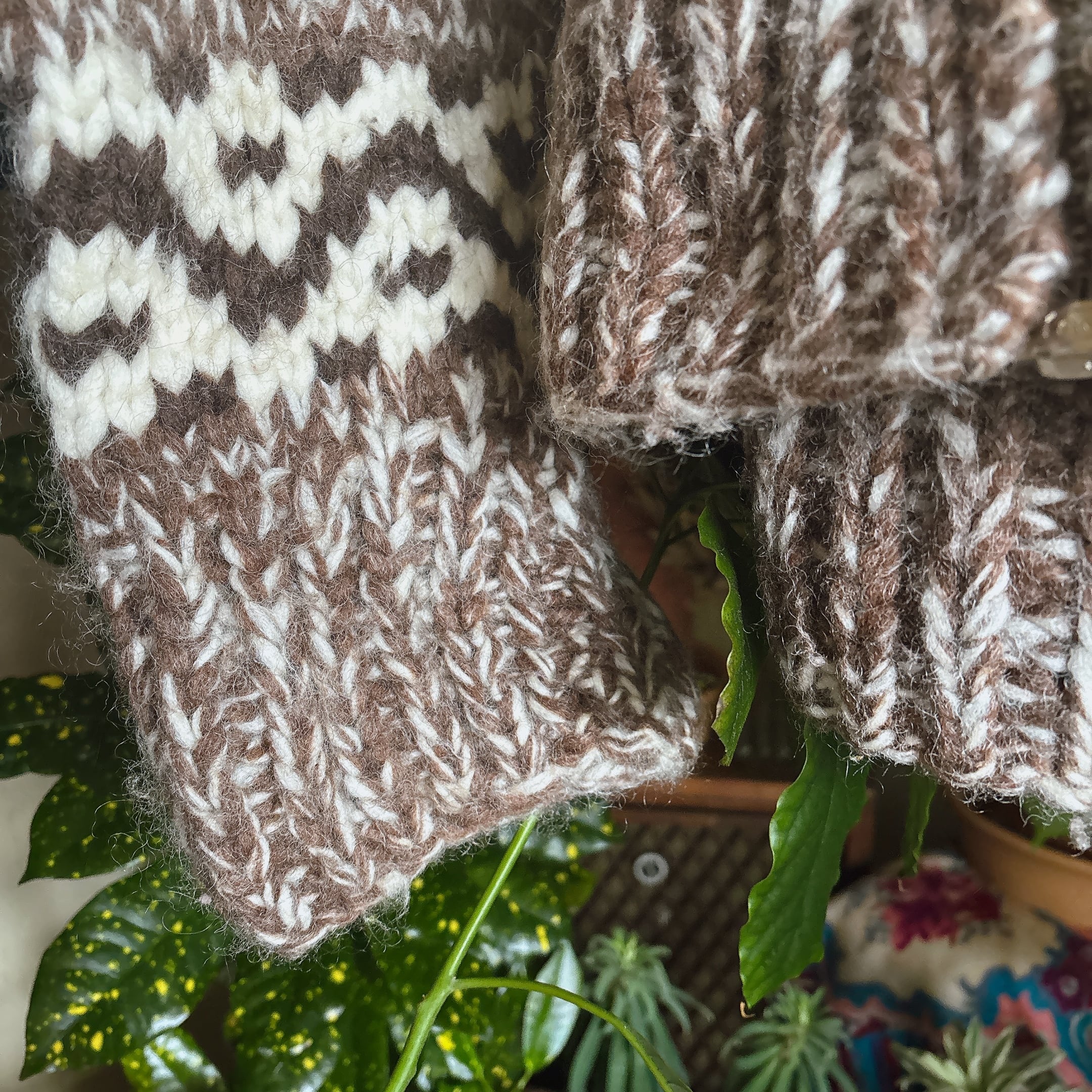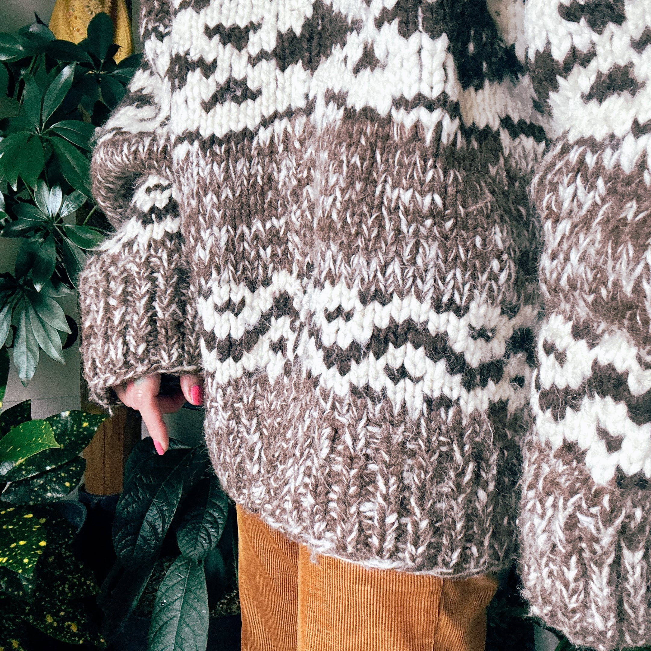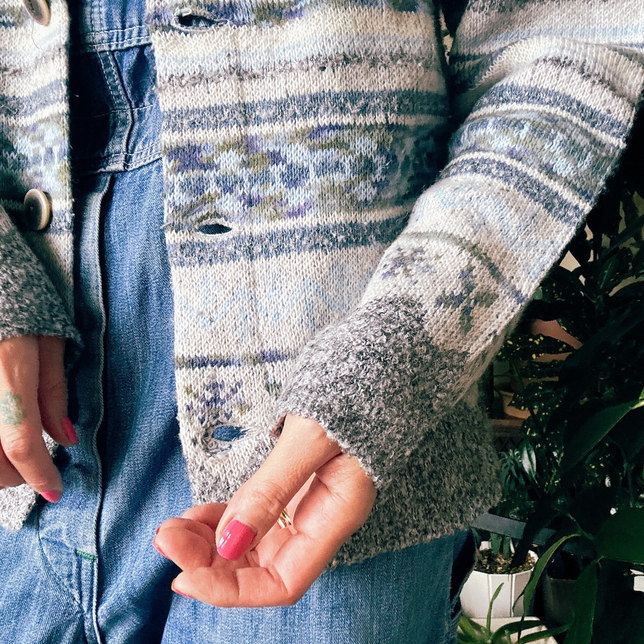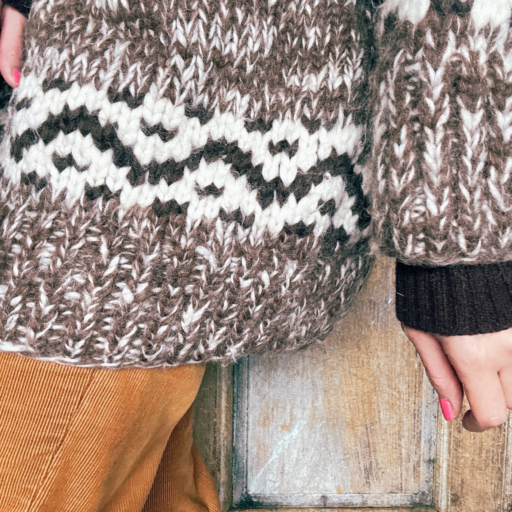 ■ 北欧調の柄が印象的な、ジップ仕様のニットカーディガン。