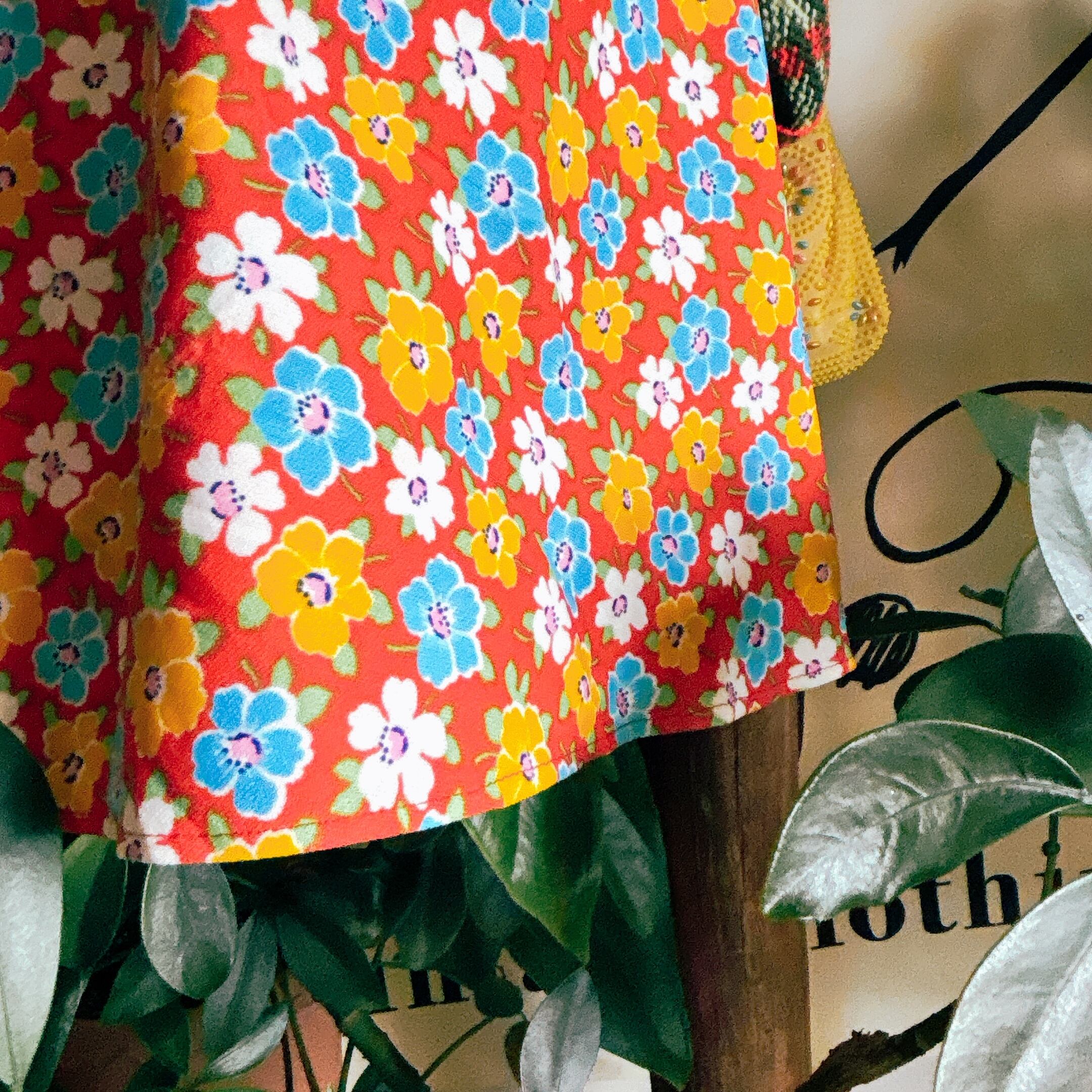 鮮やかなレッドベースに、ブルー・イエロー・ホワイトのフラワープリントが映え、