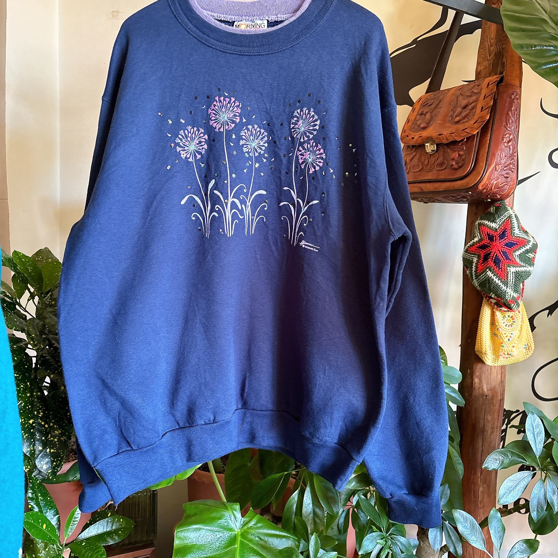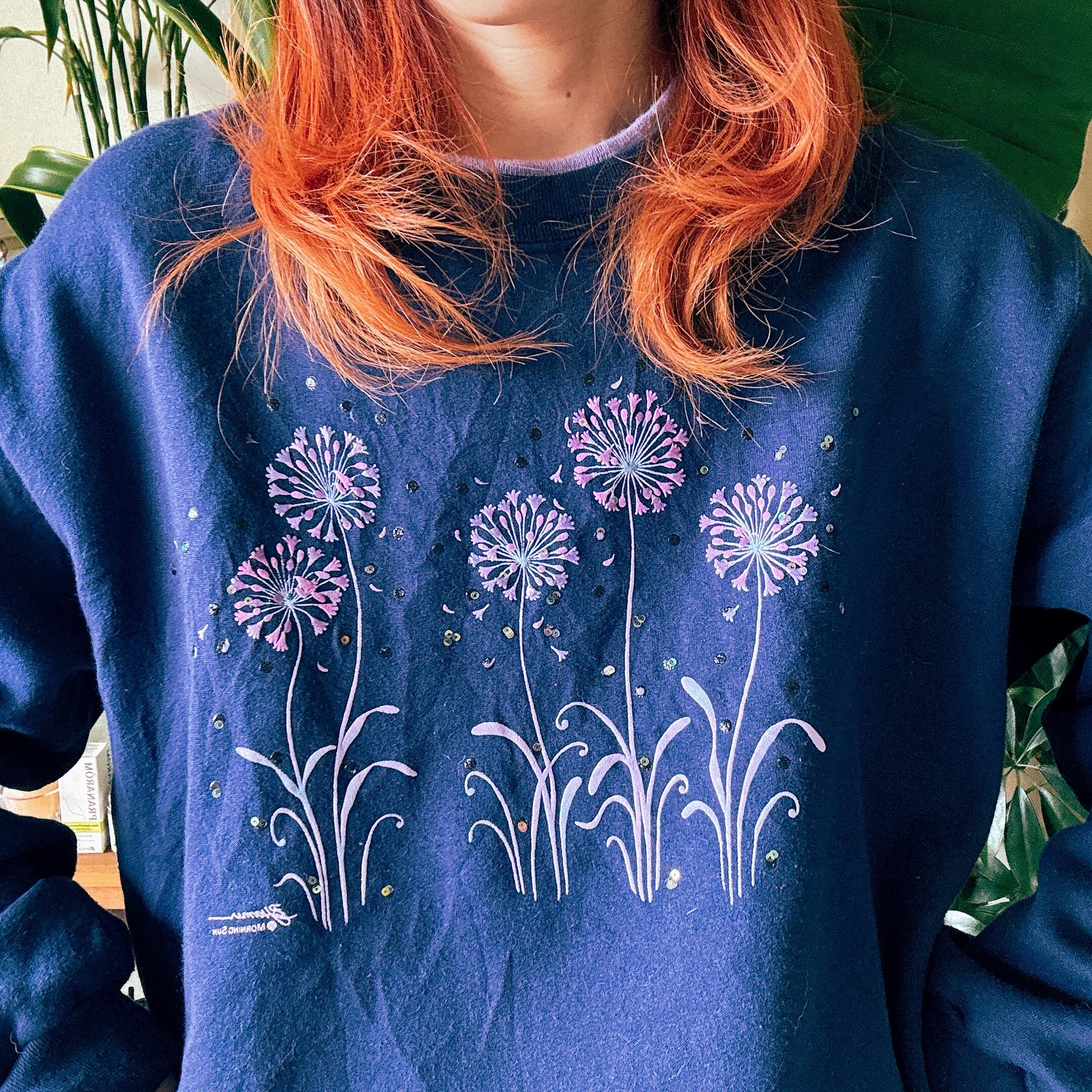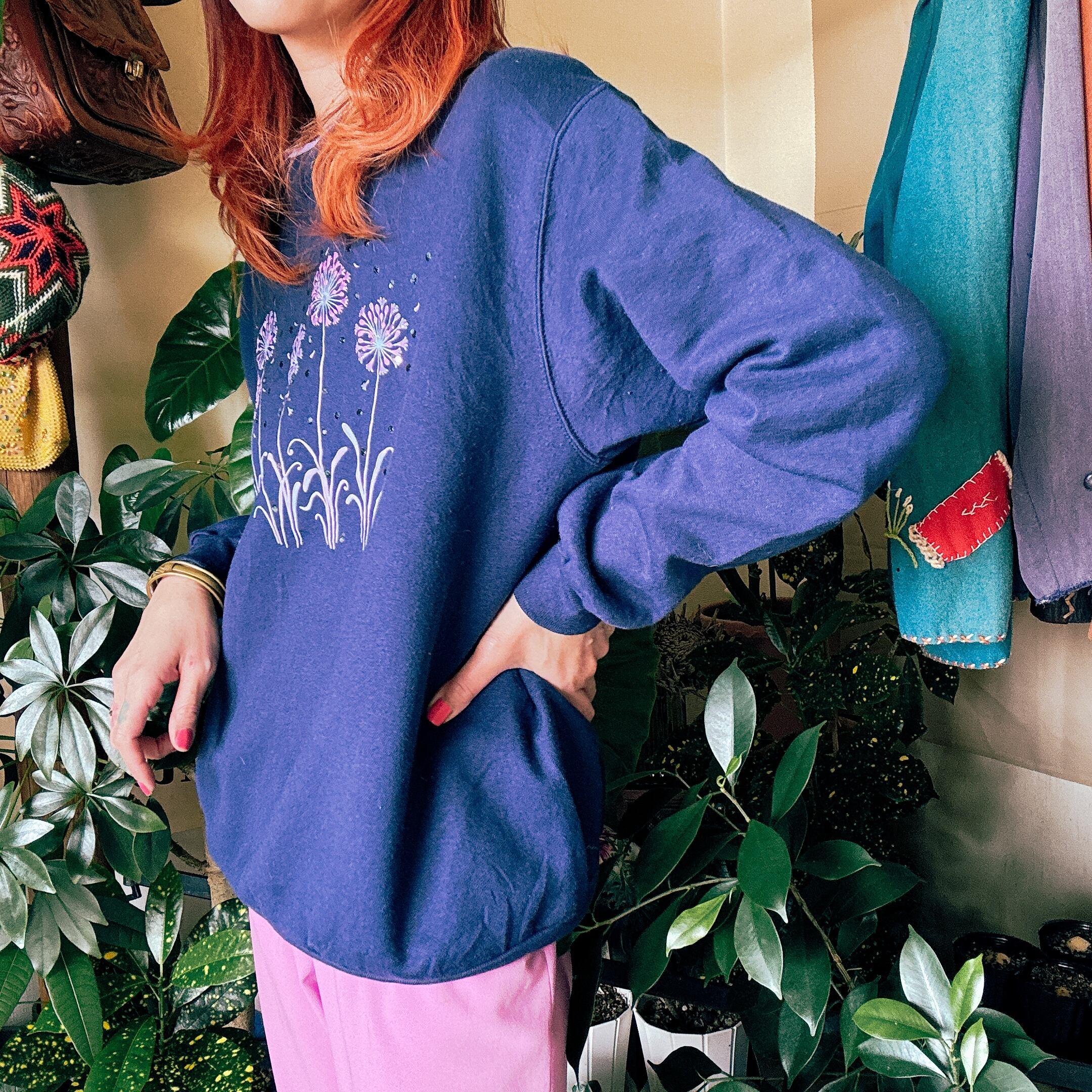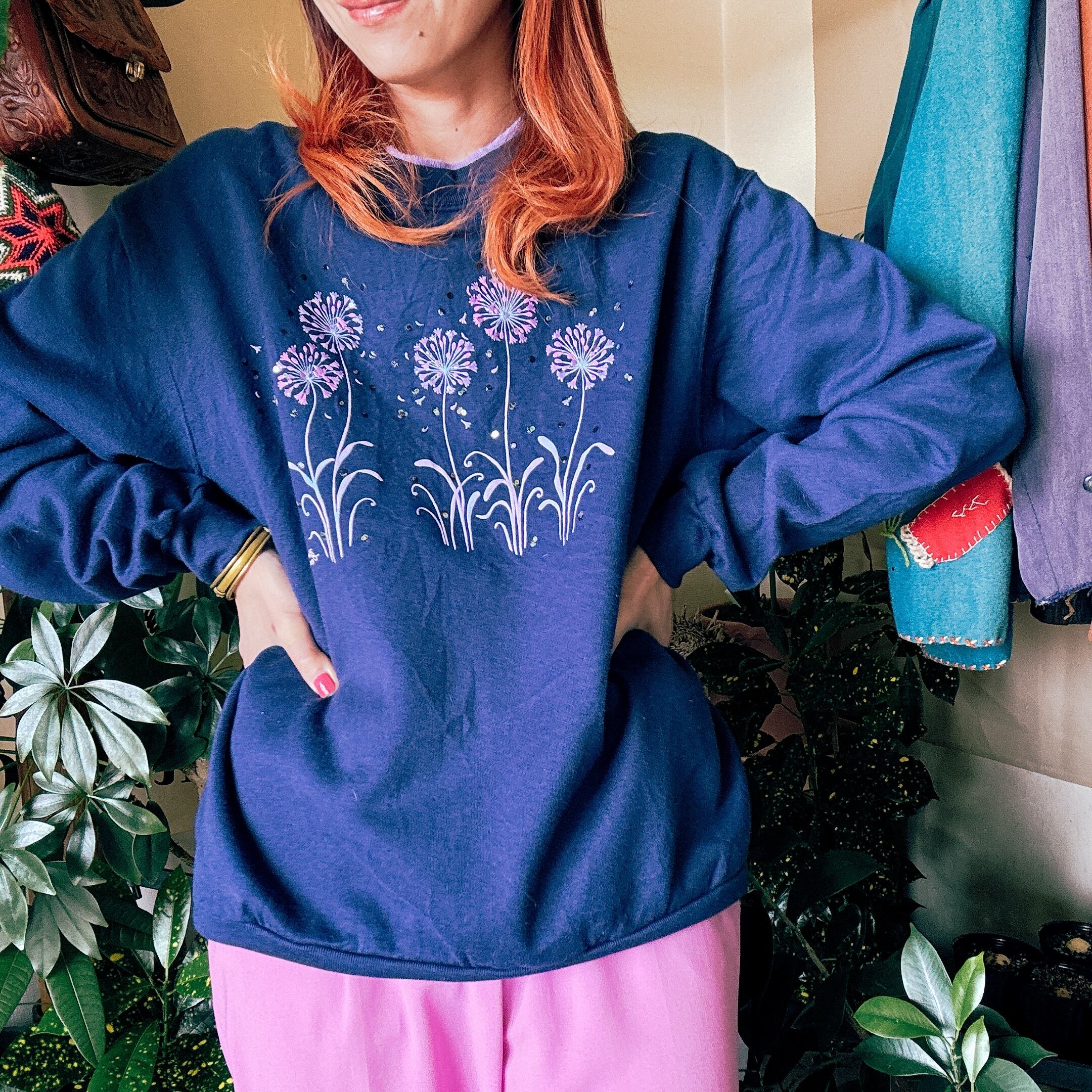 ◾️ ネイビーベースに、パープルのフラワーモチーフが浮かび上がるヴィンテージライクなスウェット。