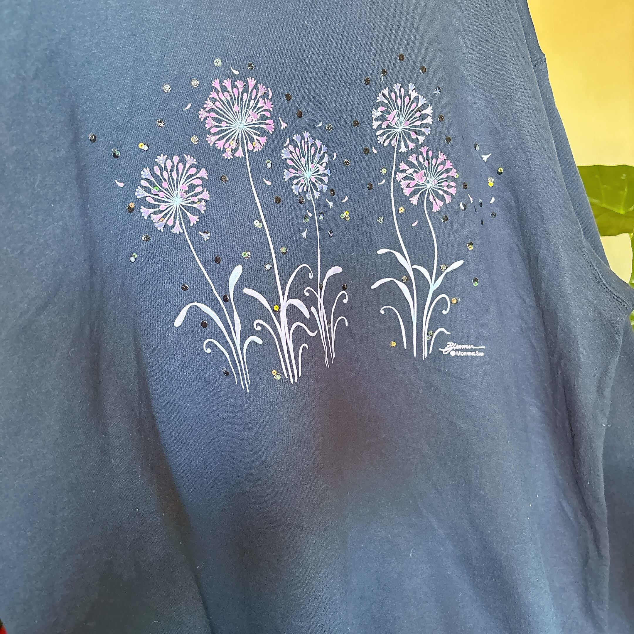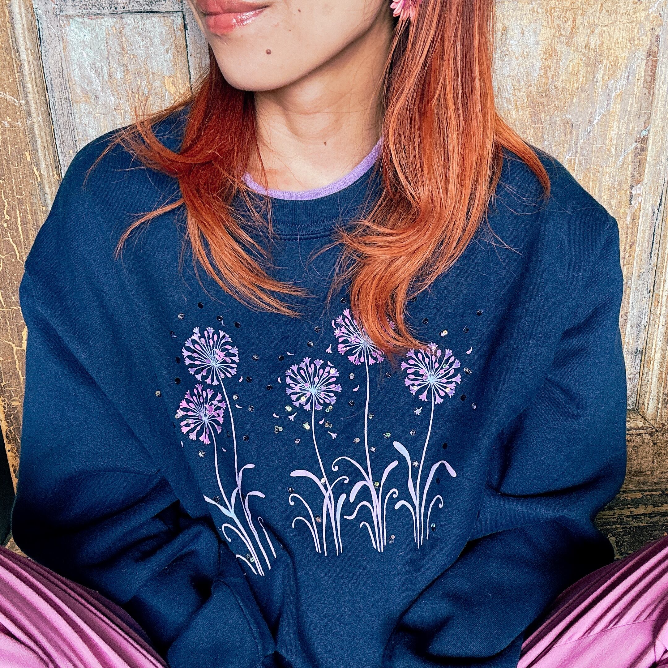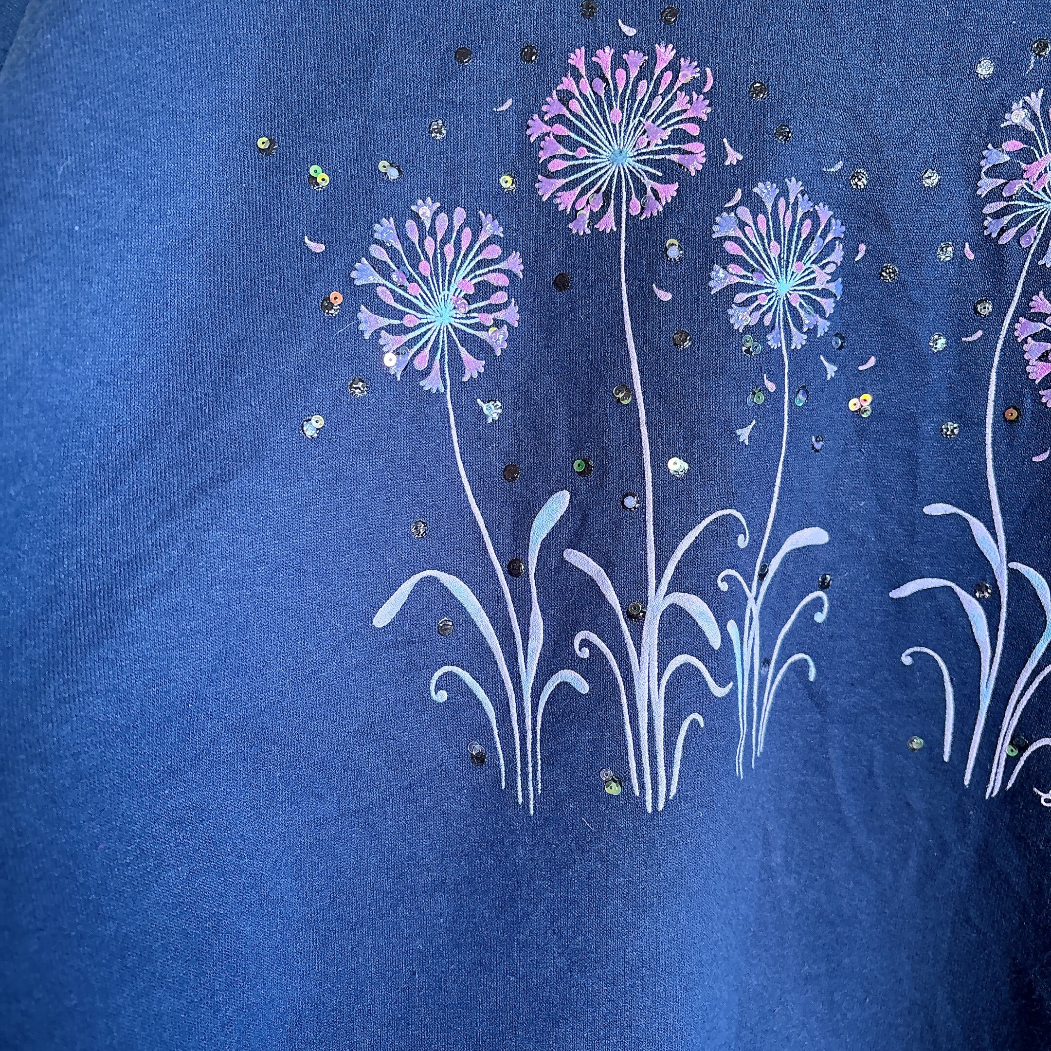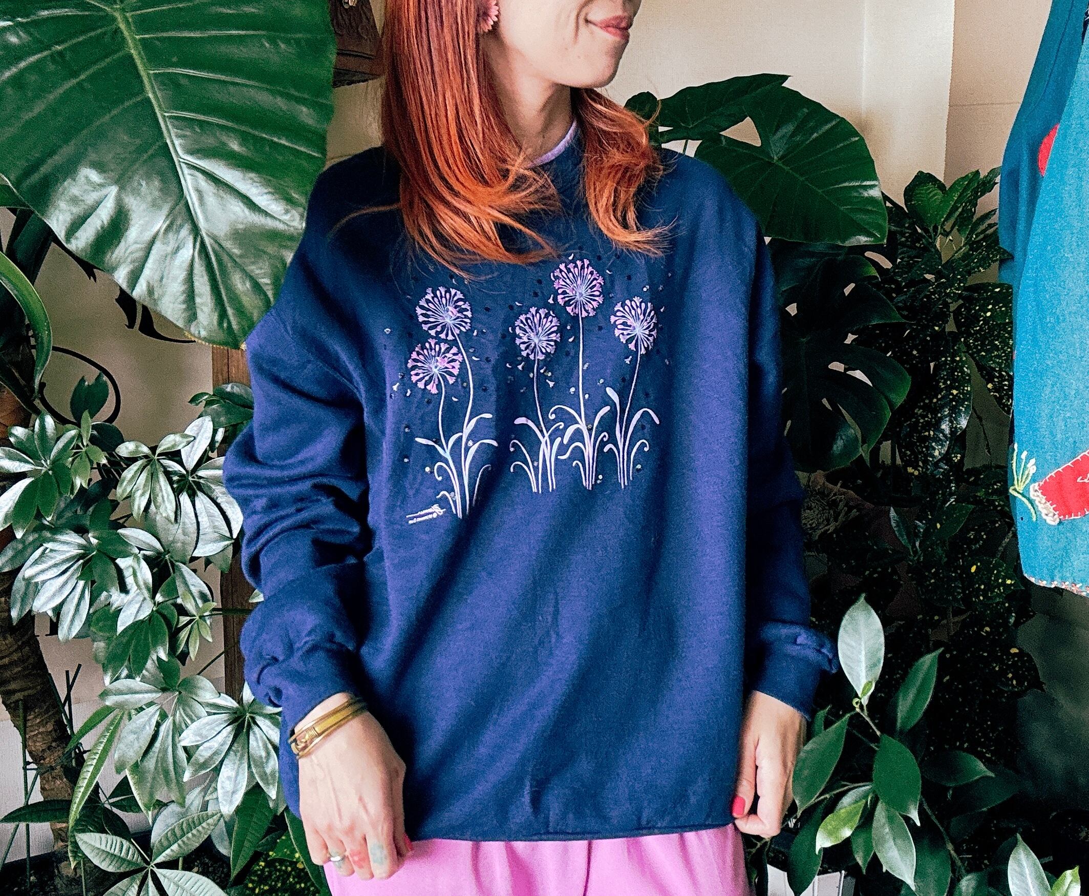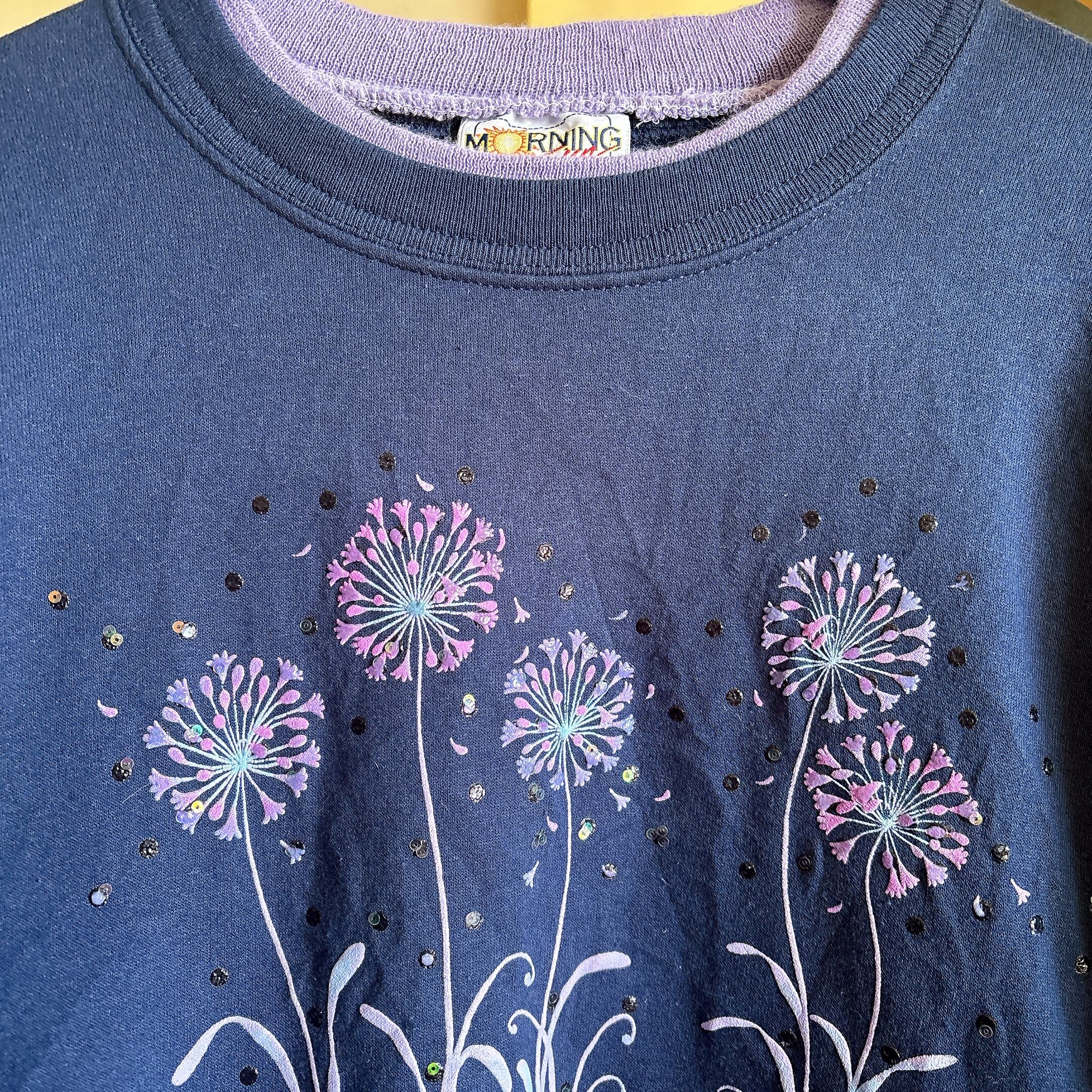 ◾️ ネイビーベースに、パープルのフラワーモチーフが浮かび上がるヴィンテージライクなスウェット。