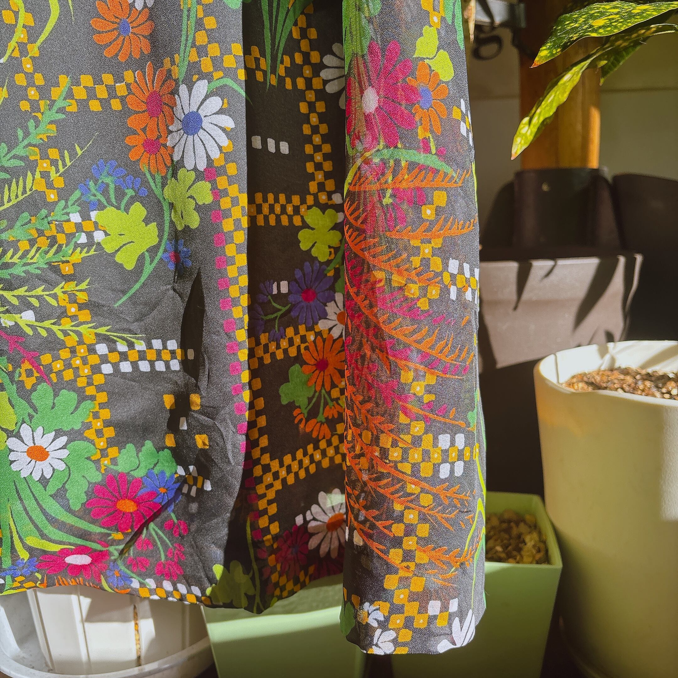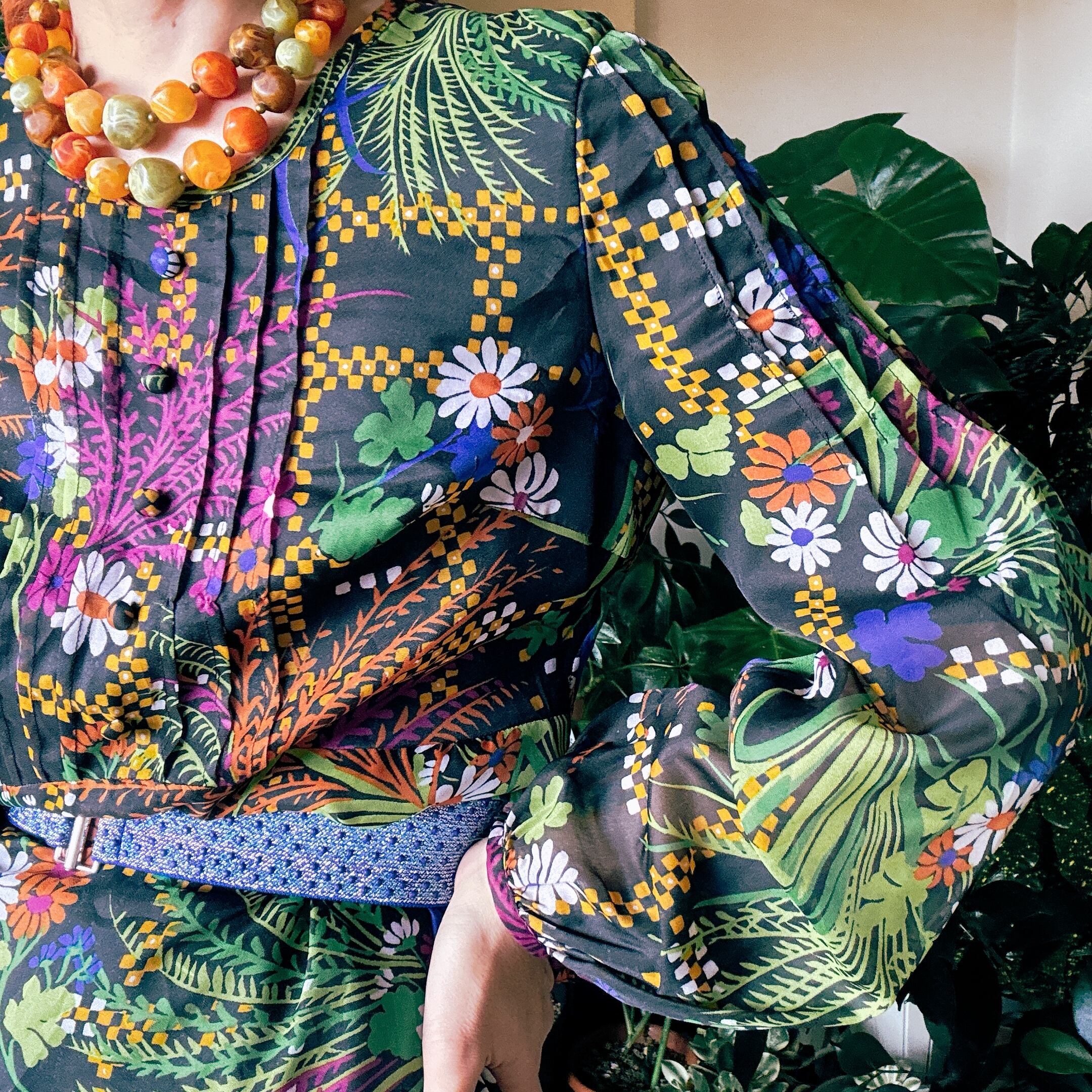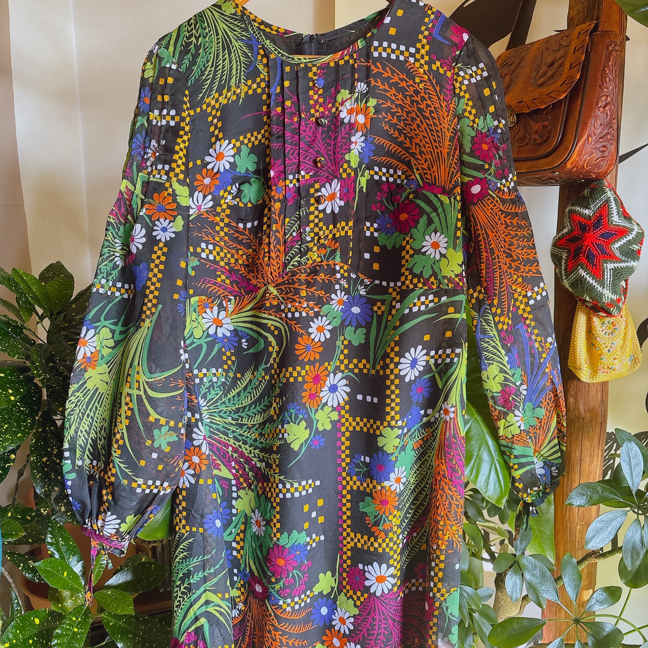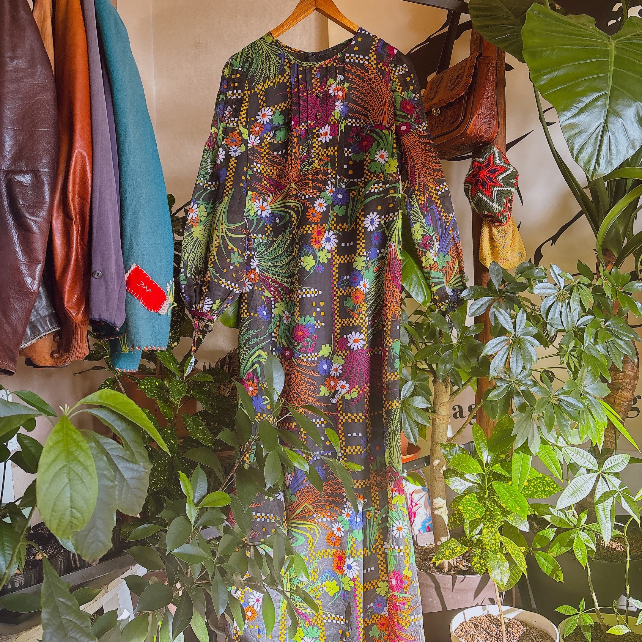 ◾️黒地をベースに、ボタニカルモチーフと小花柄がリズミカルに散りばめられた、印象的なヴィンテージドレス。