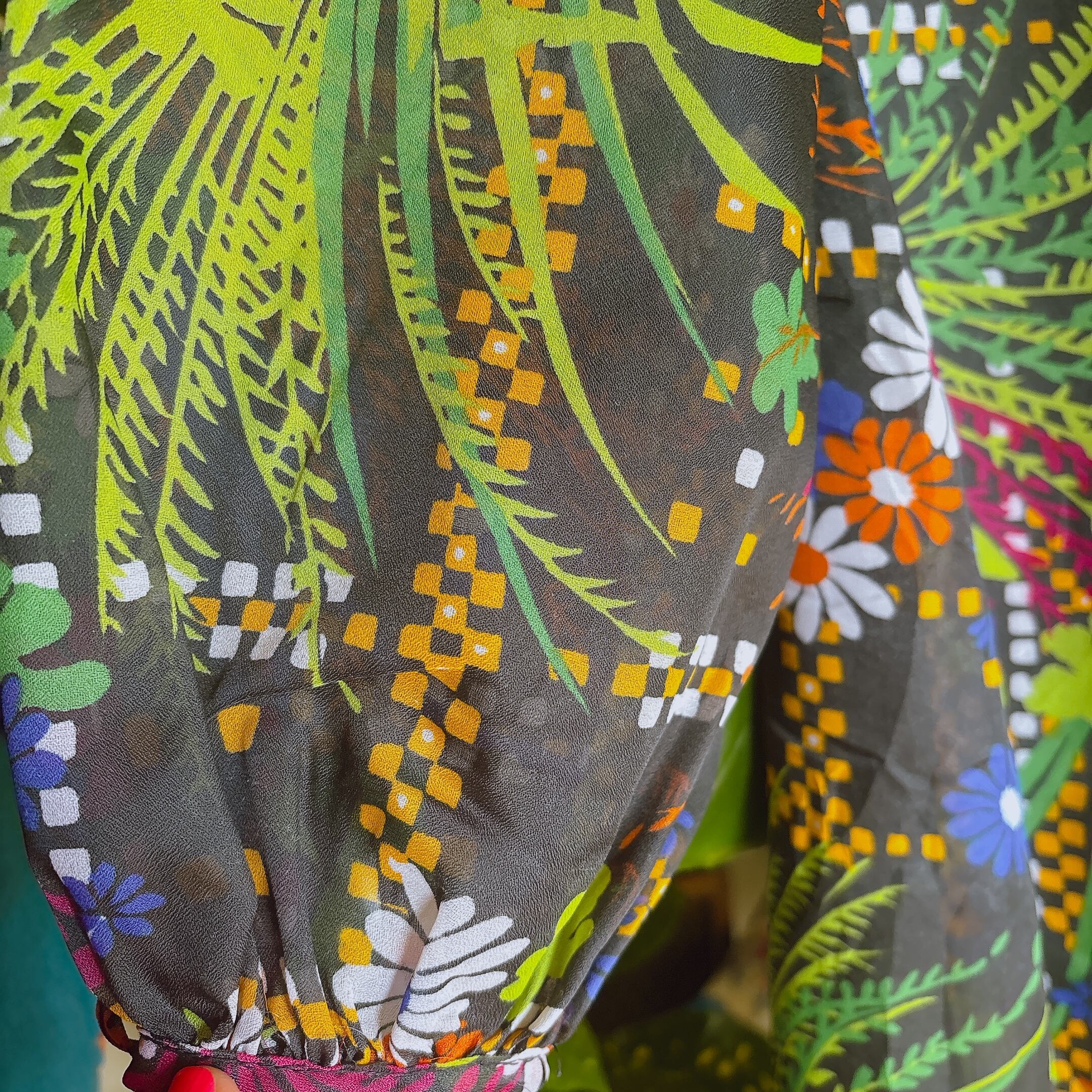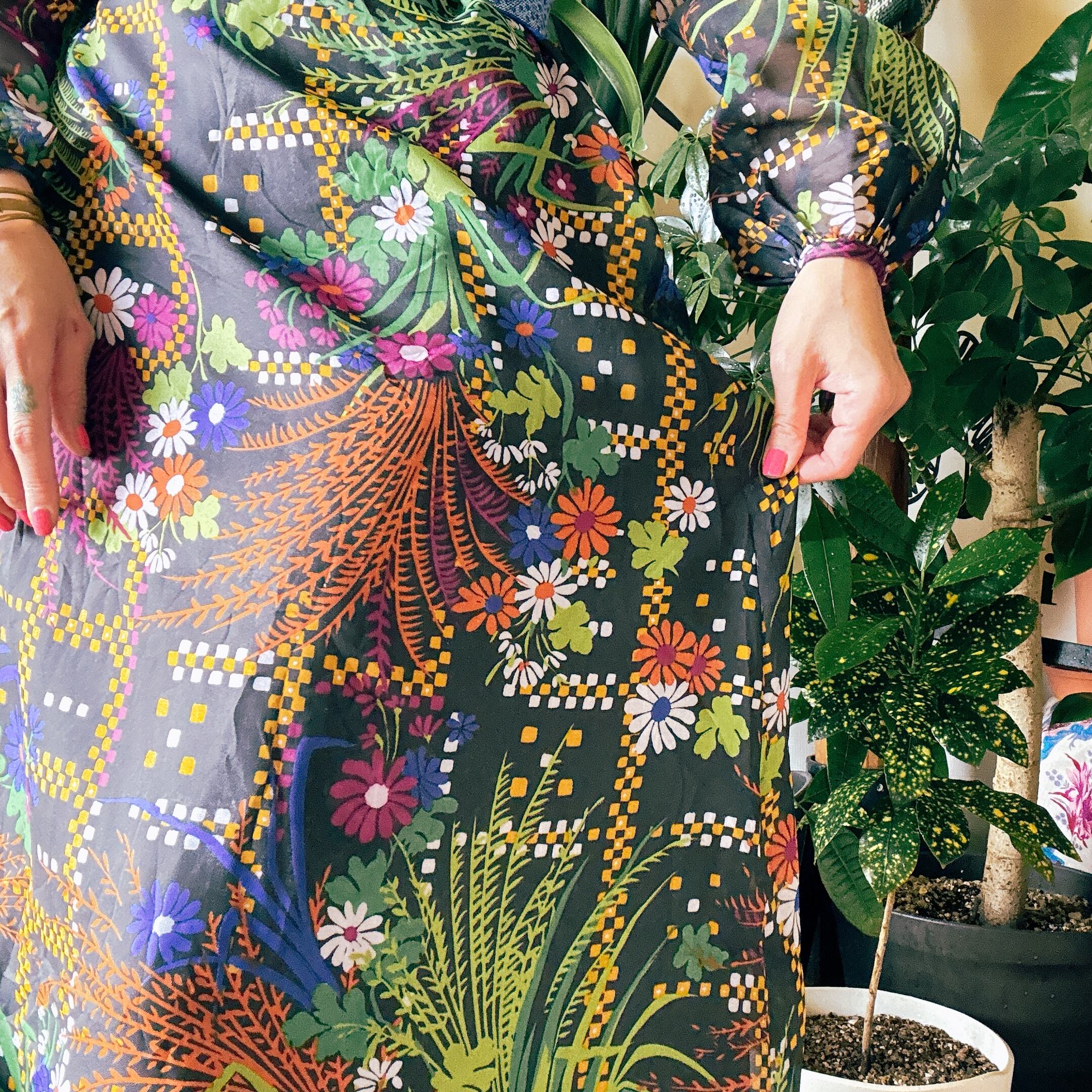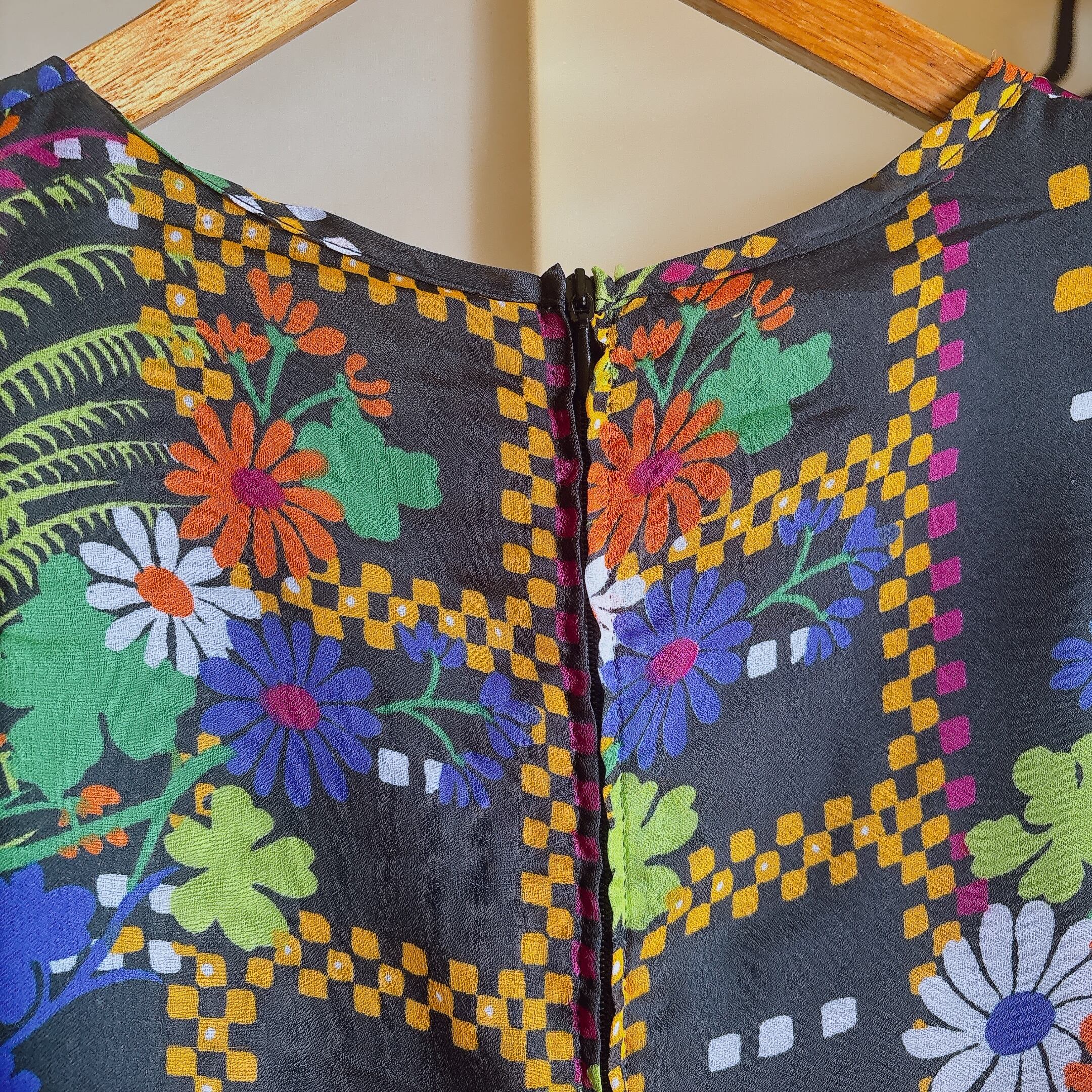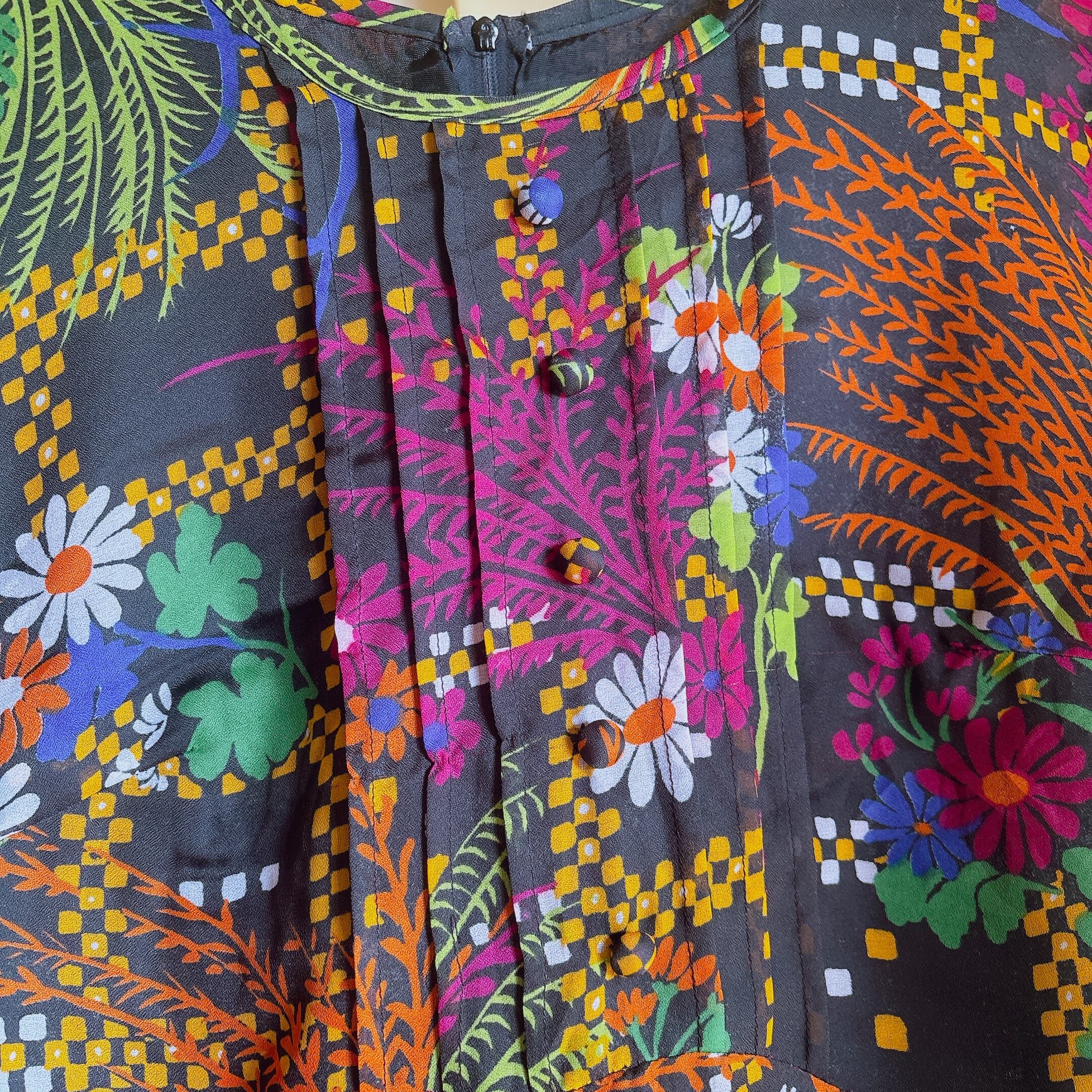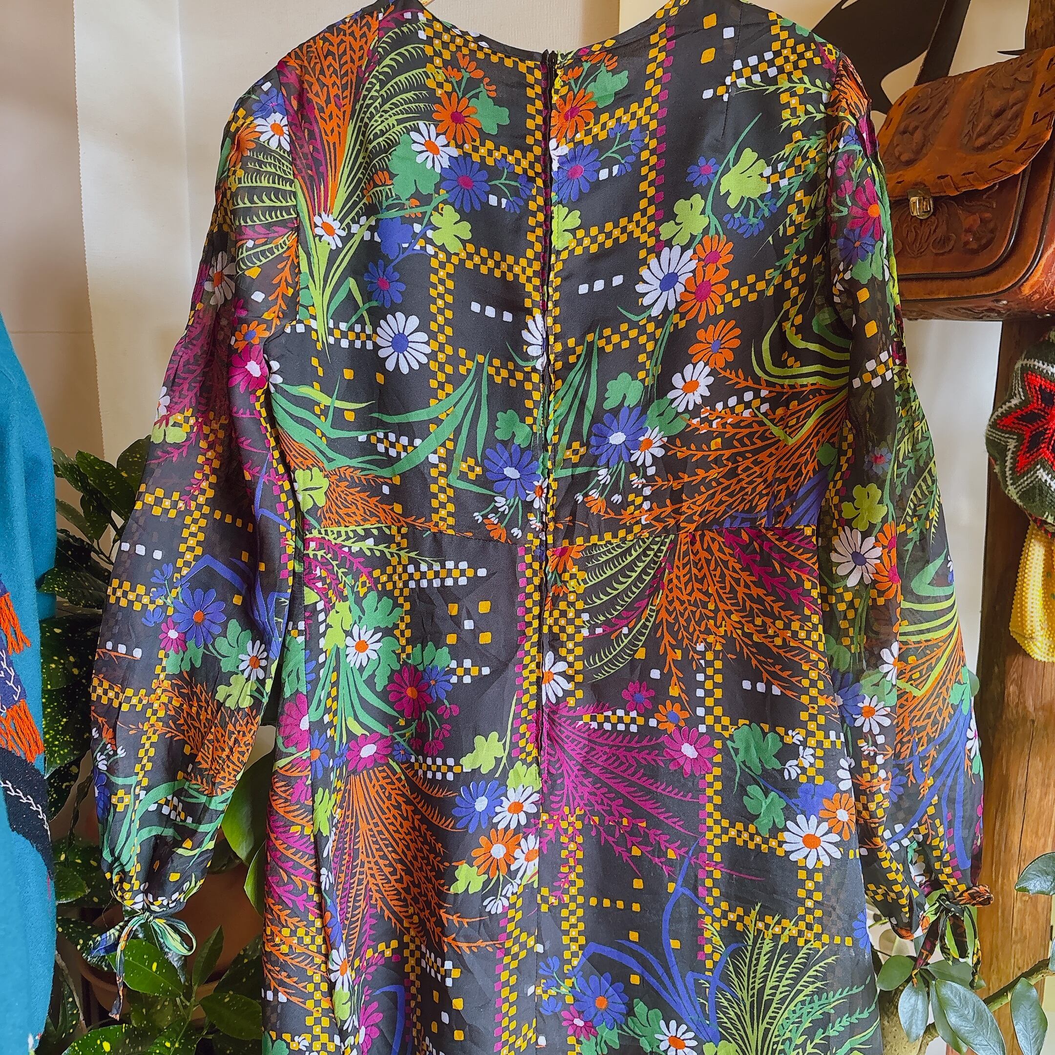 ◾️黒地をベースに、ボタニカルモチーフと小花柄がリズミカルに散りばめられた、印象的なヴィンテージドレス。