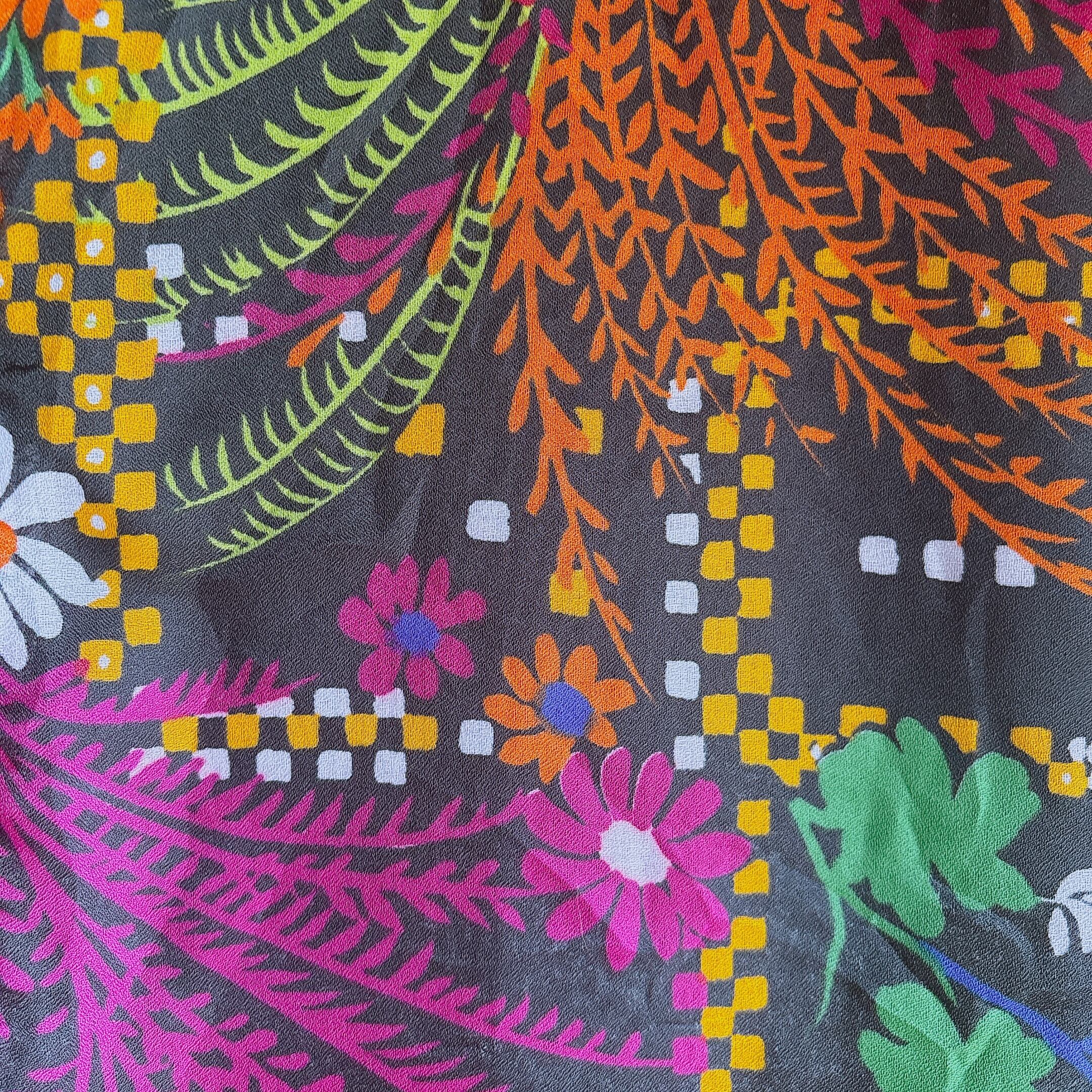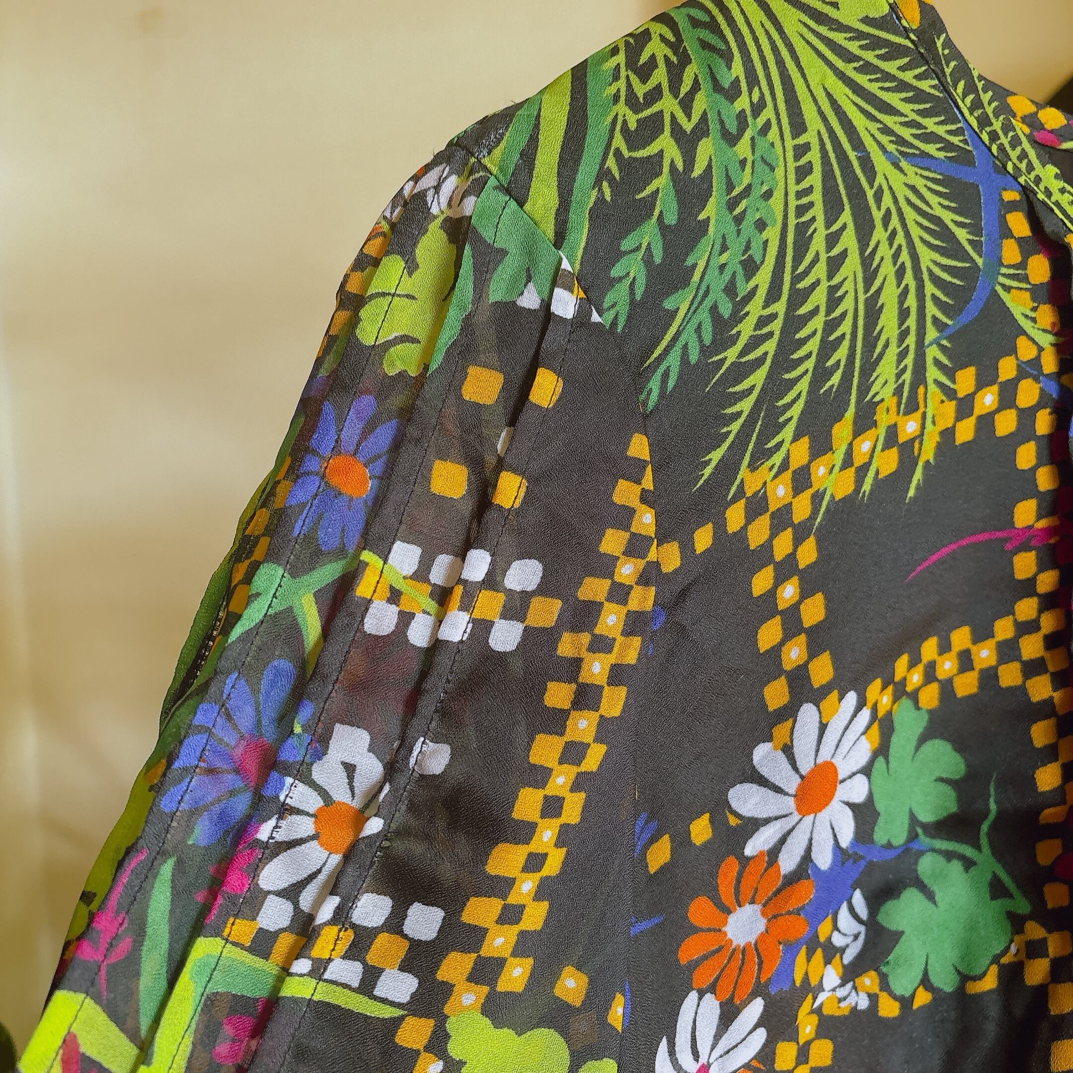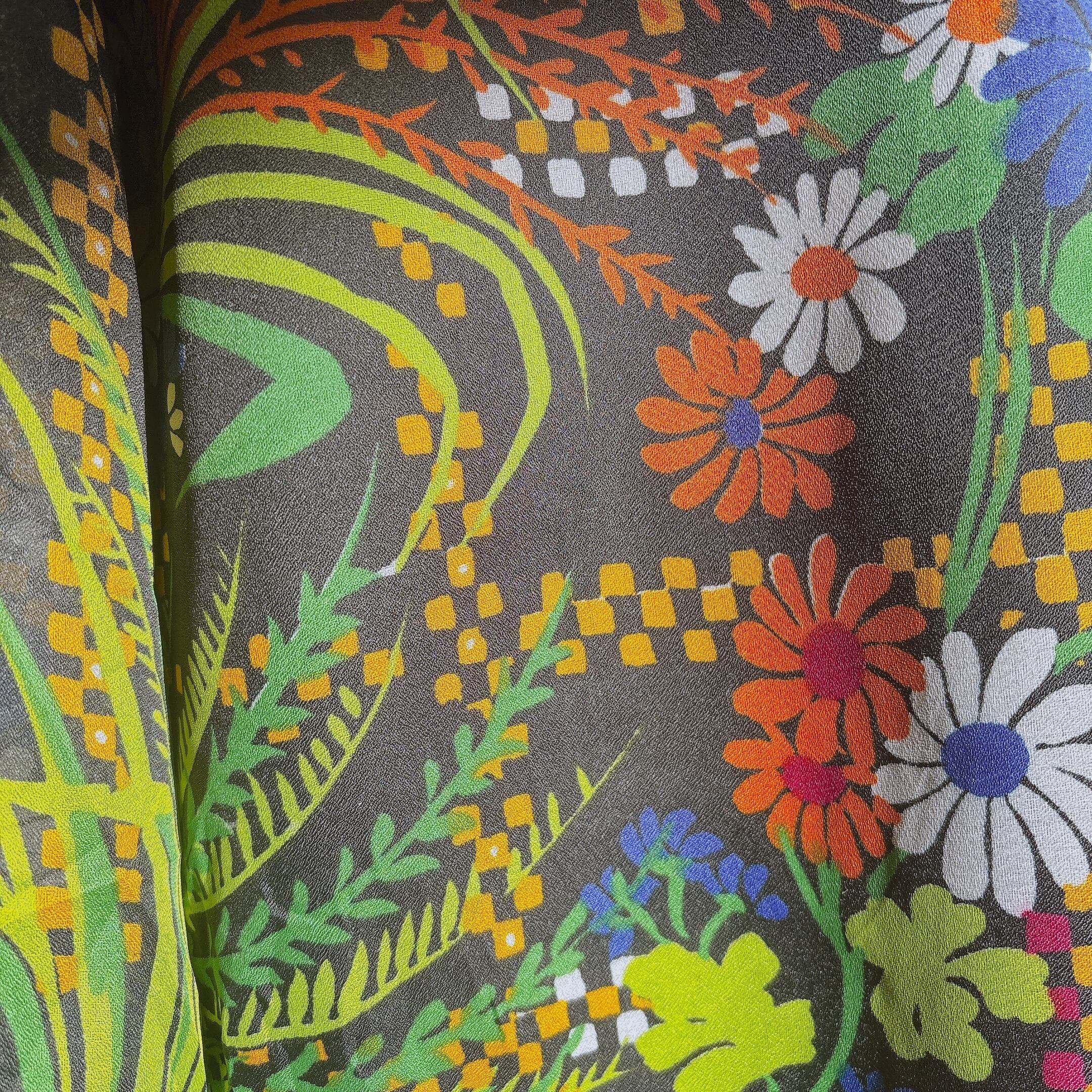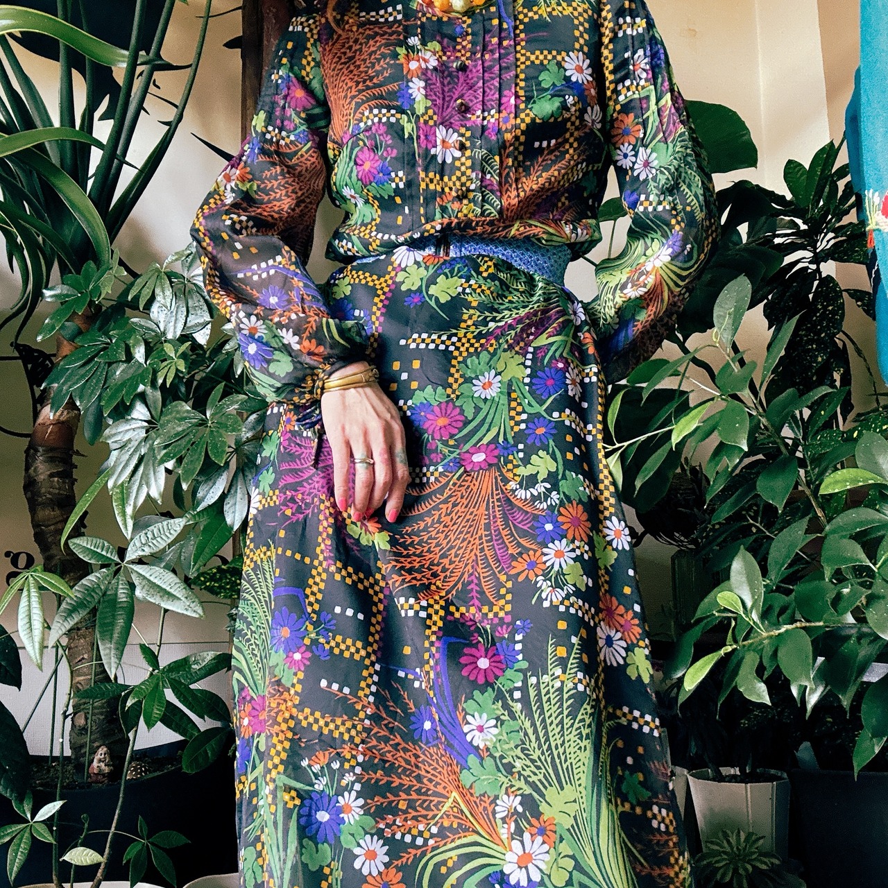 ◾️黒地をベースに、ボタニカルモチーフと小花柄がリズミカルに散りばめられた、印象的なヴィンテージドレス。