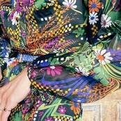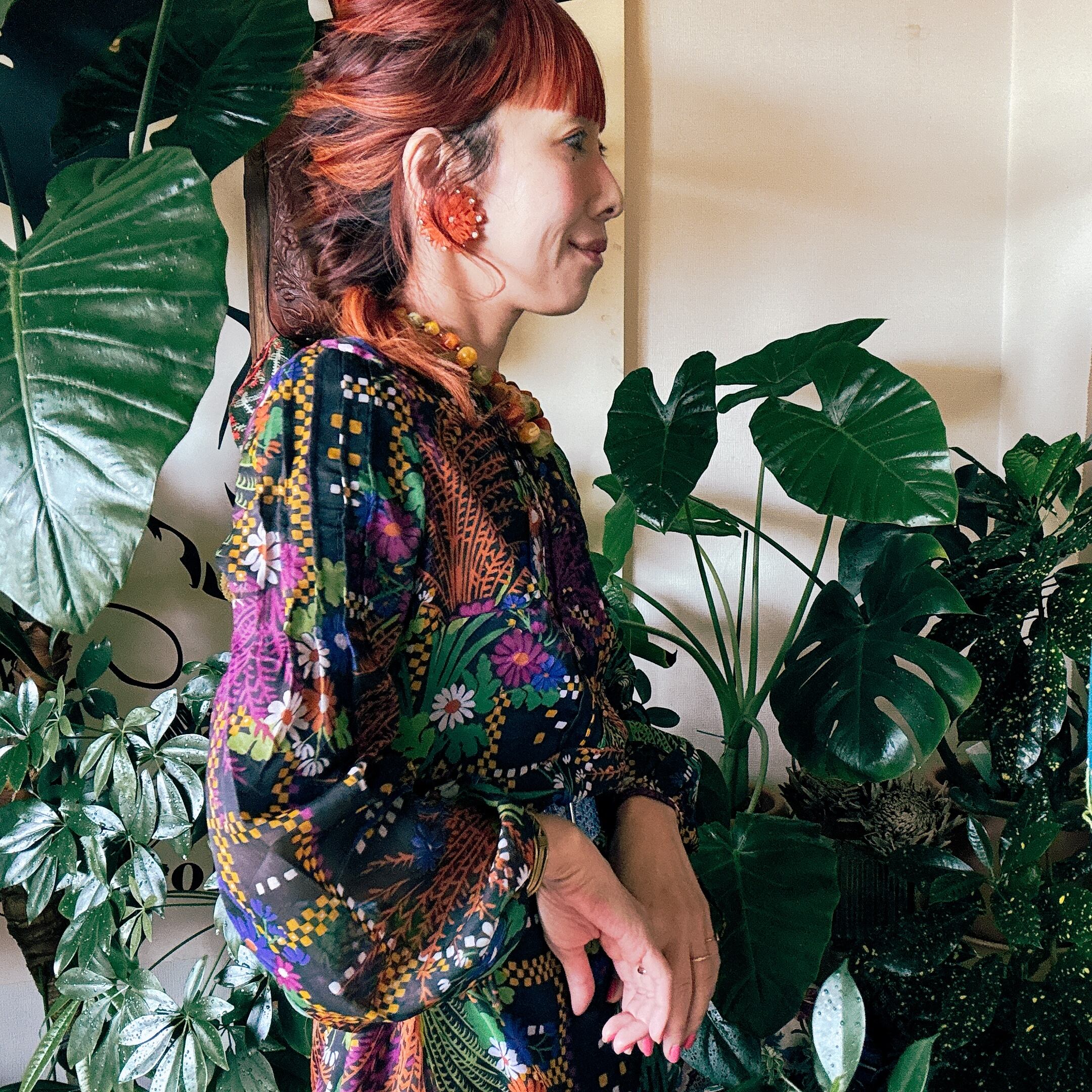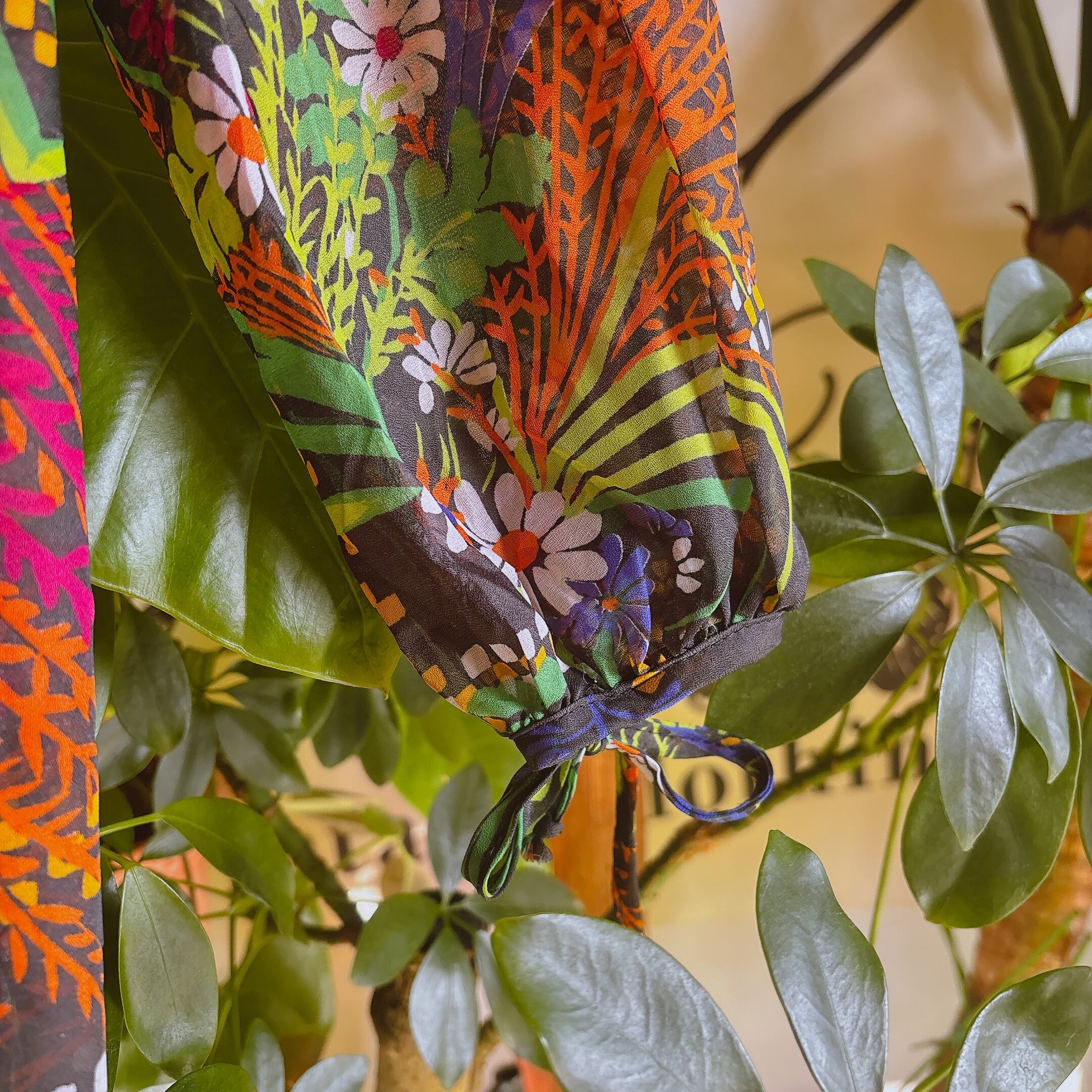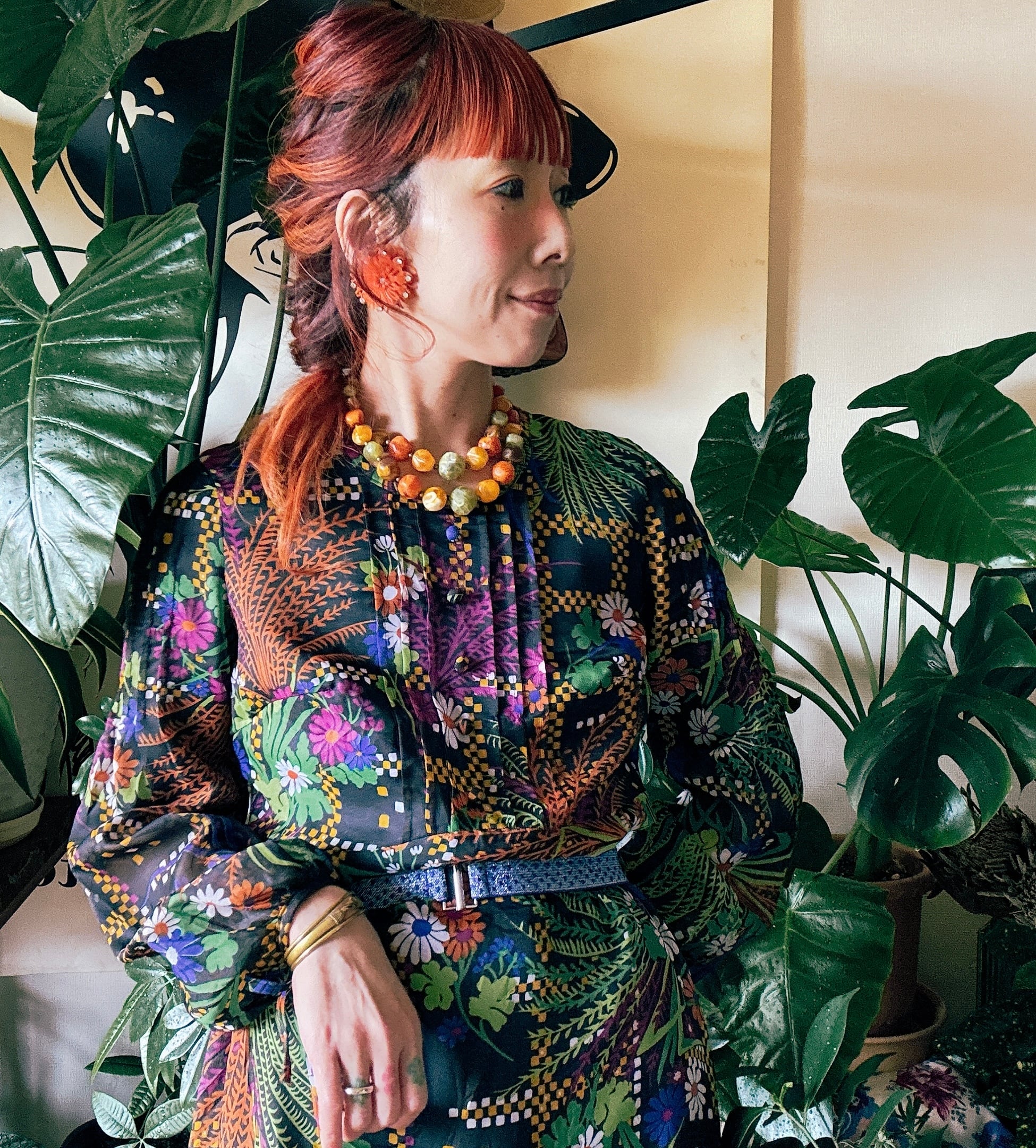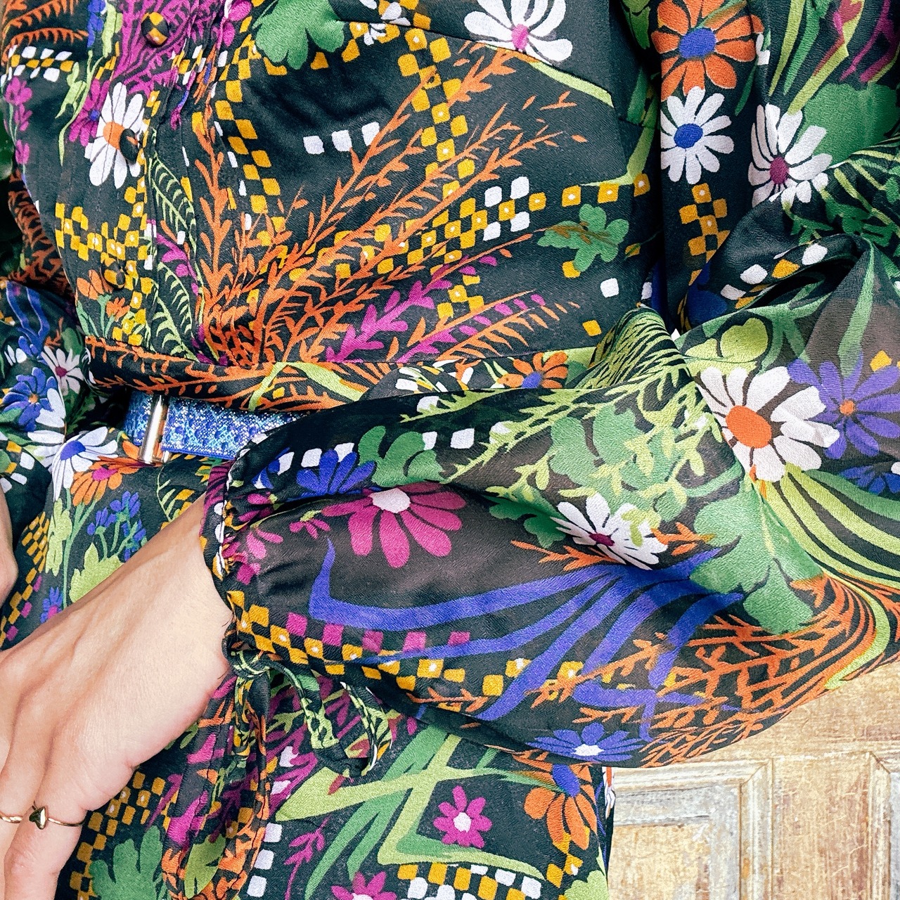 ◾️黒地をベースに、ボタニカルモチーフと小花柄がリズミカルに散りばめられた、印象的なヴィンテージドレス。