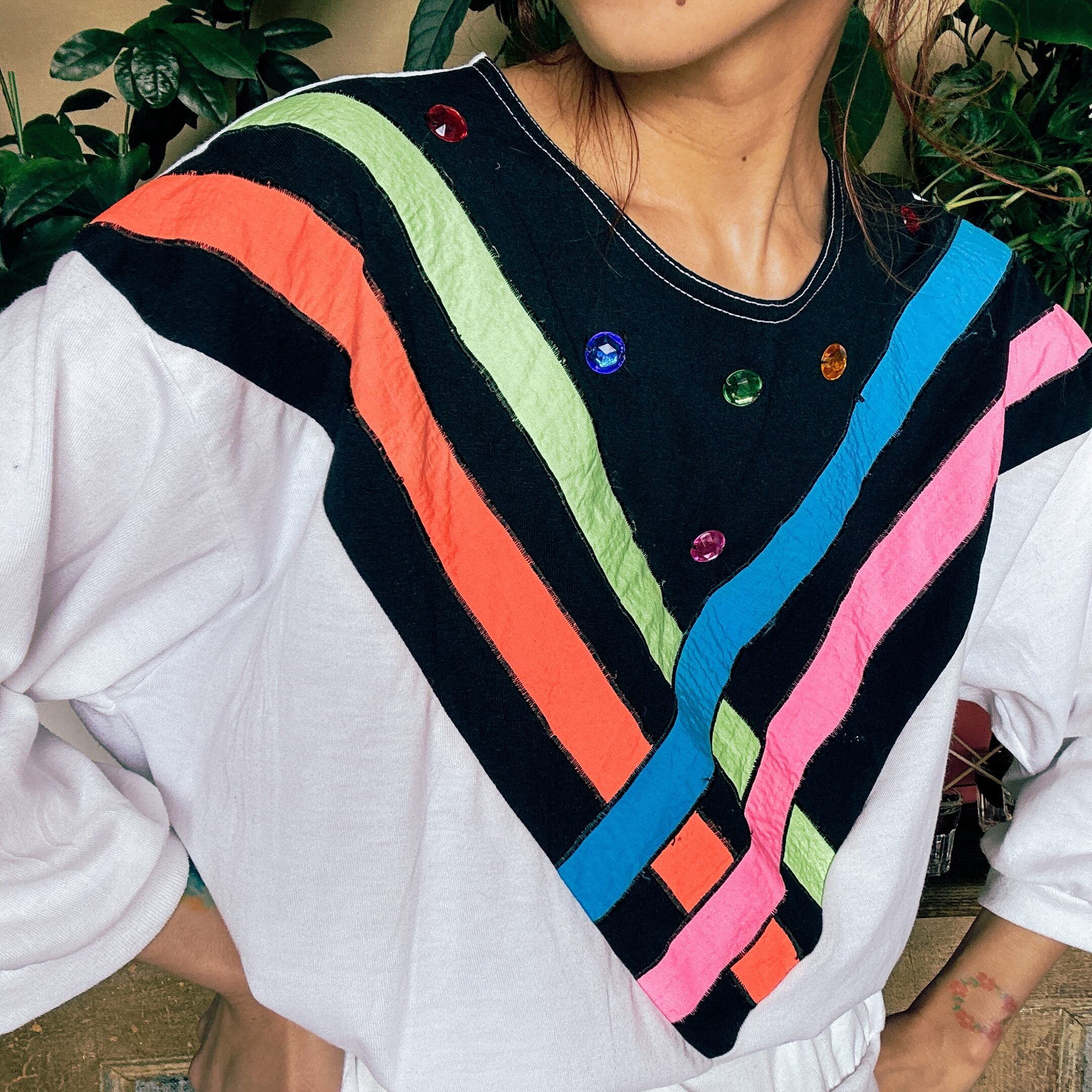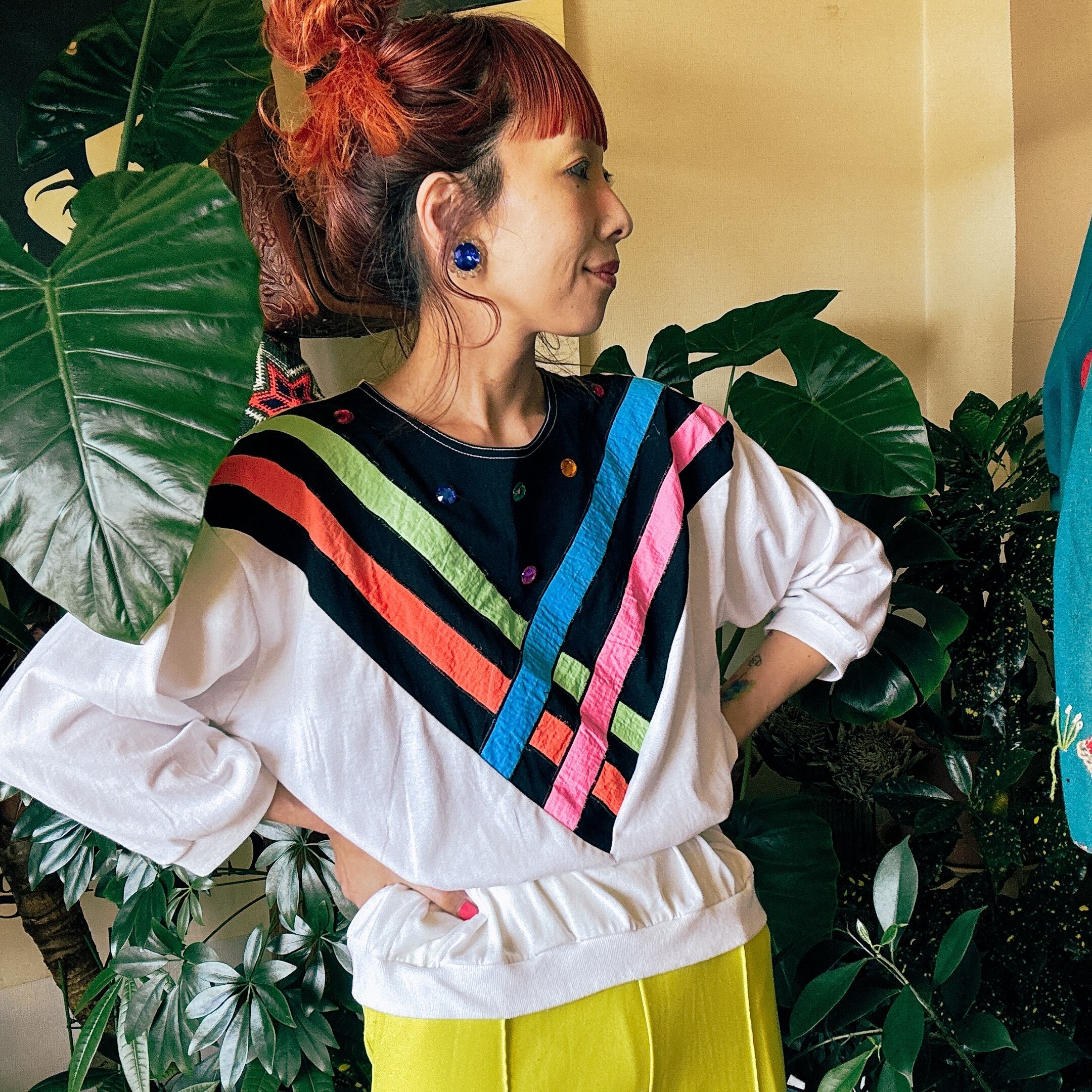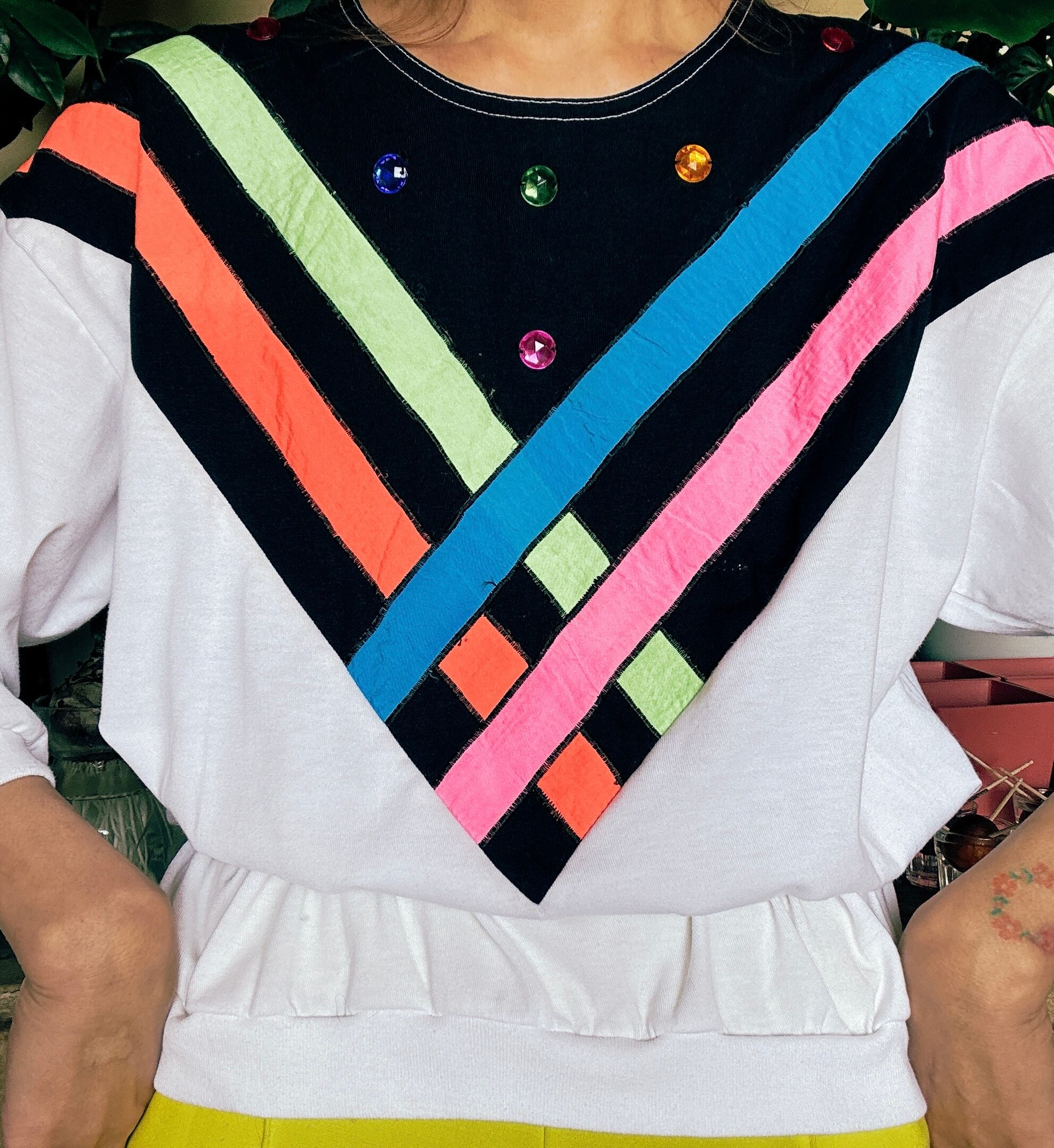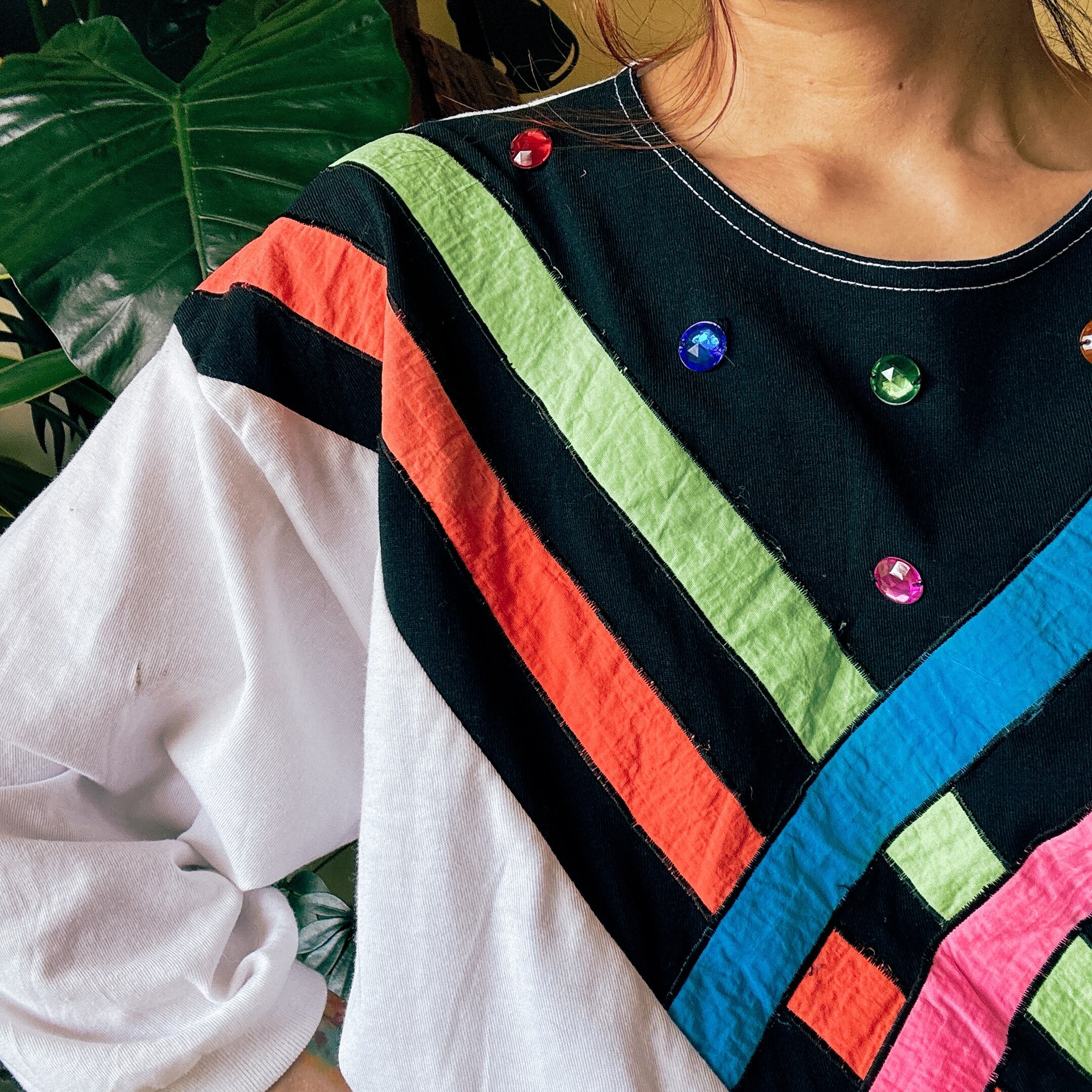 80s カラーストライプ ビジュー デザイン スウェット