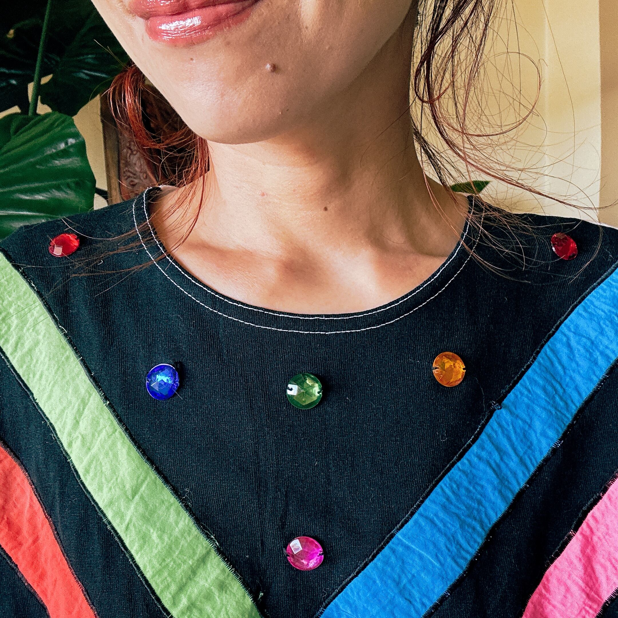 ネックラインにはカラービジューがあしらわれ、
