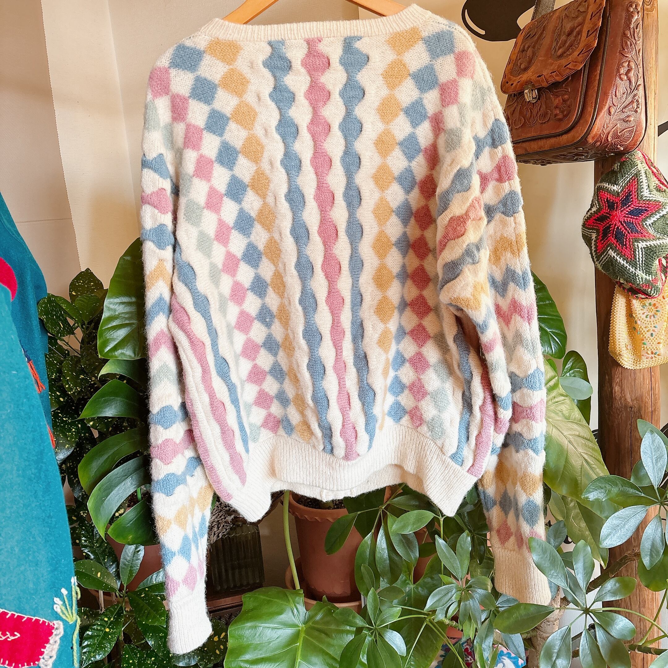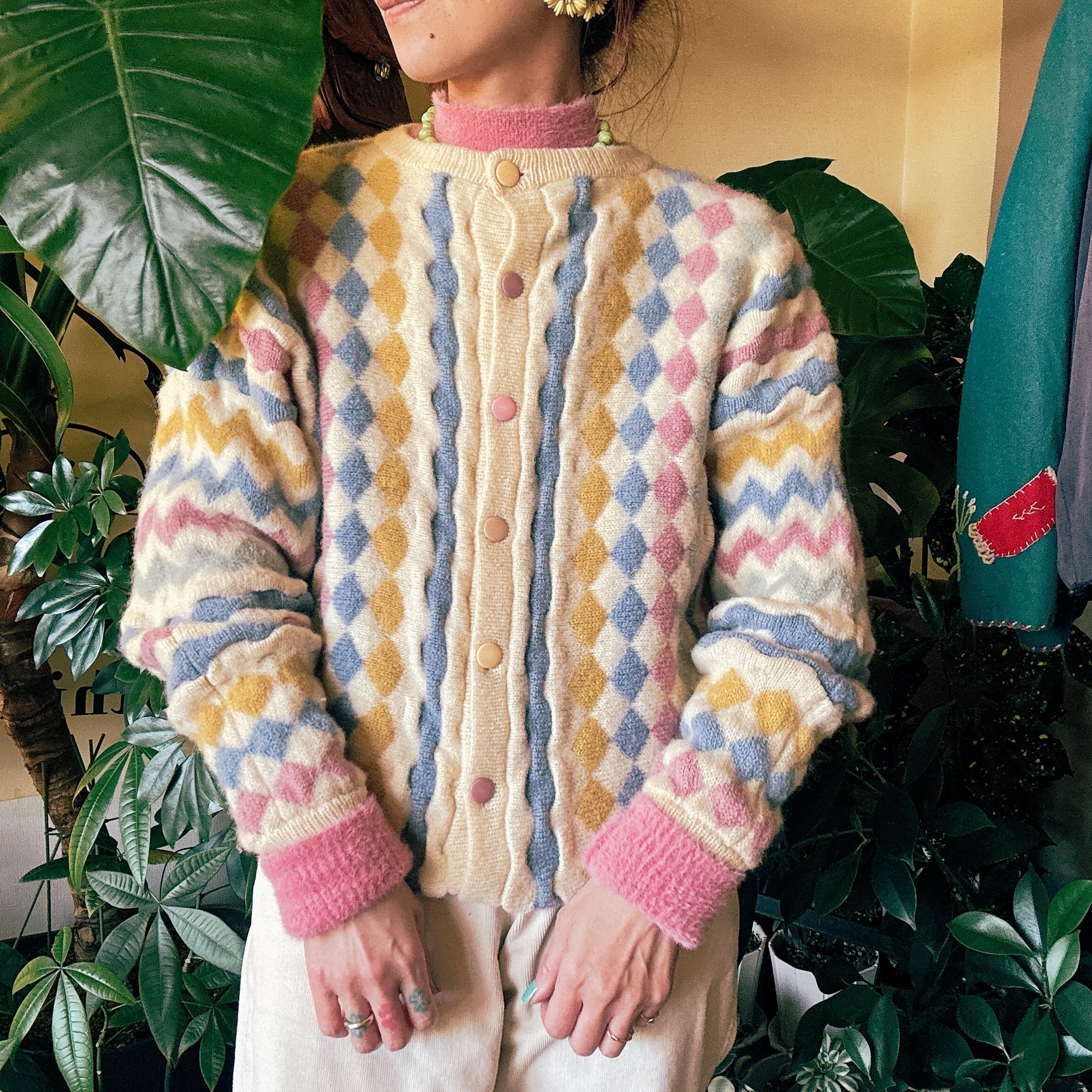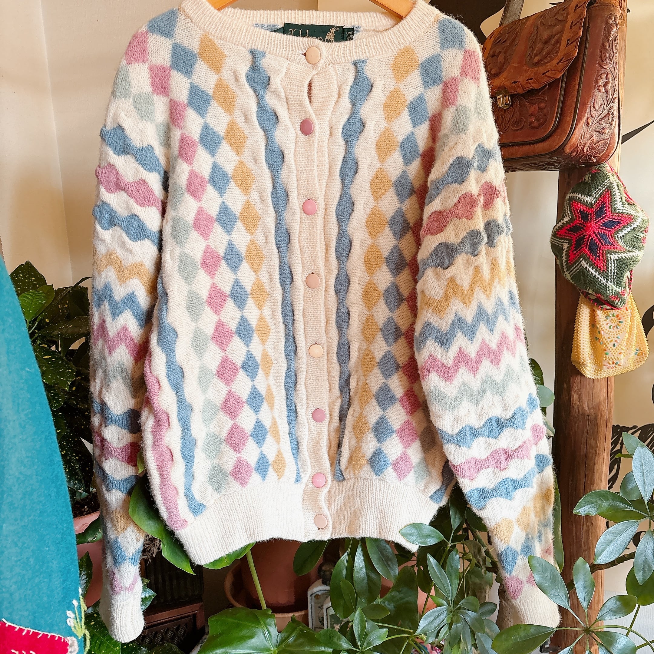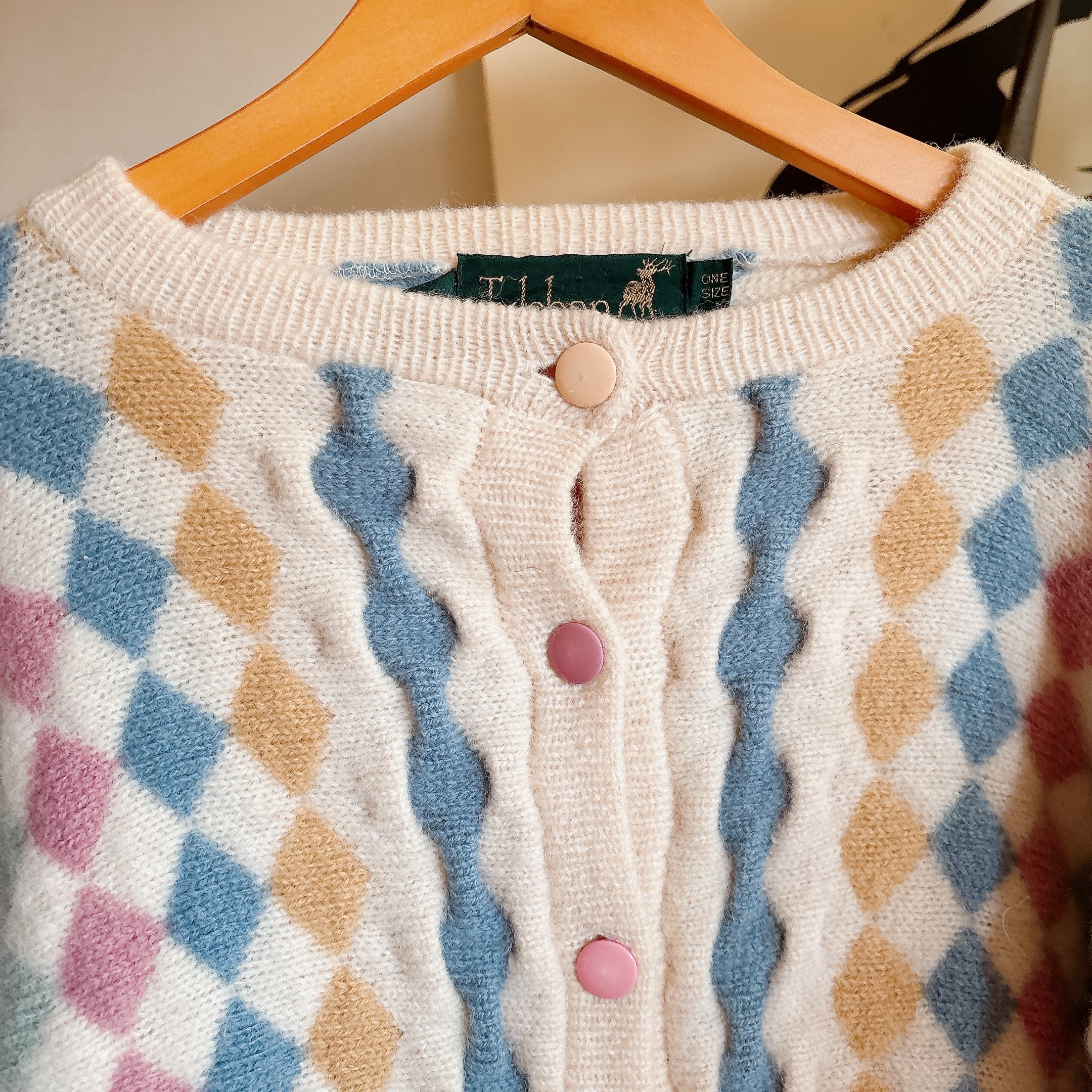 70-80s パステルアーガイル ウェーブ編み ピュアウール カーディガン