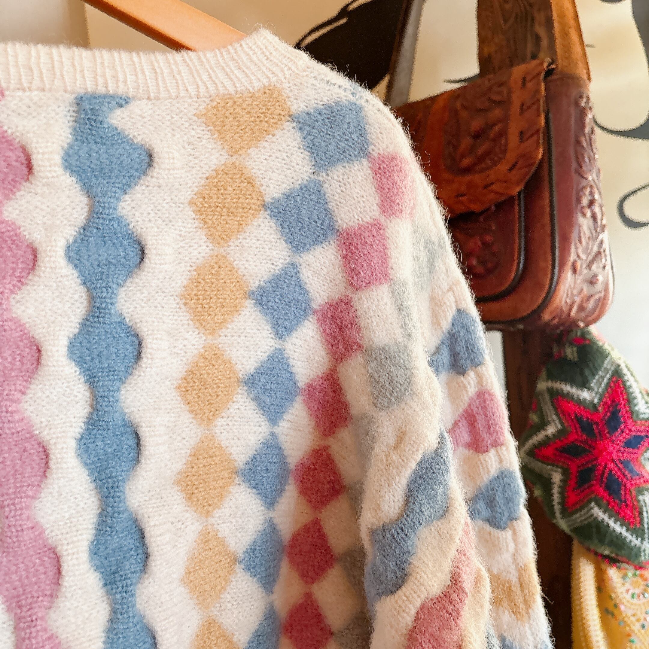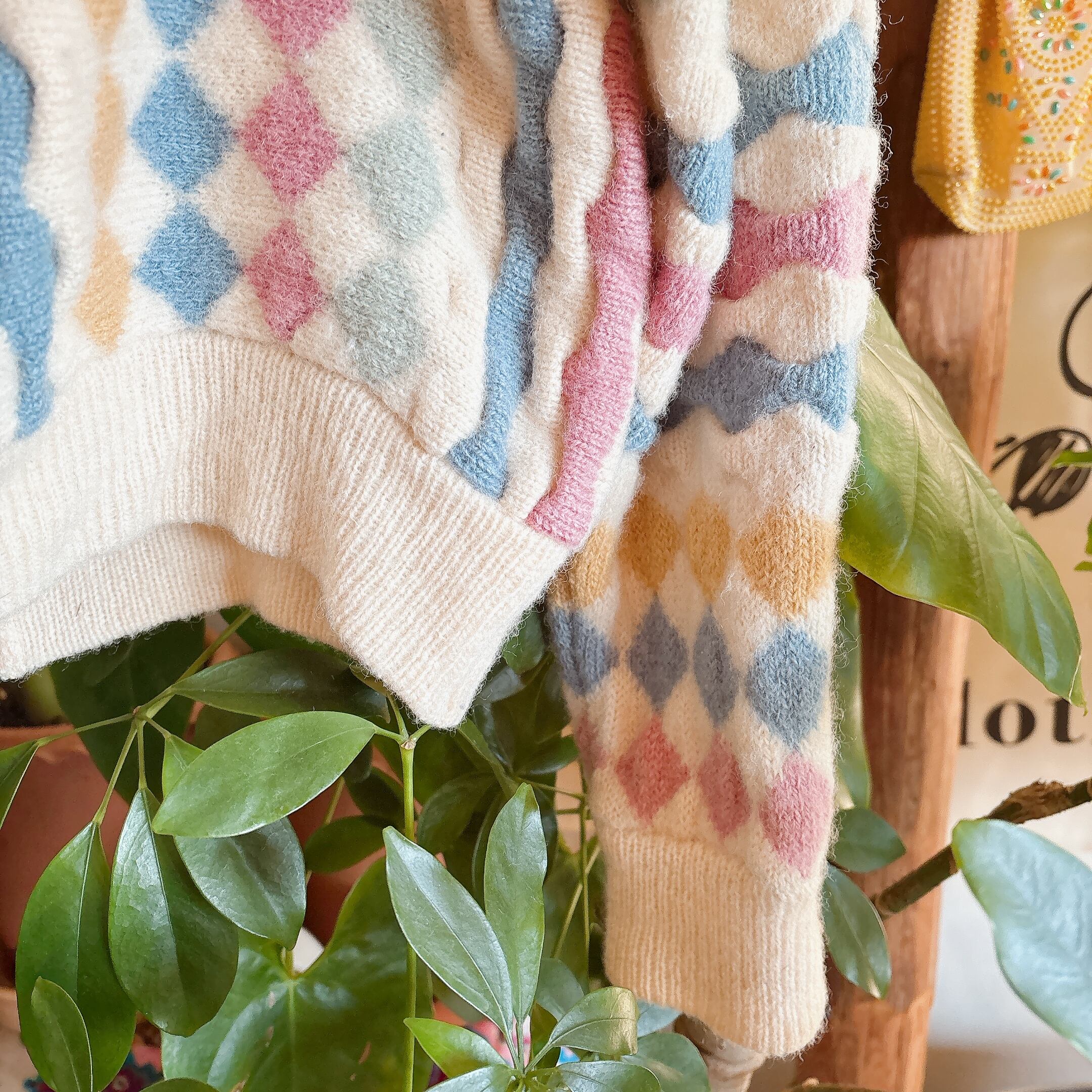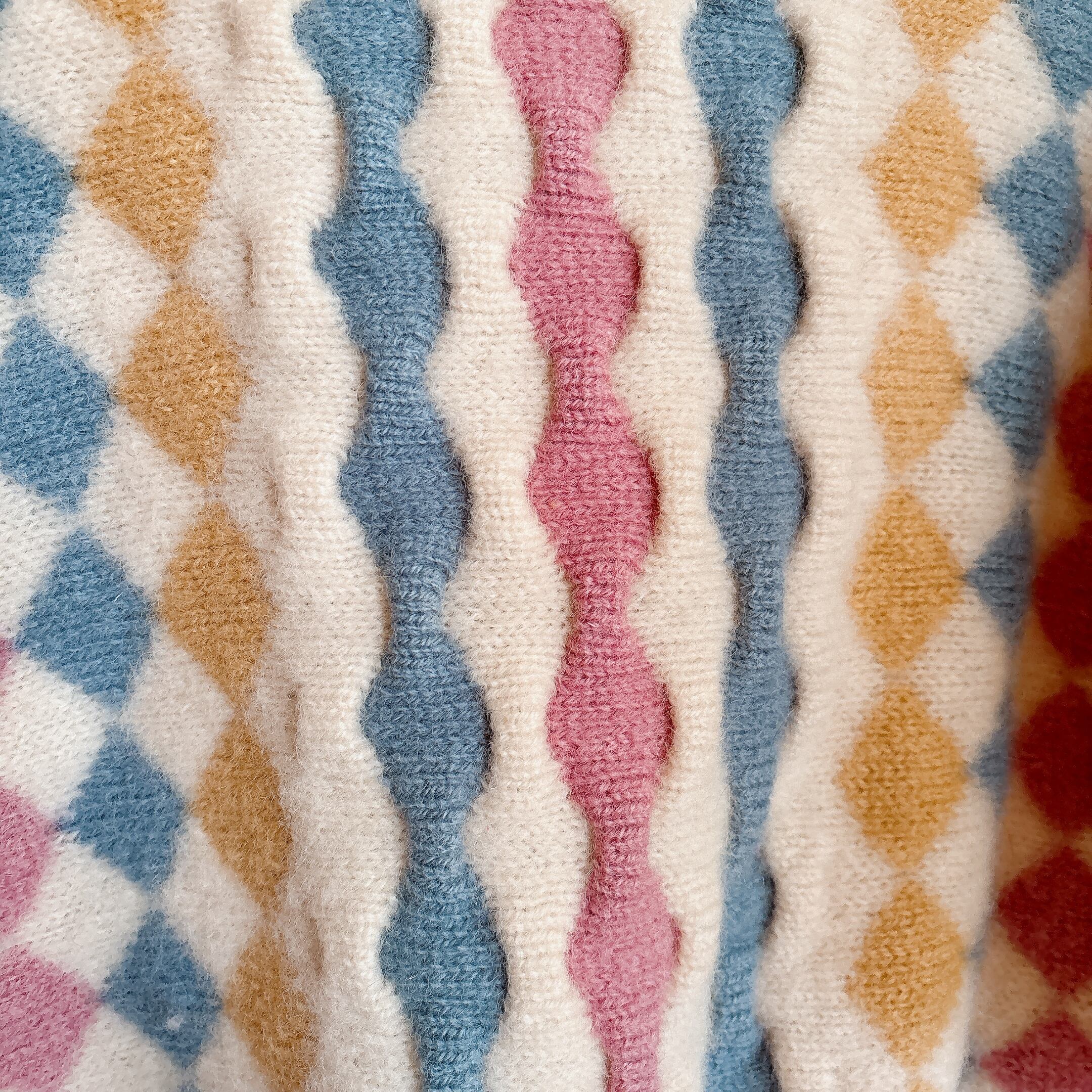 パステルピンク・ブルー・イエローの優しい配色に、アーガイル×ウェーブの立体的な編み柄が目を惹く一枚です。