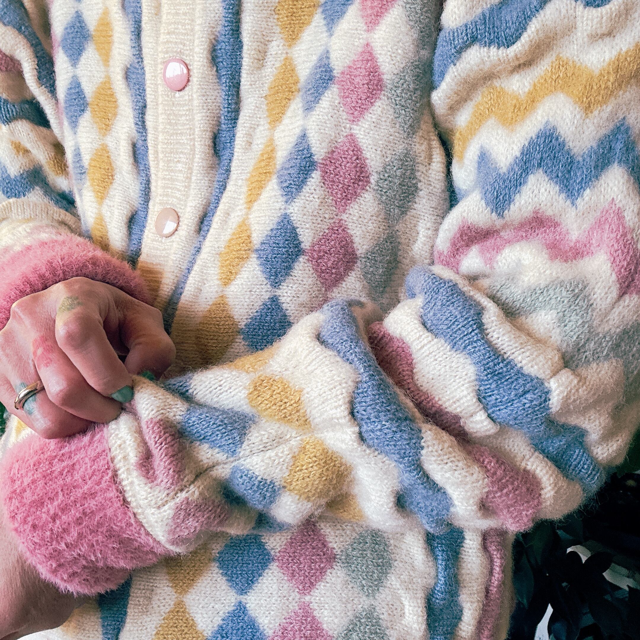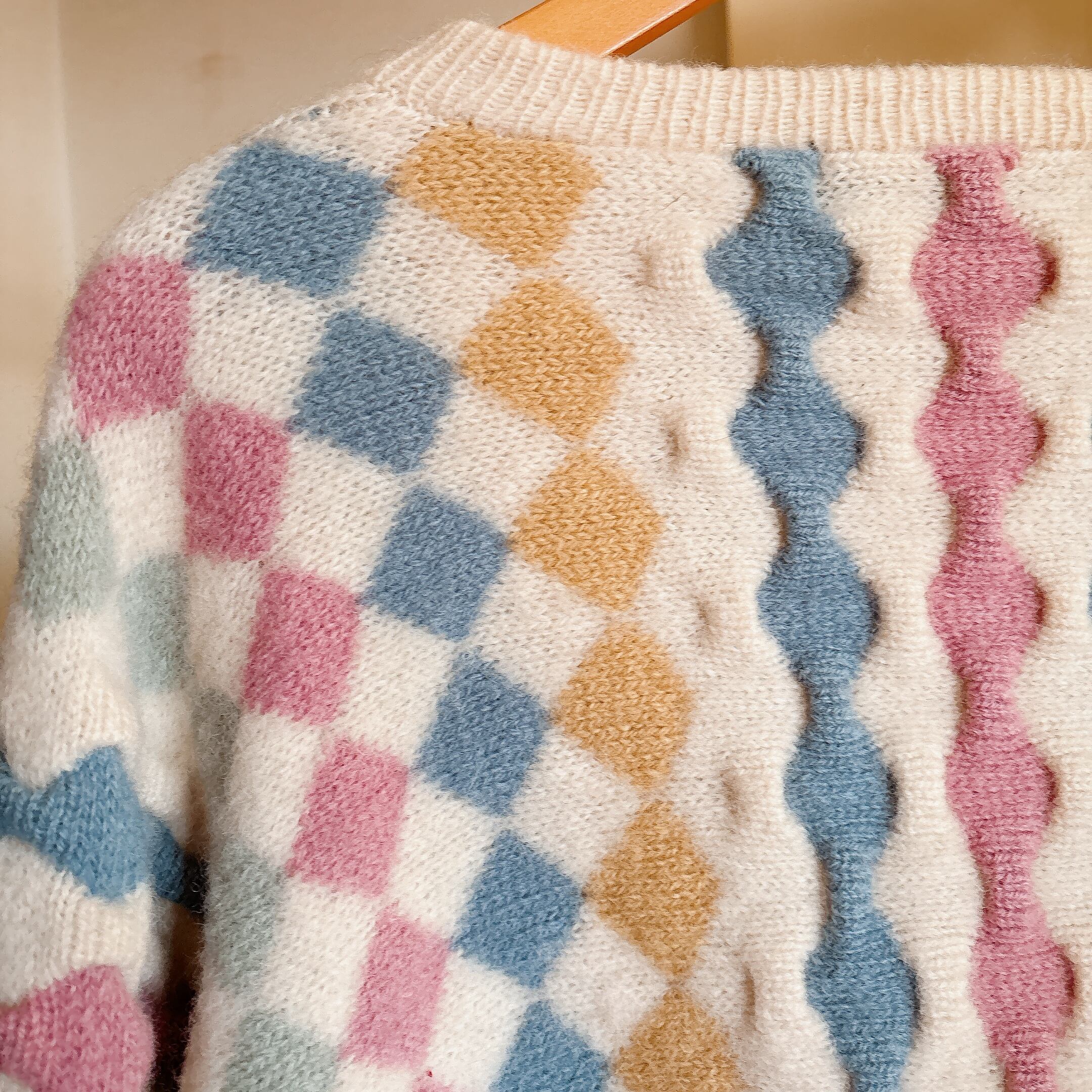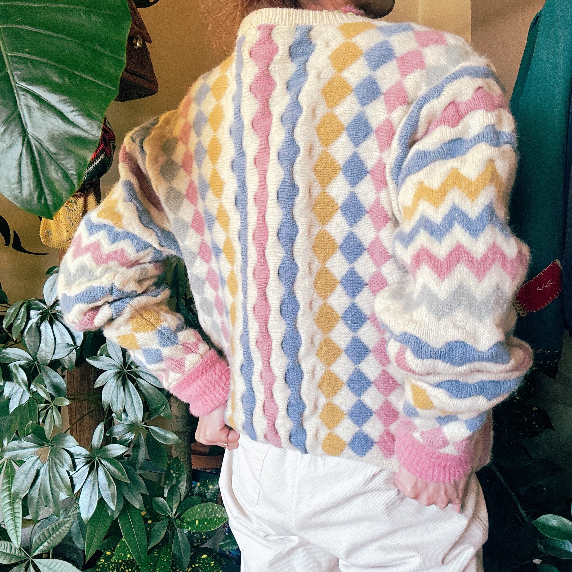パステルピンク・ブルー・イエローの優しい配色に、アーガイル×ウェーブの立体的な編み柄が目を惹く一枚です。
