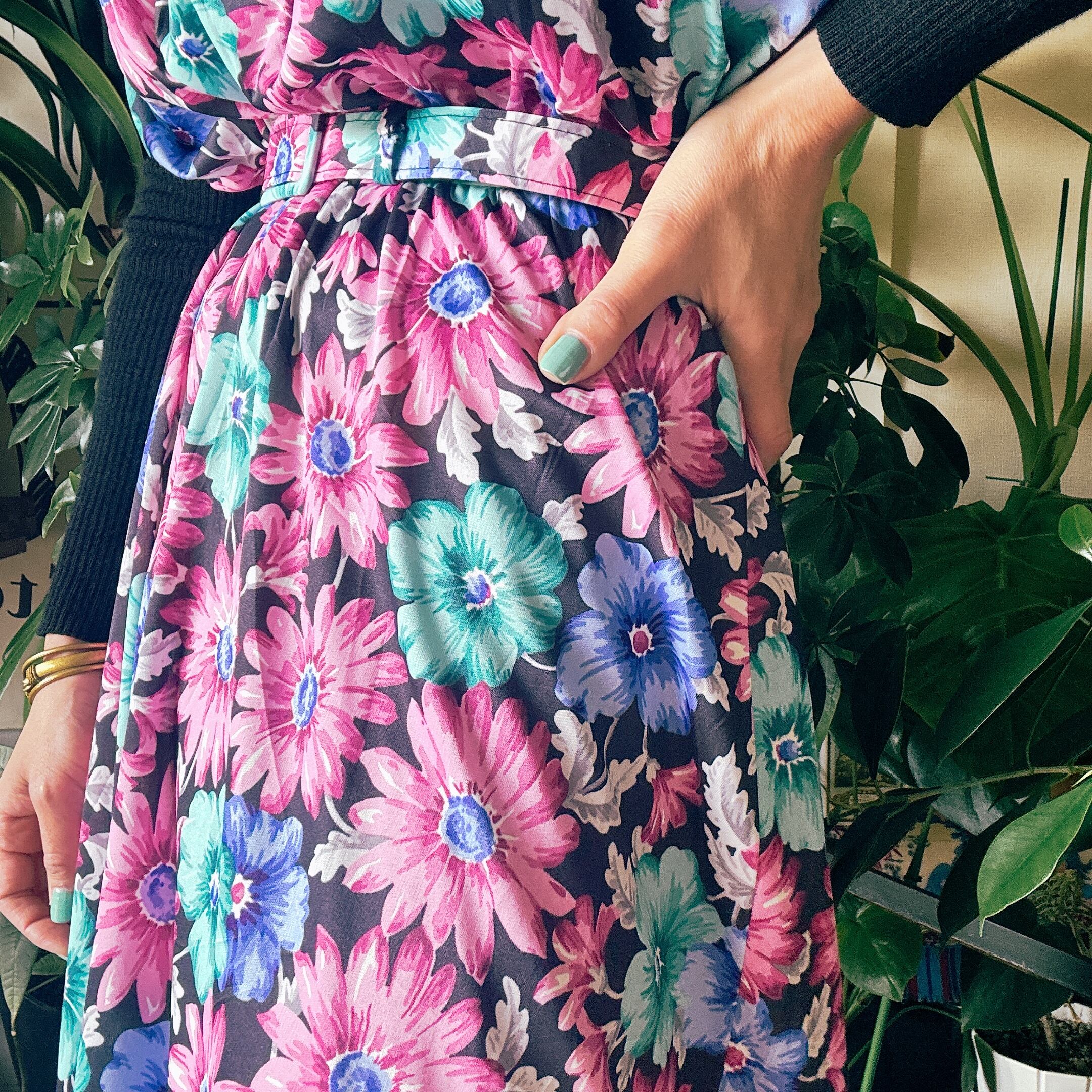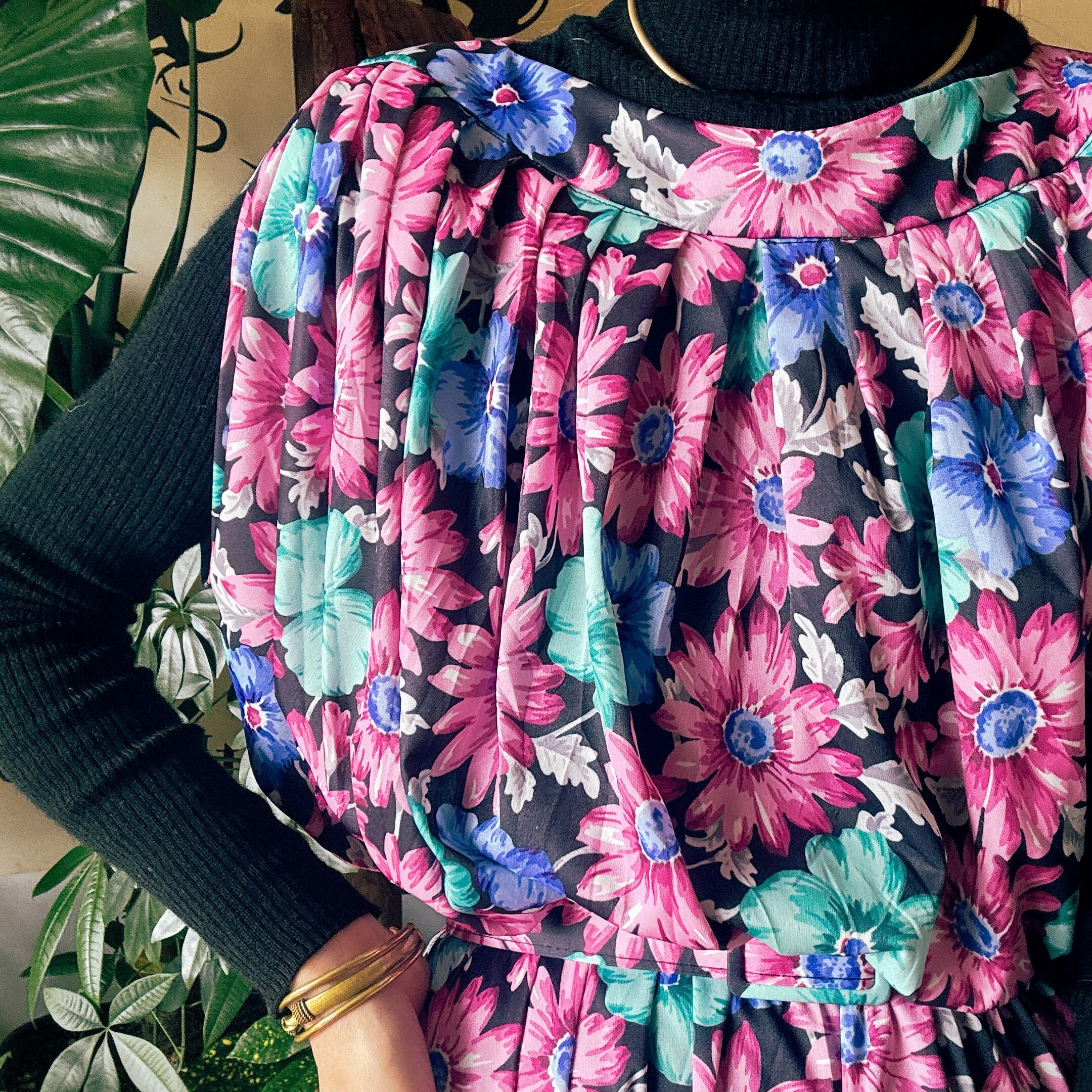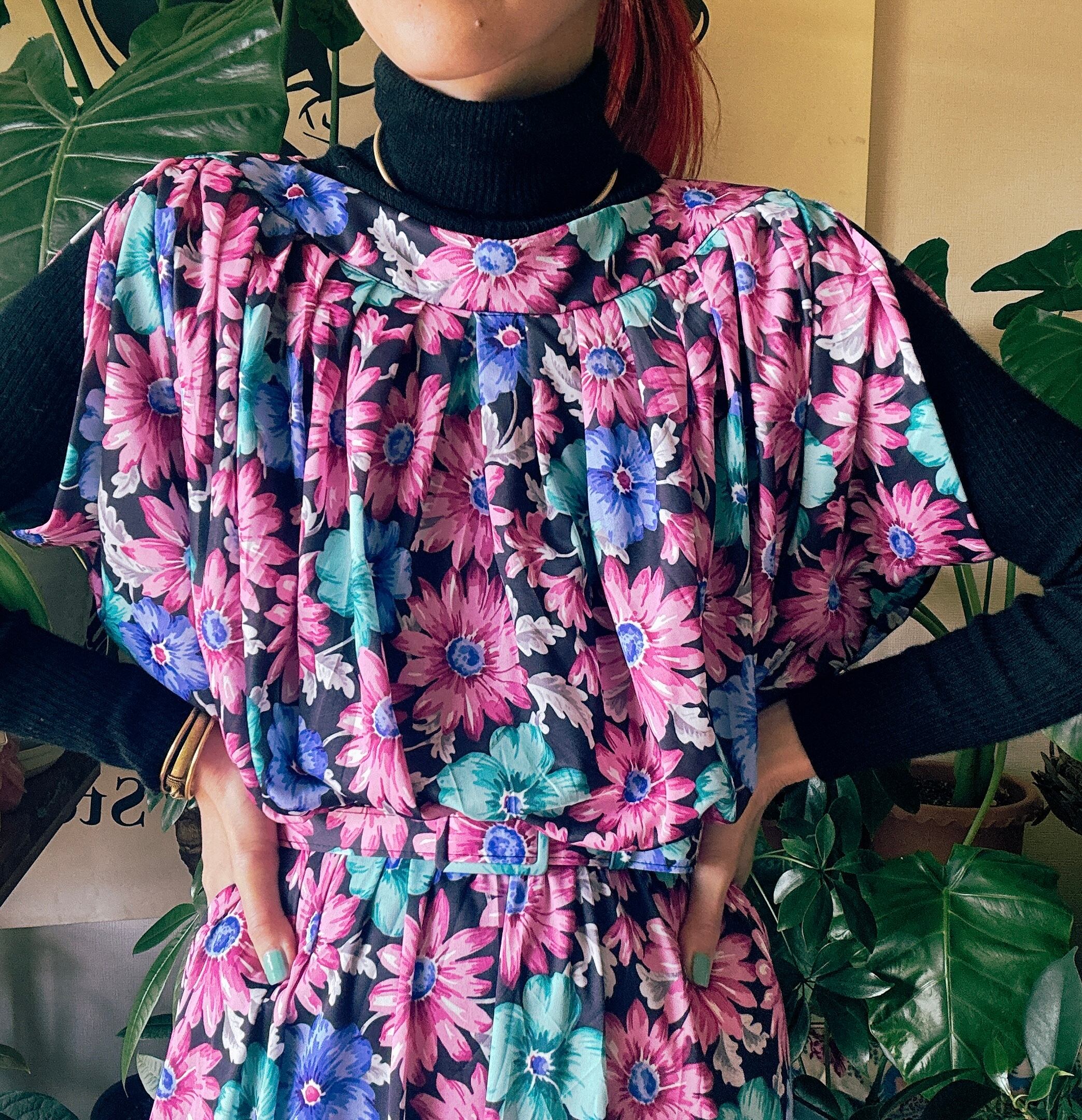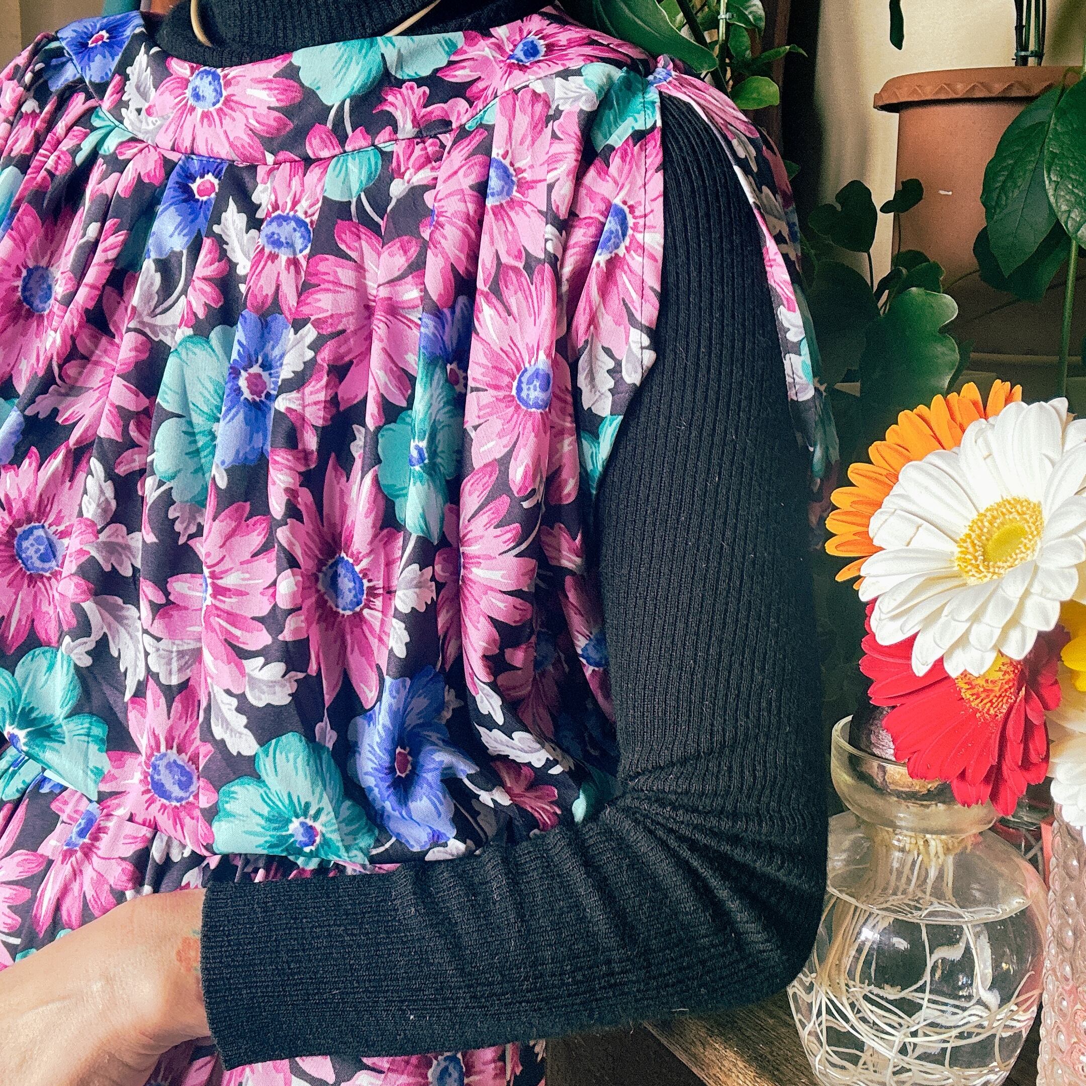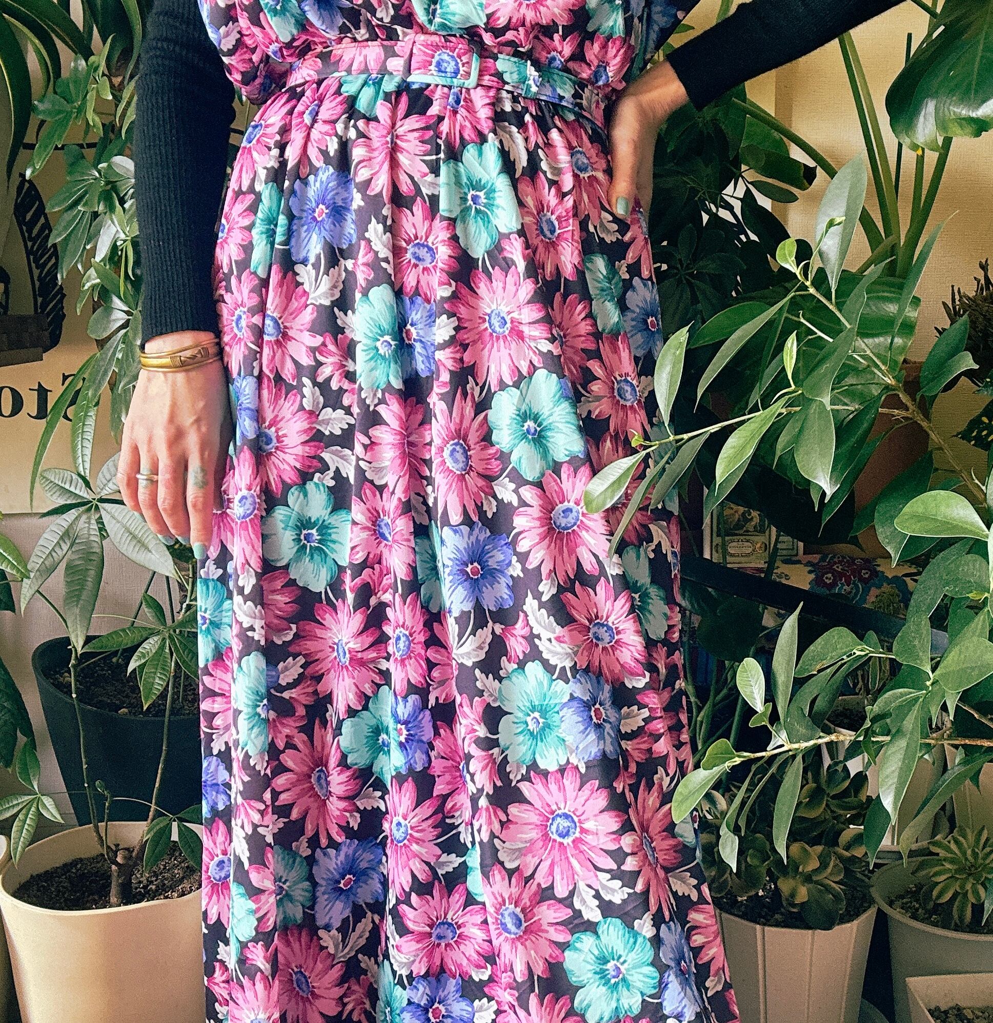 ブラックベースにピンク・ブルー・ミントグリーンの鮮やかな花柄が映える一着。
