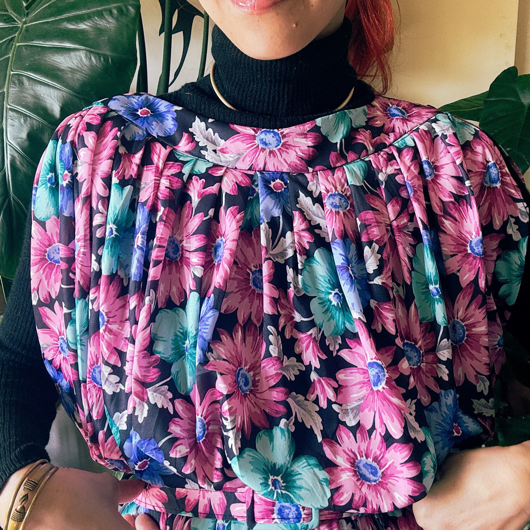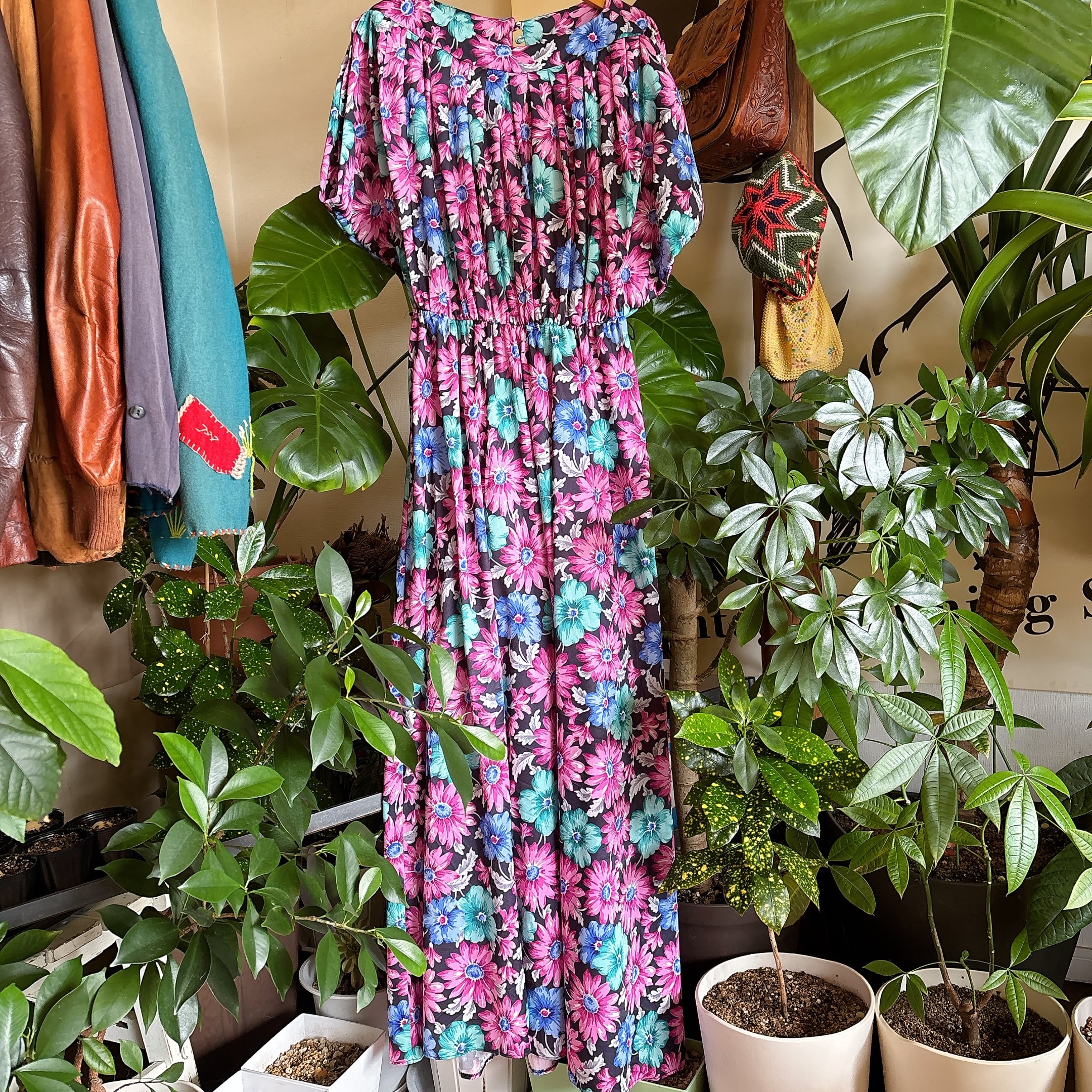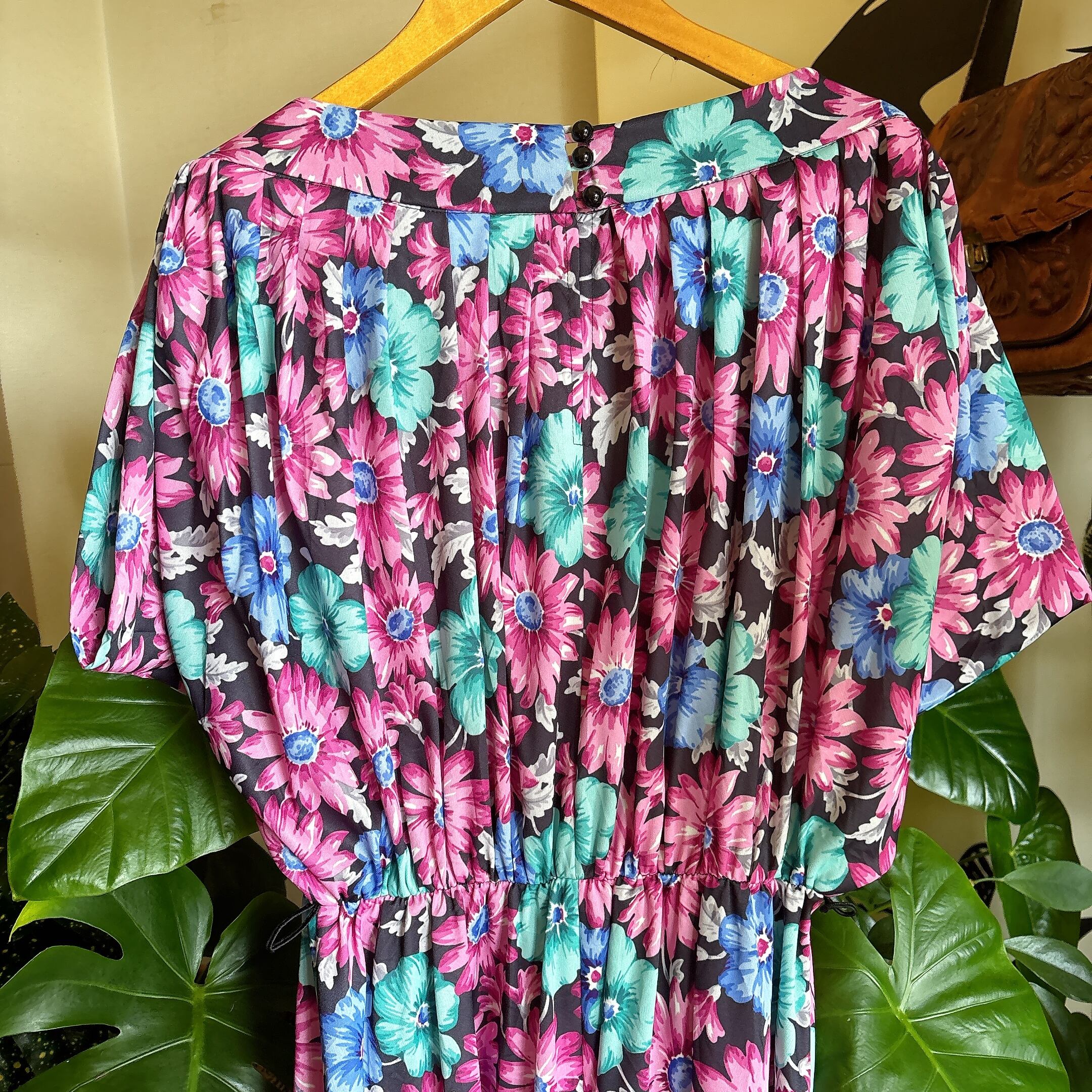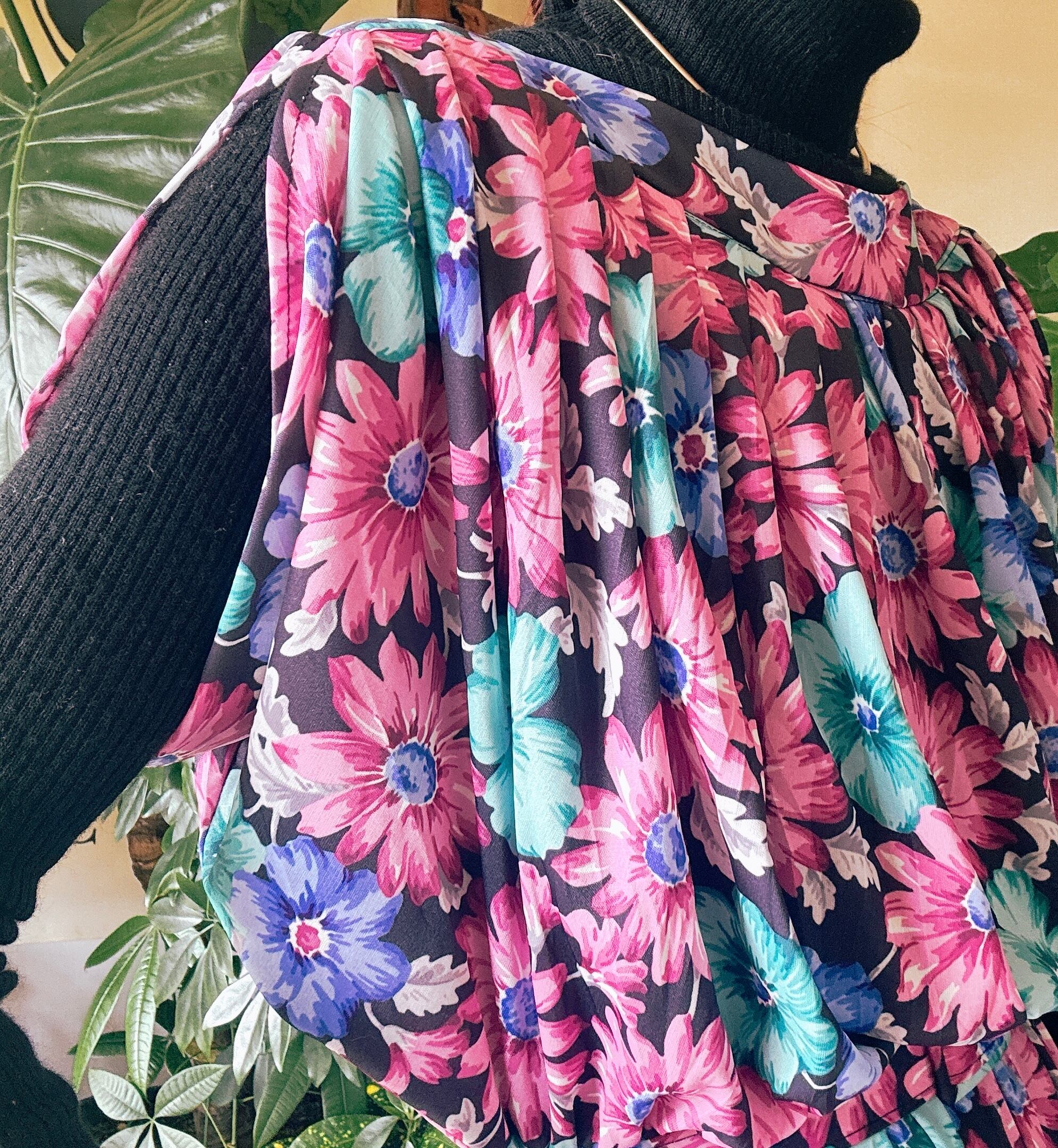 ブラックベースにピンク・ブルー・ミントグリーンの鮮やかな花柄が映える一着。