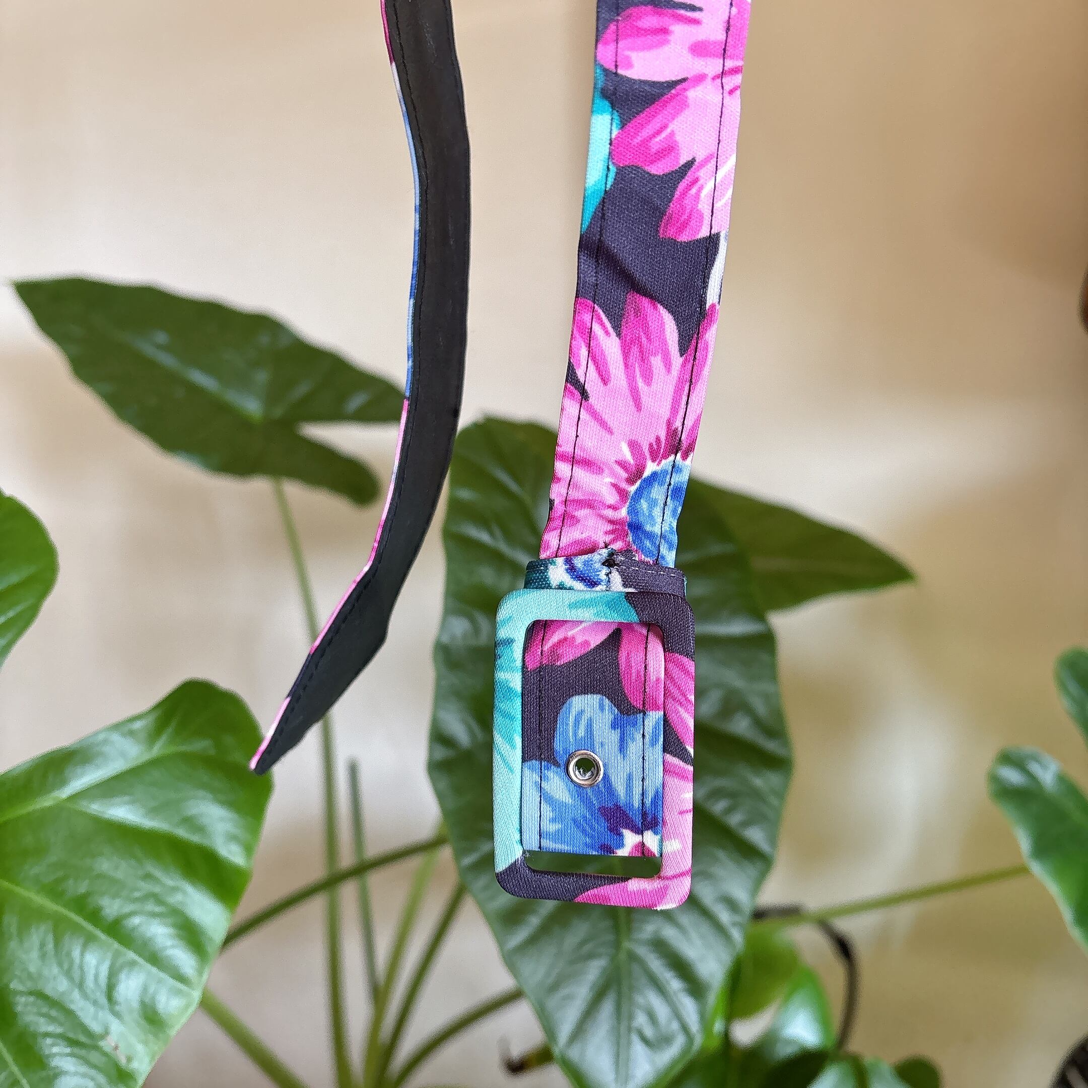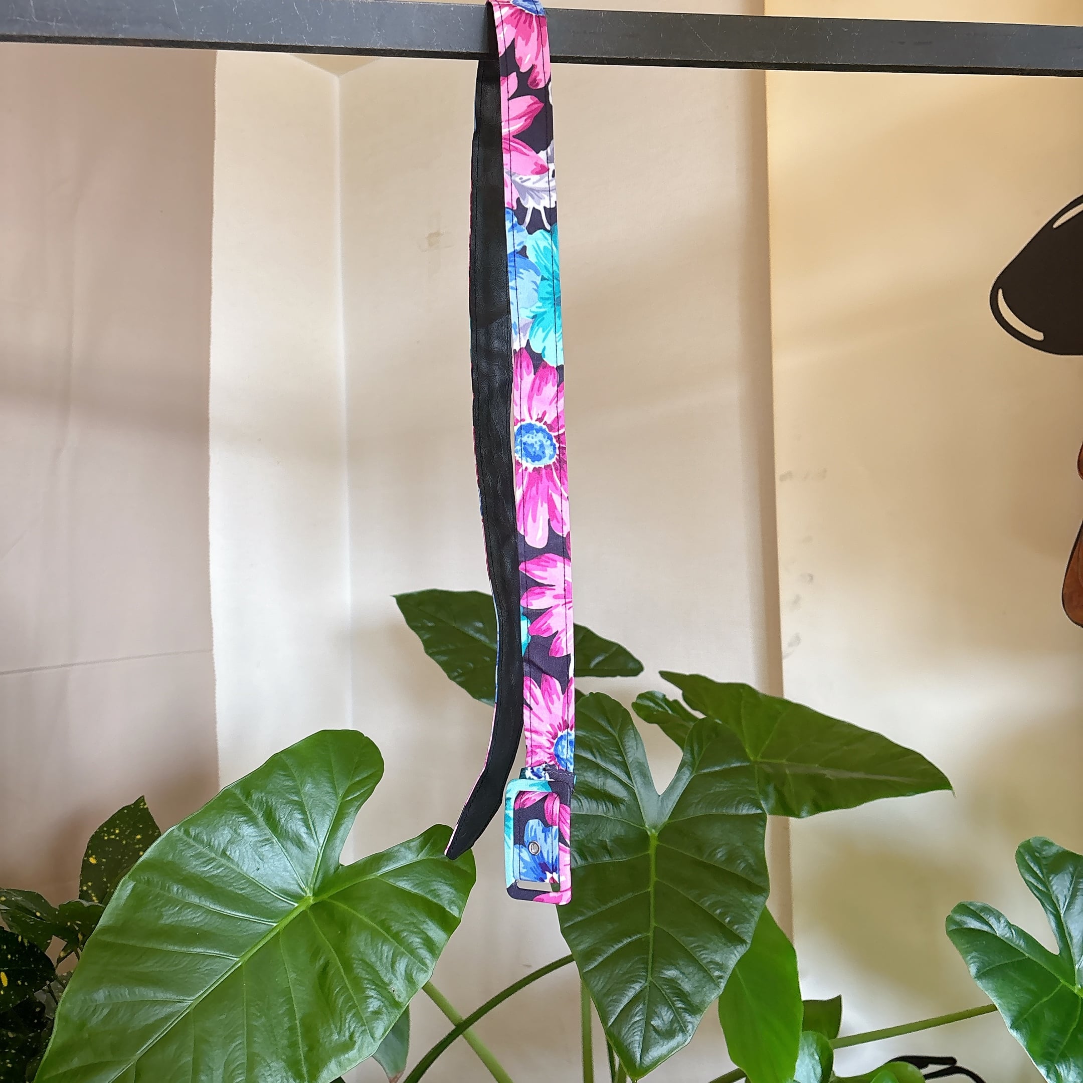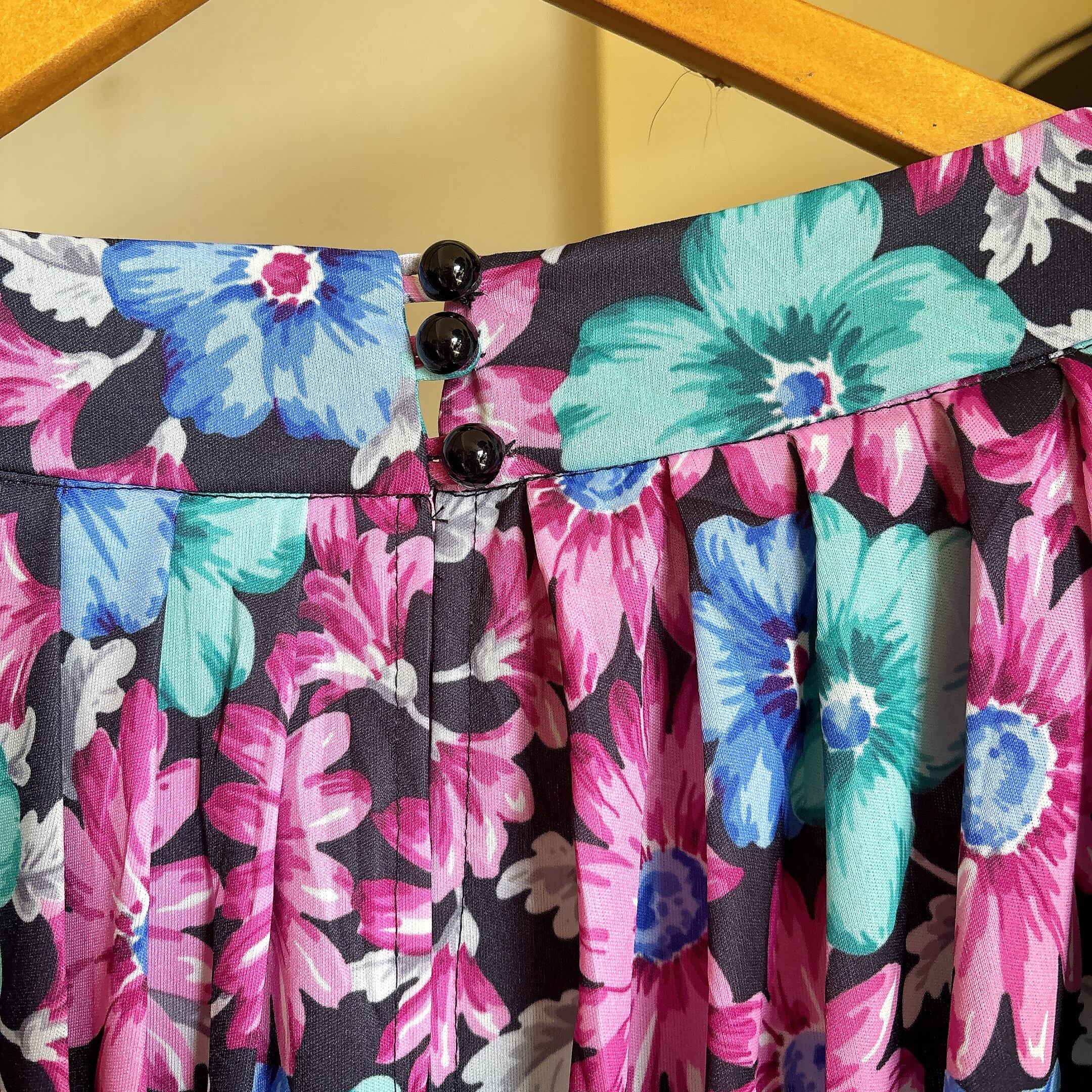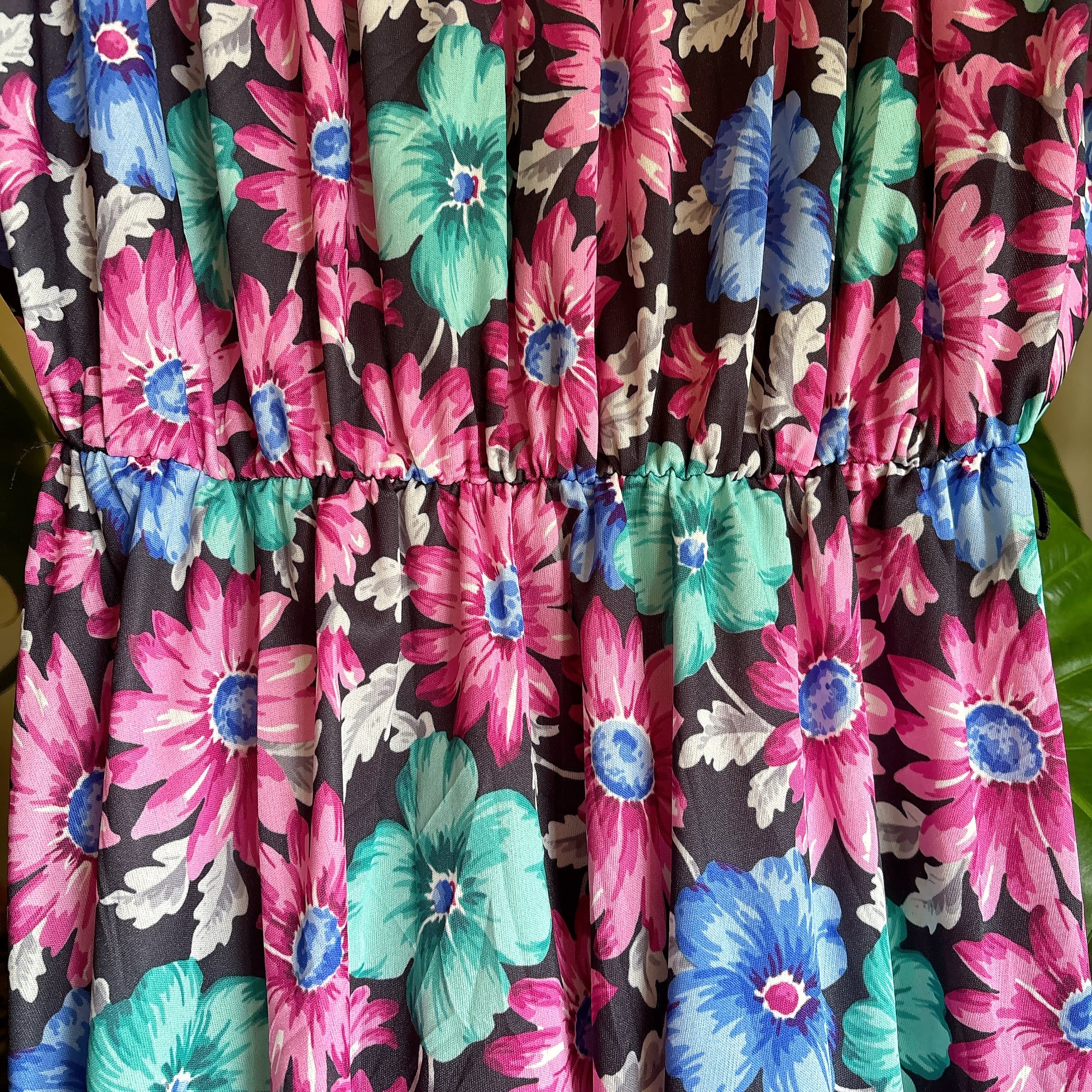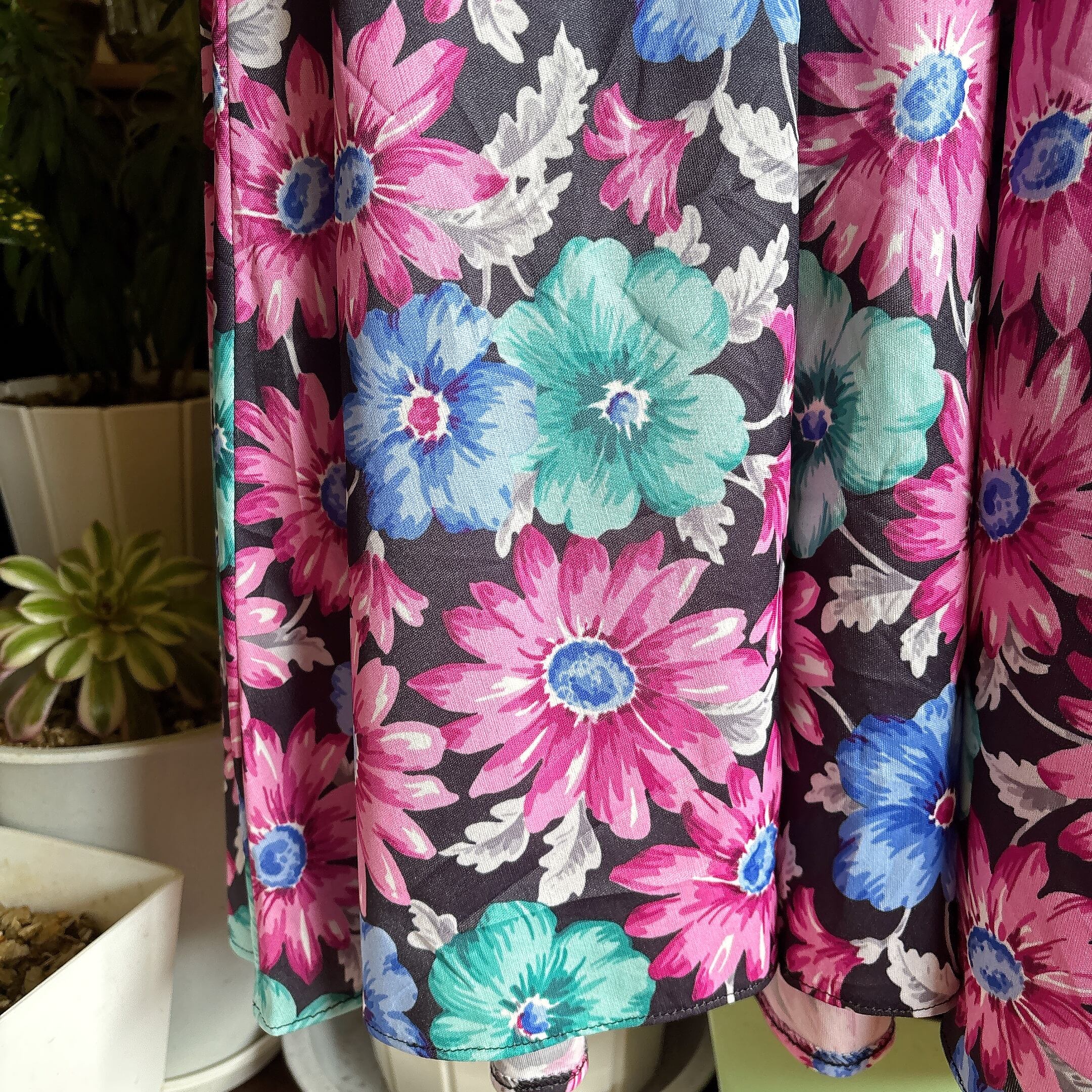 ブラックベースにピンク・ブルー・ミントグリーンの鮮やかな花柄が映える一着。
