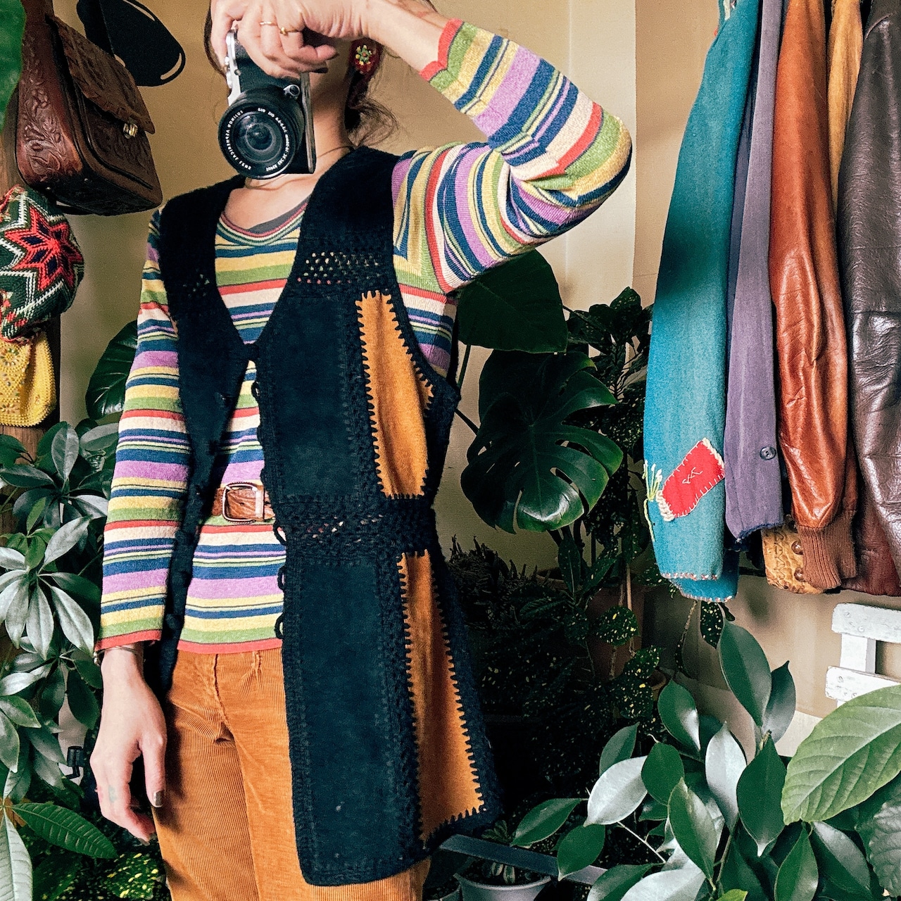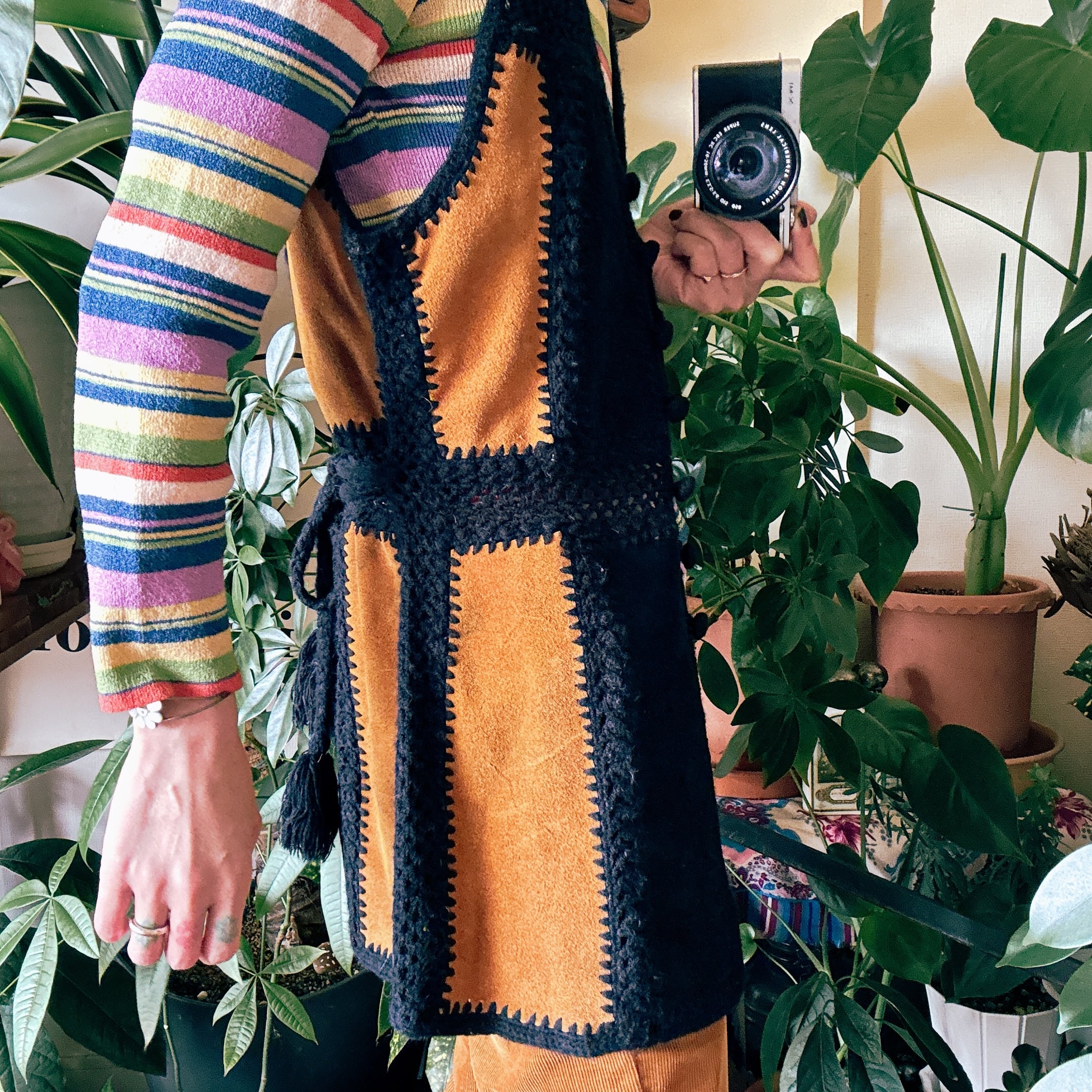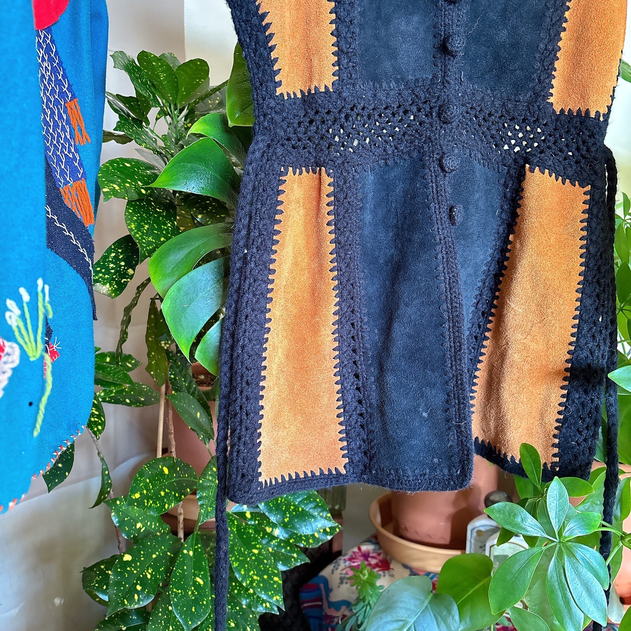 ◾️70s Shana Lee スエード レザー クロシェ切り替え パッチワーク ベスト