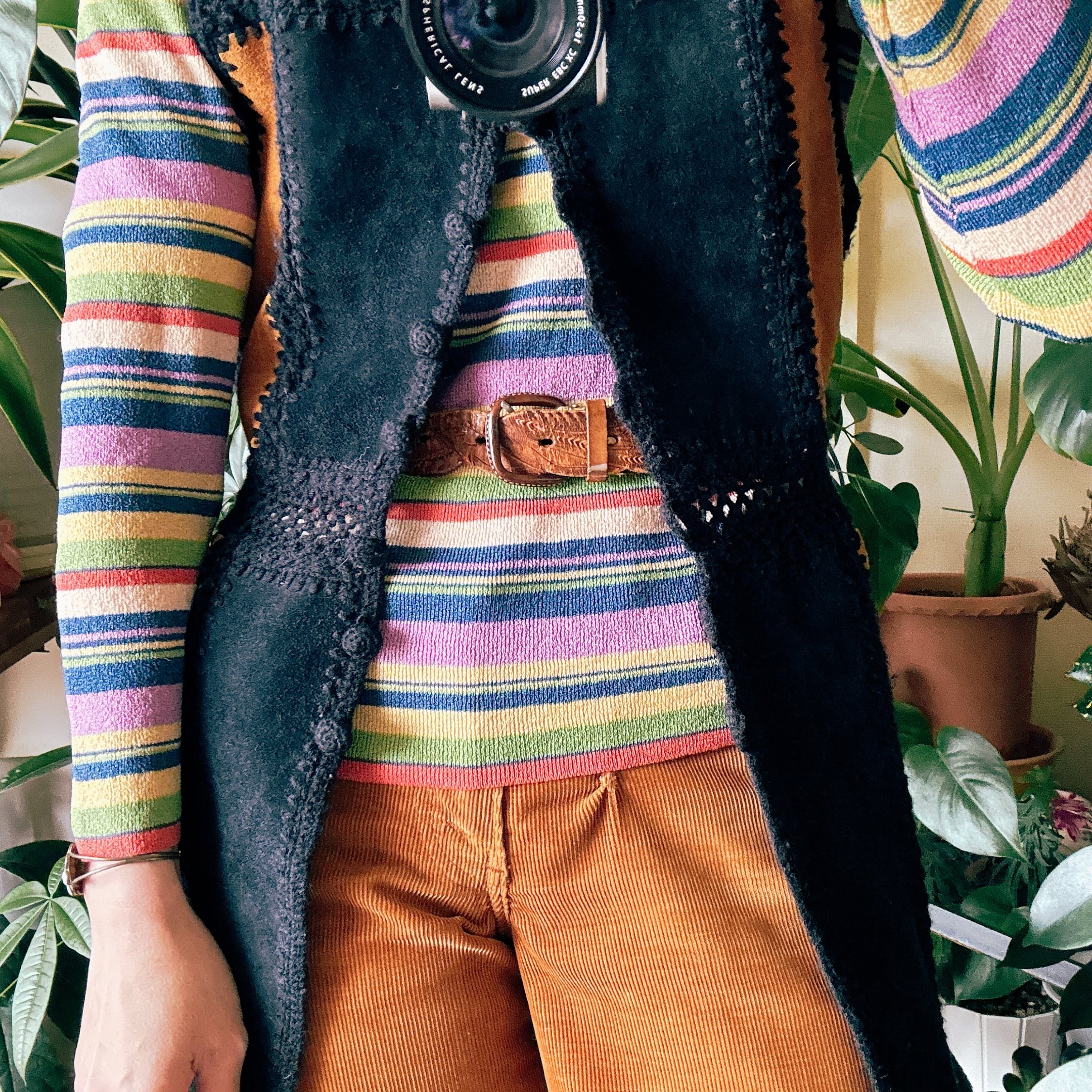 ワンピースやブラウスに重ねるだけで、一気に70sムードを演出できます。