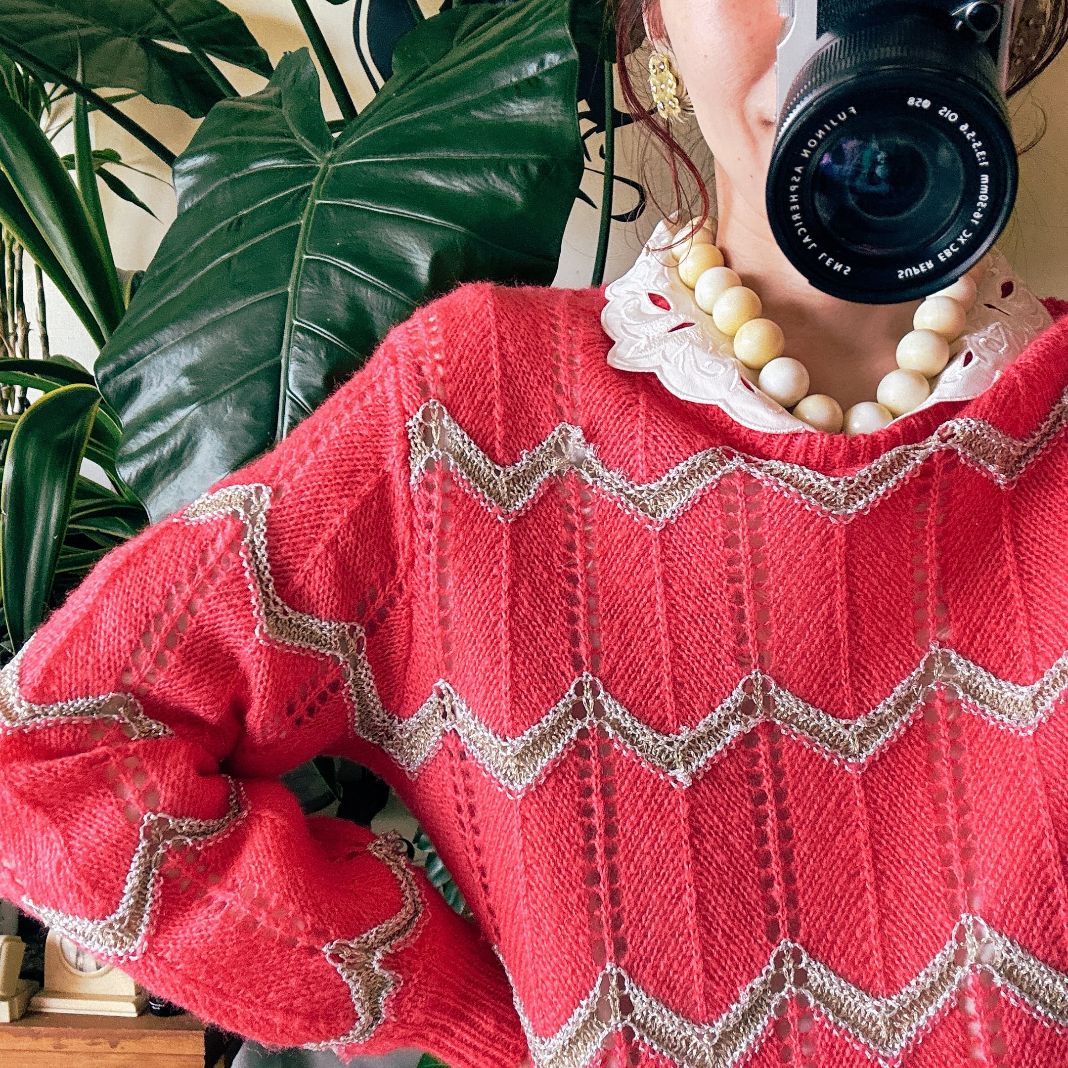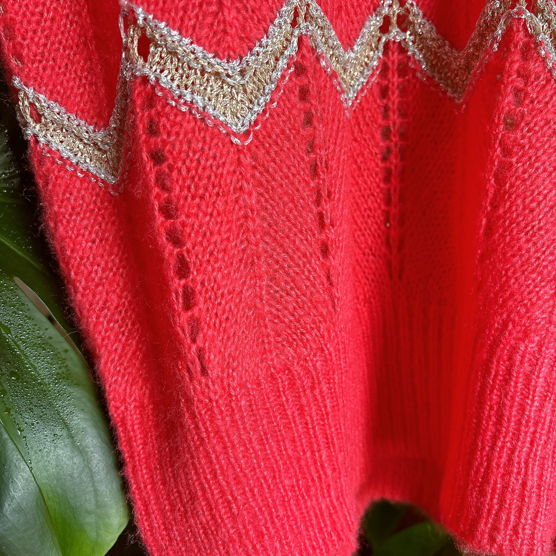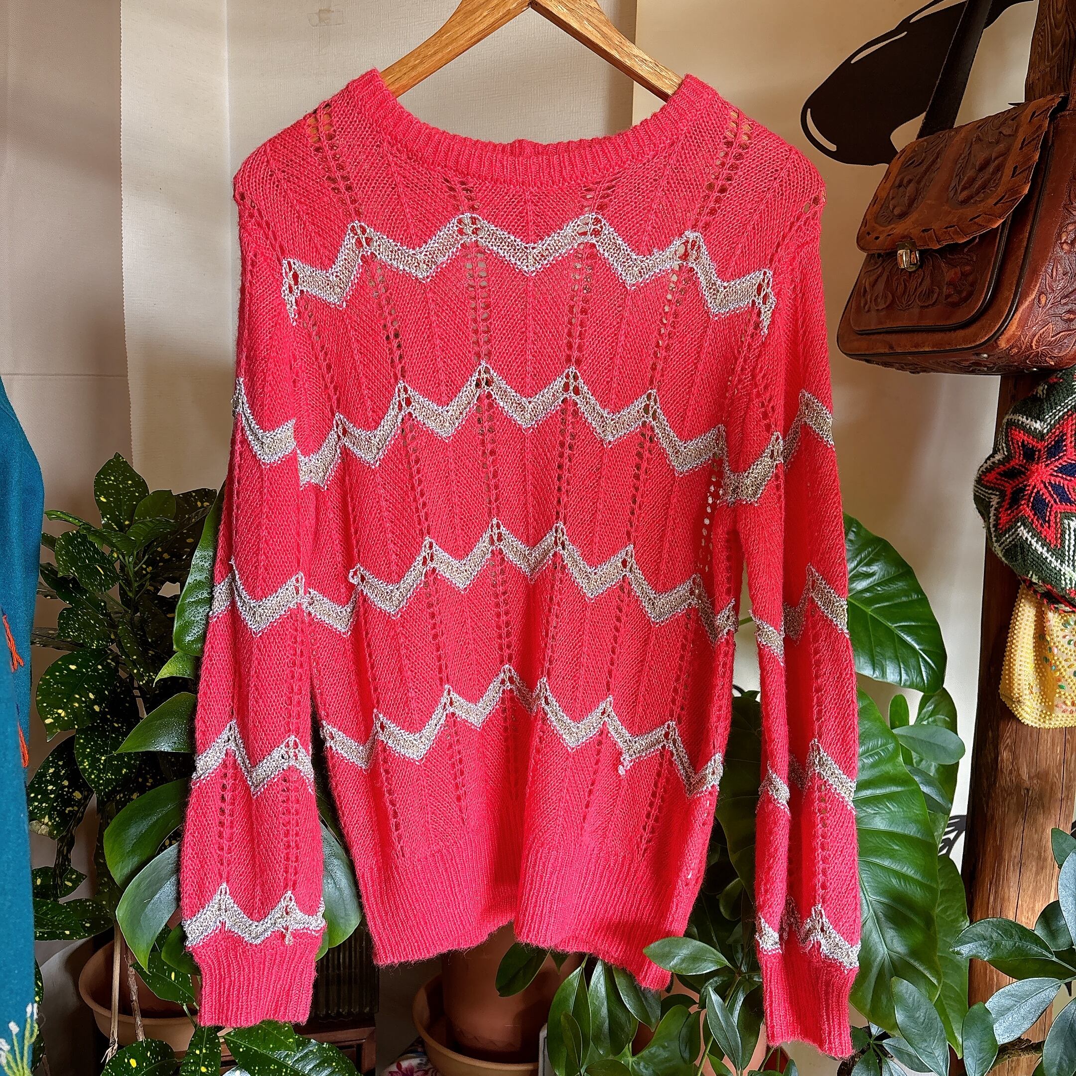 鮮やかなサーモンピンクカラーに、シルバーラメのジグザグラインが映えるデザインニットプルオーバー。