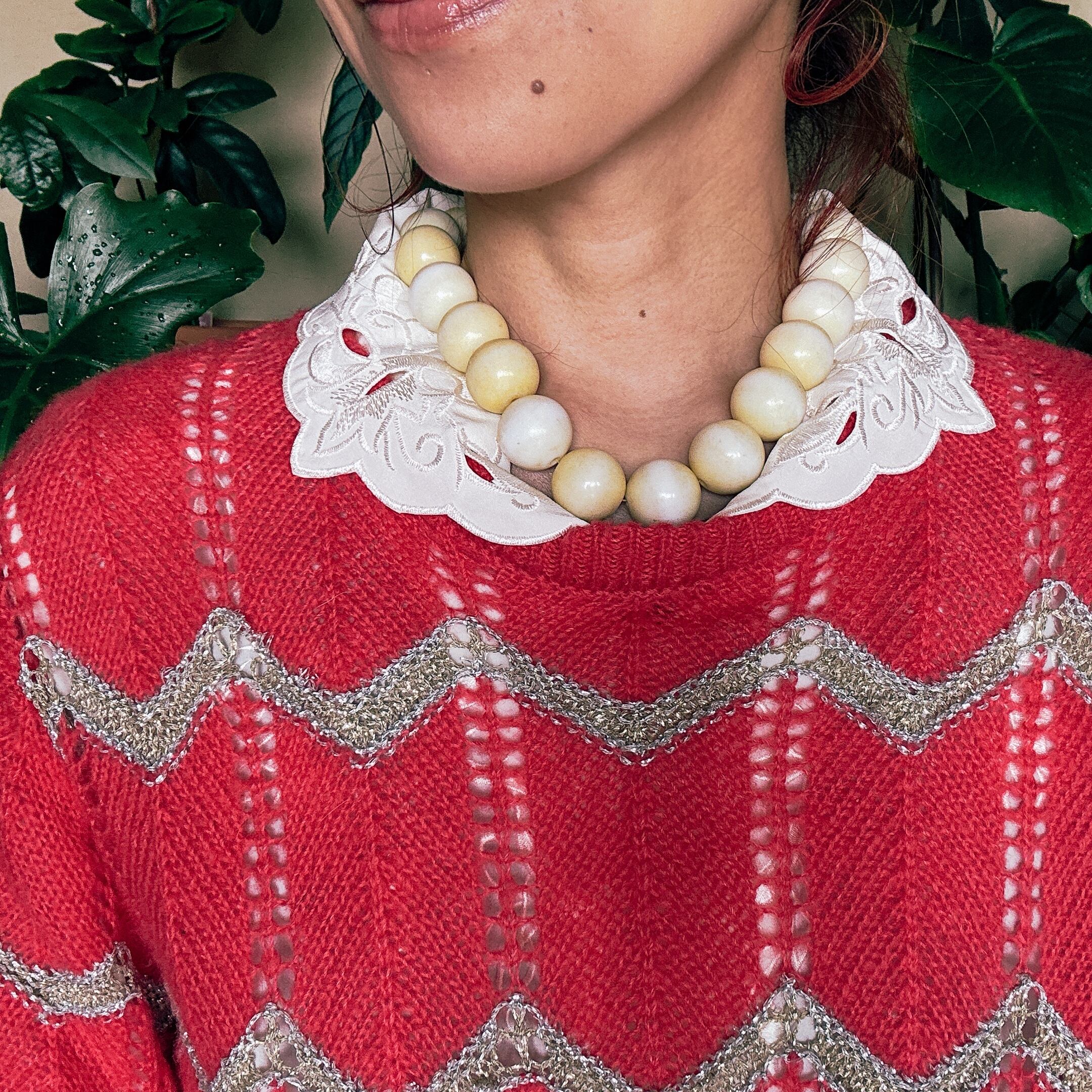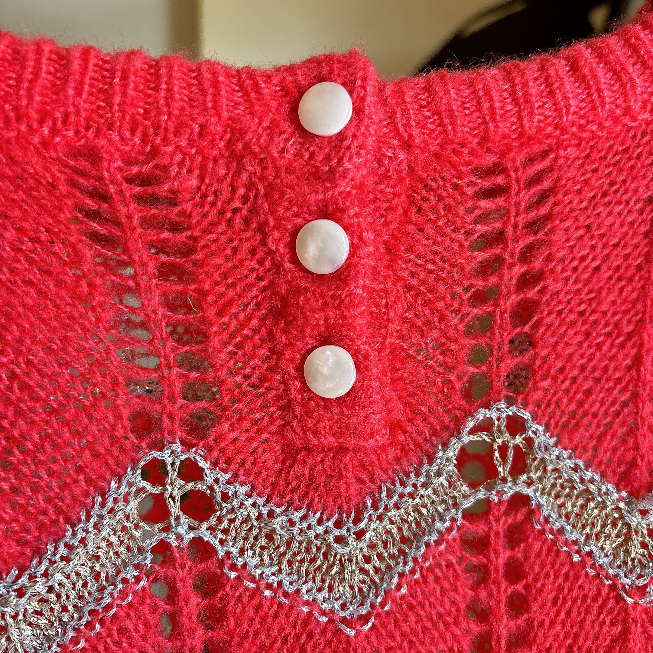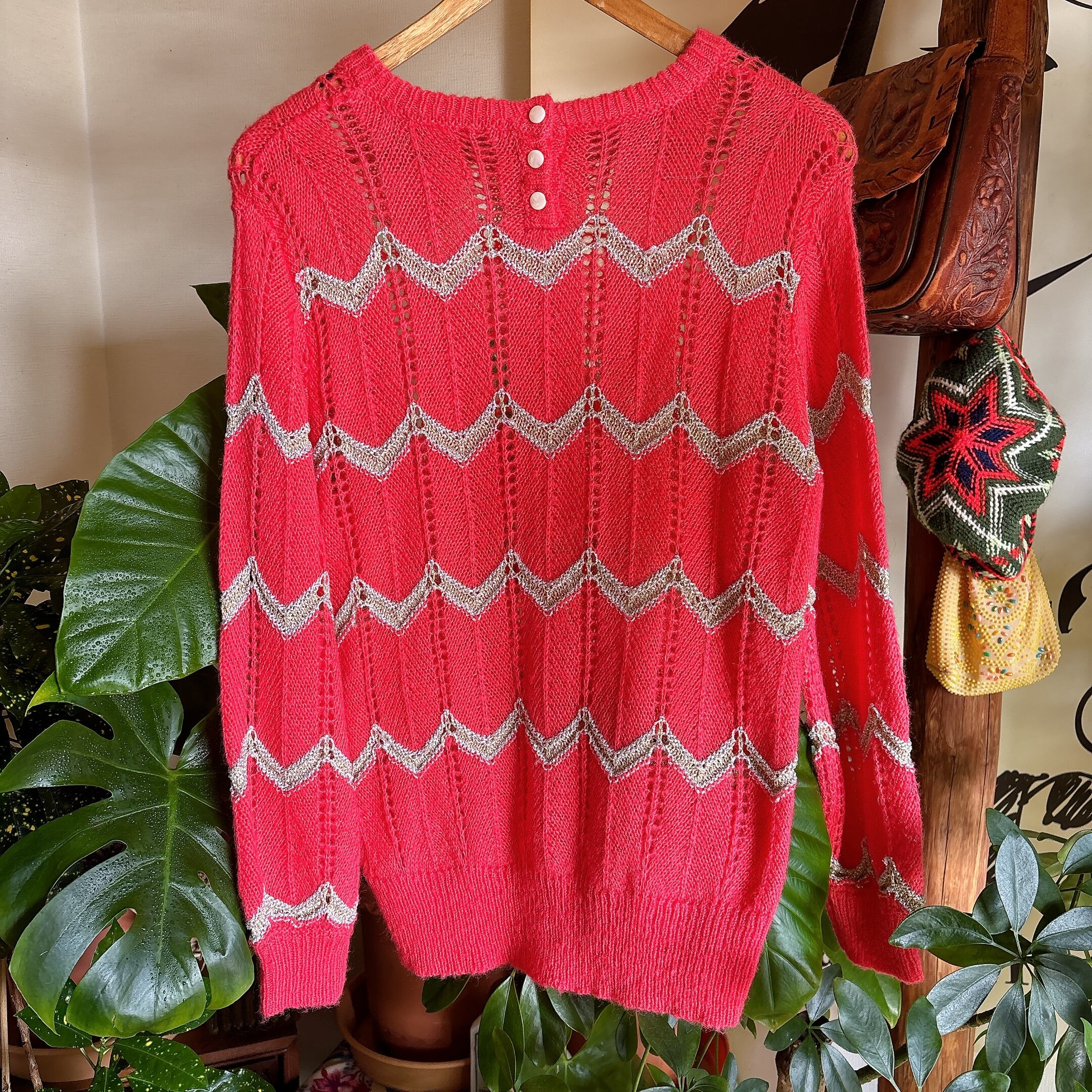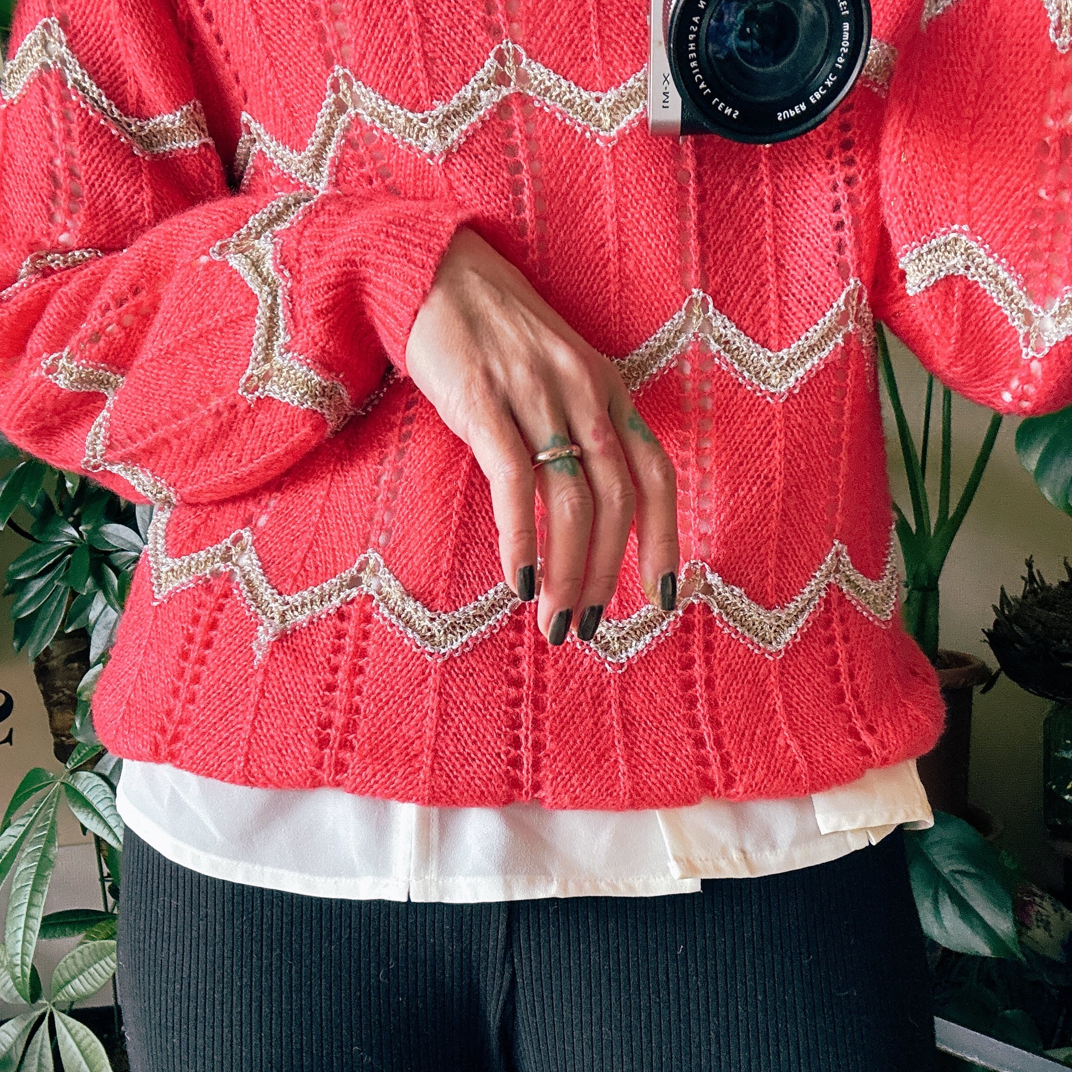 鮮やかなサーモンピンクカラーに、シルバーラメのジグザグラインが映えるデザインニットプルオーバー。