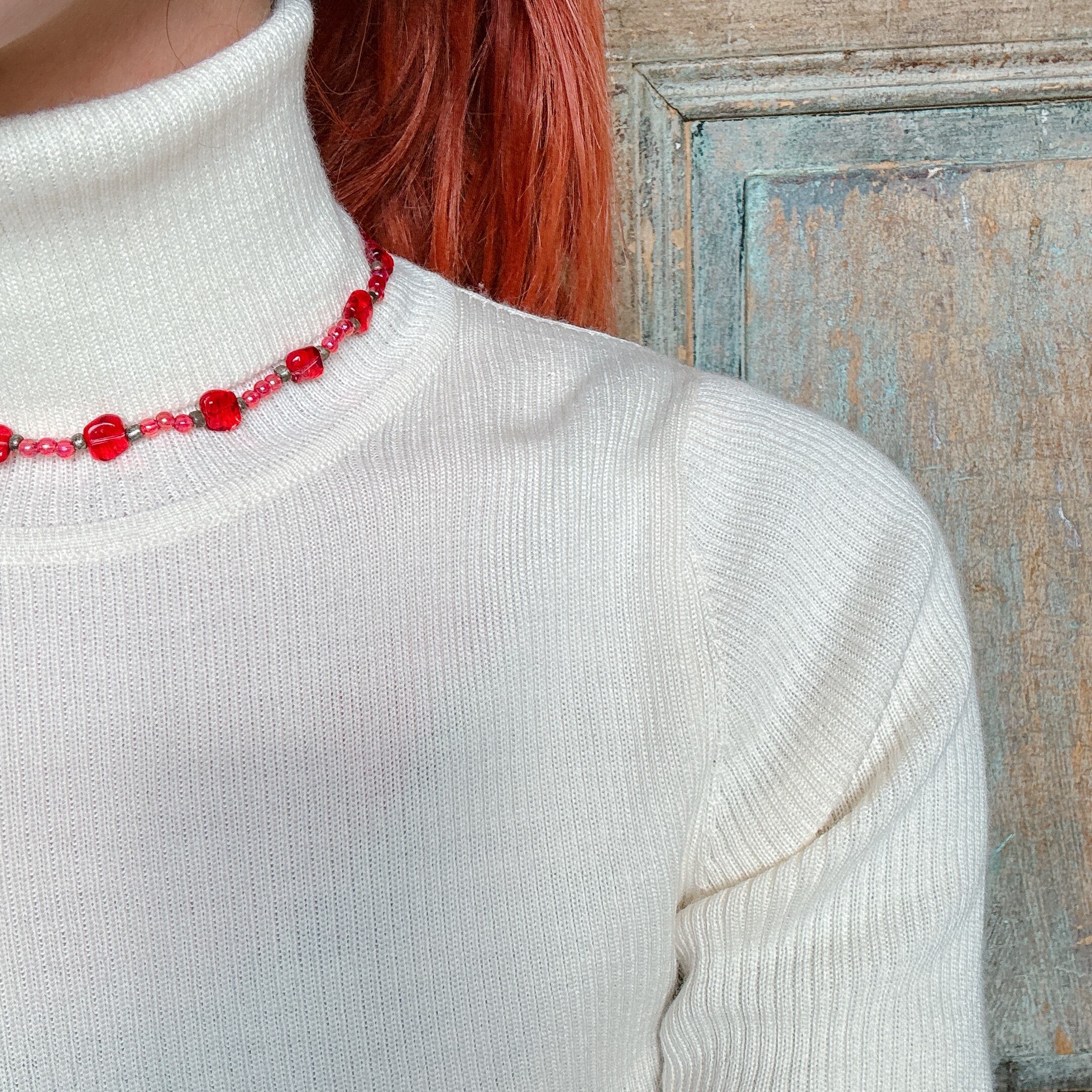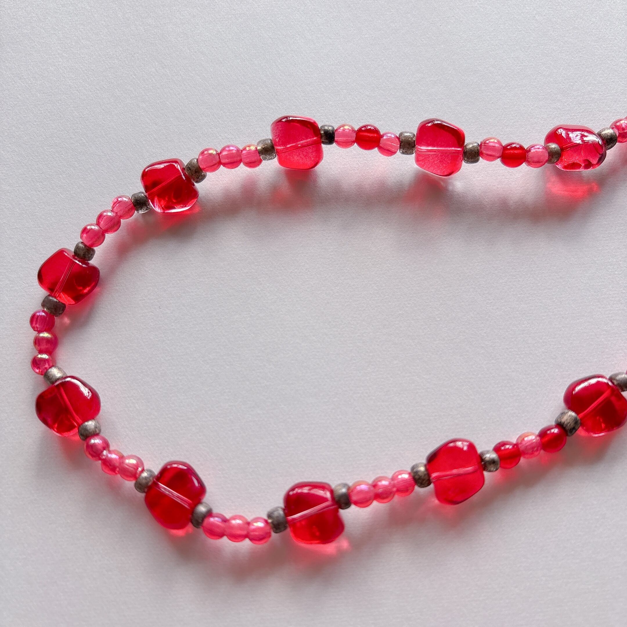 スクエア型の赤いガラスビーズがリズムよく配置され、間に小粒ビーズとメタルパーツを挟むことで、甘さの中にヴィンテージ感をプラスしています。