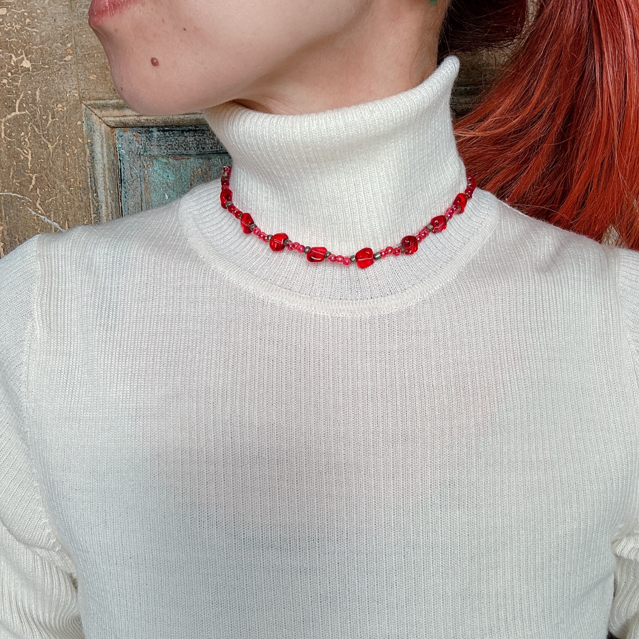 透明感のある深紅とピンクトーンのチェコガラスビーズを贅沢に使用した、華やかなネックレス。