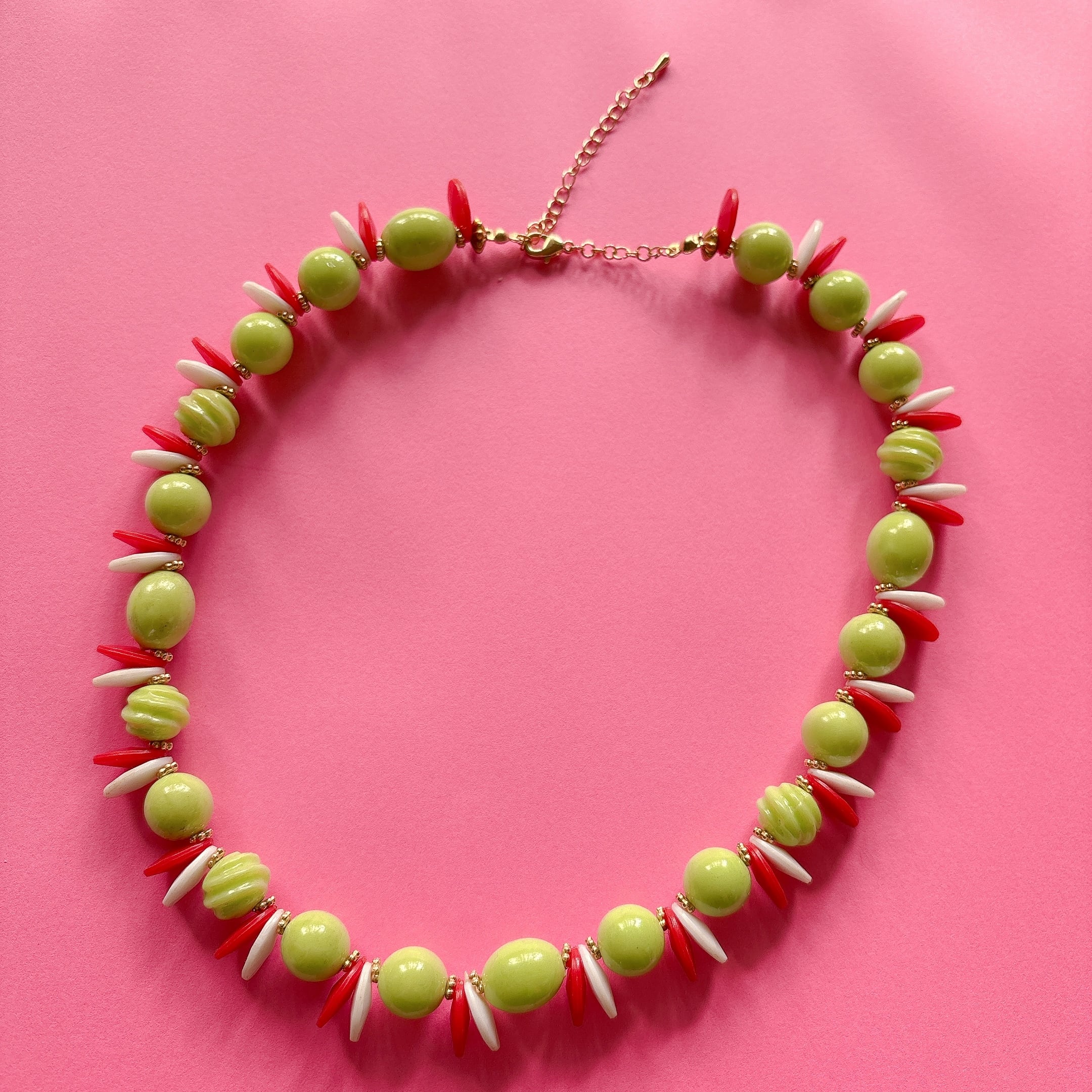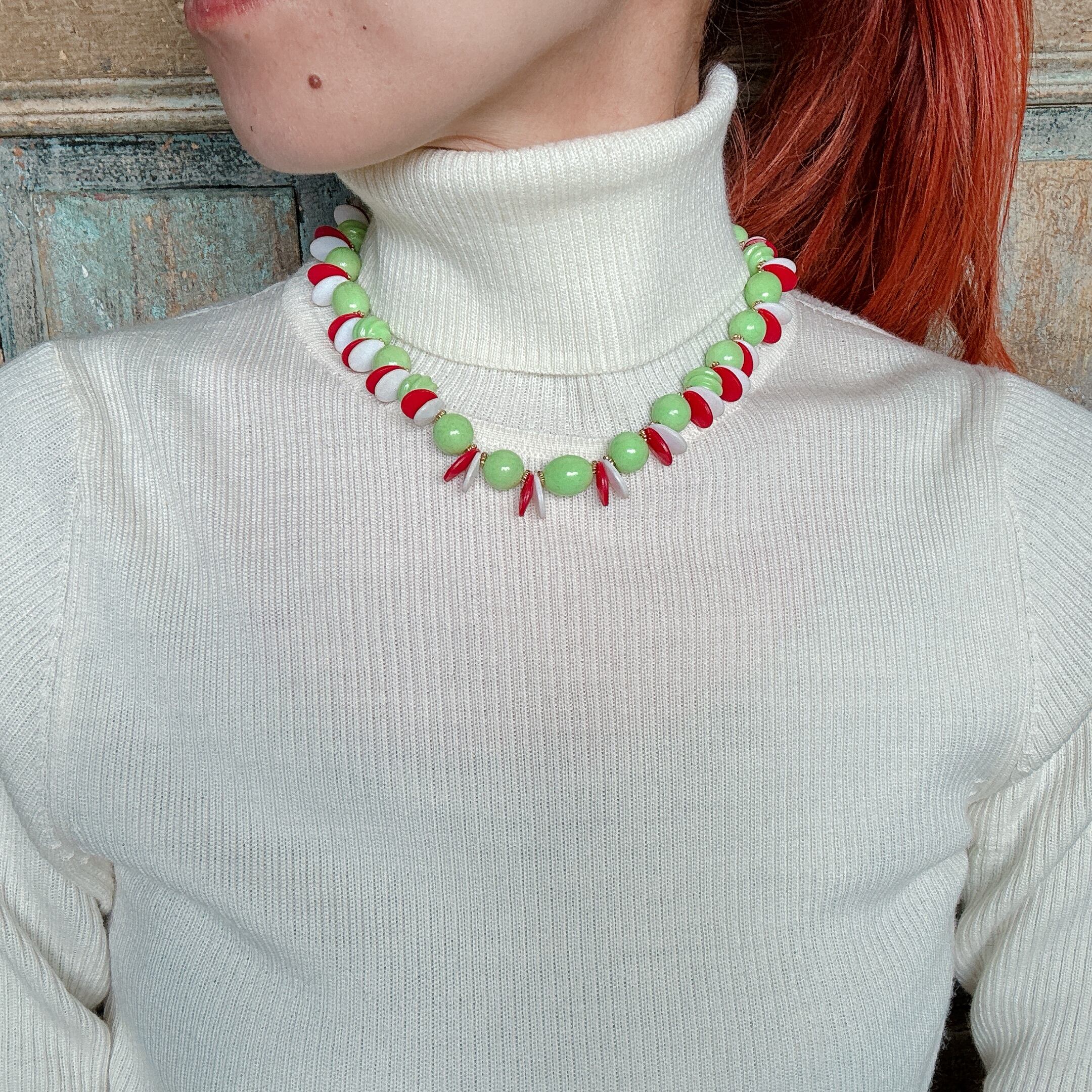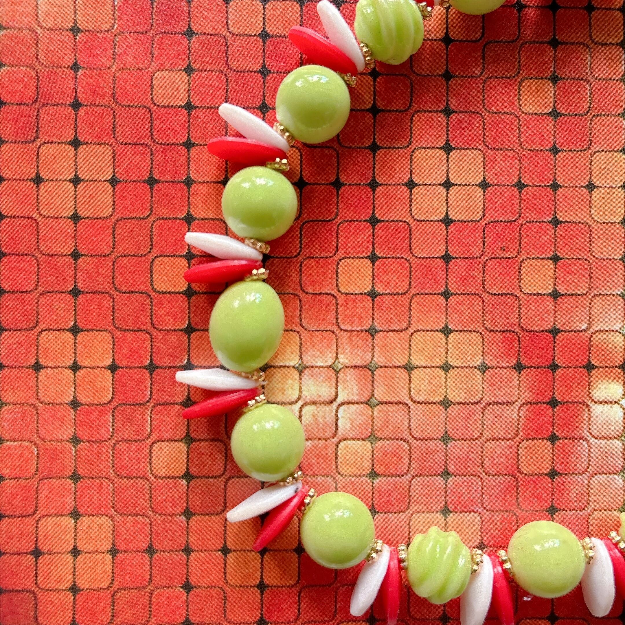 素材:赤、白、緑全て60-70s頃のビンテージビーズを使用。詳細は不明ですが赤白はビンテージプラスチックの様な軽い素材です。緑はガラスやルーサイトの様な質感も感じられますがこちらもルーサイト、セルロイド系、アクリルかと思います。