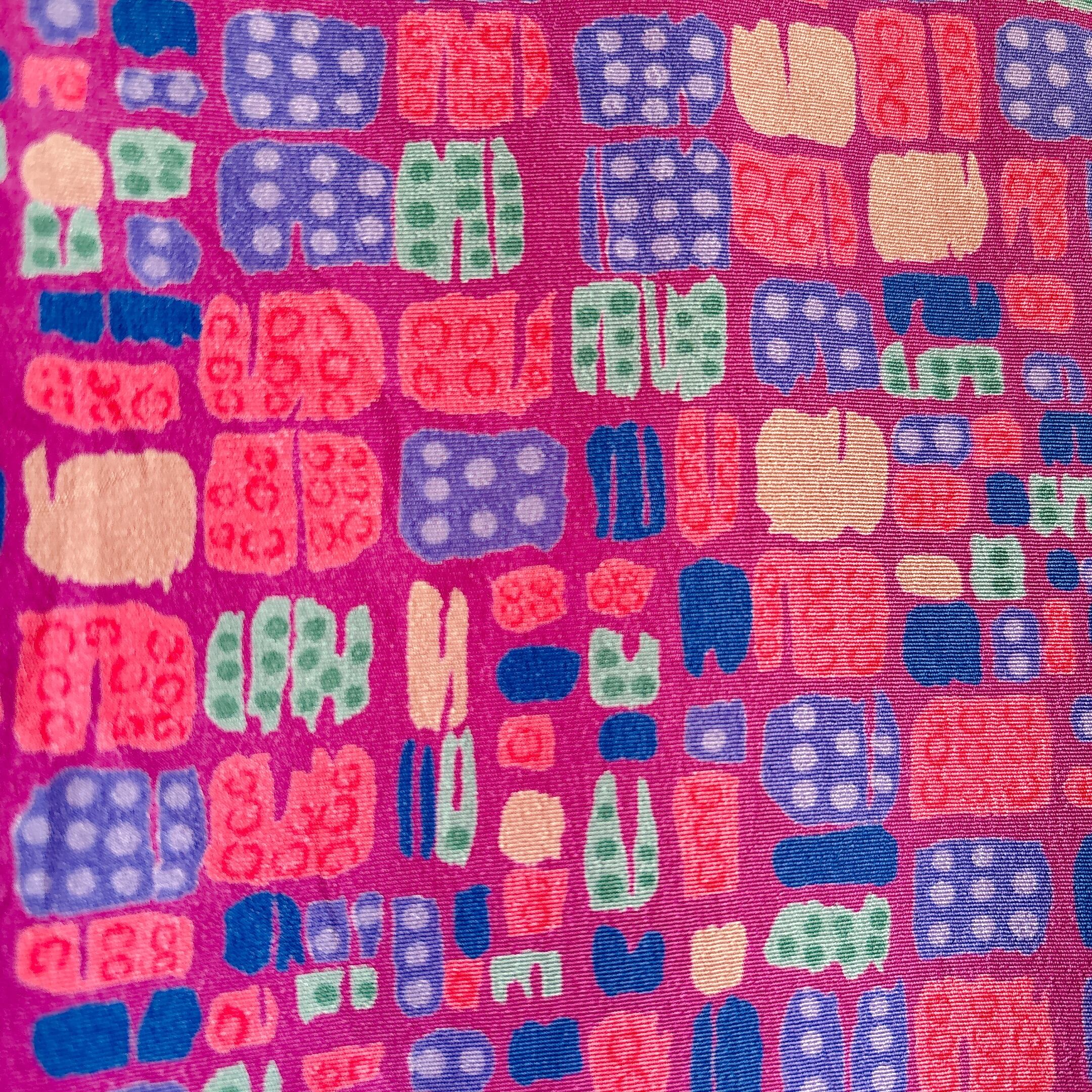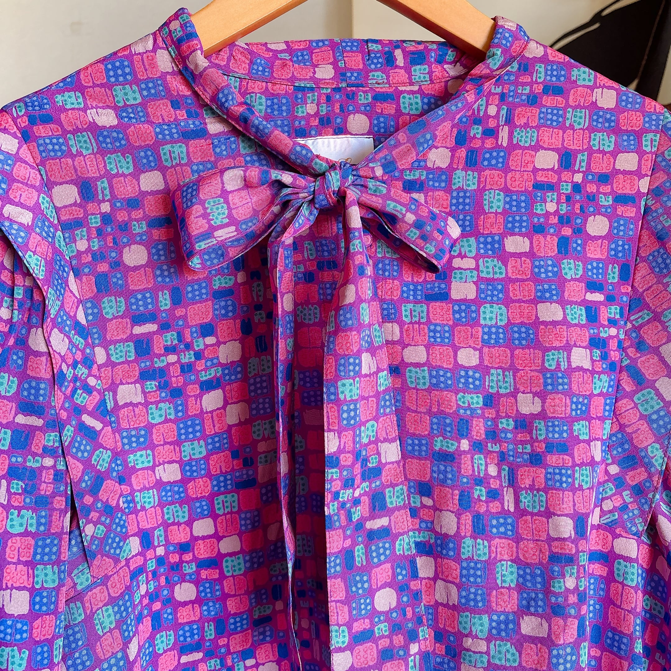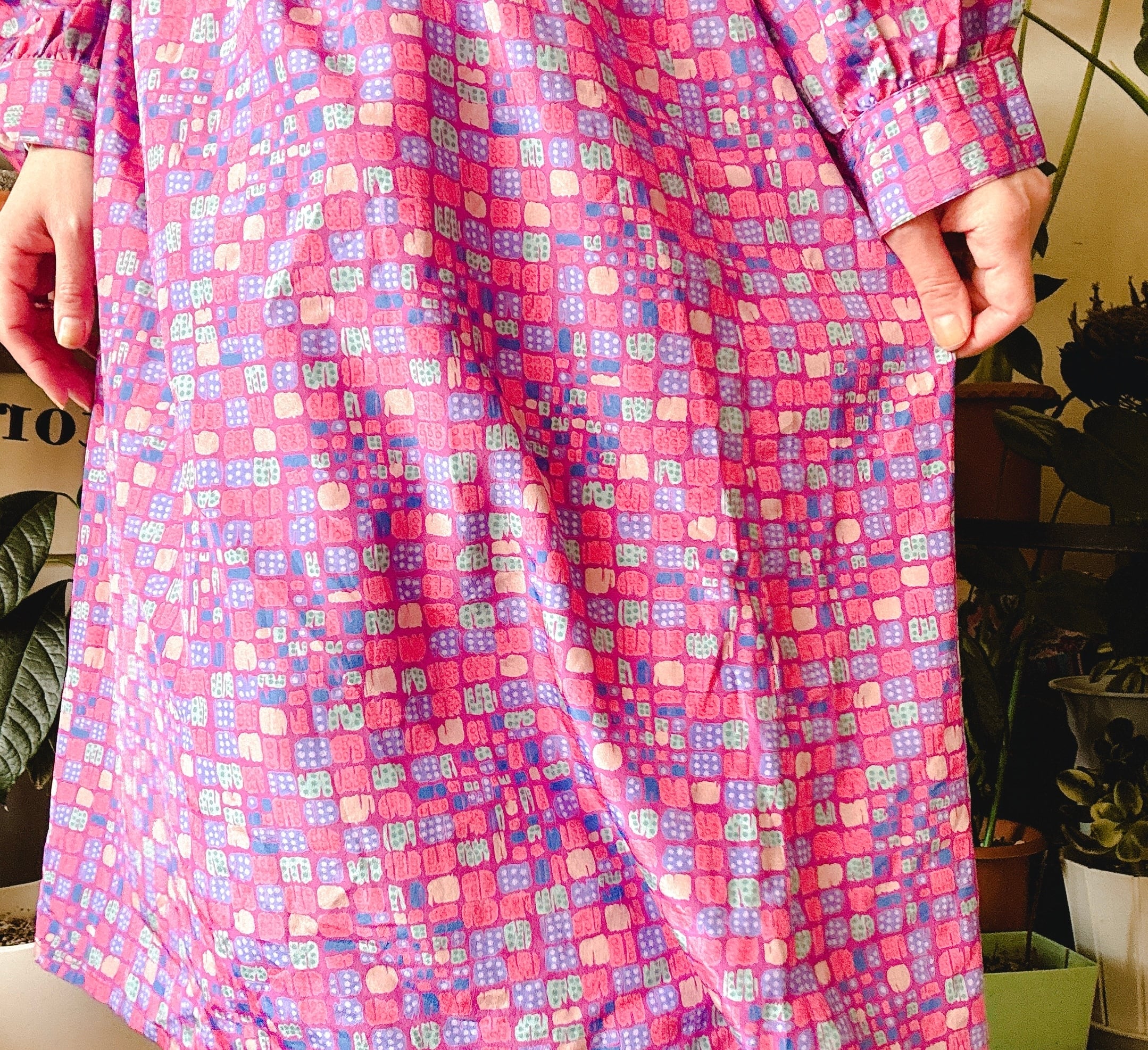 ピンクをベースにした小さなモザイク調プリントが印象的で、甘さの中にどこかアートな雰囲気も感じさせる一枚です。