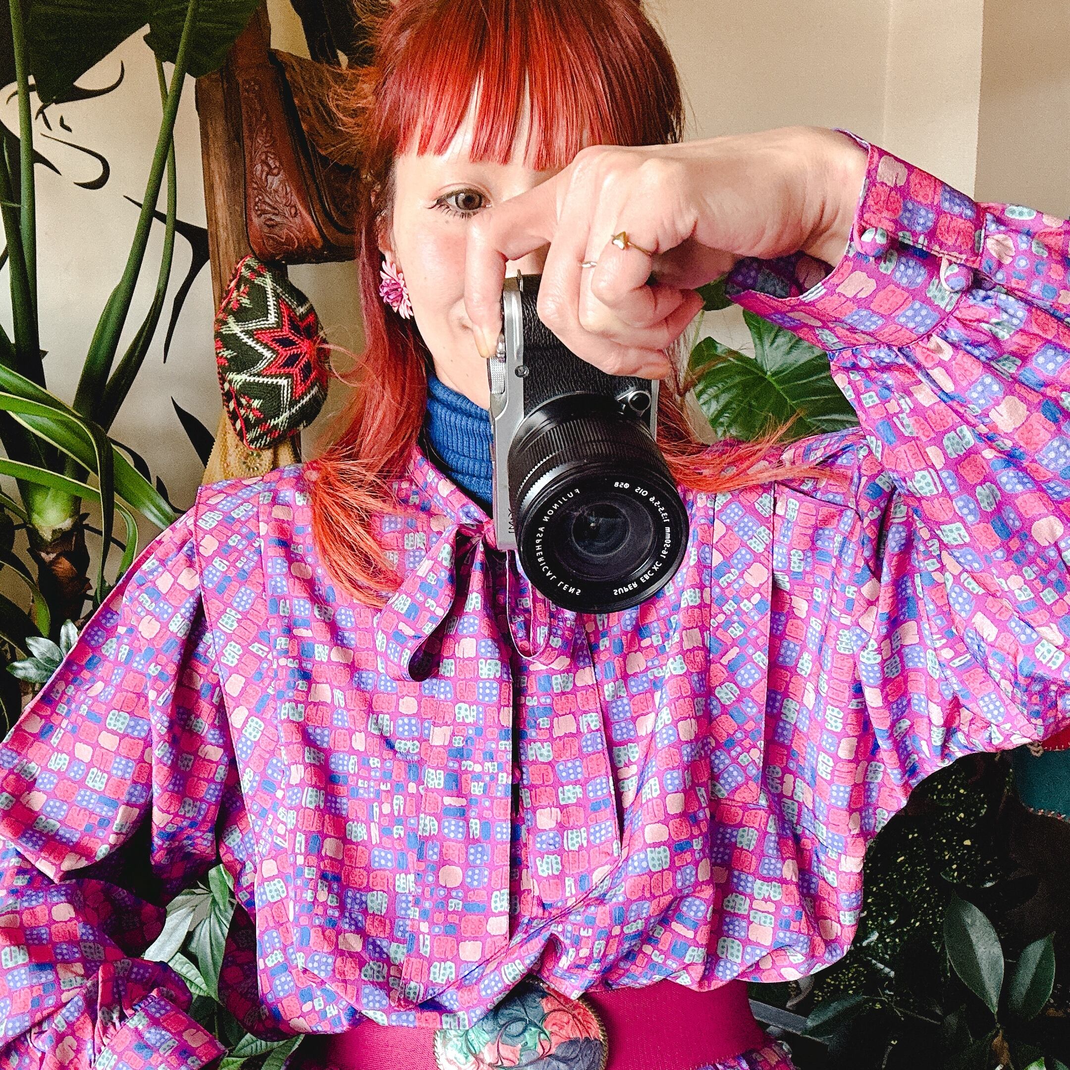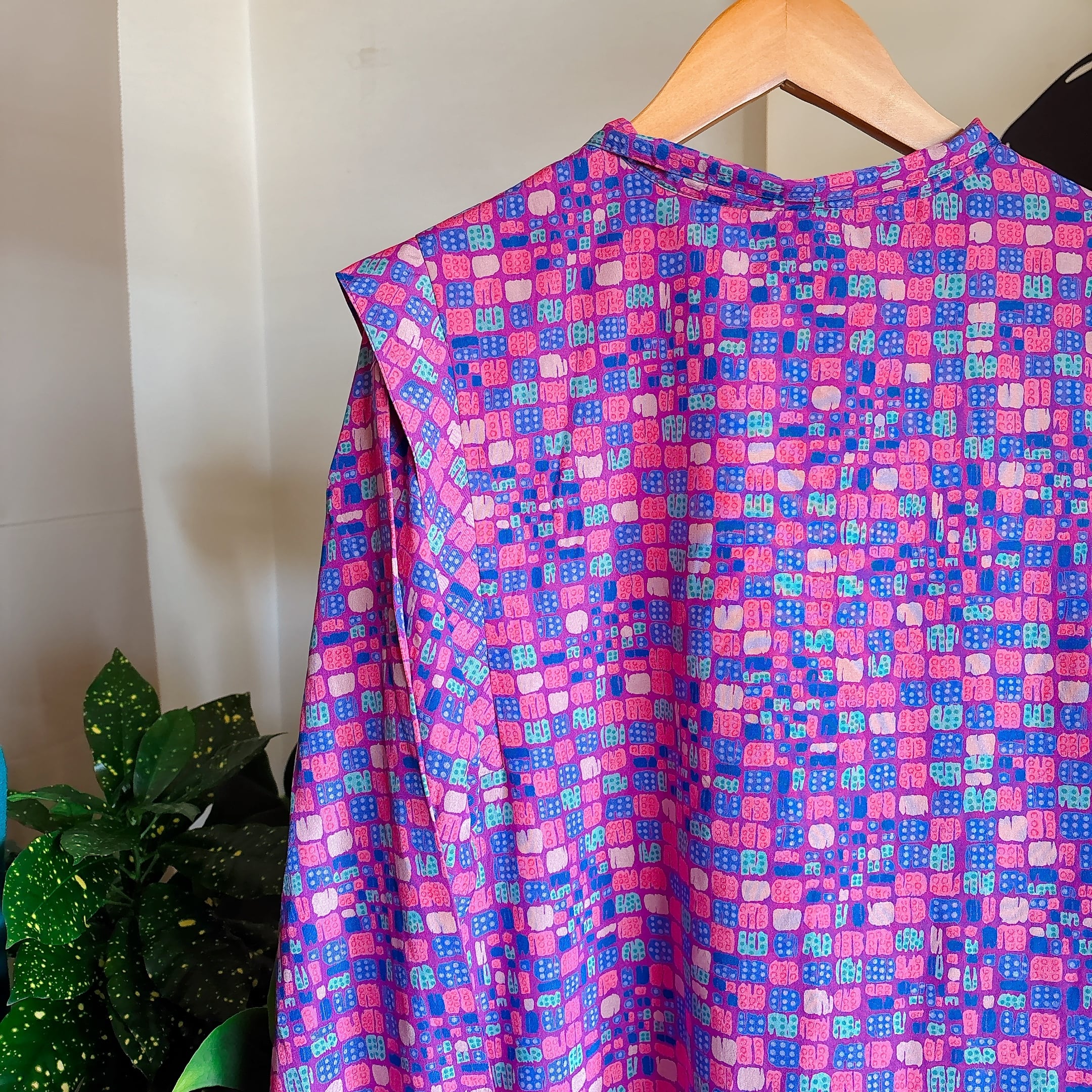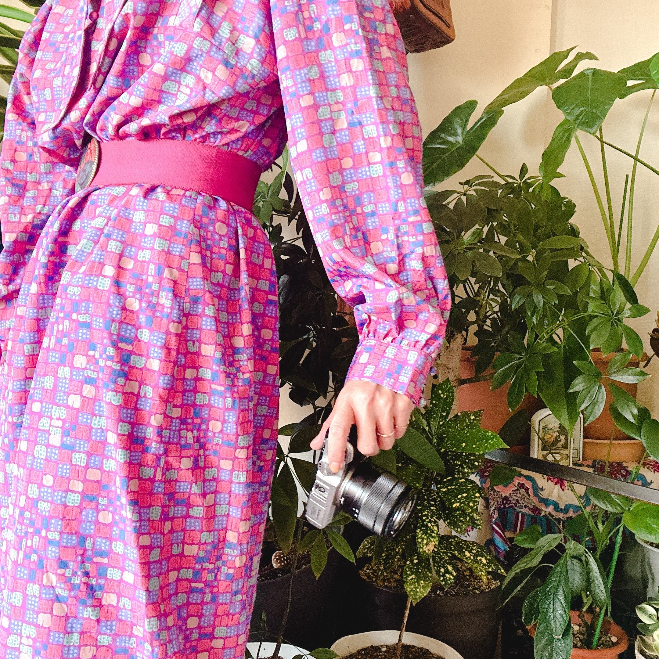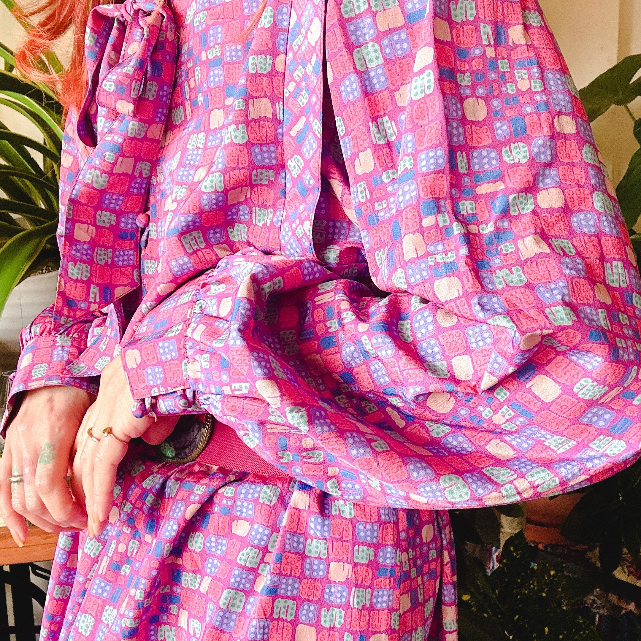 ピンクをベースにした小さなモザイク調プリントが印象的で、甘さの中にどこかアートな雰囲気も感じさせる一枚です。