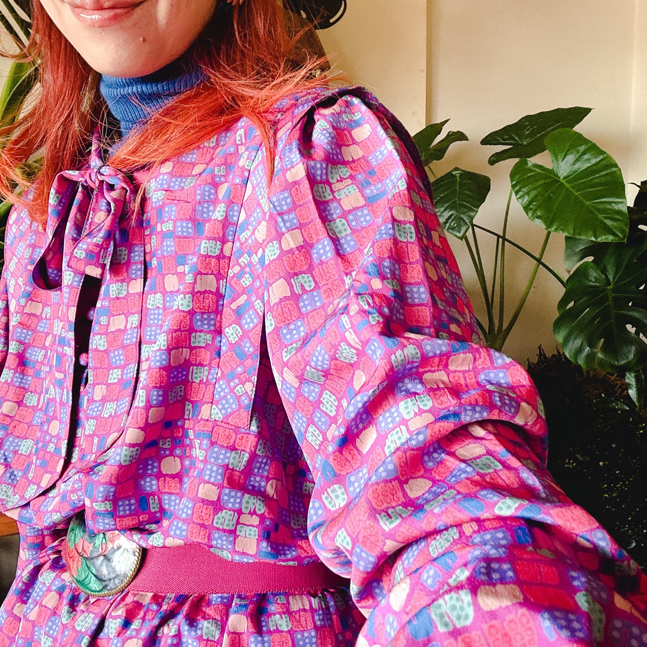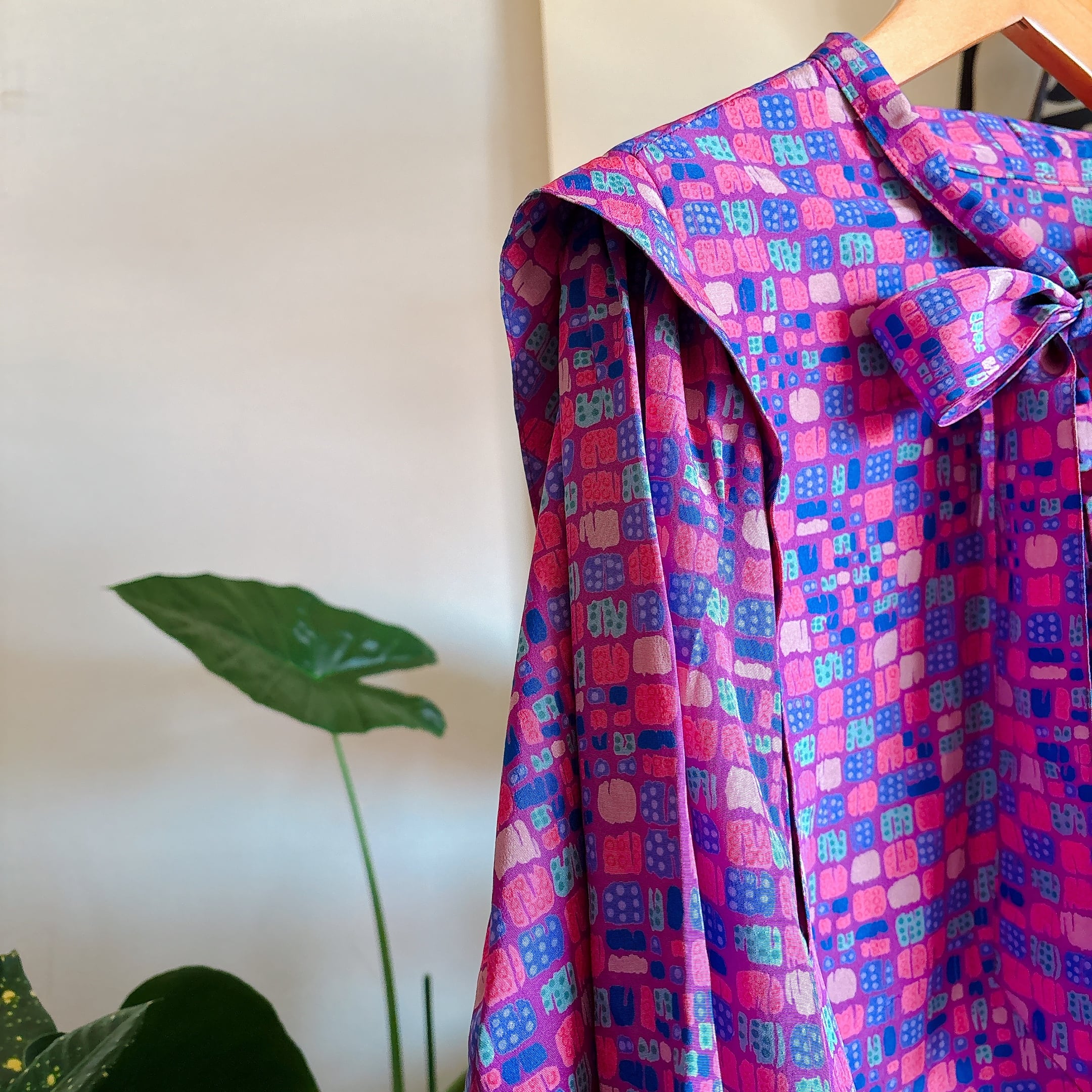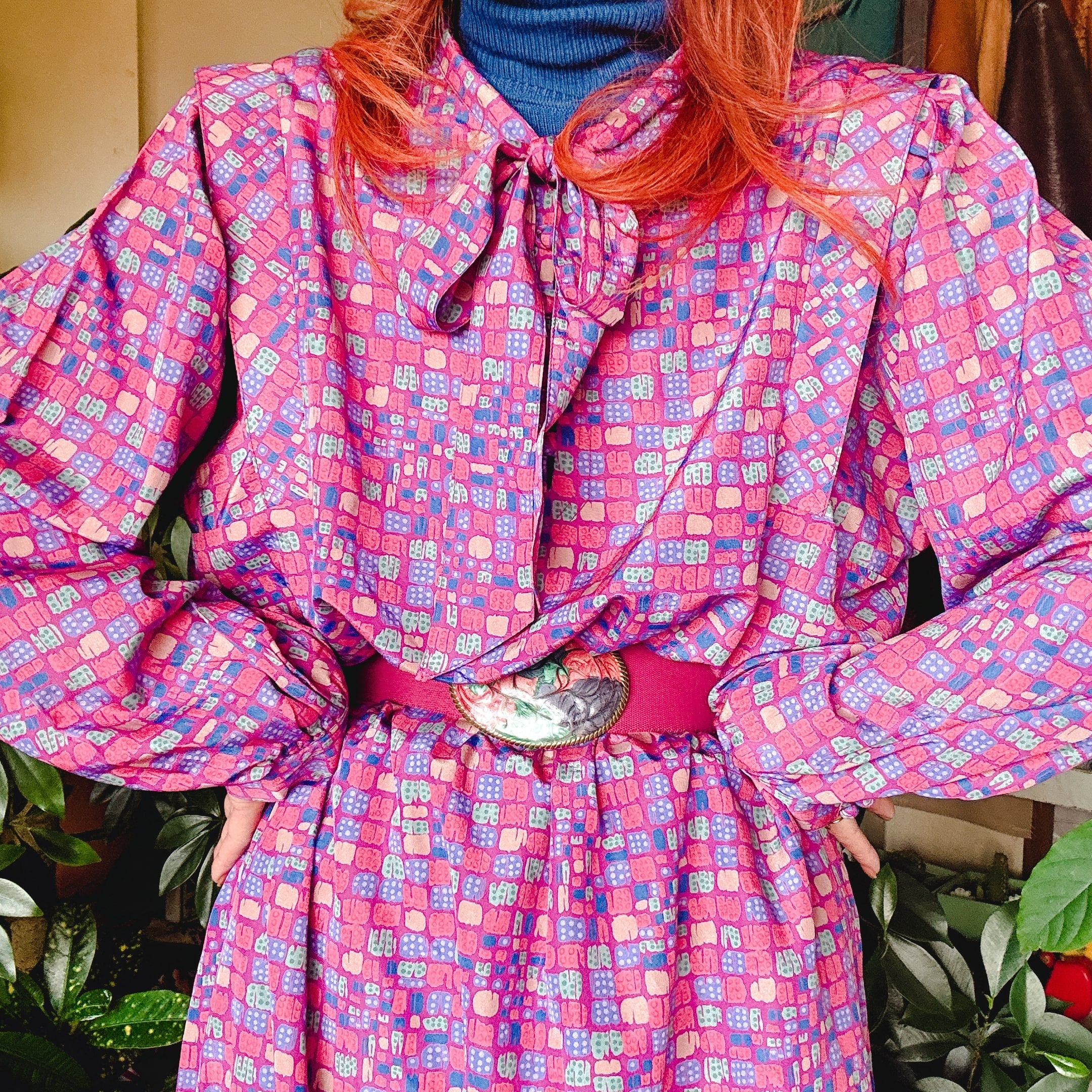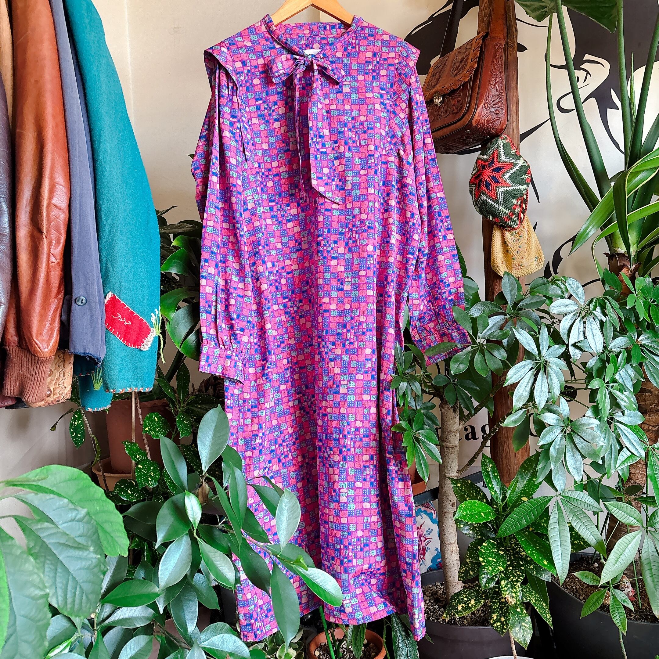 70s レトロ ジオメトリック柄 リボンネック ロング ドレス