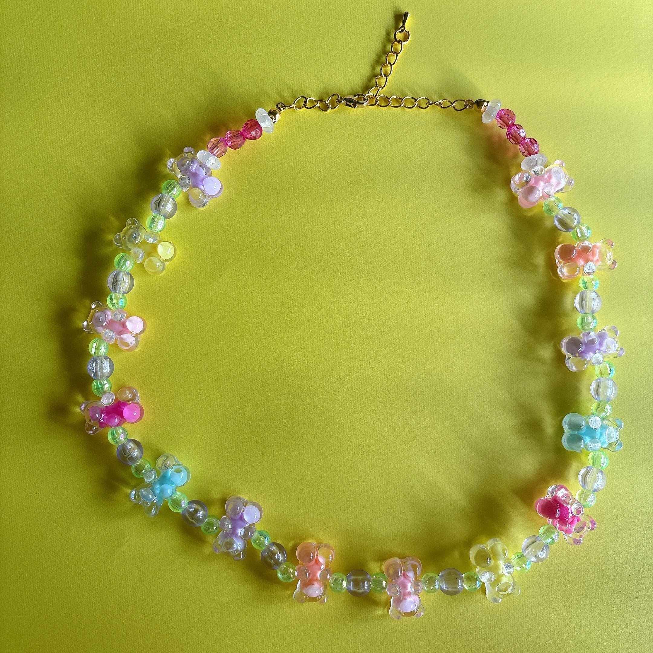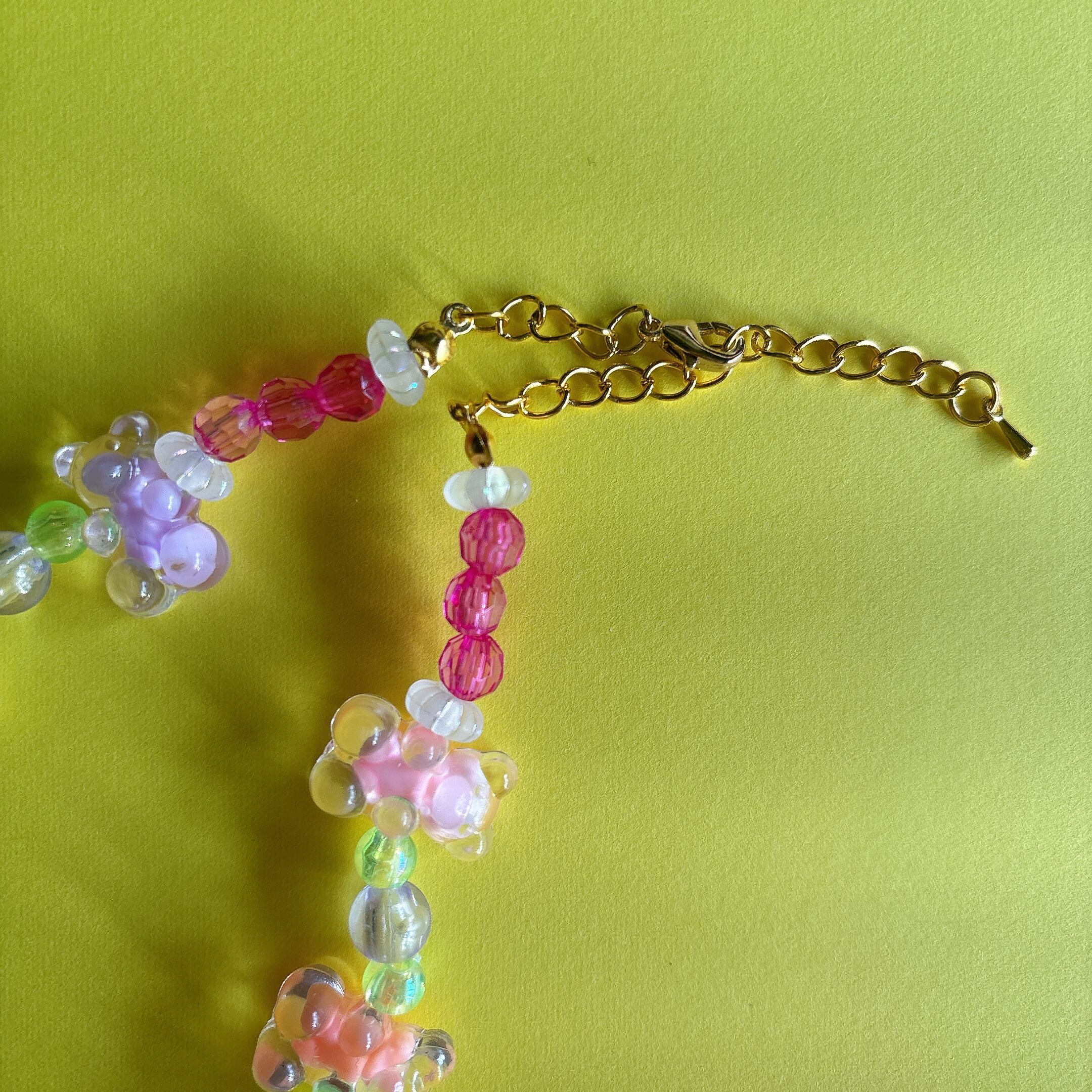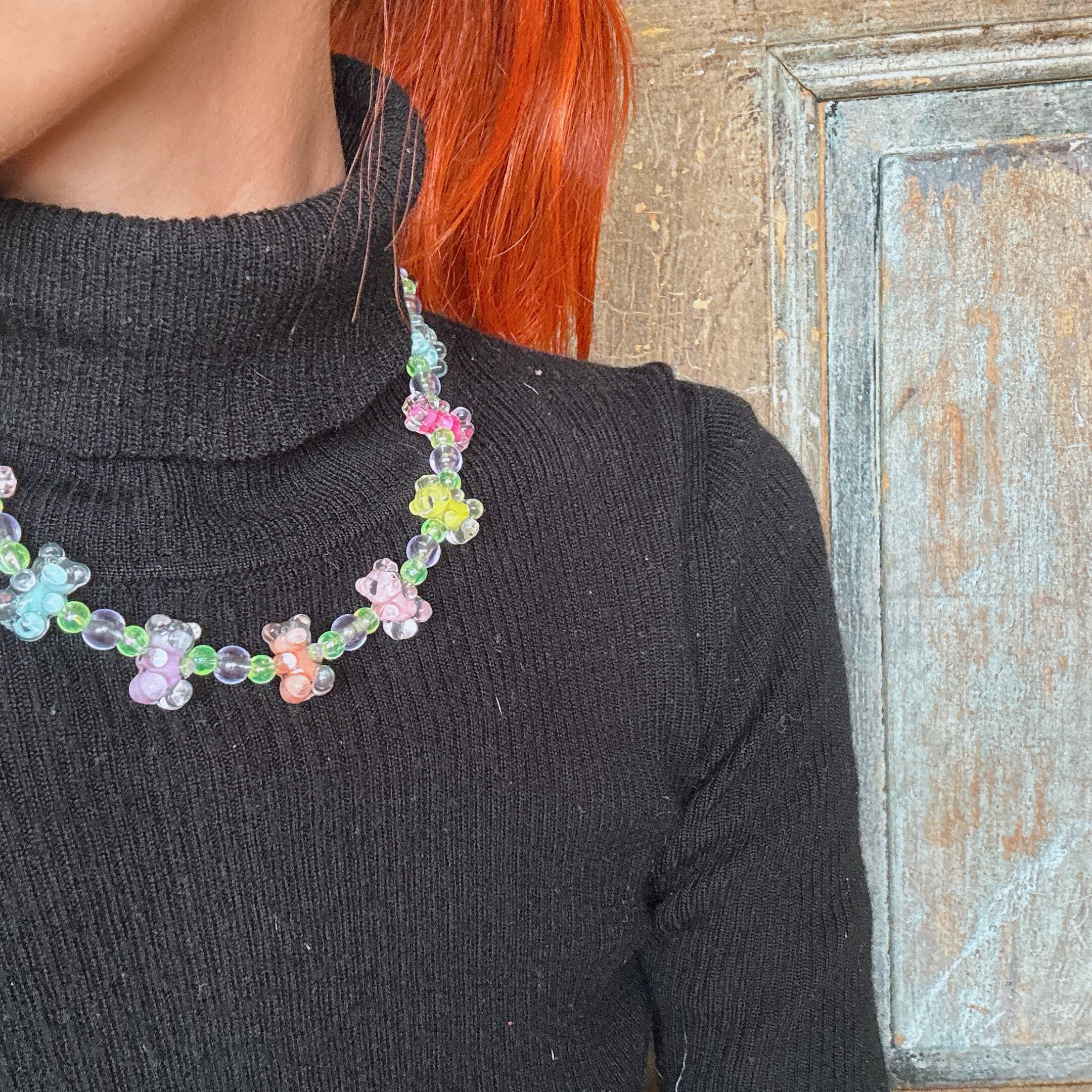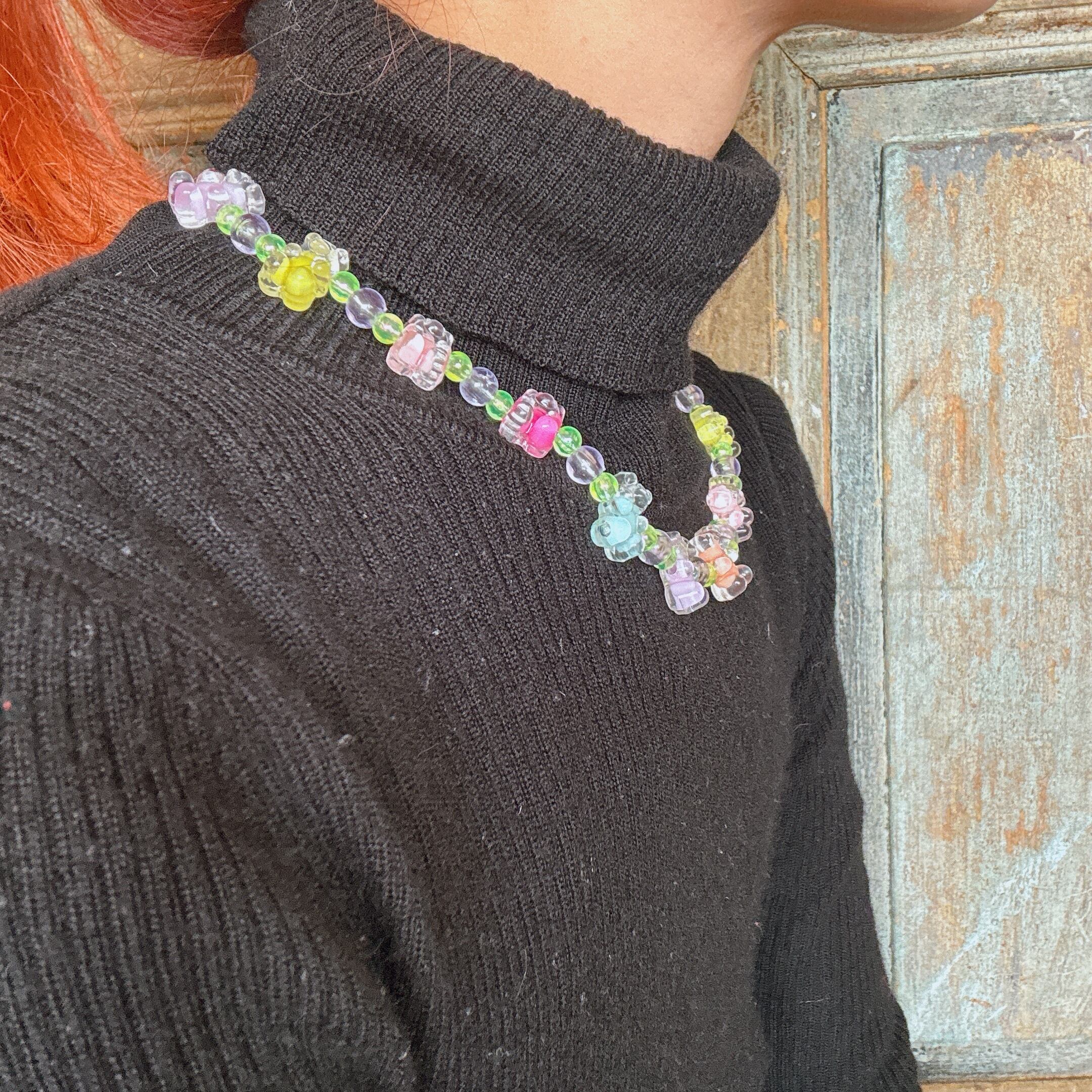 カラフルなベアモチーフビーズを贅沢に散りばめた、遊び心たっぷりのビーズネックレス。