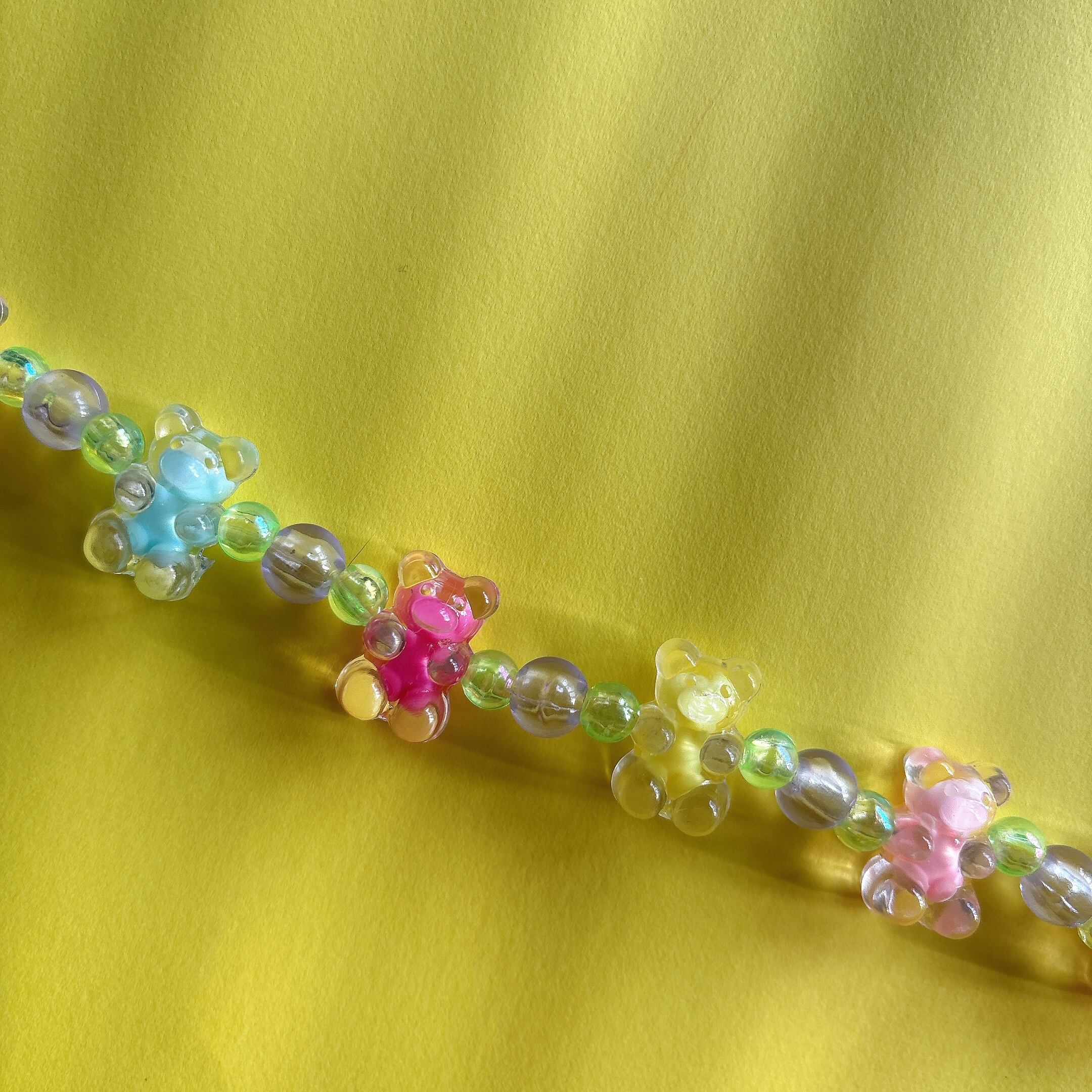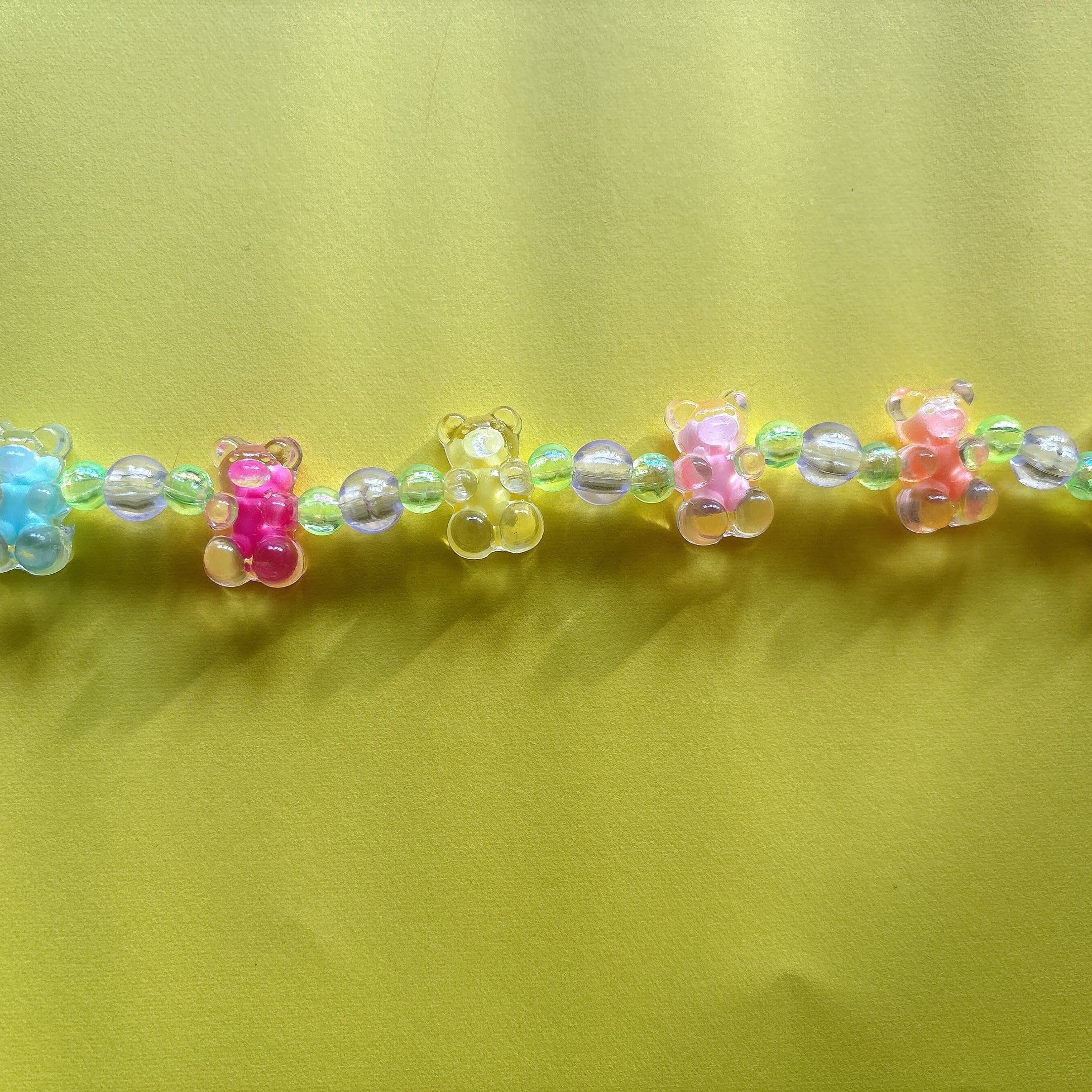 透明感のあるくま型ビーズに、パステルカラーやビビッドカラーをミックス。