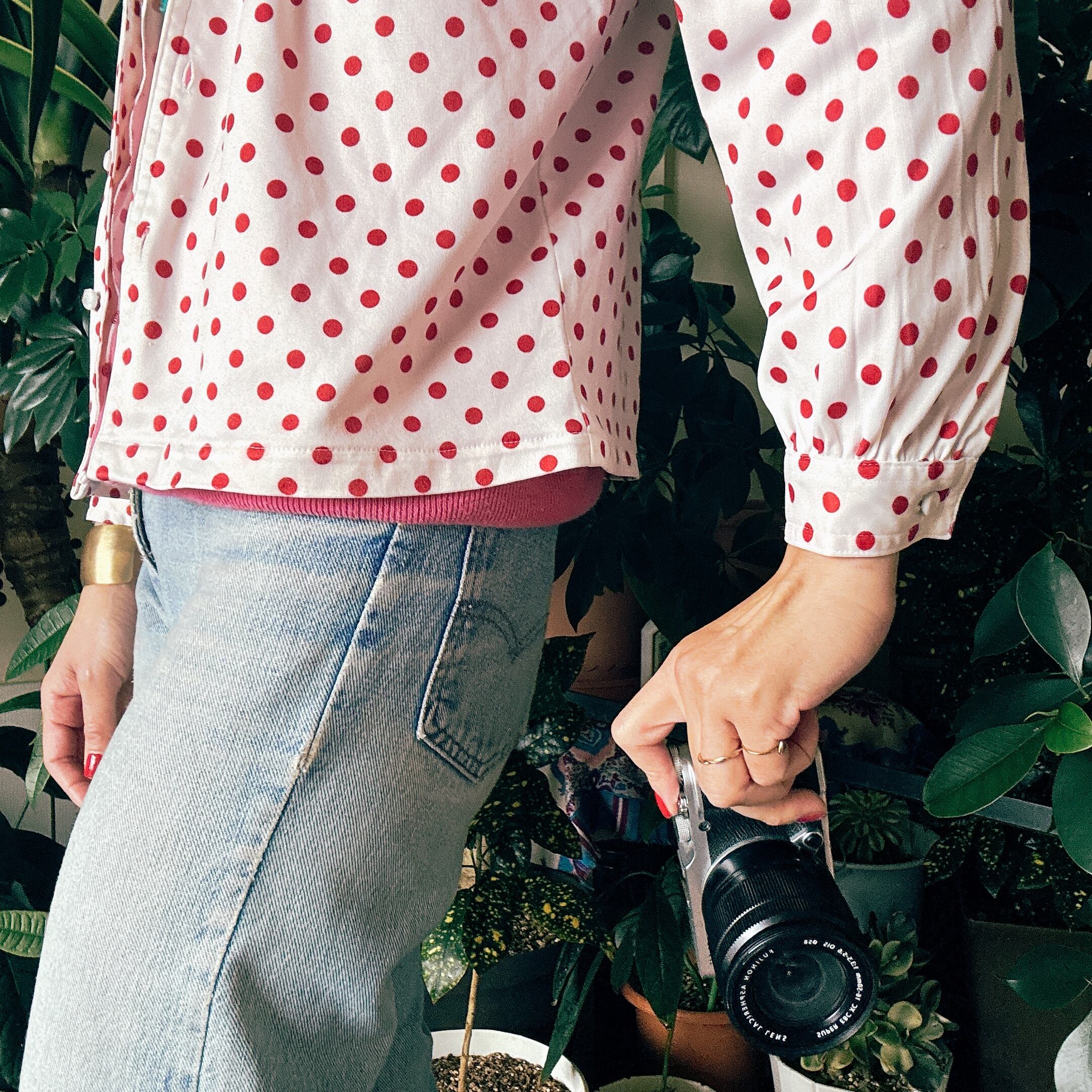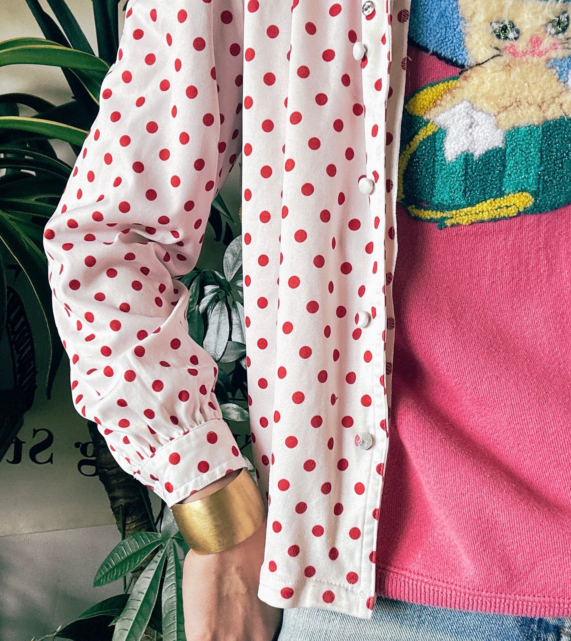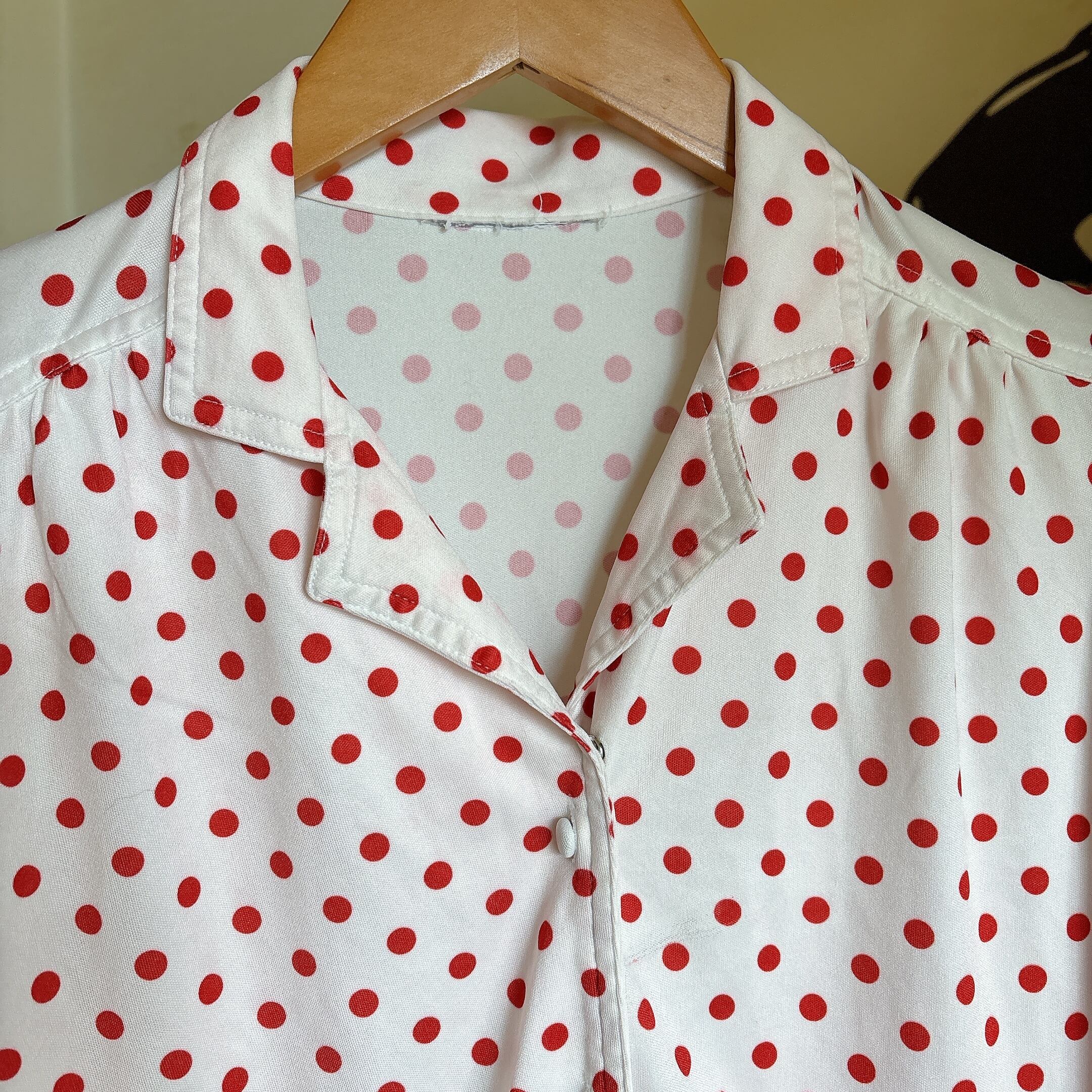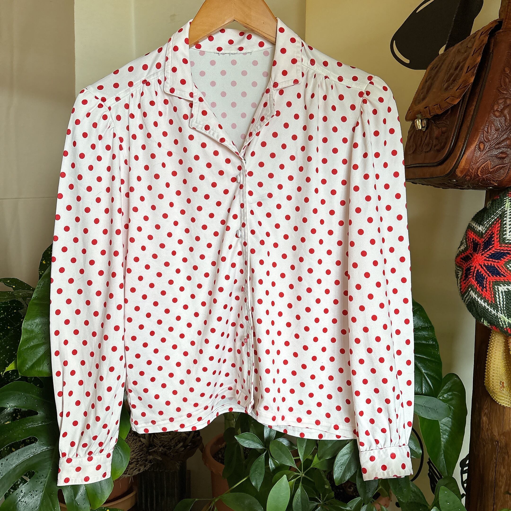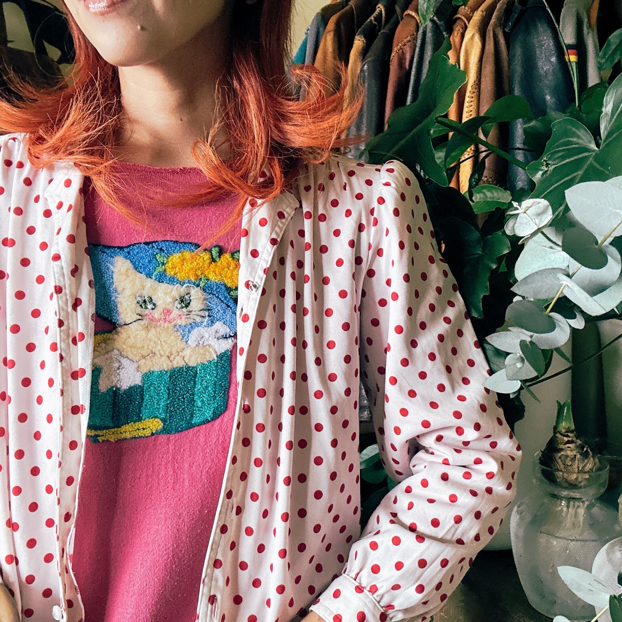 ◾️ホワイトベースに赤ドットが映える、どこかレトロな雰囲気漂うブラウス。