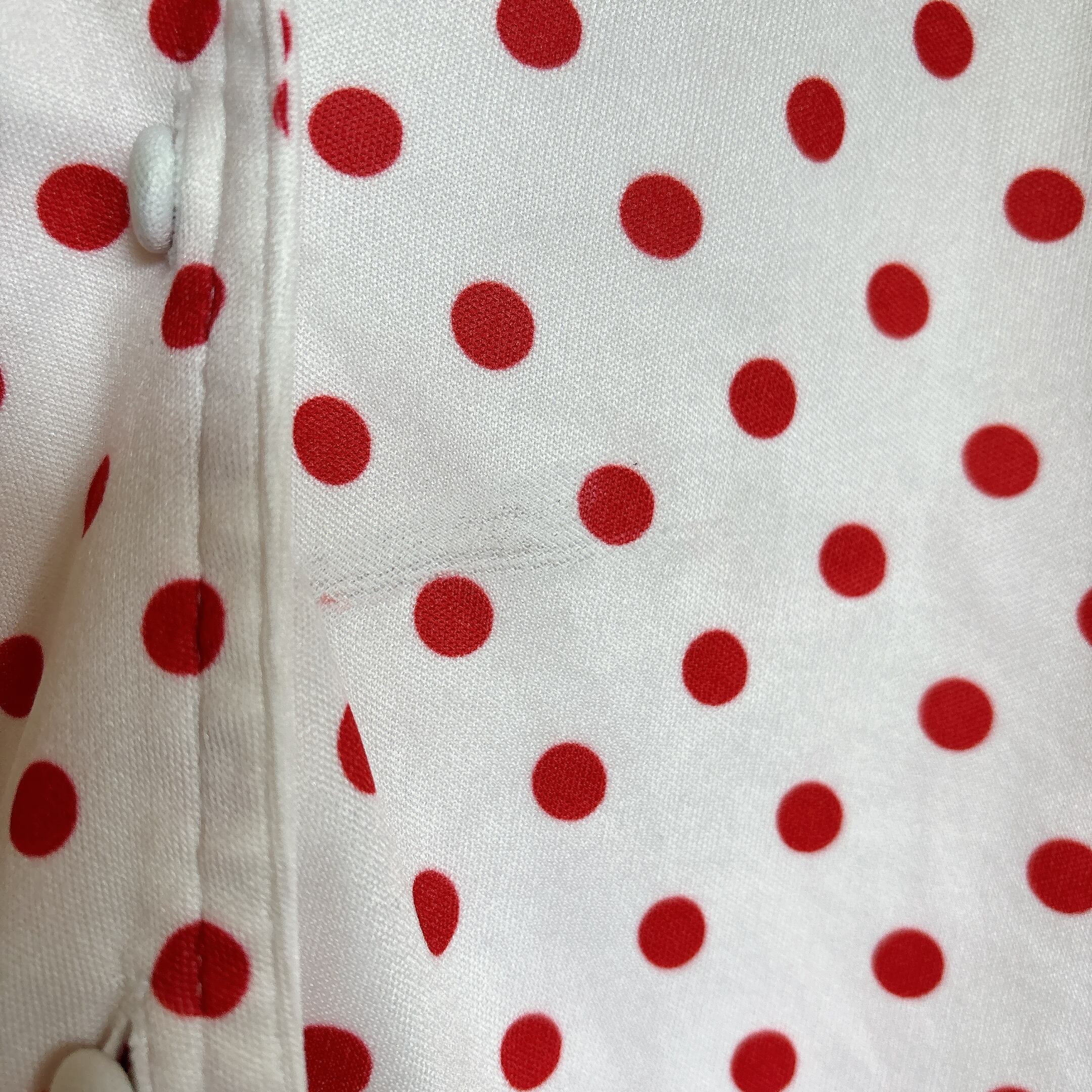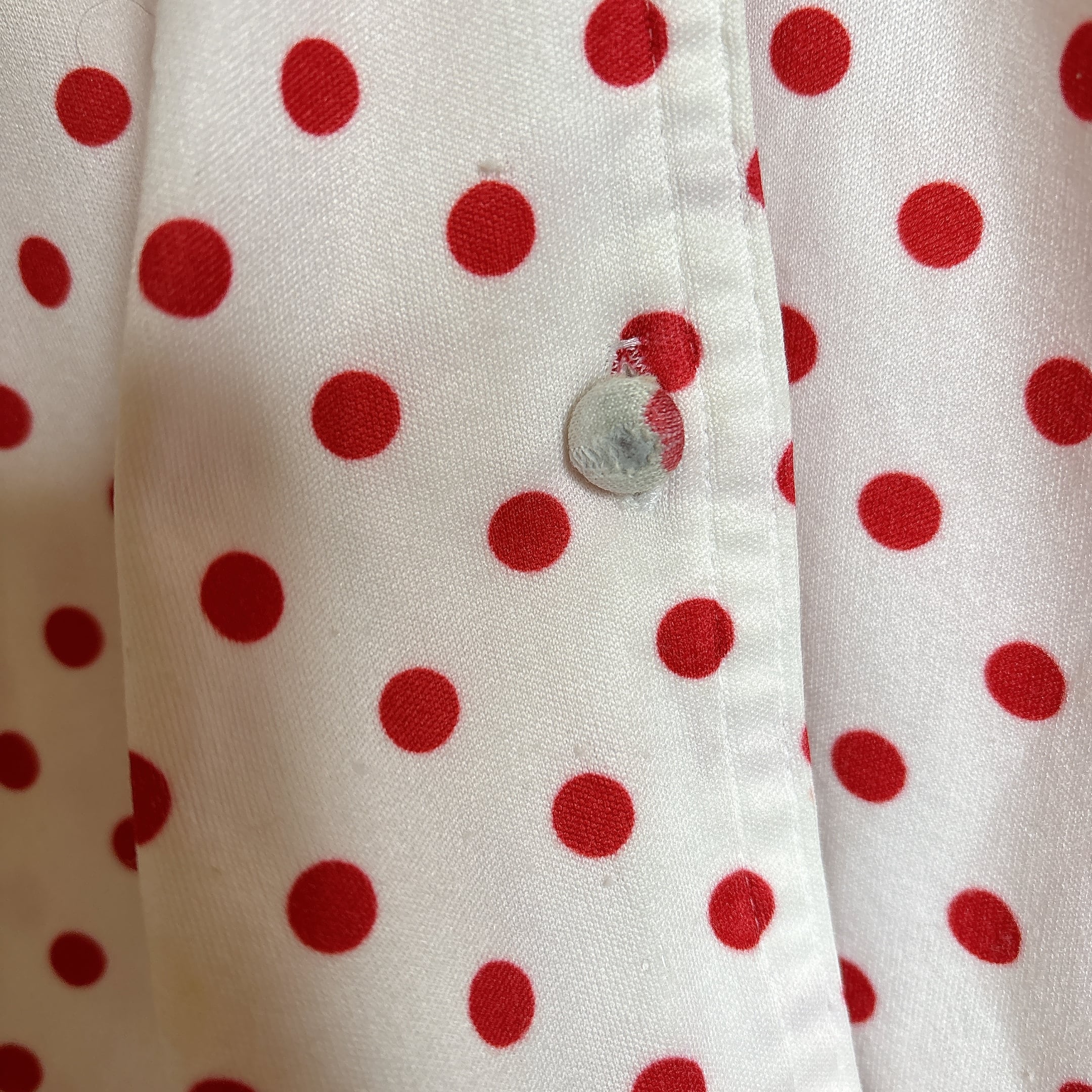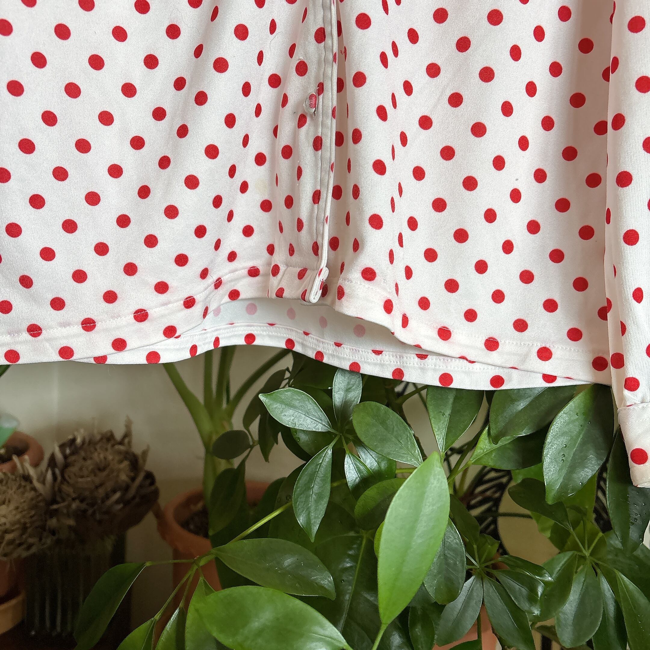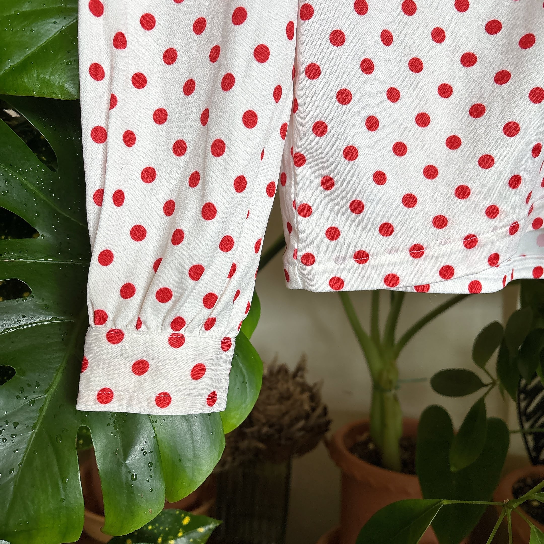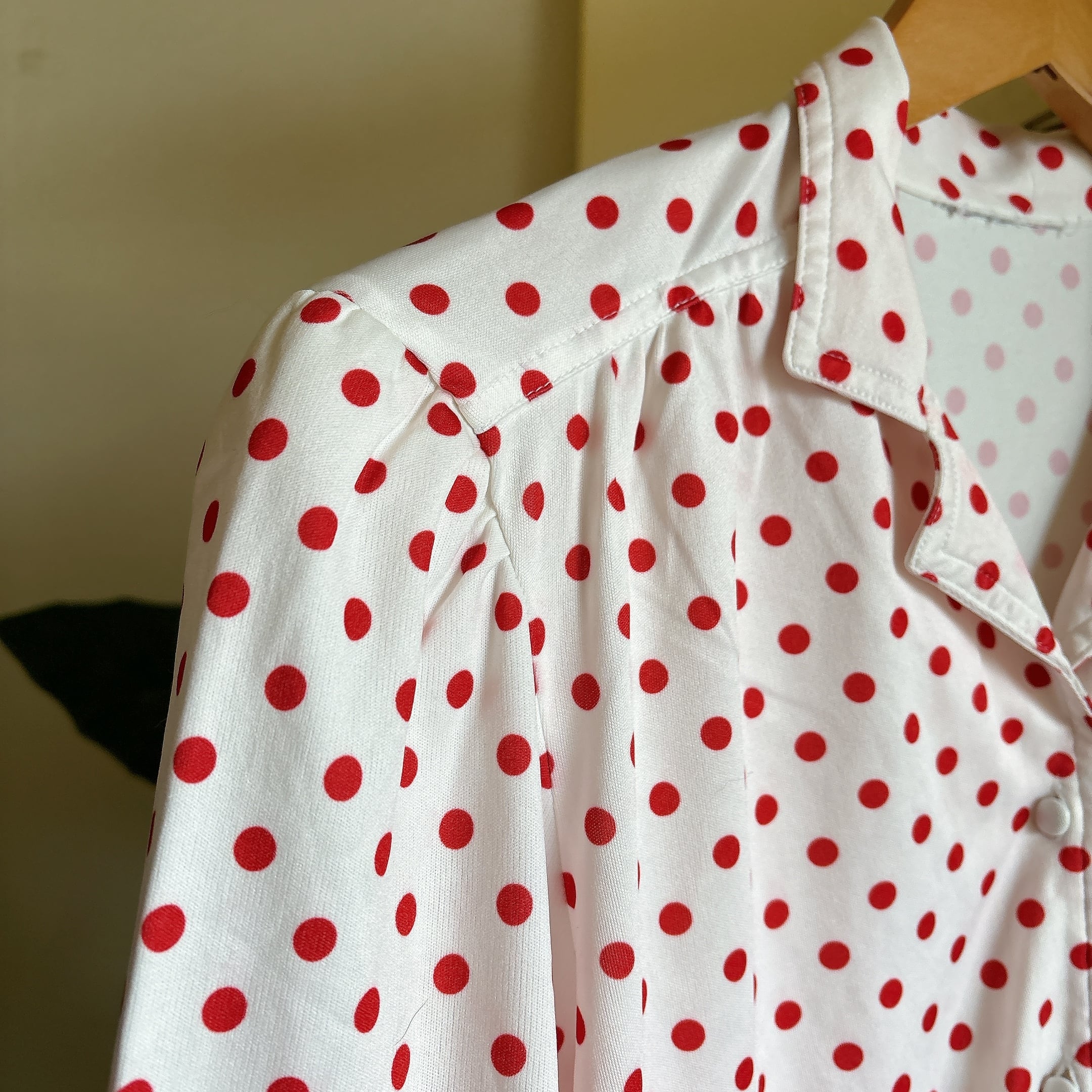 ◾️ホワイトベースに赤ドットが映える、どこかレトロな雰囲気漂うブラウス。