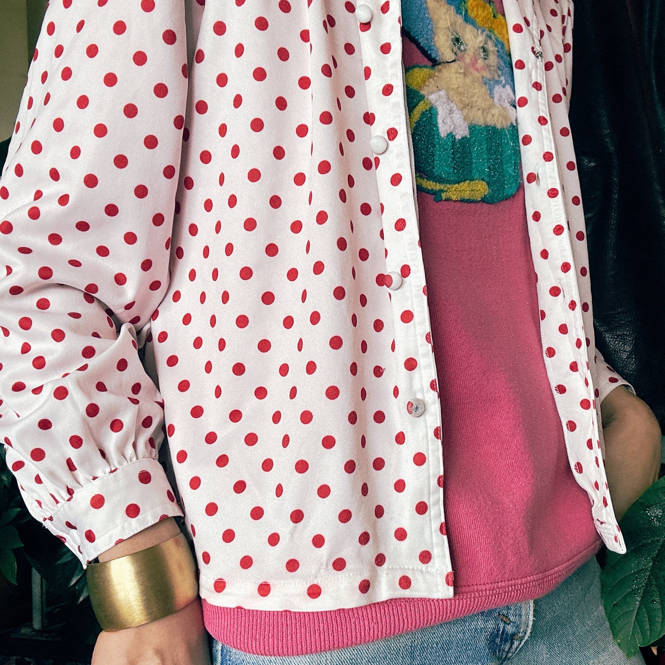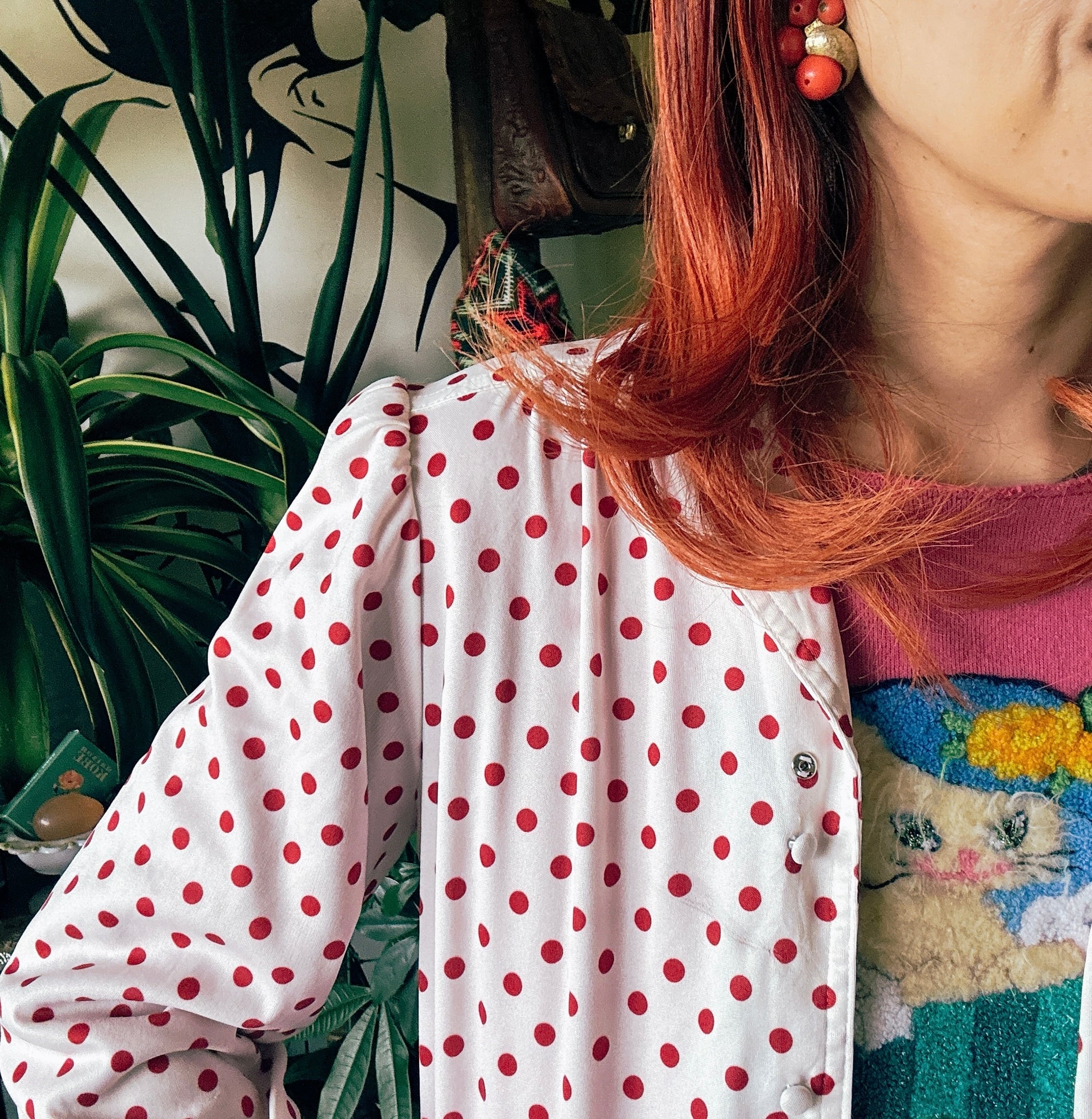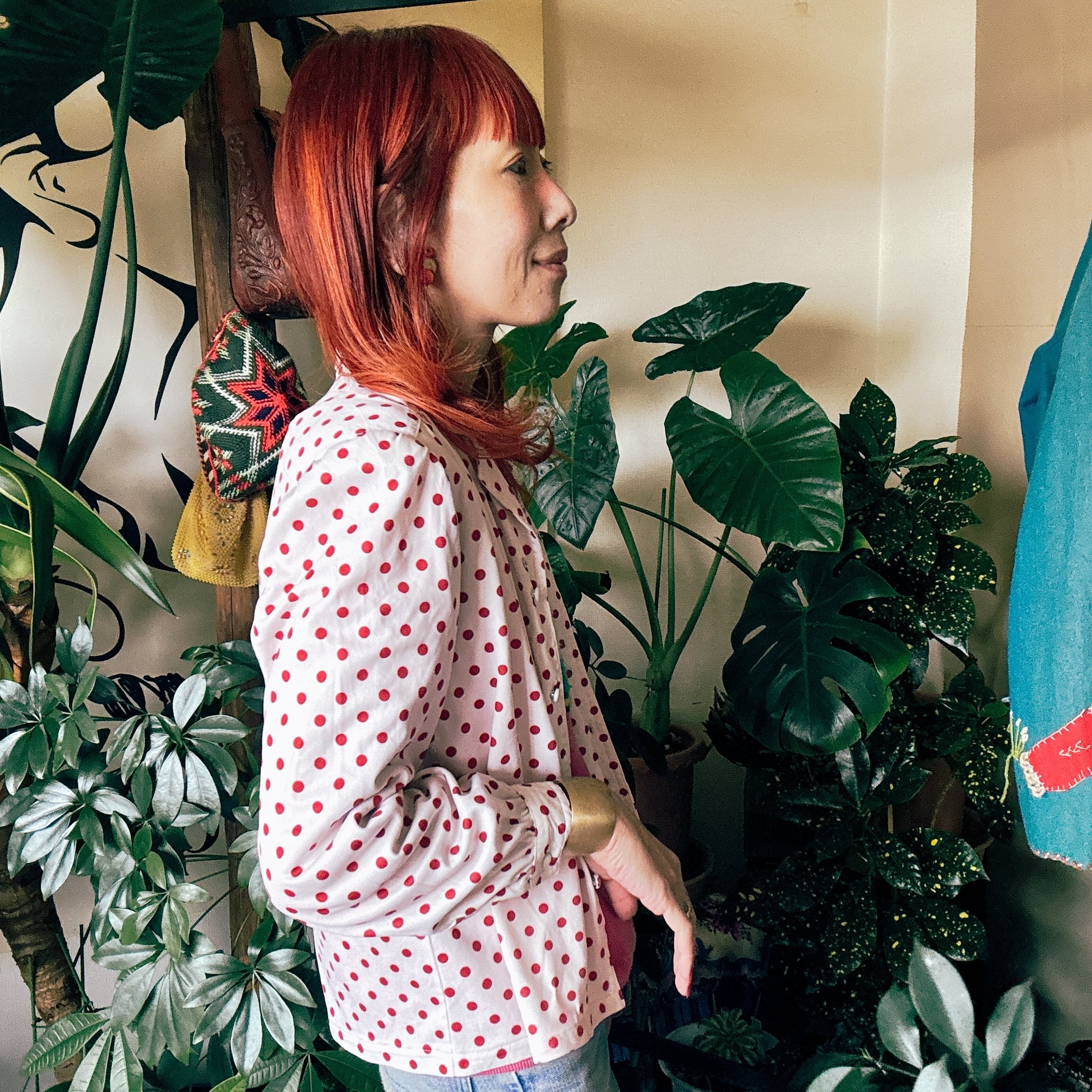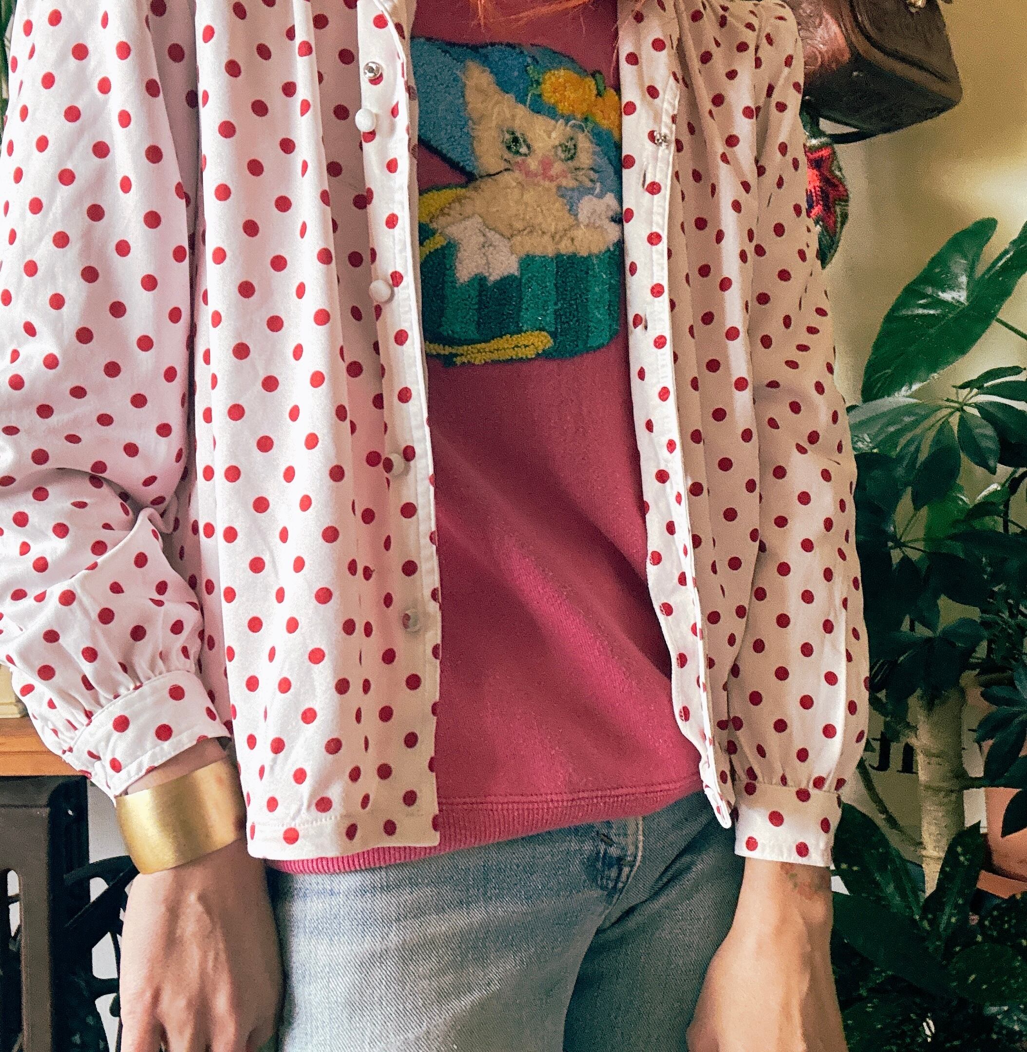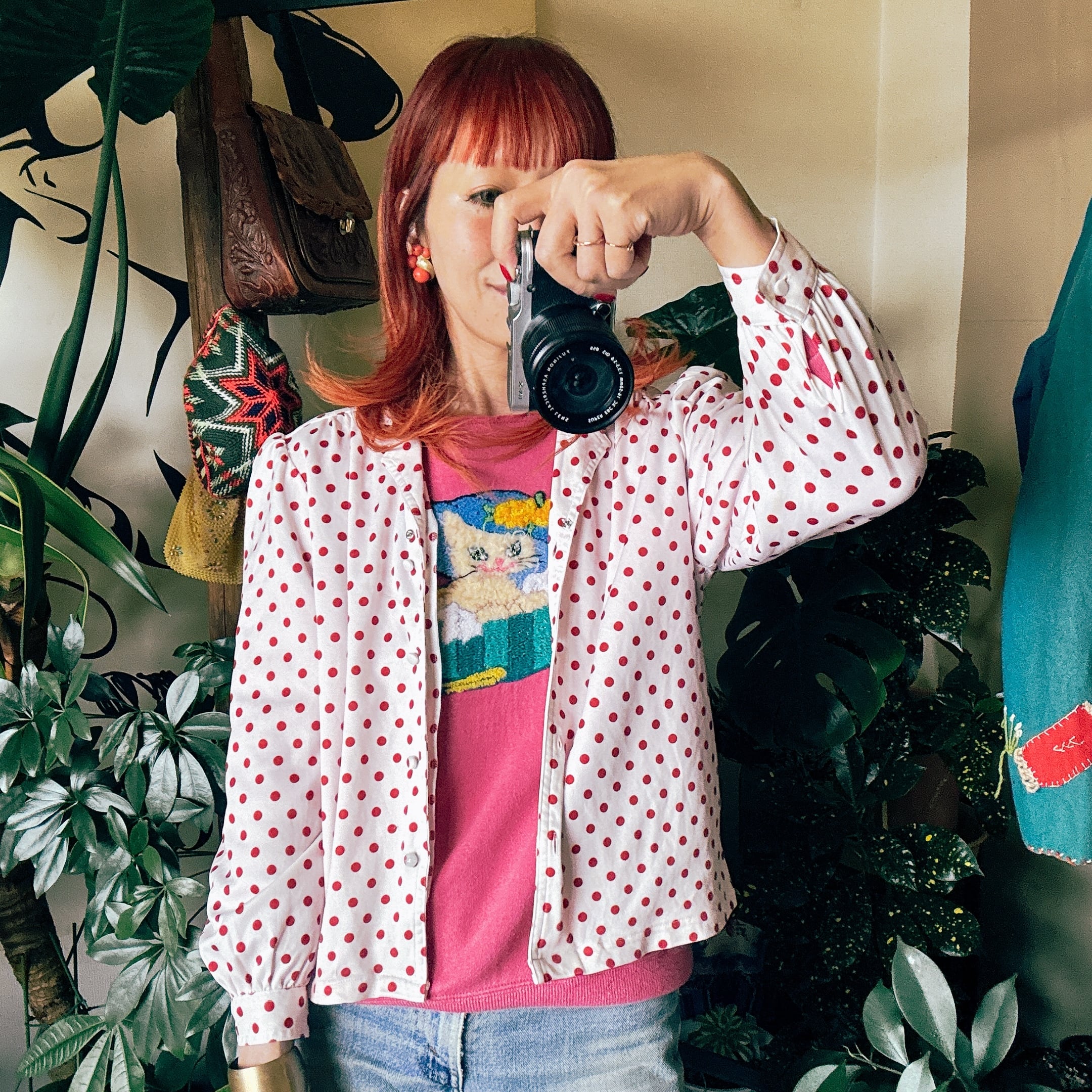 ◾️ホワイトベースに赤ドットが映える、どこかレトロな雰囲気漂うブラウス。