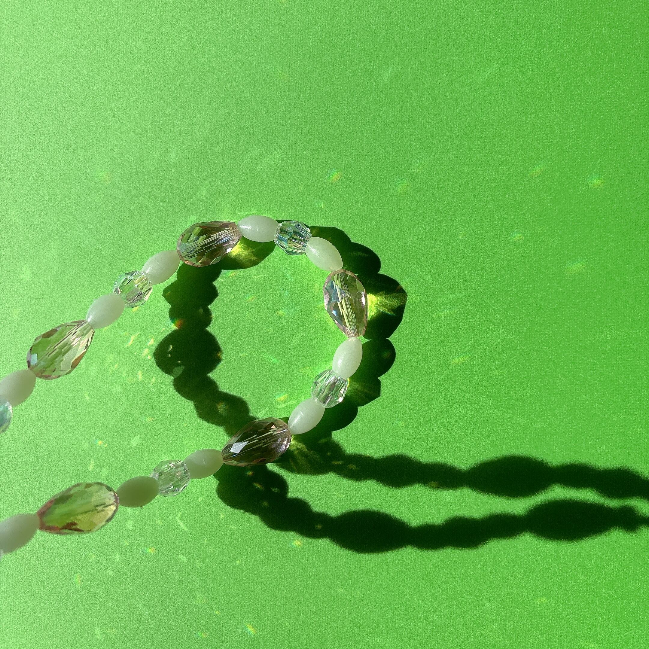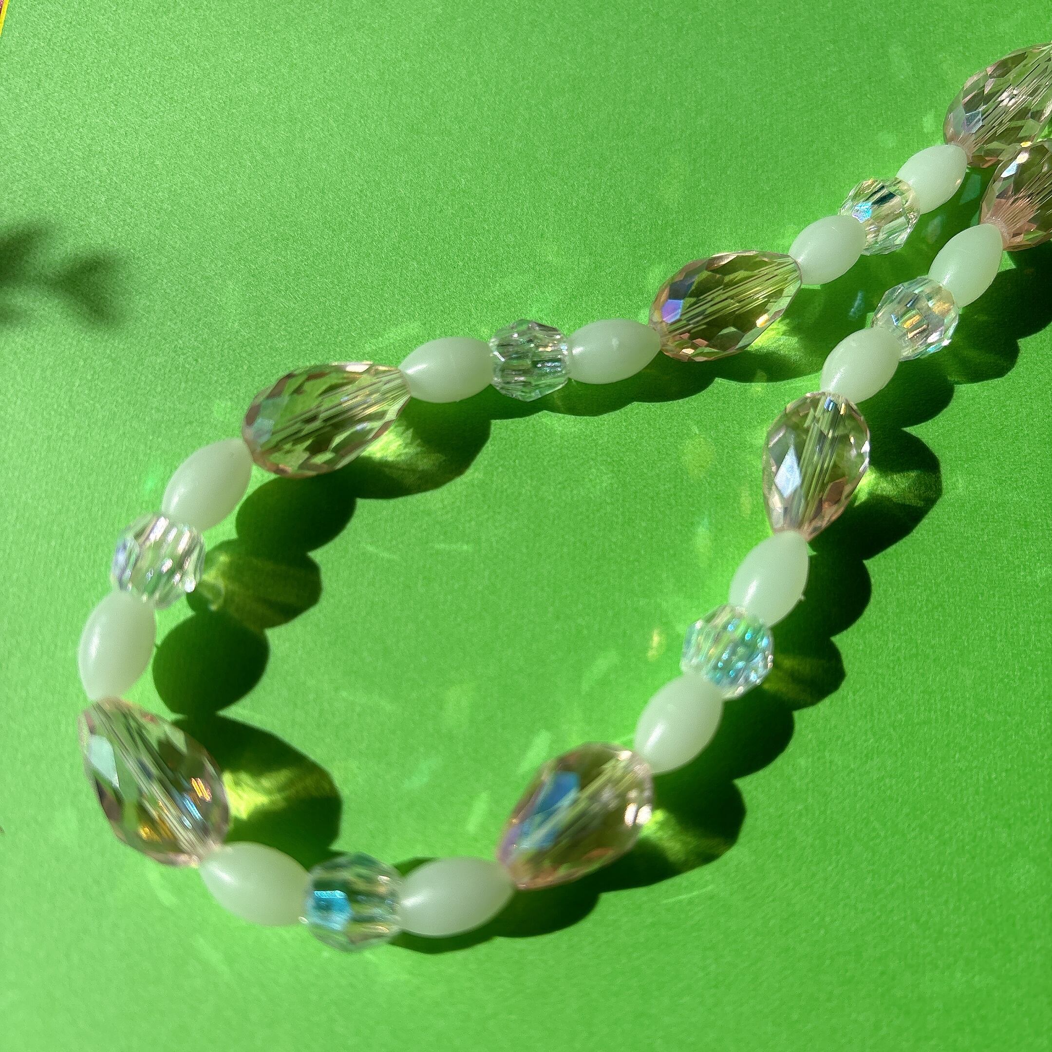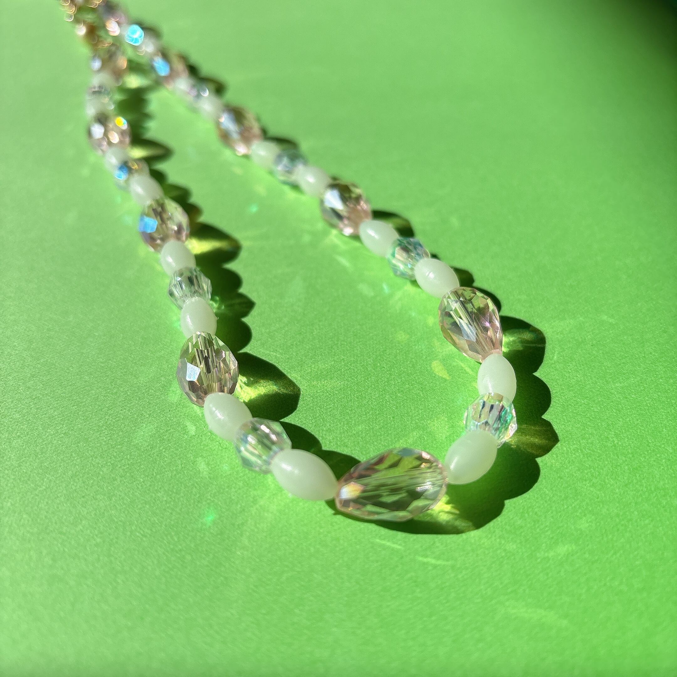 透明感のあるガラスビーズと、やわらかな乳白色のプラスチックビーズを組み合わせたネックレス。