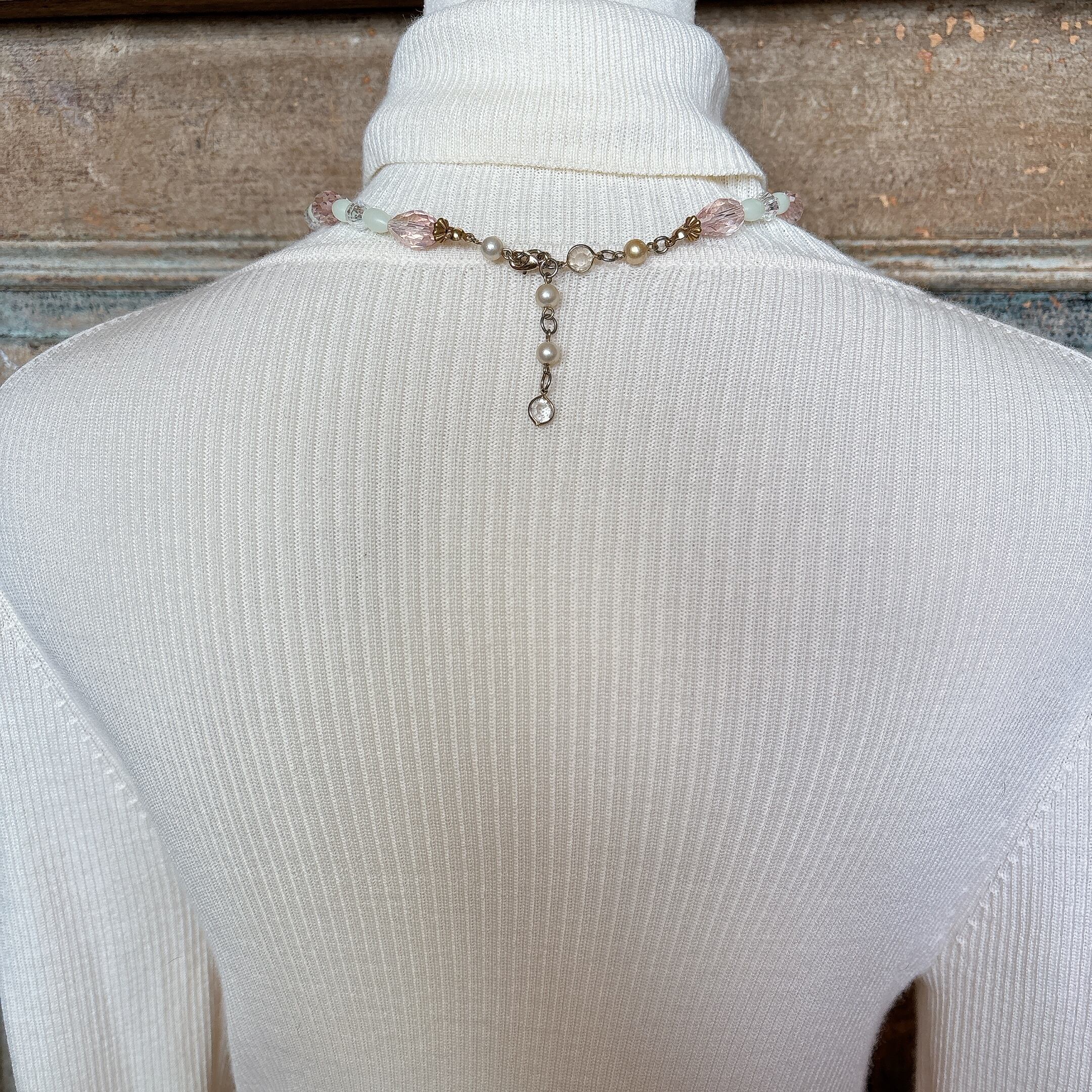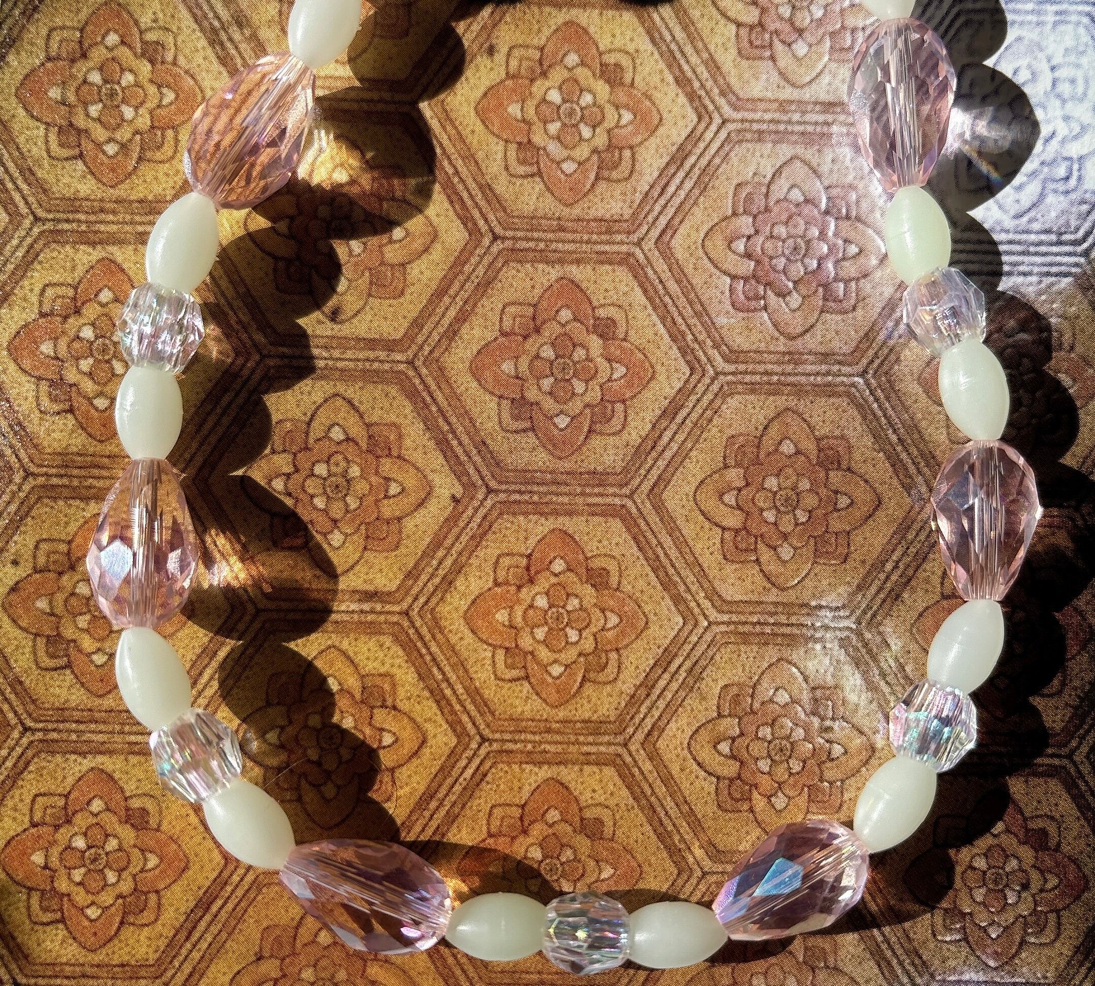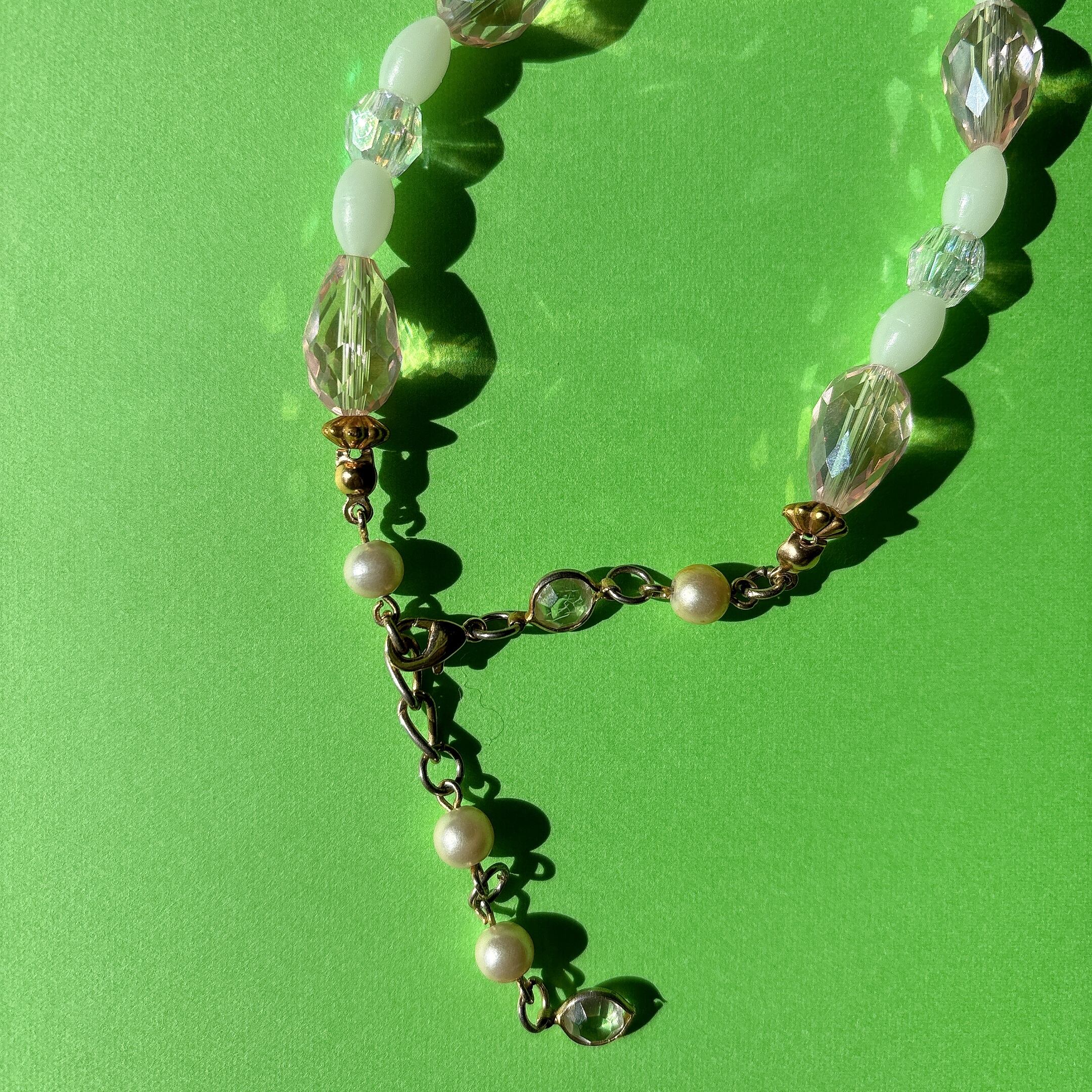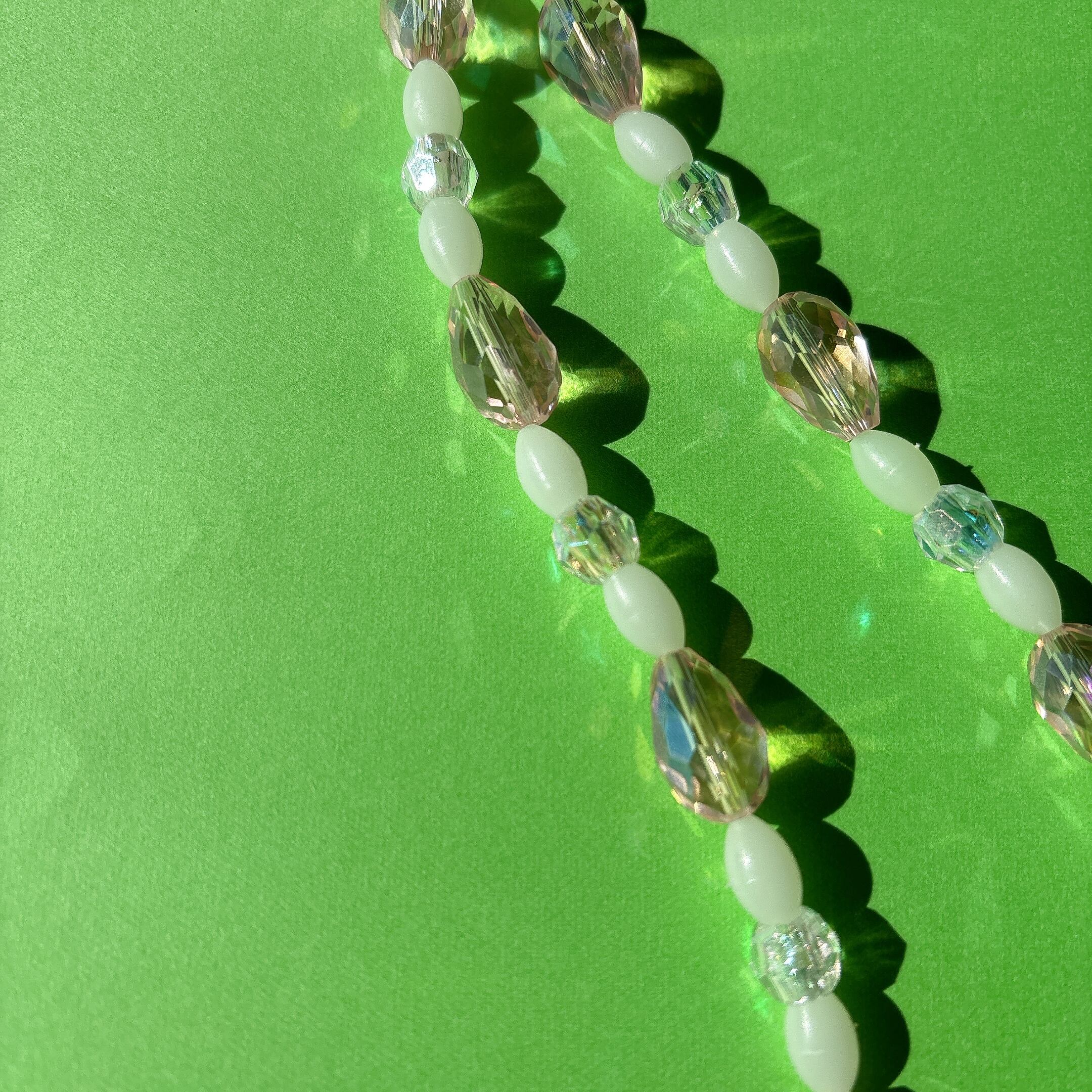 透明感のあるガラスビーズと、やわらかな乳白色のプラスチックビーズを組み合わせたネックレス。