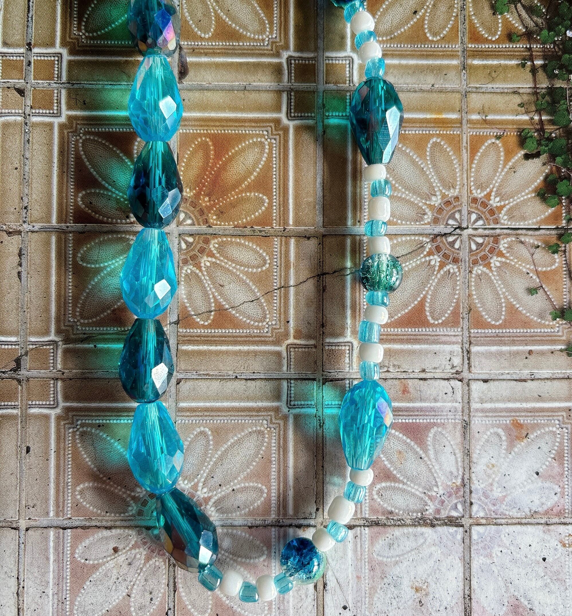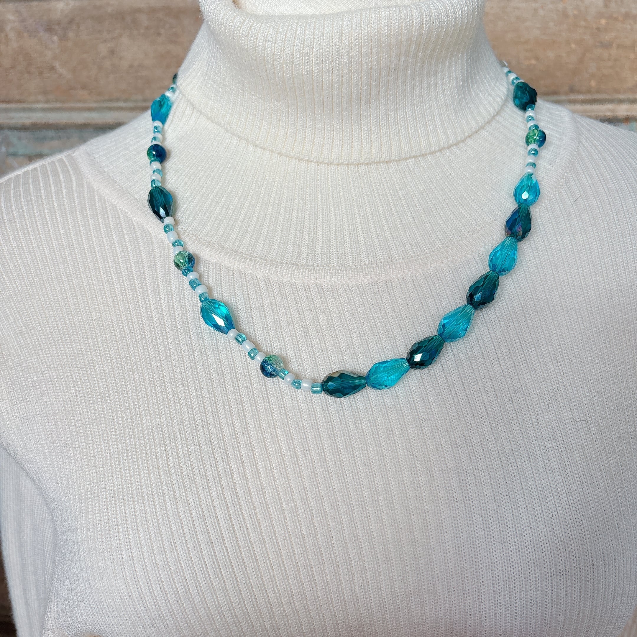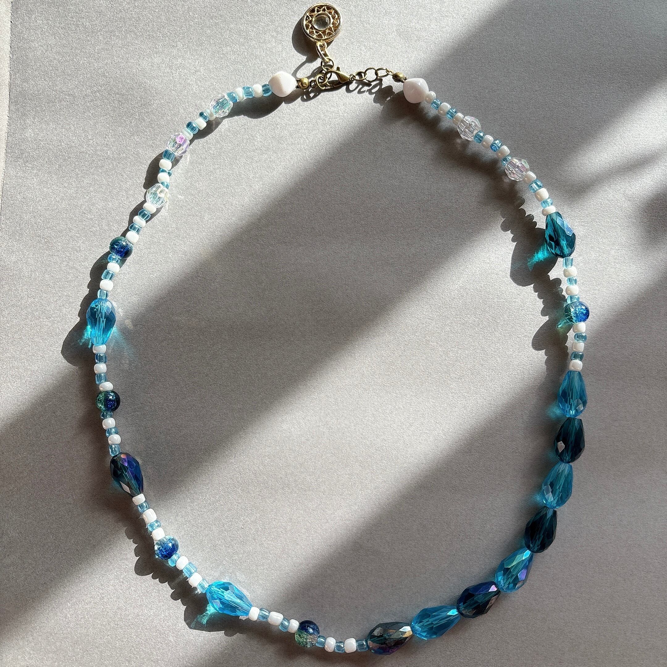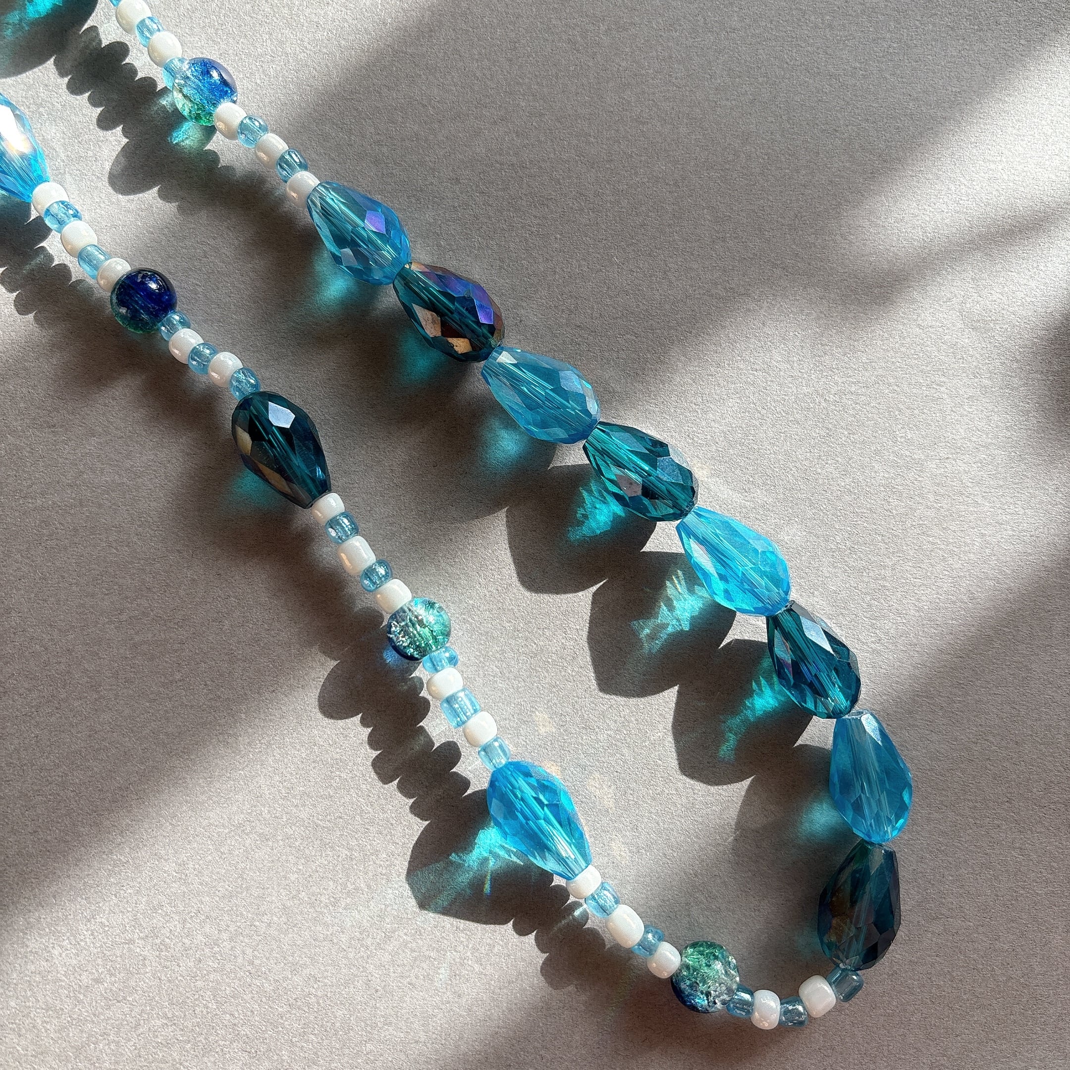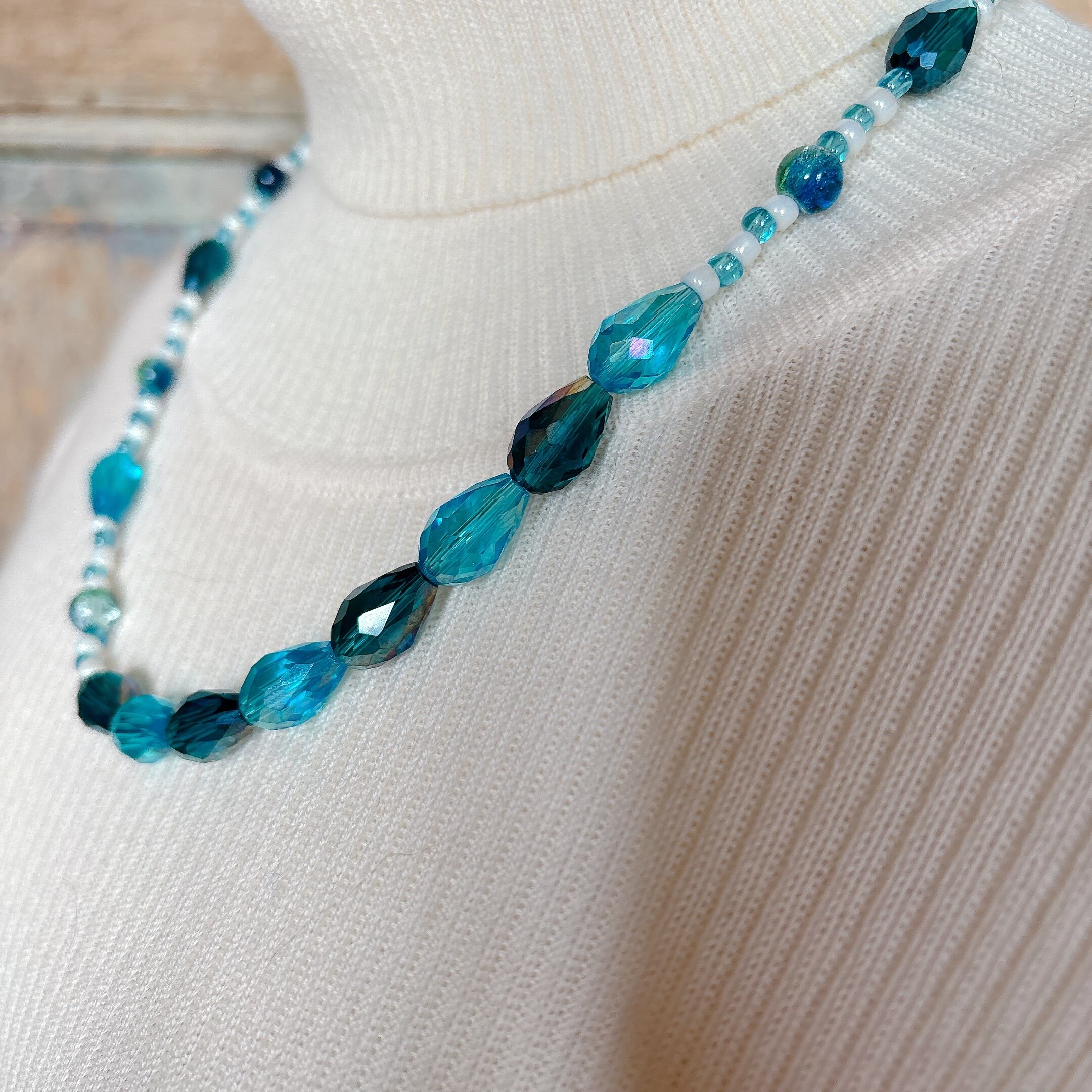 ◾️ ネイビーからターコイズまで、奥行きのあるブルーを重ねた上品なビーズネックレスです。