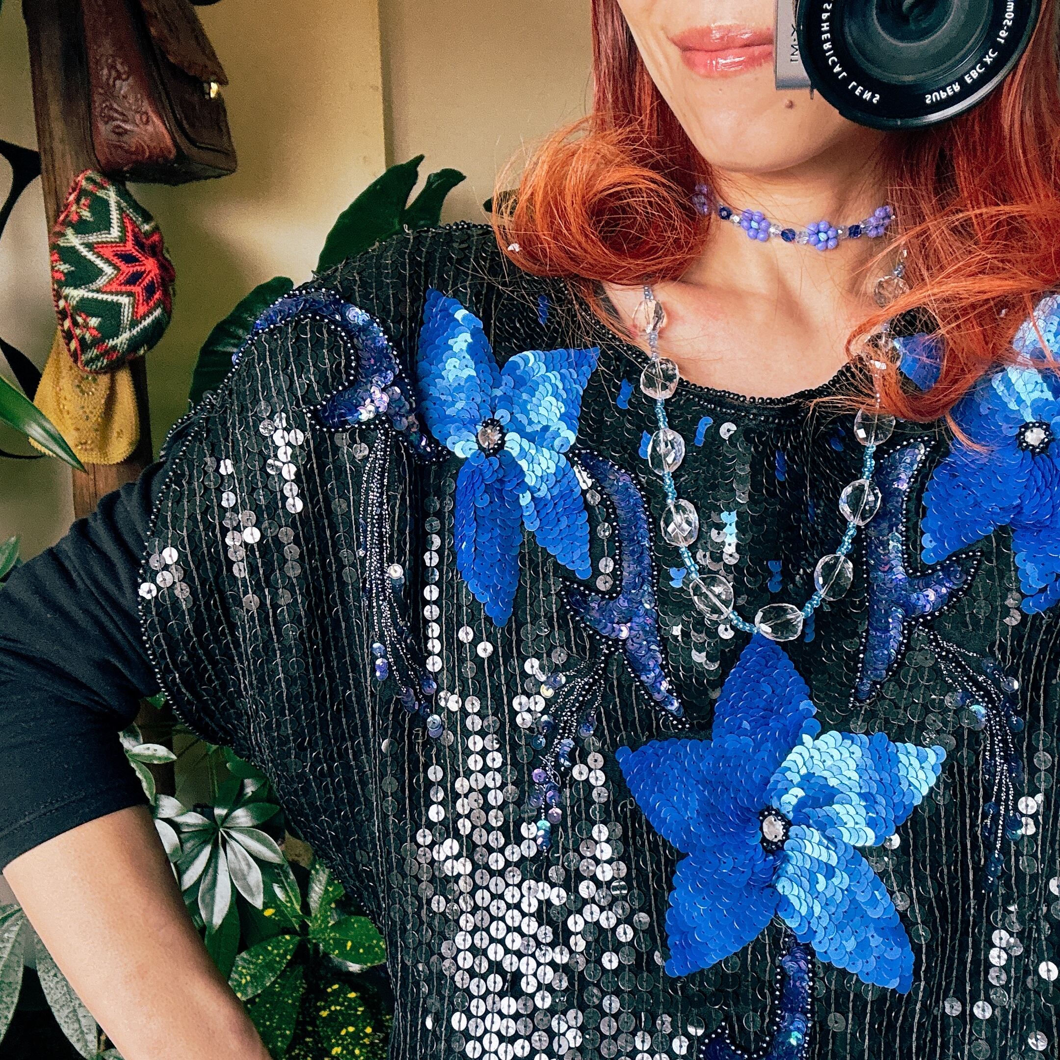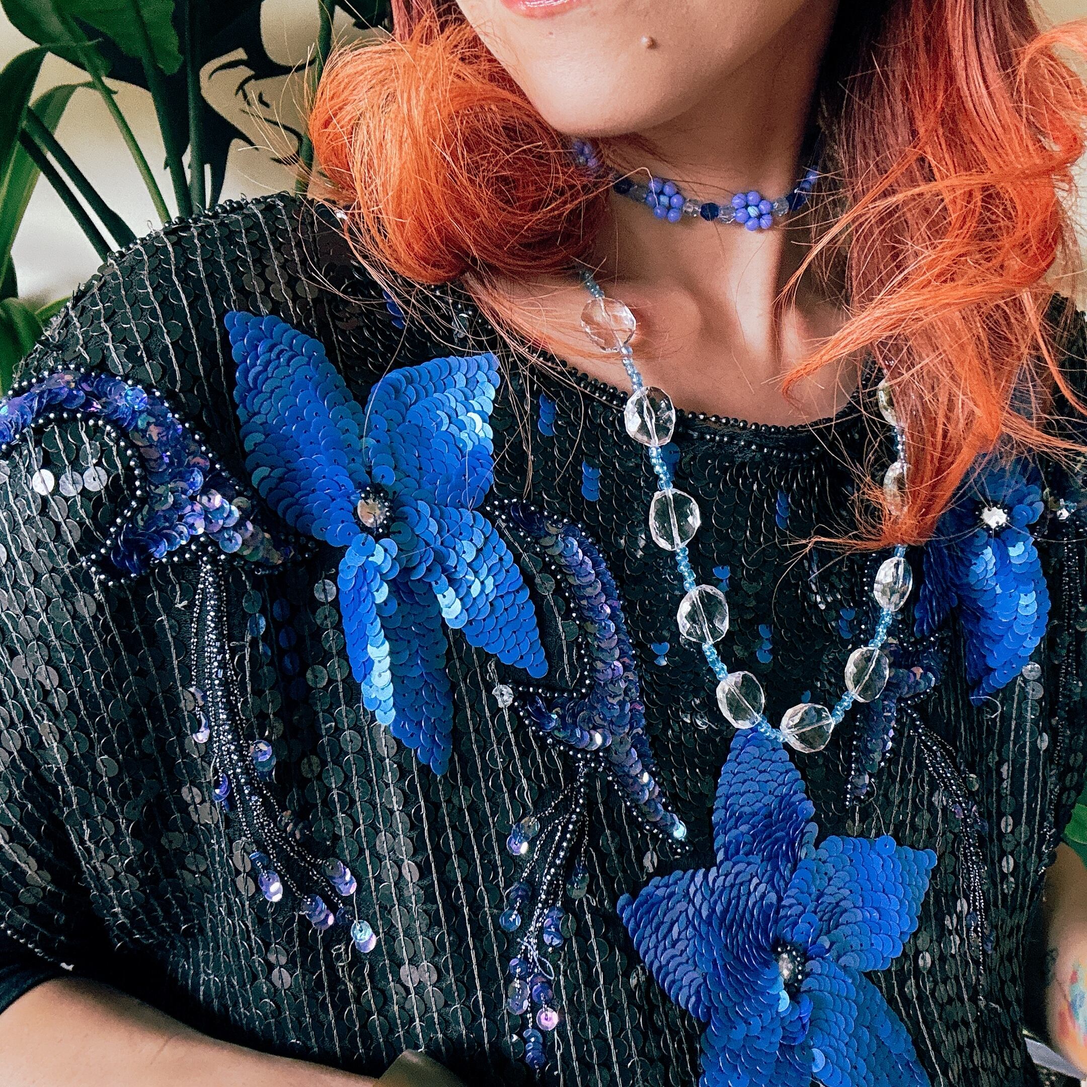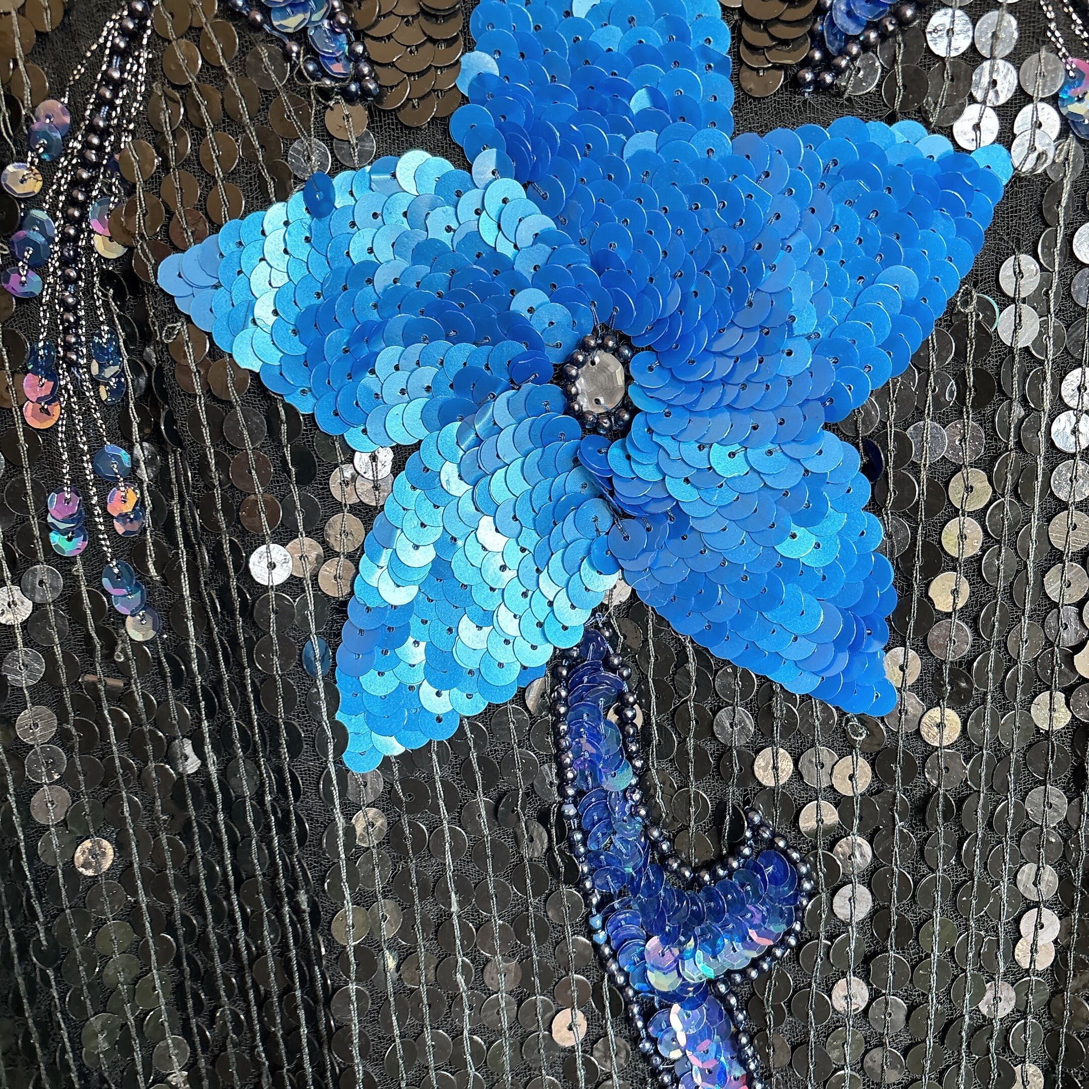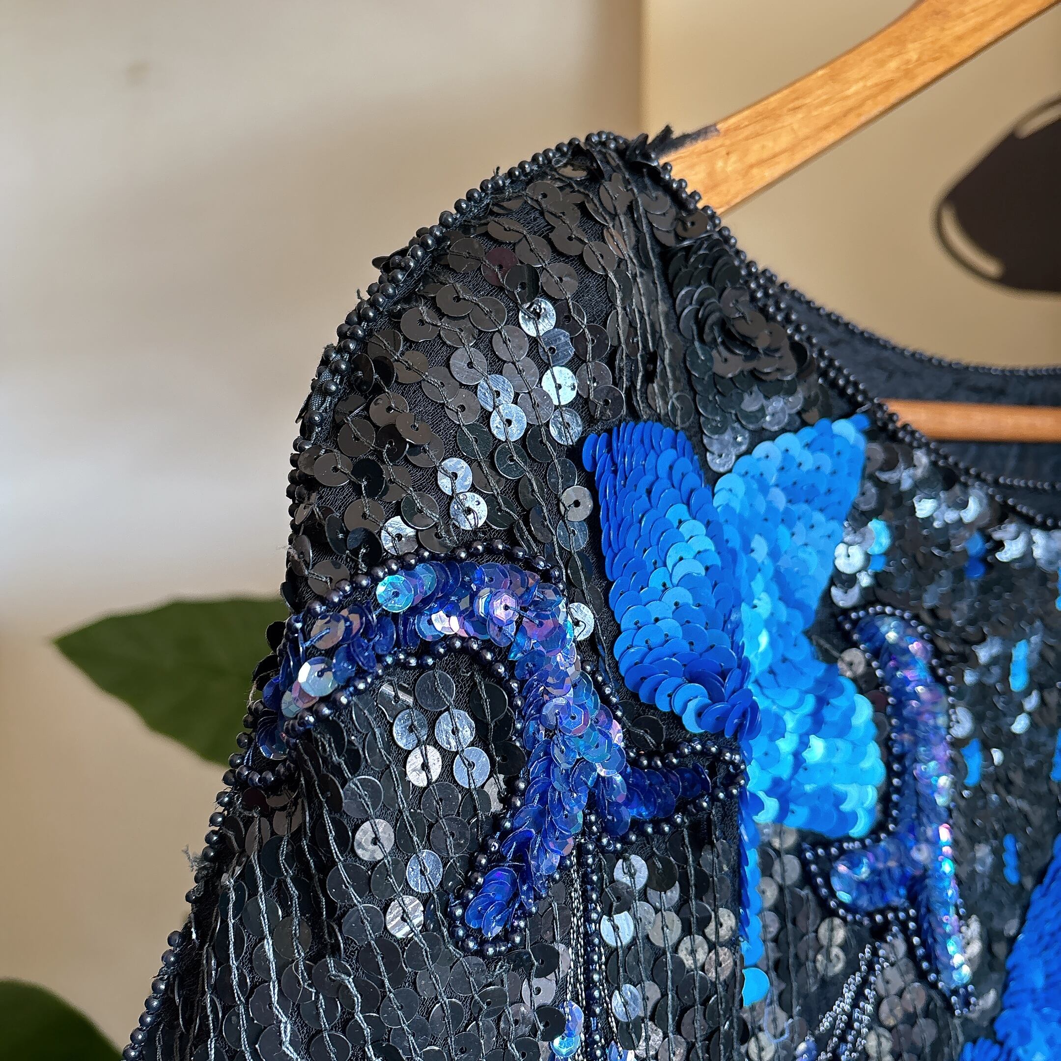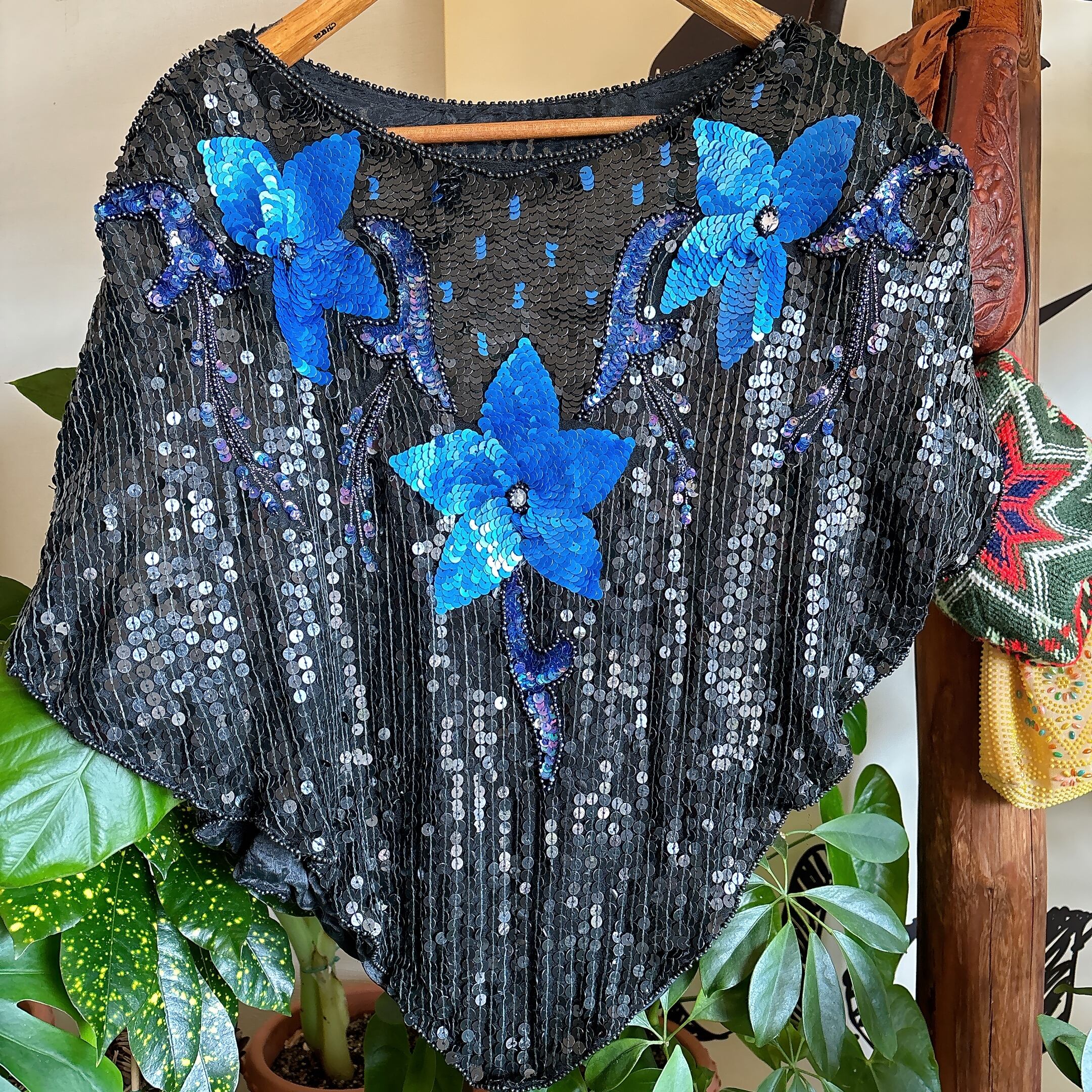 80s ヴィンテージ フラワーモチーフ スパンコールトップス(ブラック×ブルー)