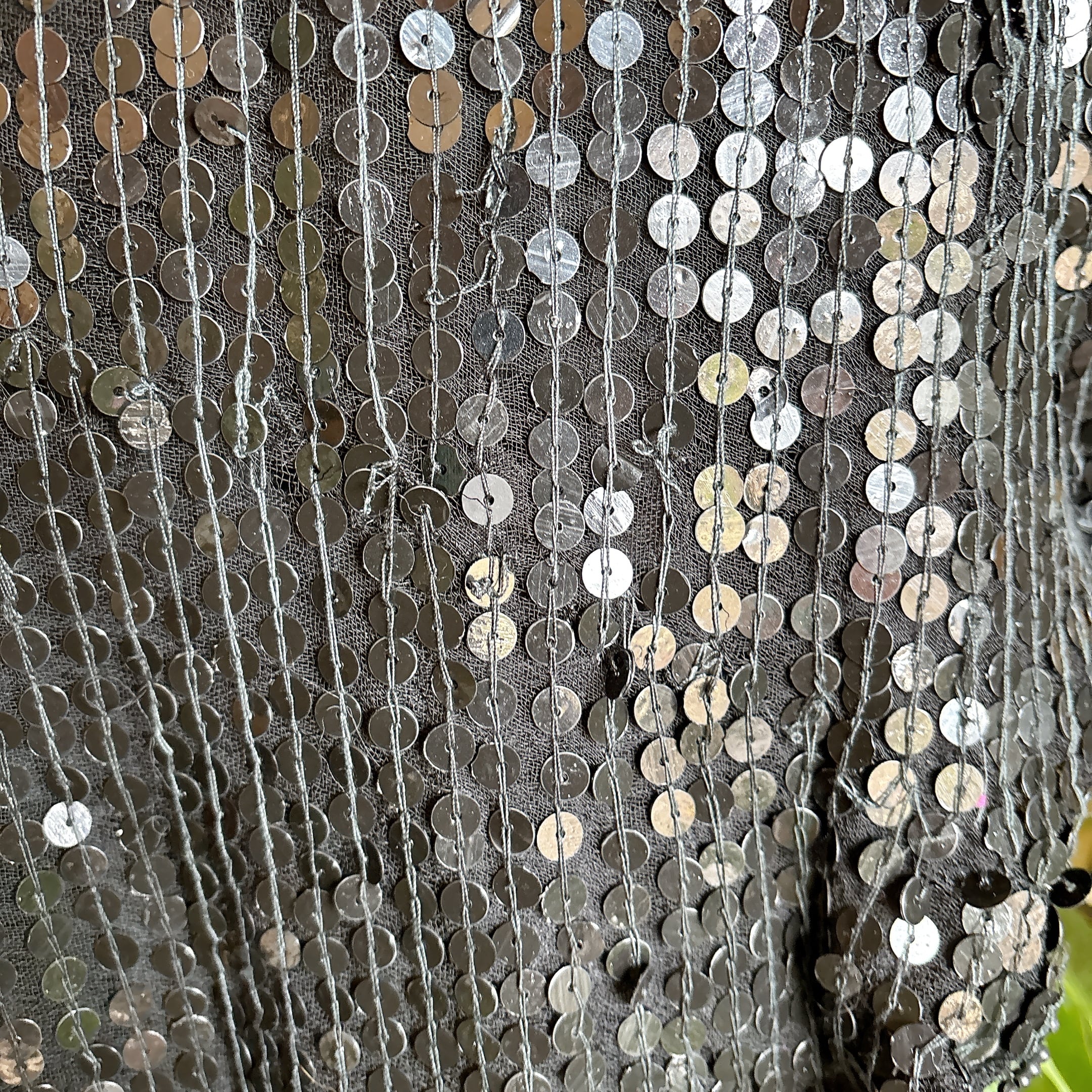 ベース生地ポリエステルメッシュ、ナイロンチュール、レーヨン混だと思います。(80sの総スパンコール物はほぼ化繊ベースです。)