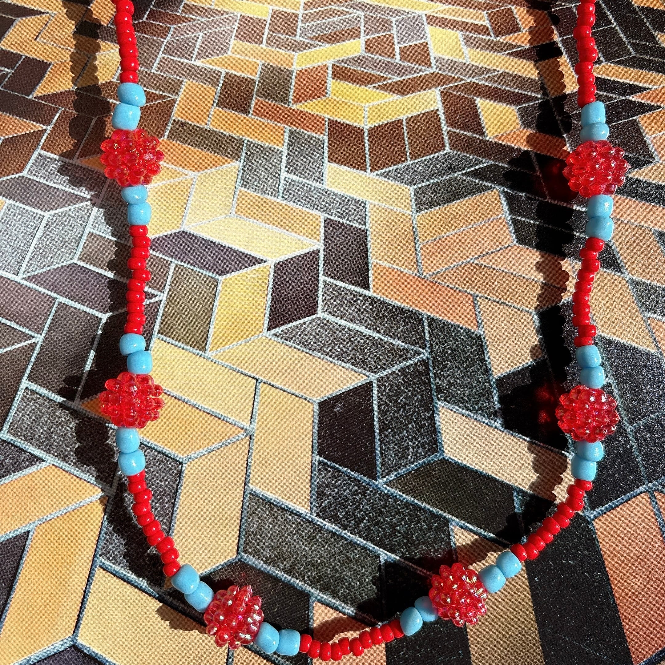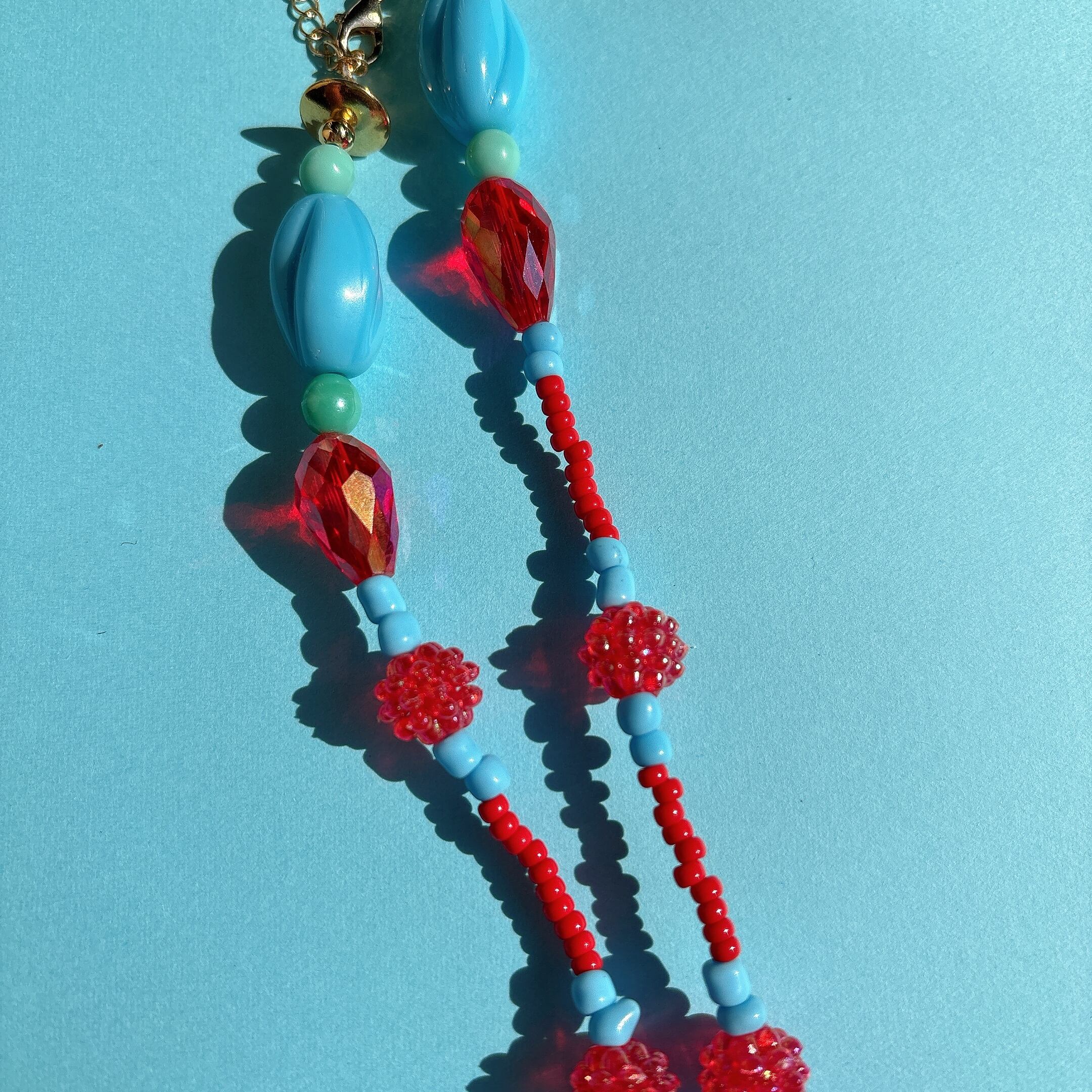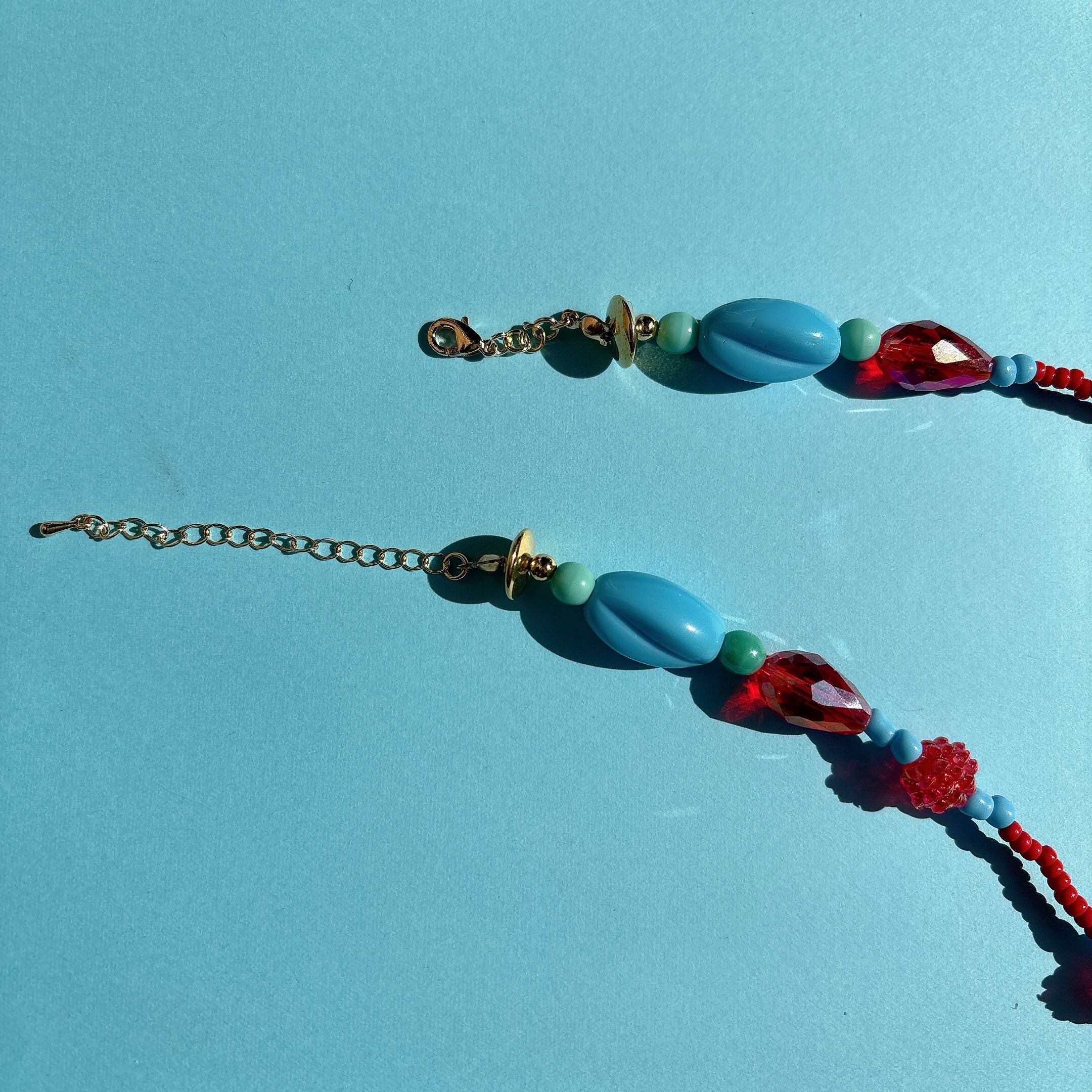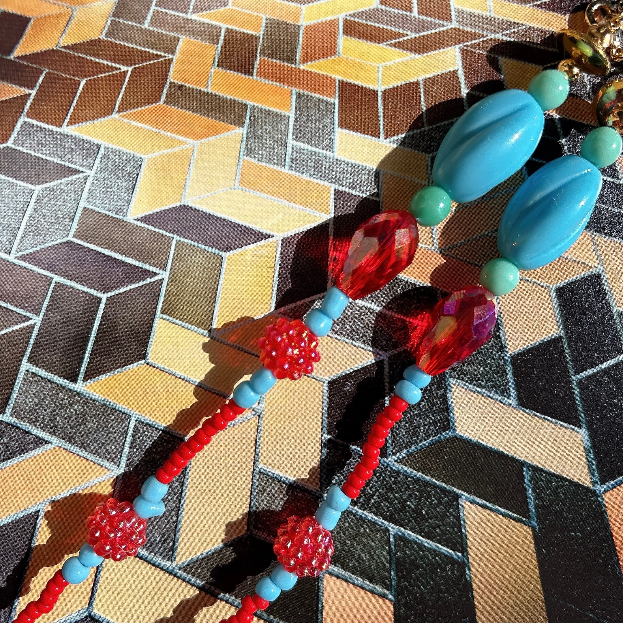 ◾️ 鮮やかなレッドと爽やかなライトブルーのコントラストが目を惹ネックレス。