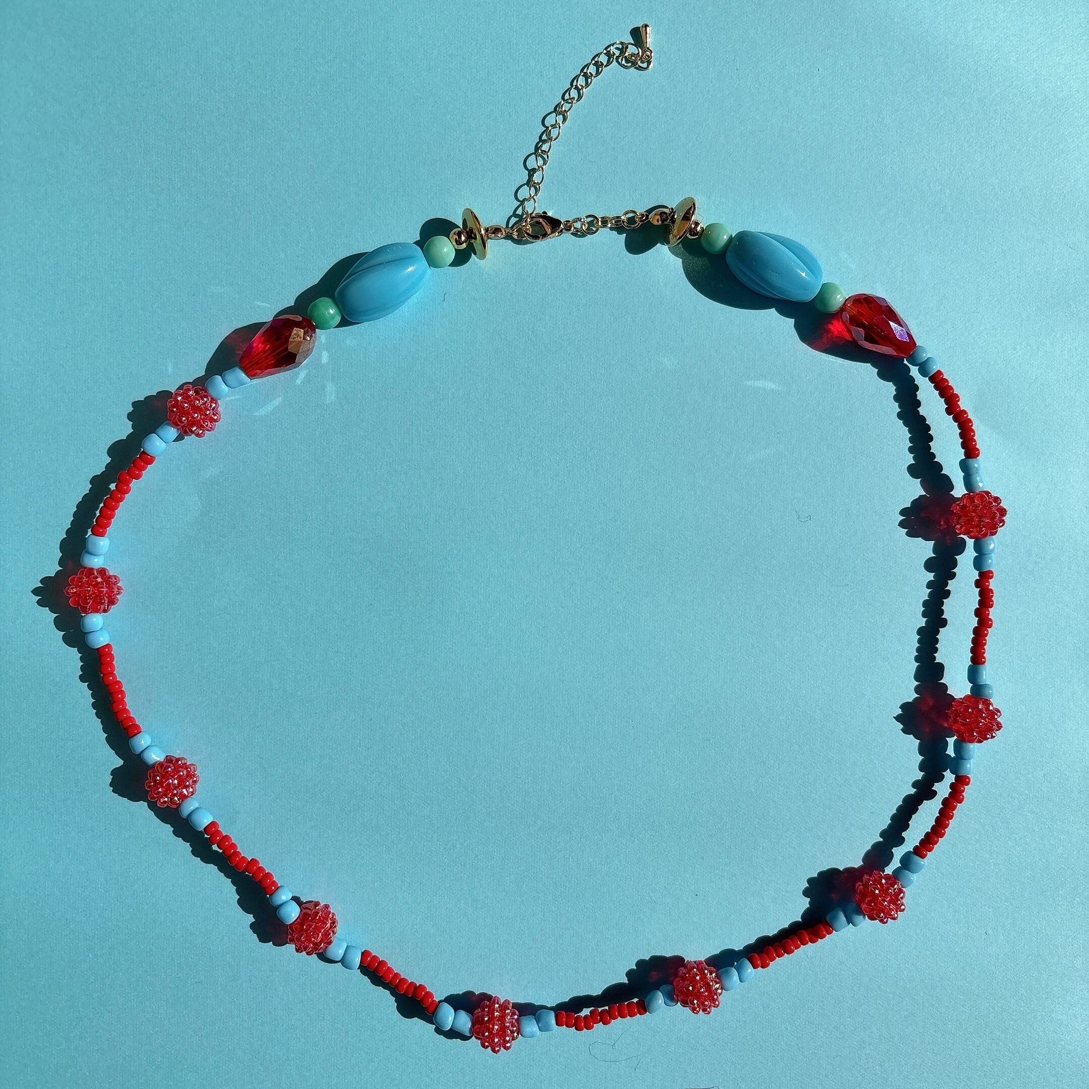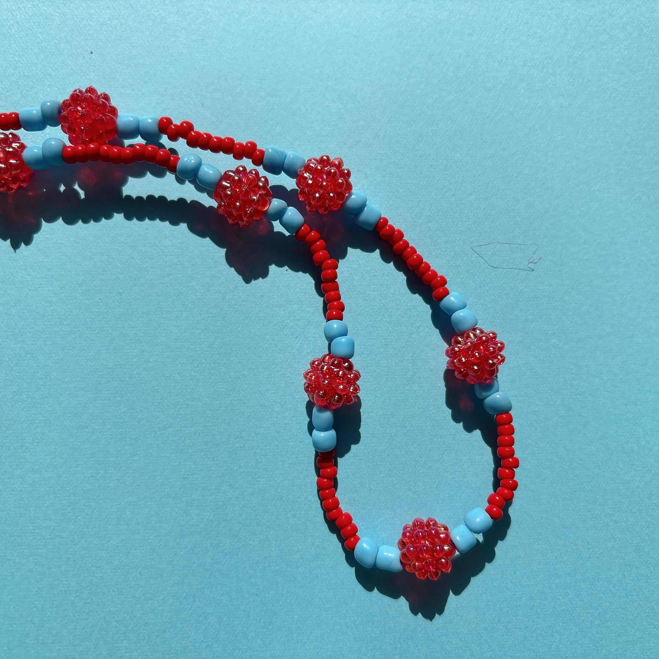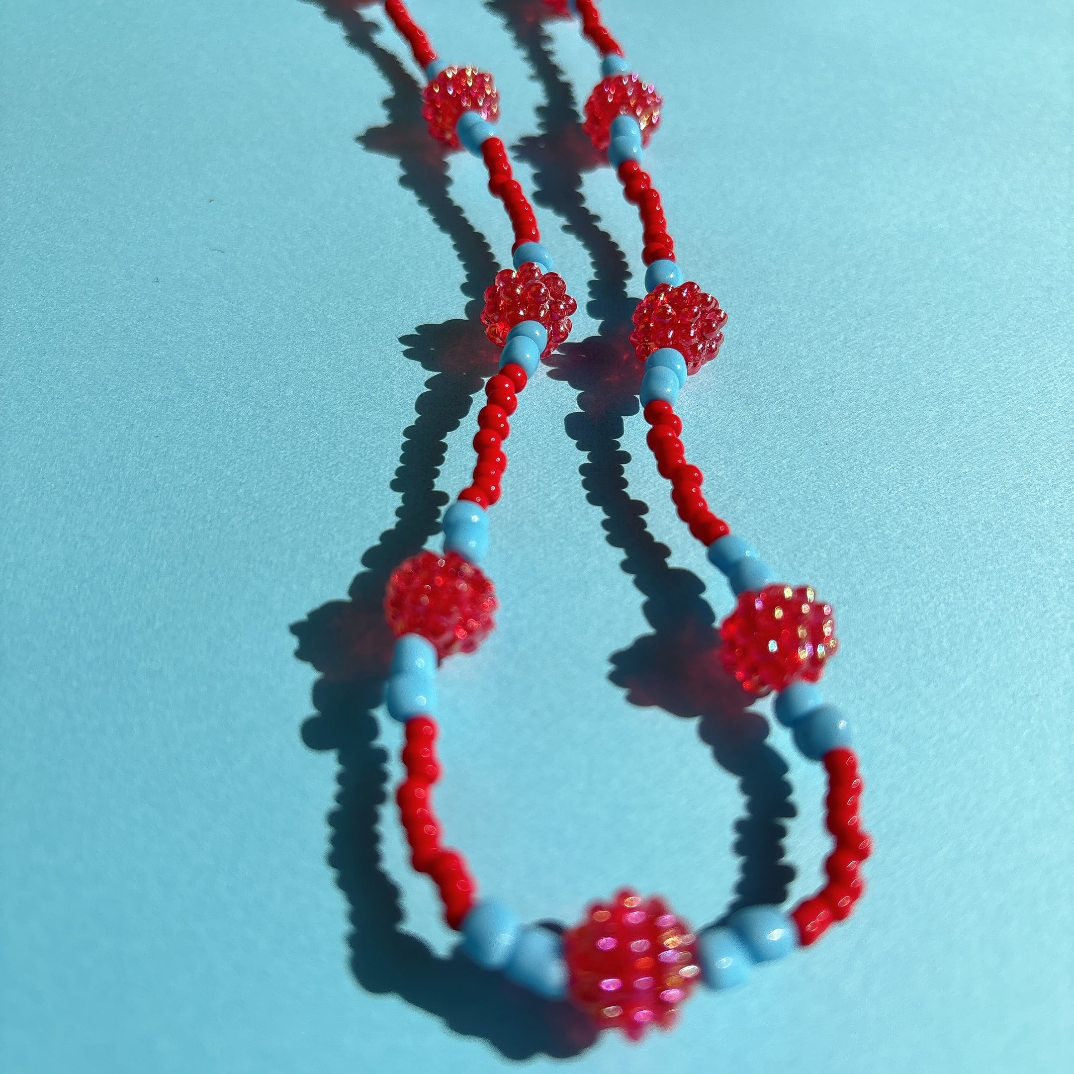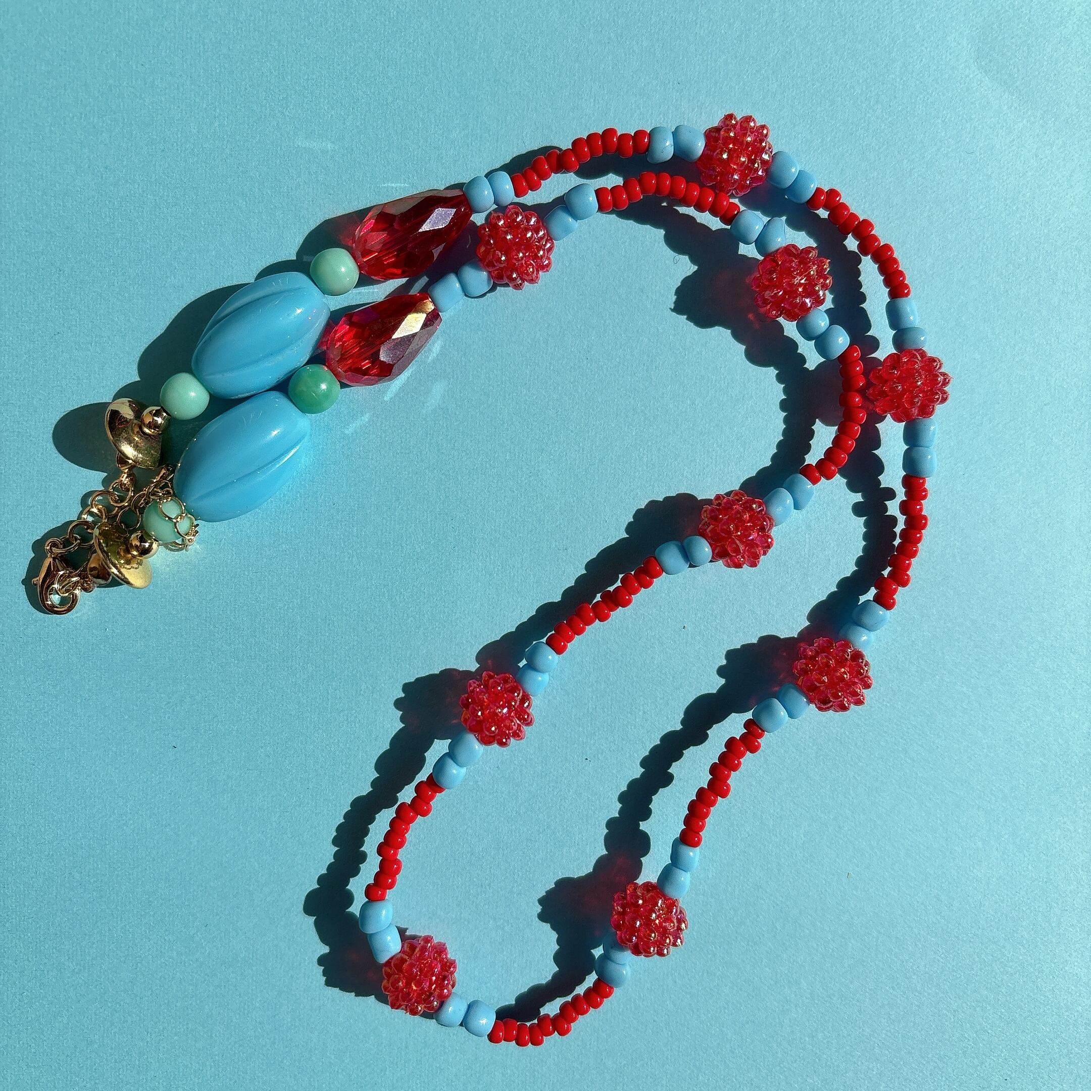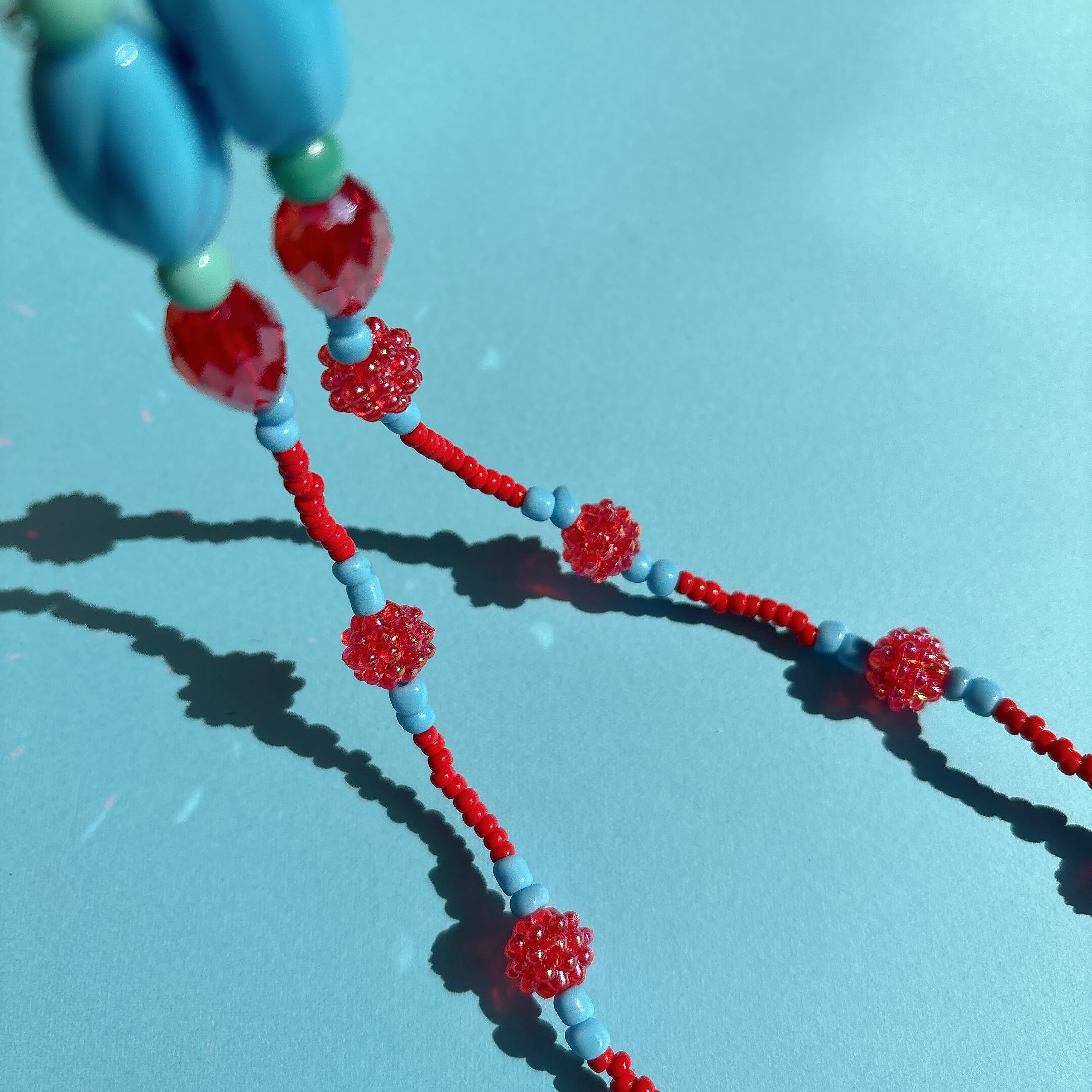 ◾️ 鮮やかなレッドと爽やかなライトブルーのコントラストが目を惹ネックレス。