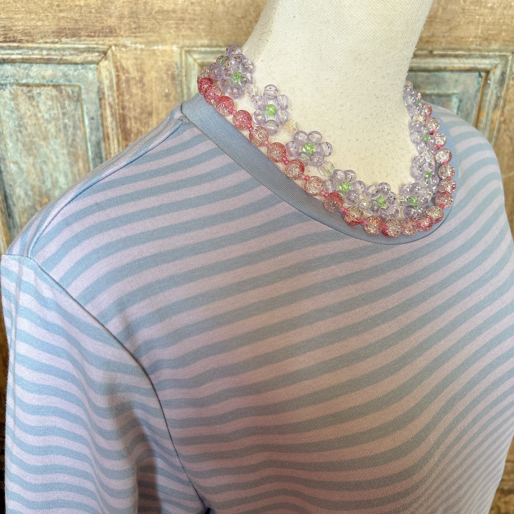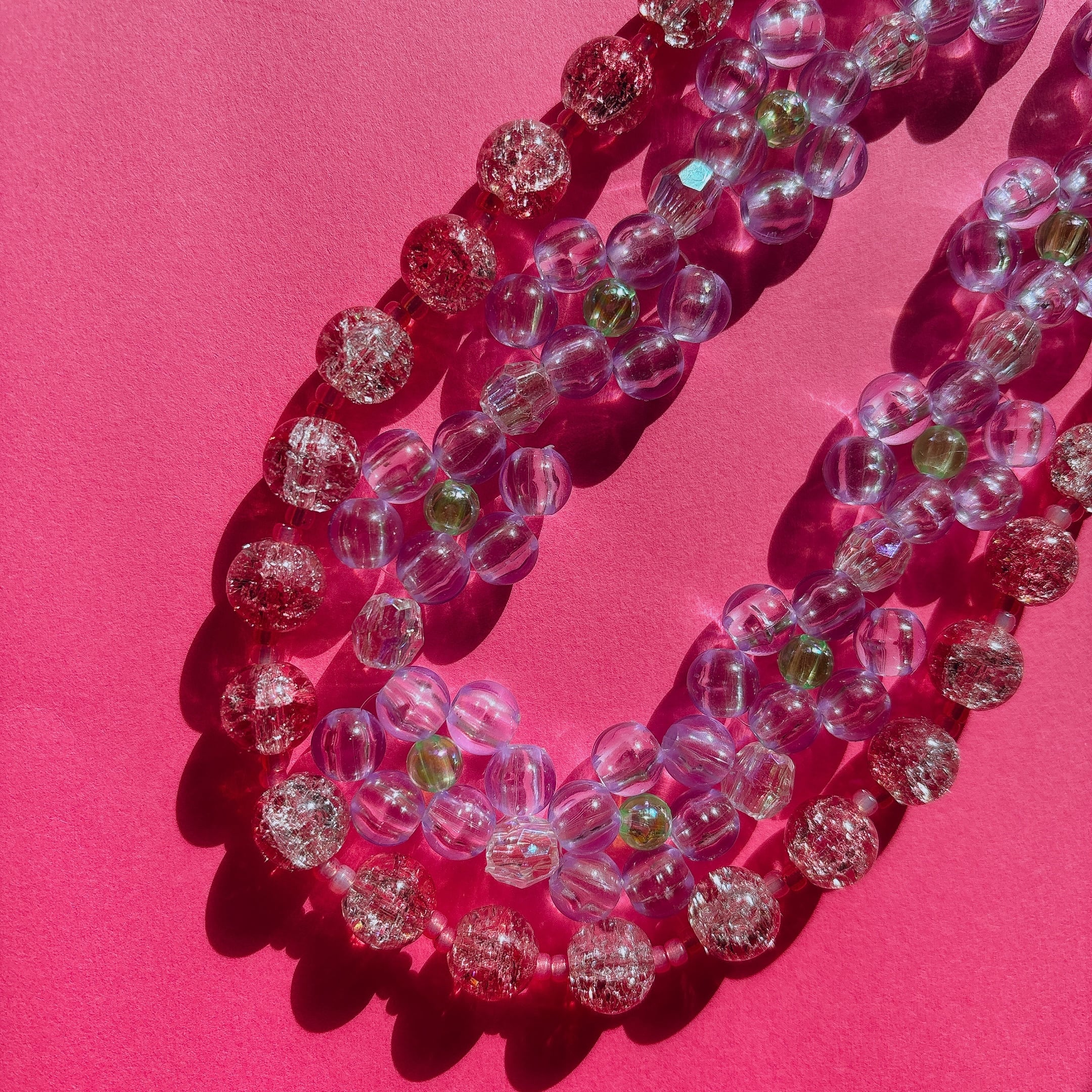 もう一連には、花モチーフを中心にアクリル・プラスチックビーズを組み合わせ、軽やかな着け心地に仕上げました。ボリュームがありながらも、長時間でも負担になりにくいデザインです。