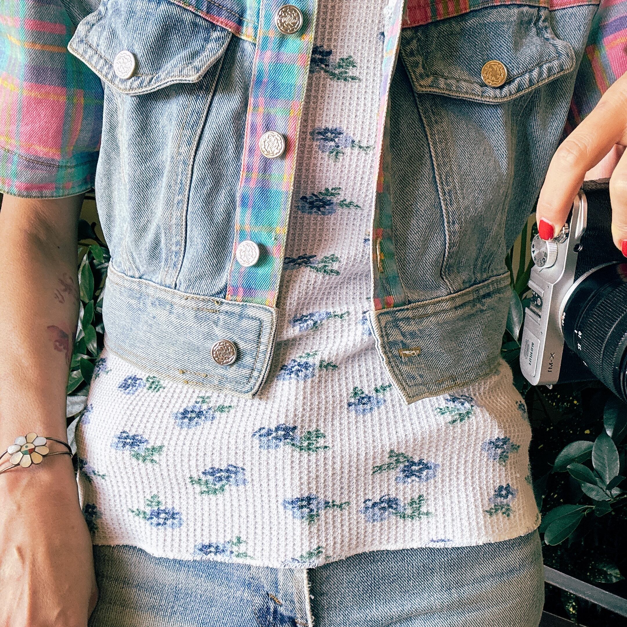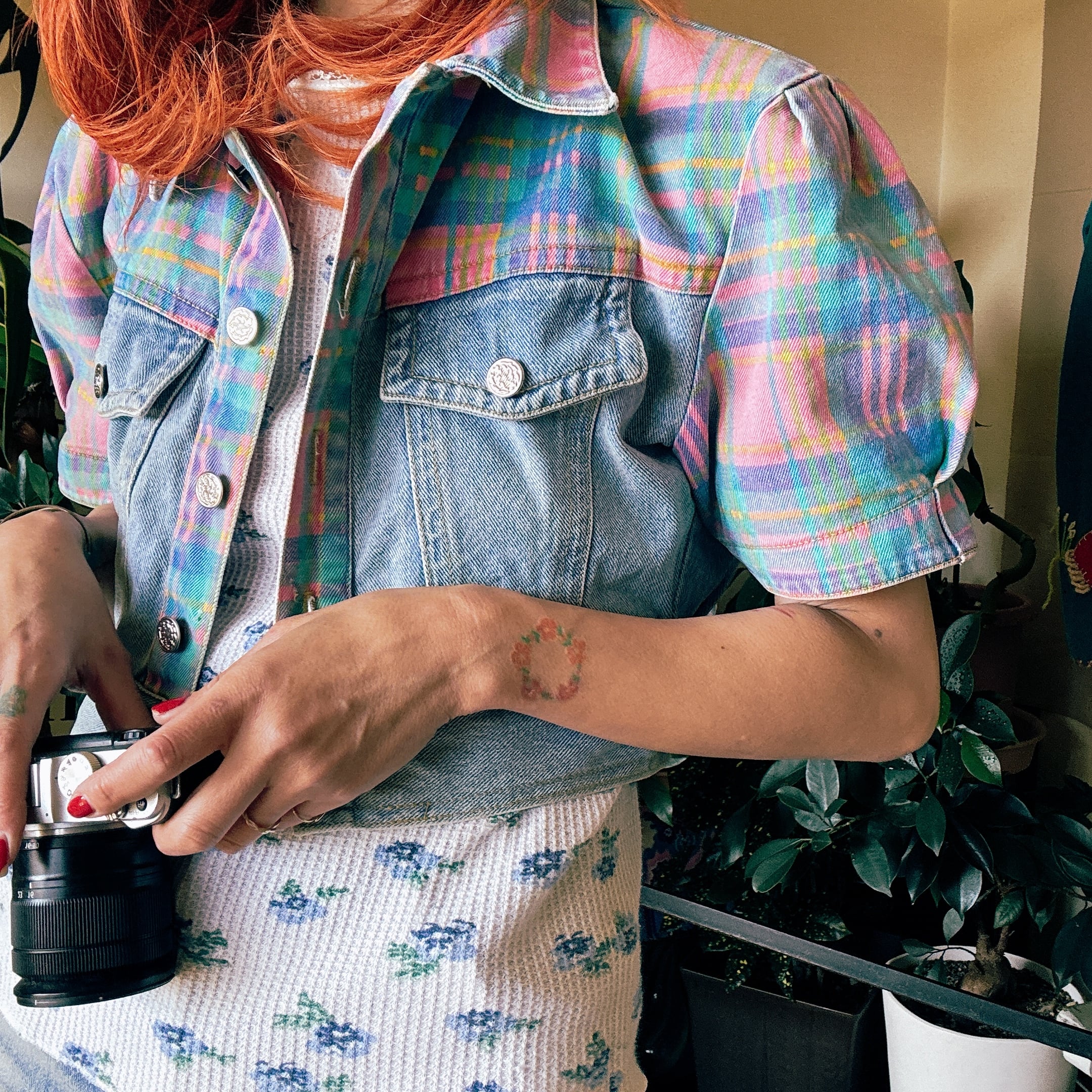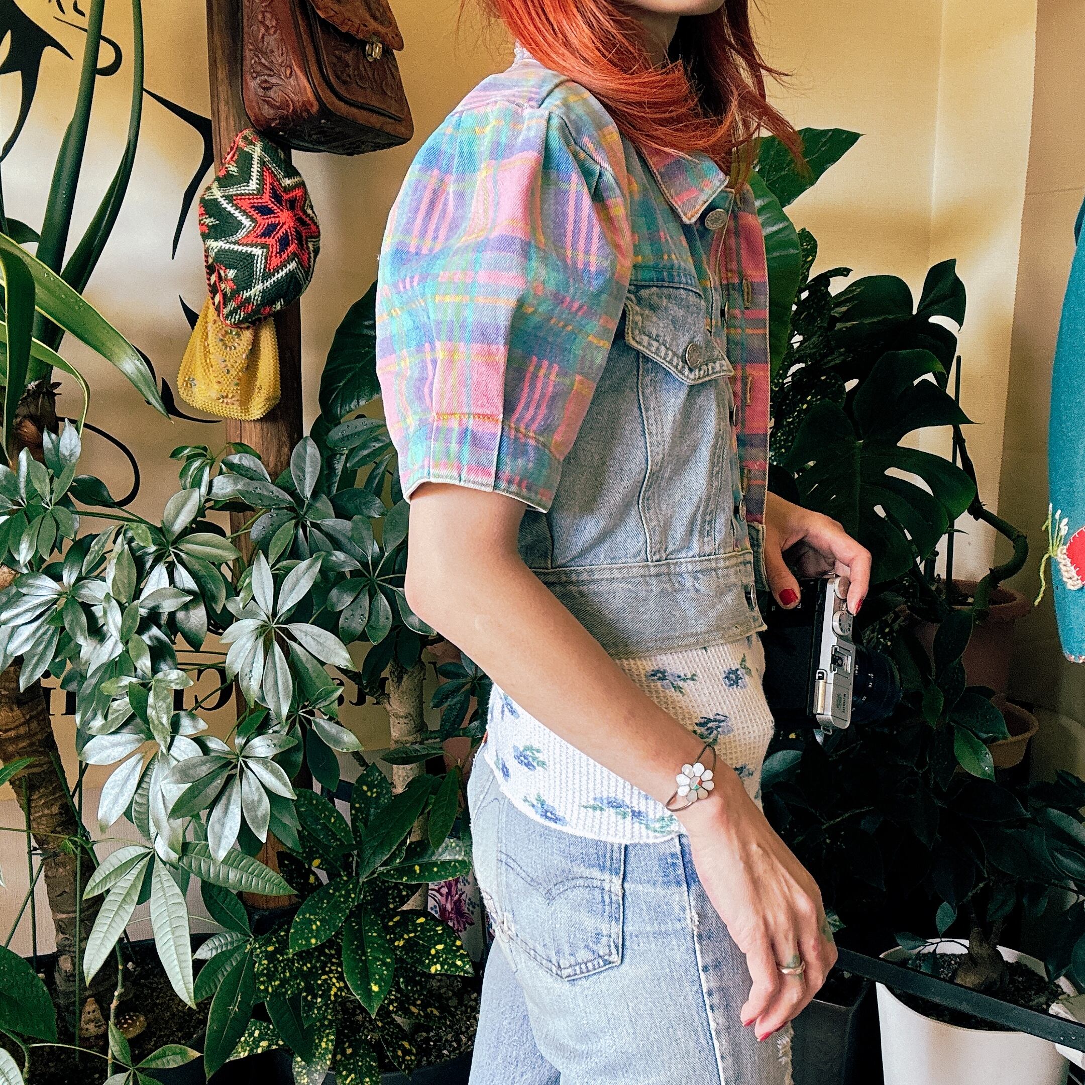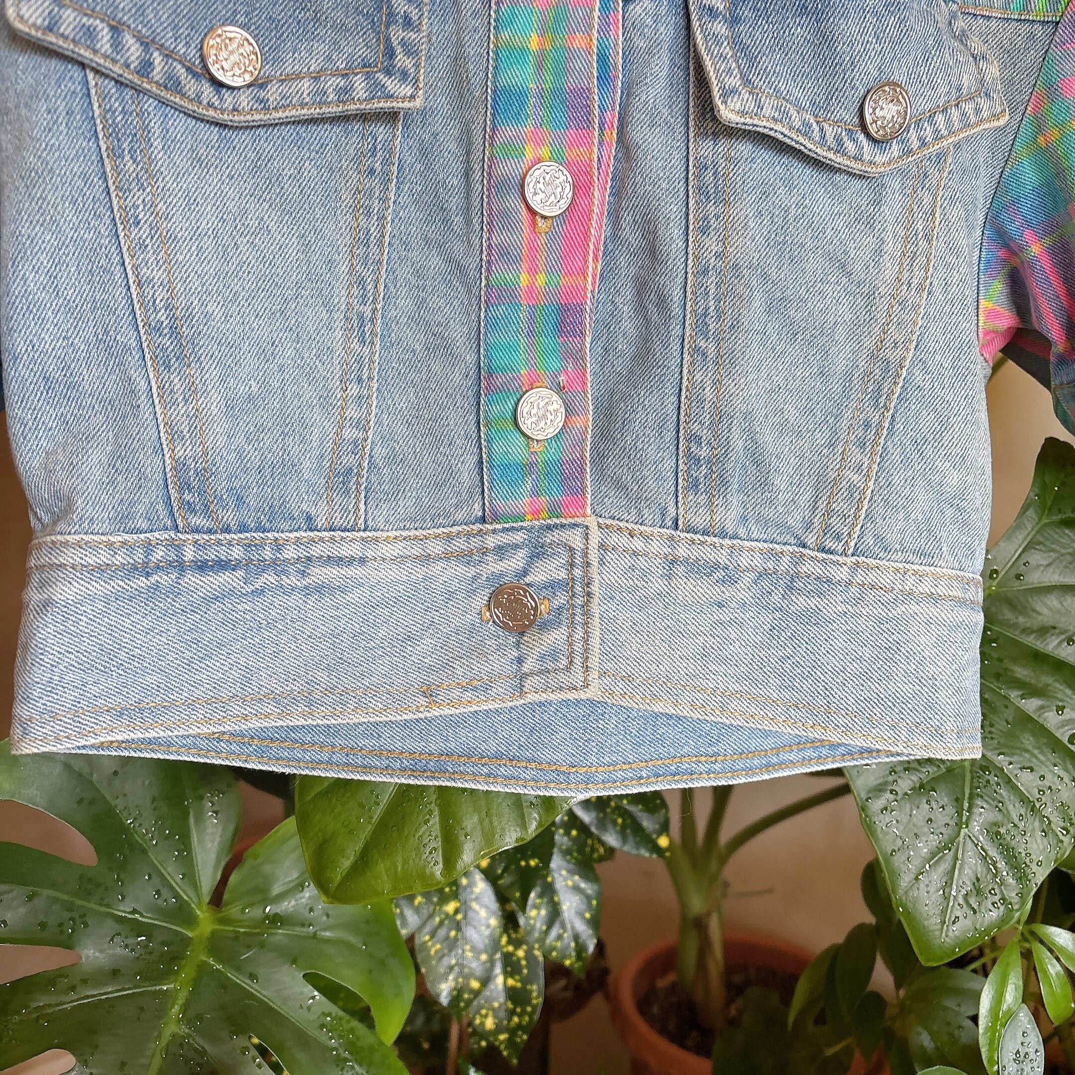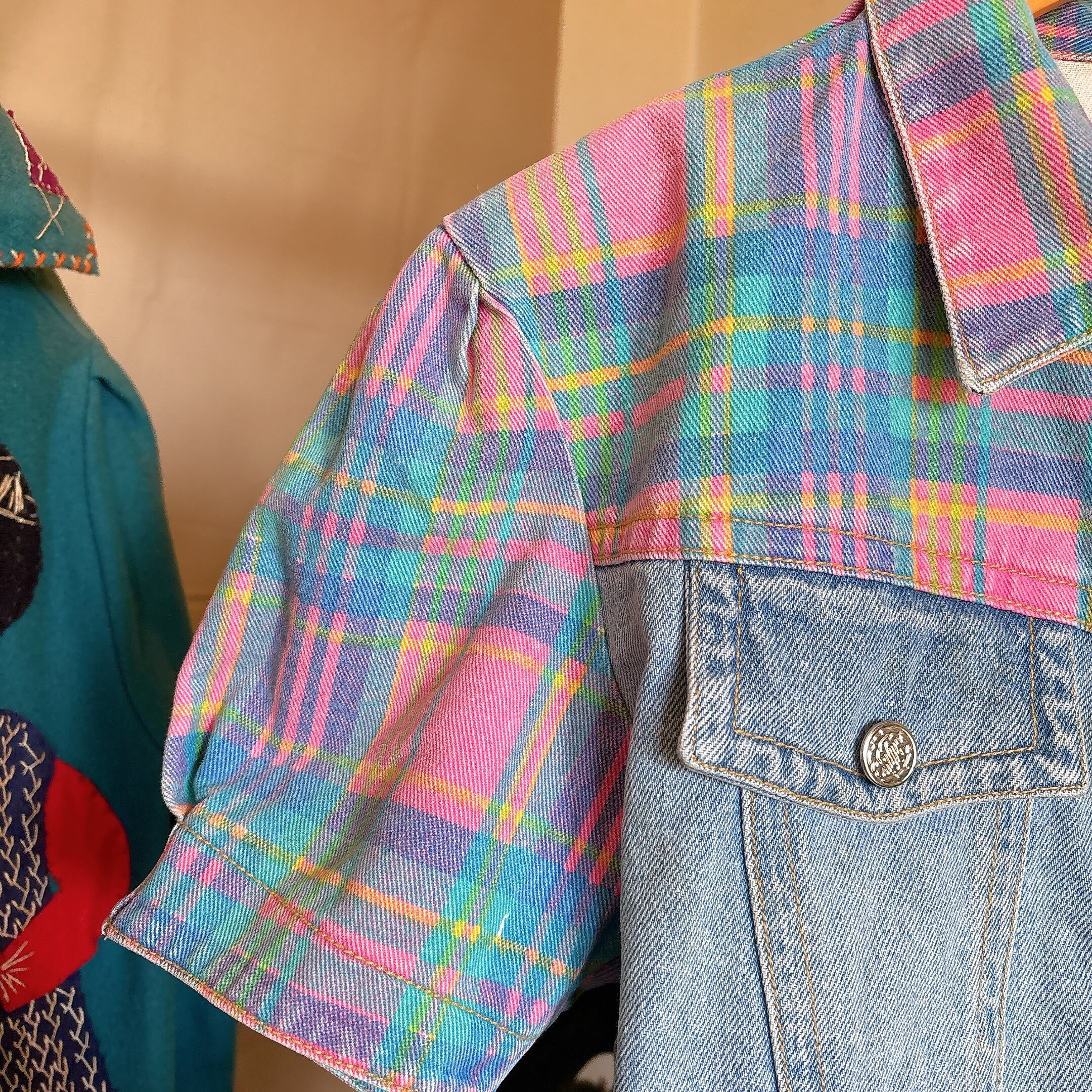 ◾️淡いパステルチェックとライトブルーデニムを組み合わせた、存在感のあるヴィンテージジャケット。