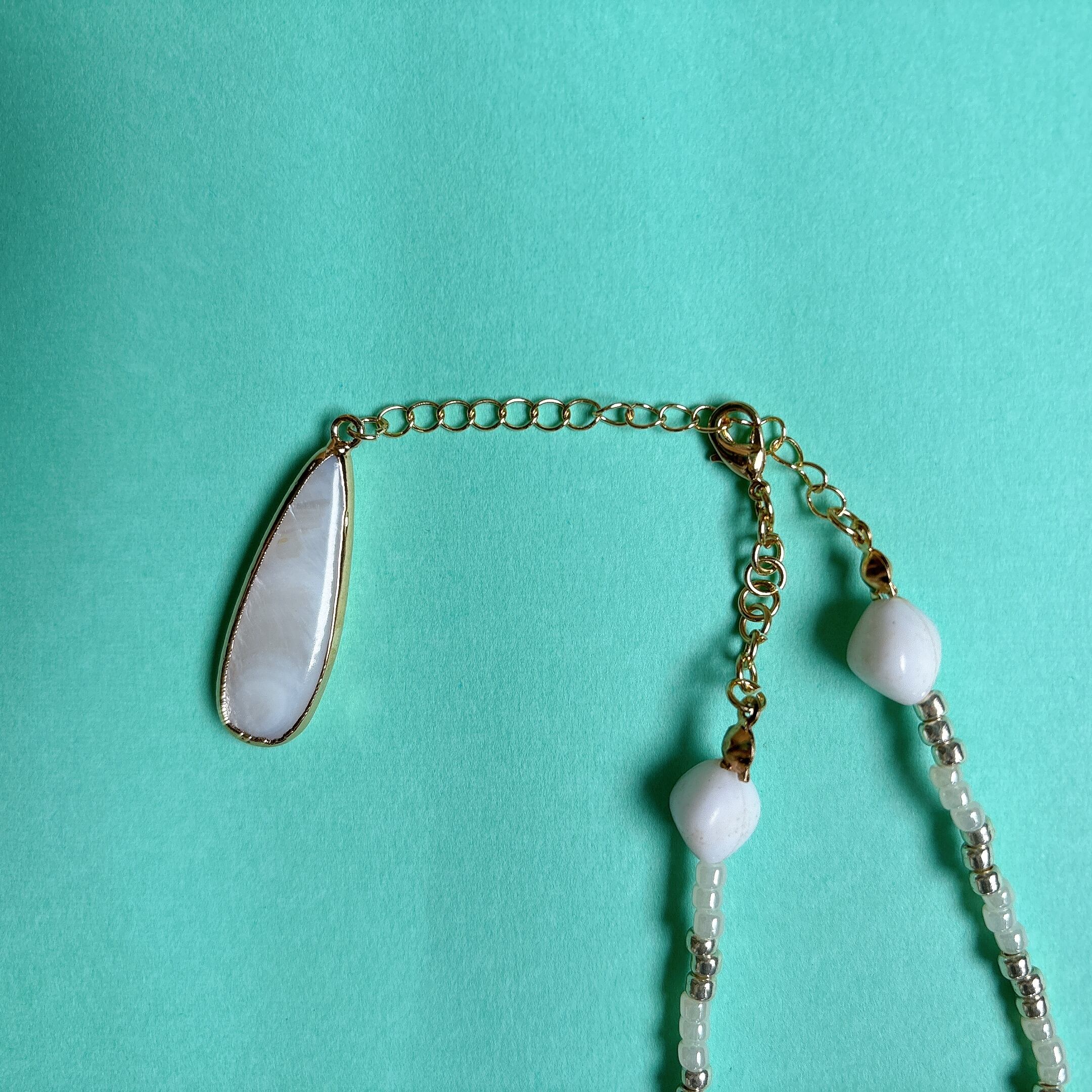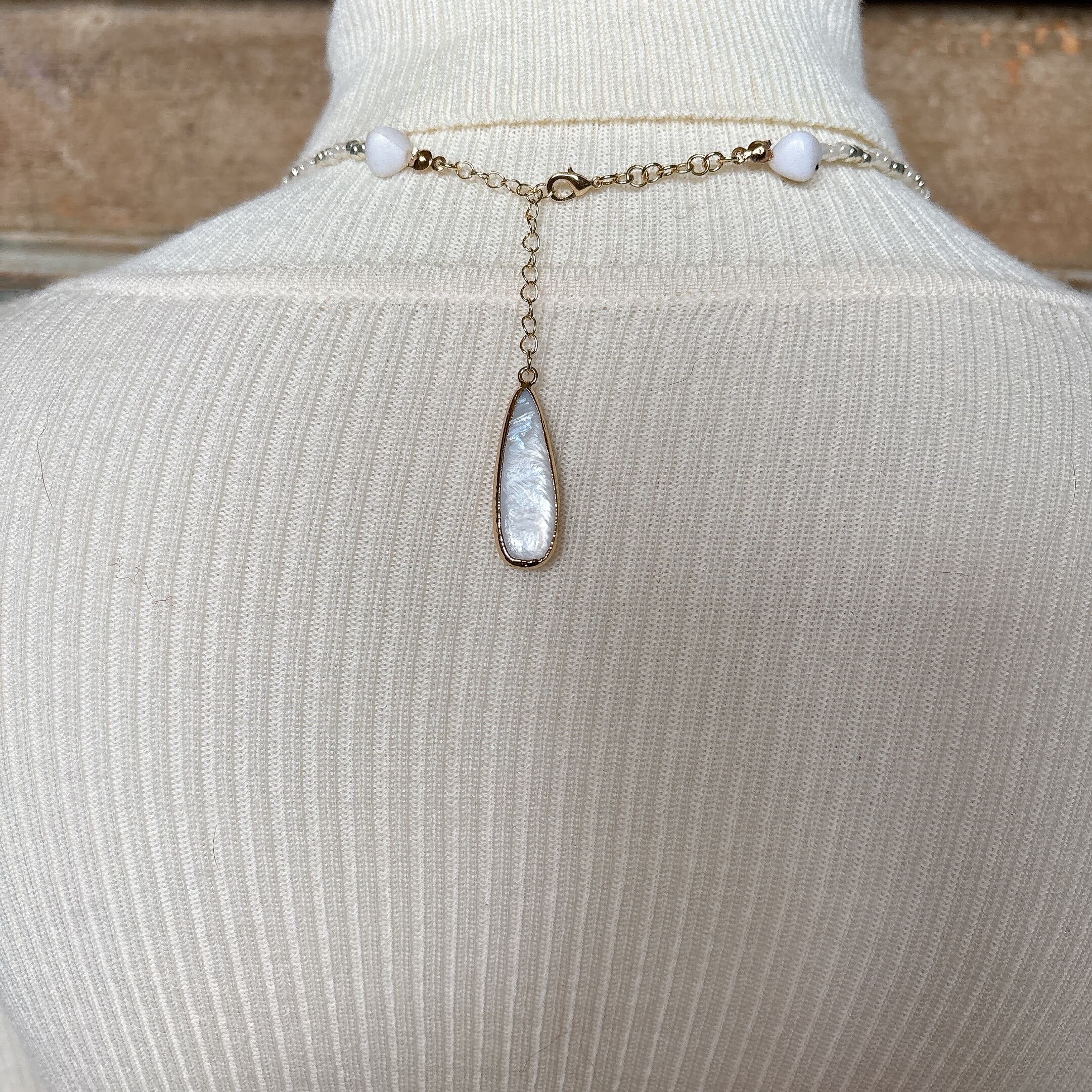 中央にはマザーオブパール風のシェルチャームが揺れ、