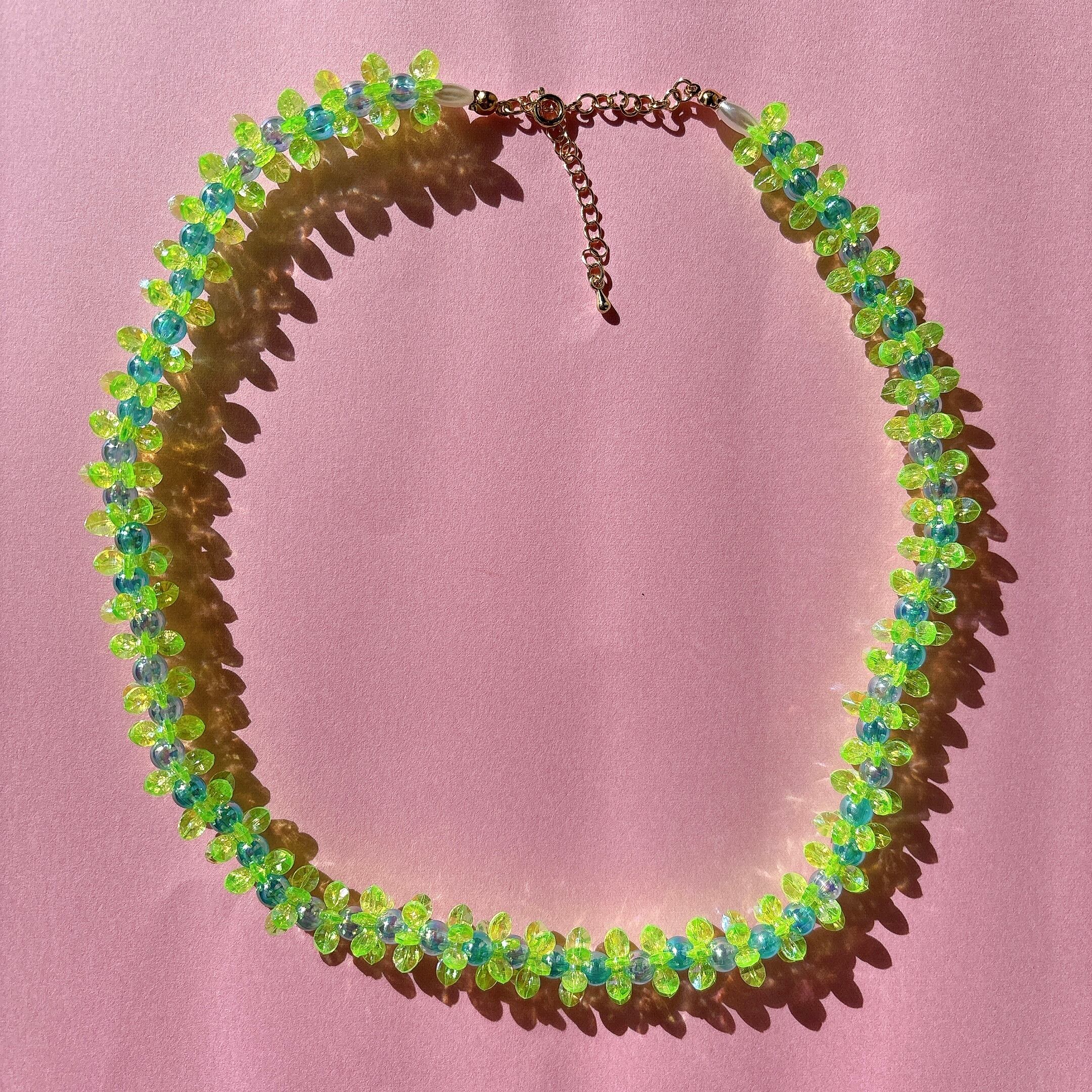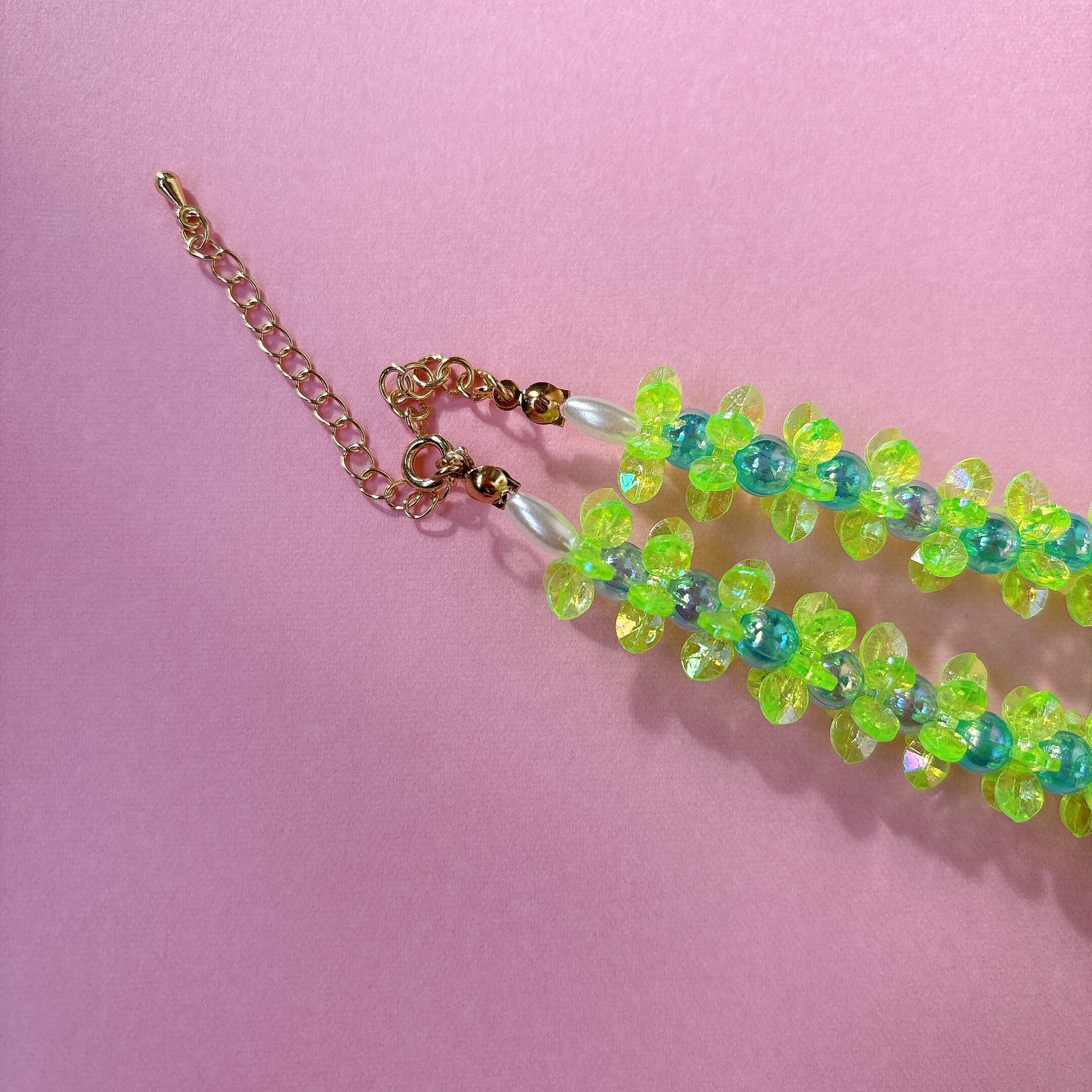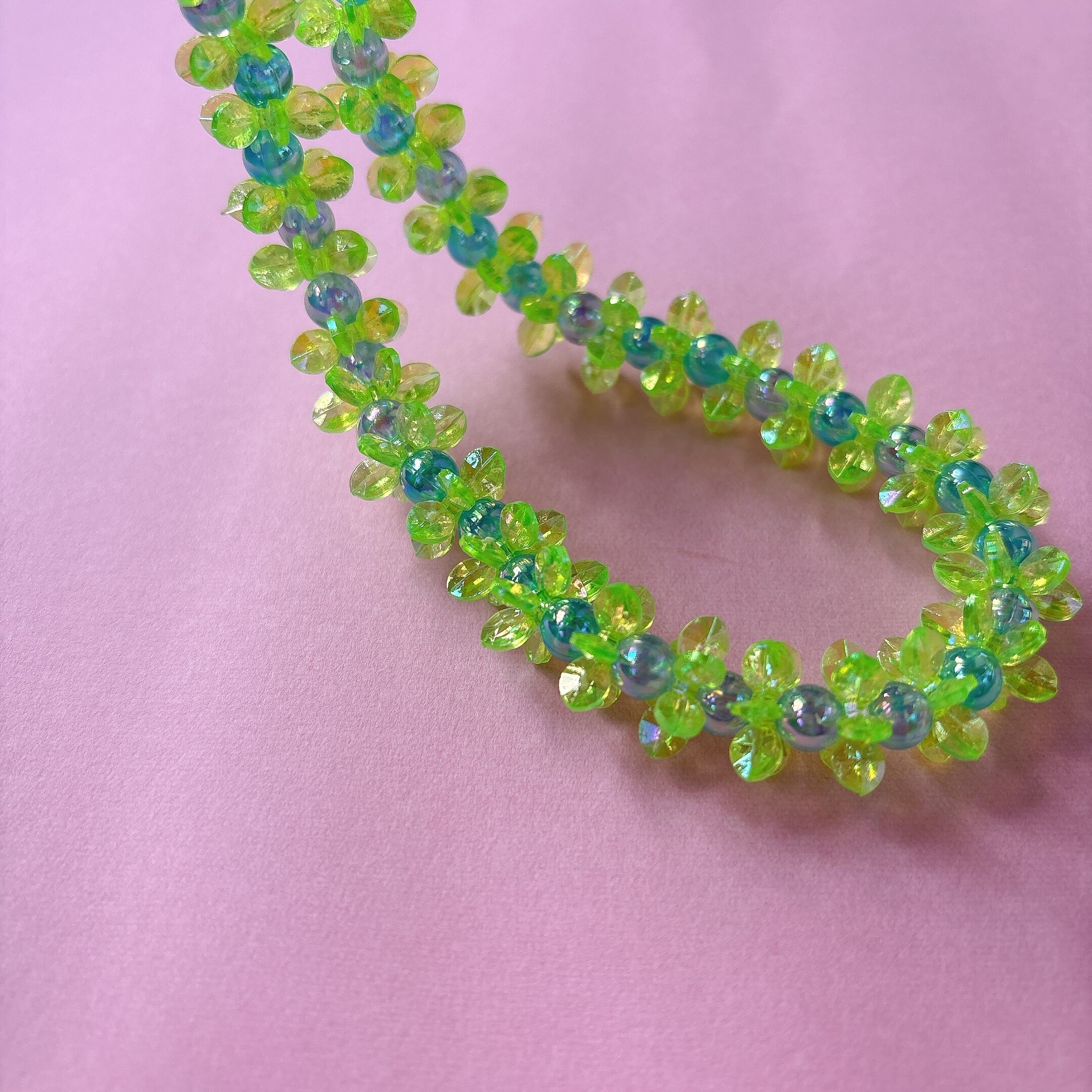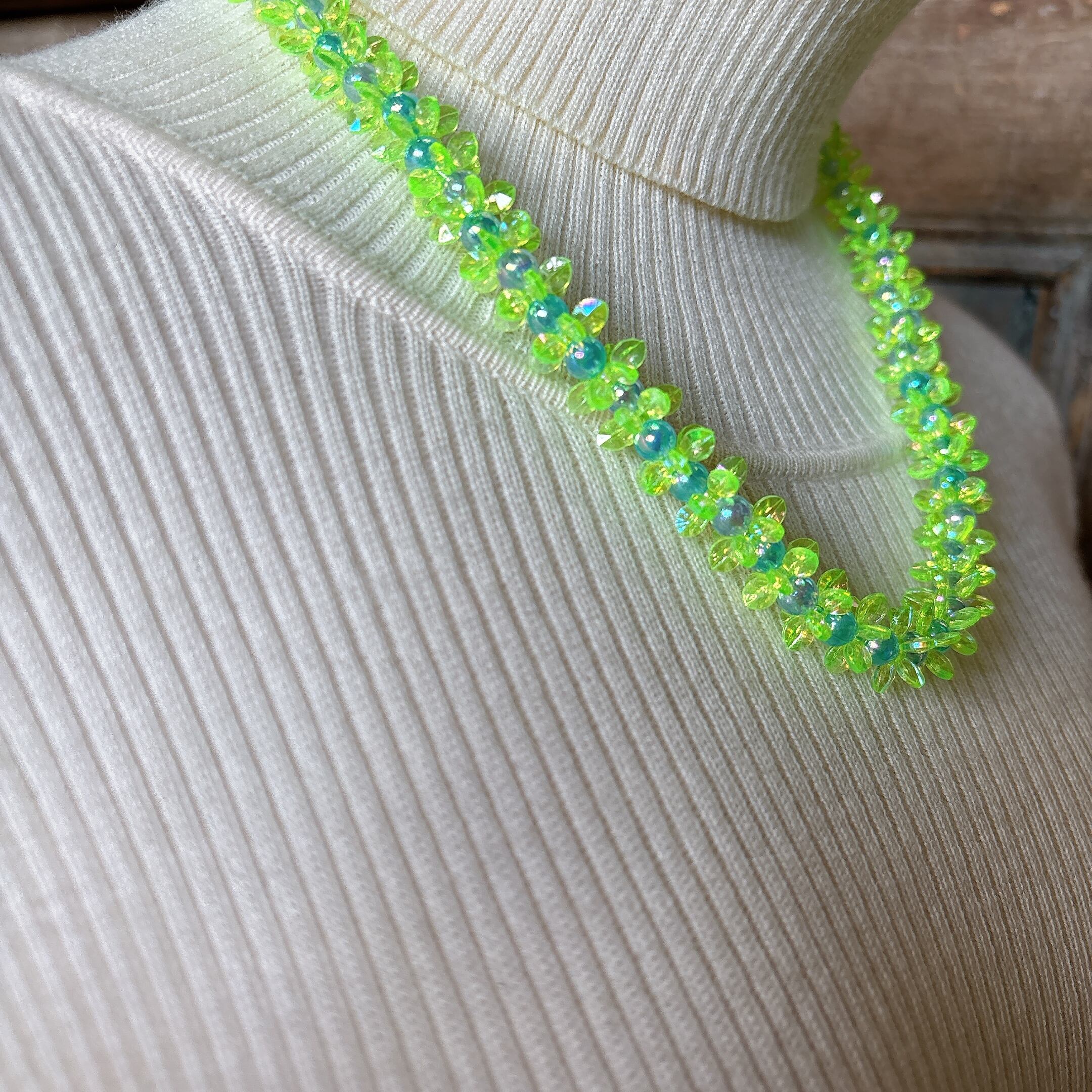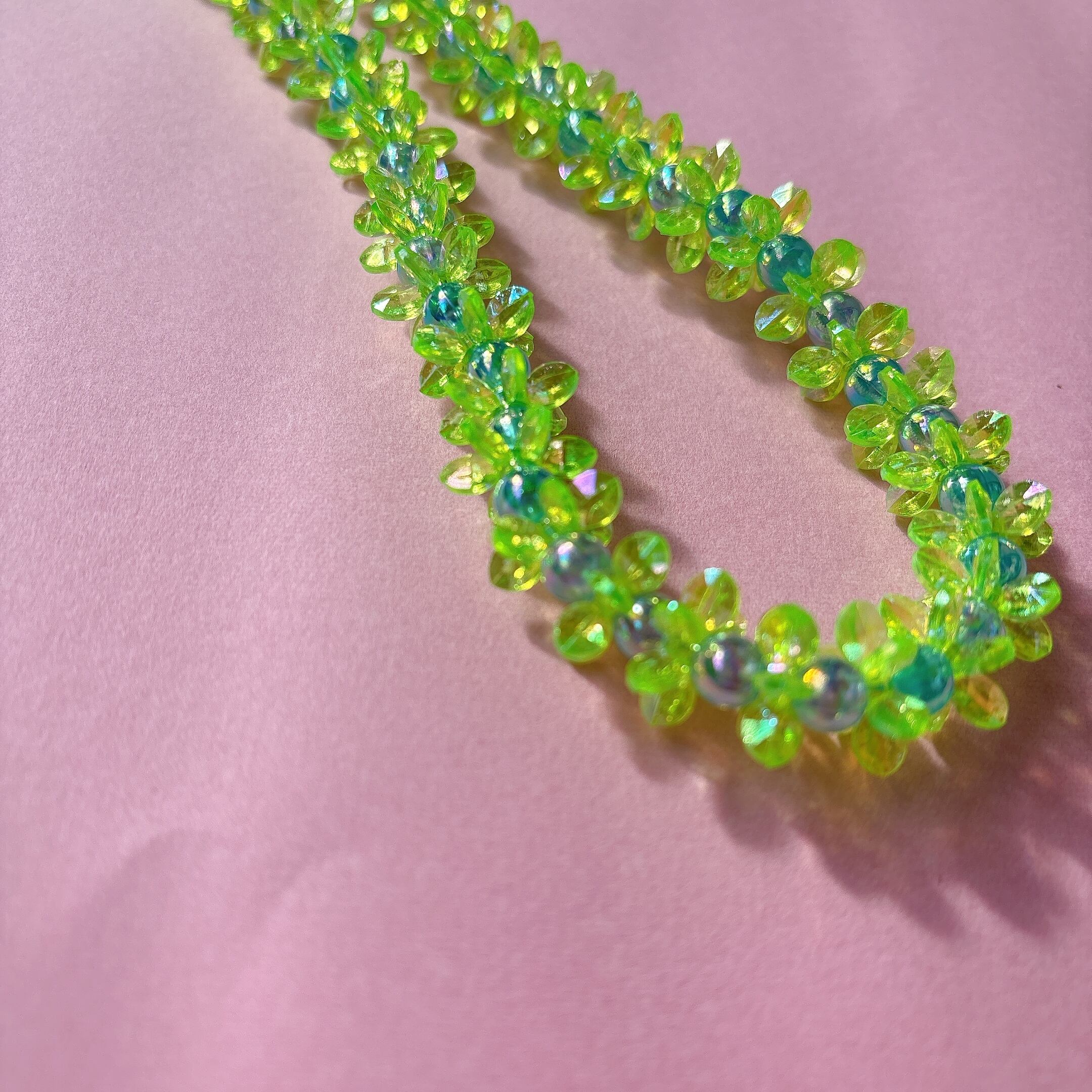 ◾️ ネオングリーンのフラワービーズに、透明感のあるブルービーズを組み合わせた爽やかなネックレス。